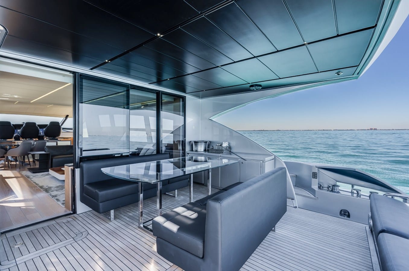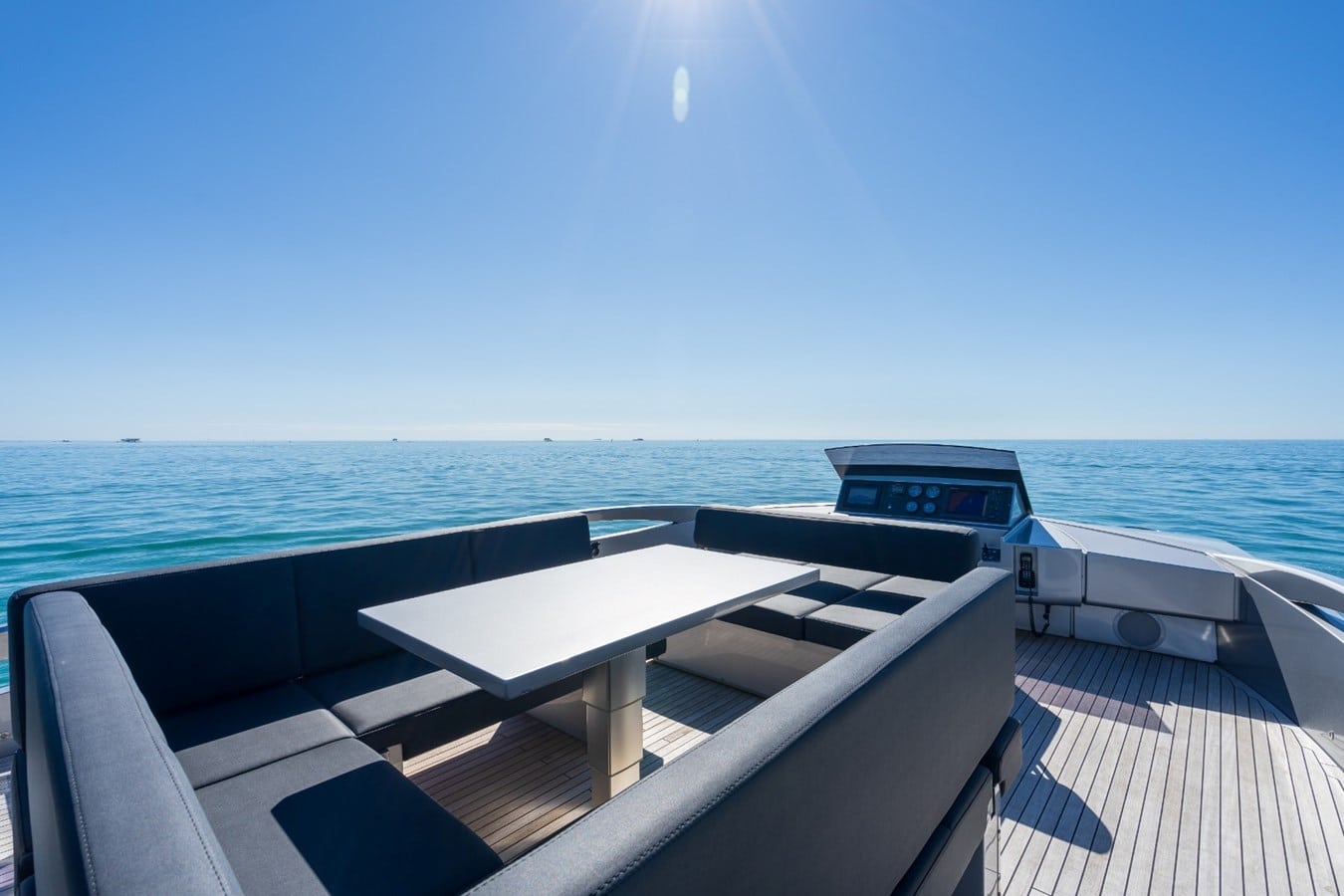The flybridge has the potential to be an amazing entertainment space! It is fully equipped with tables, refrigerator, an ice maker, a grill, sun pads, a canopy for a breezy shade.