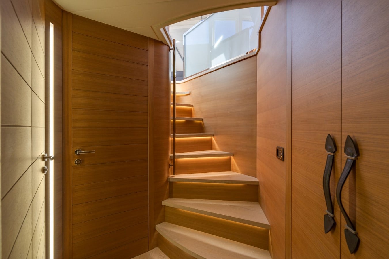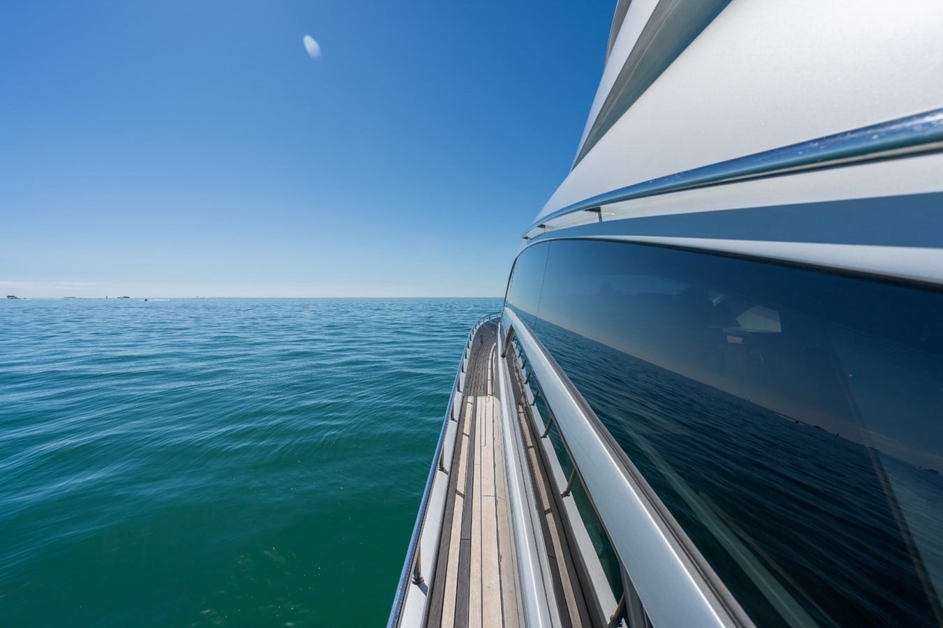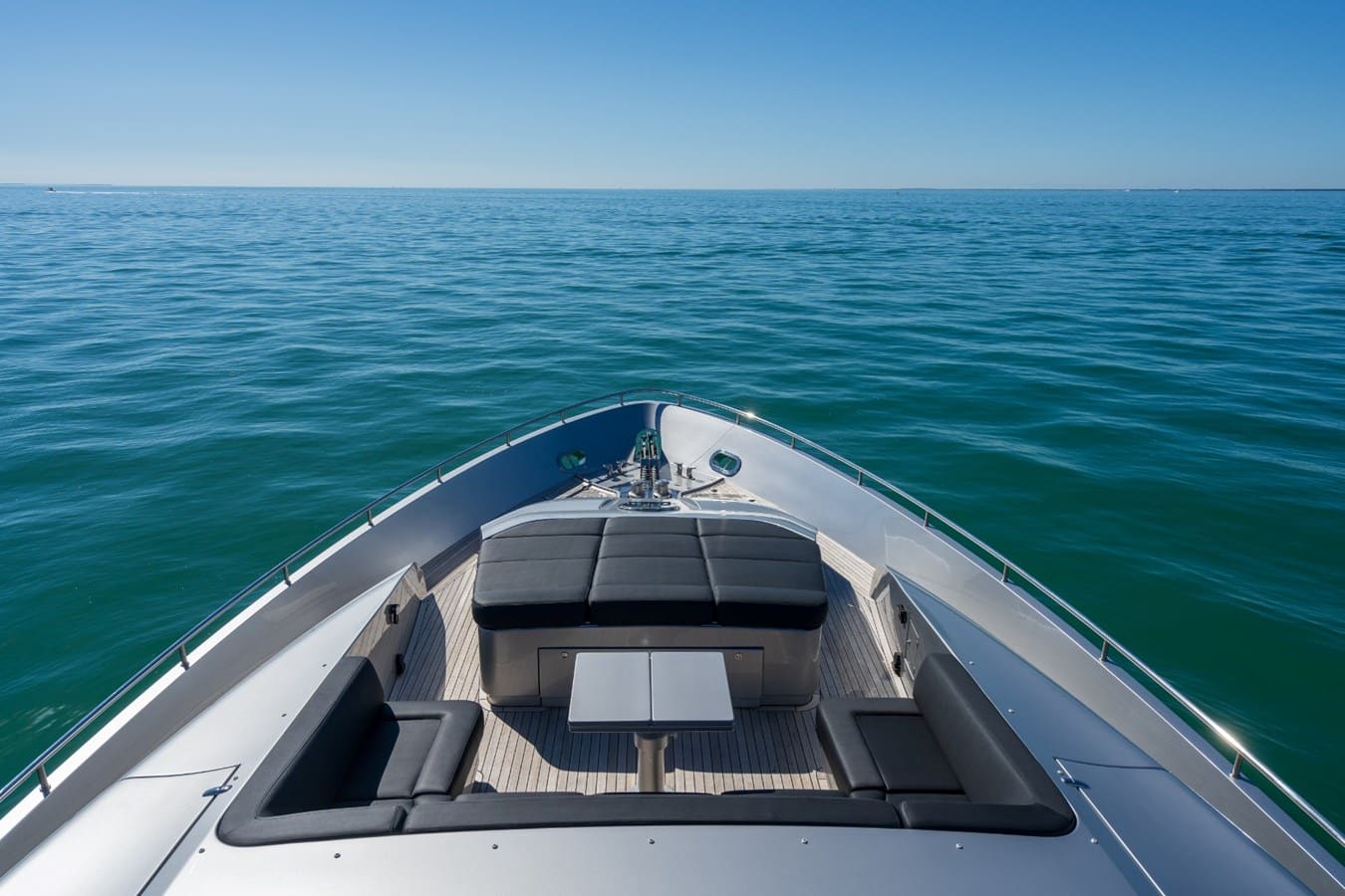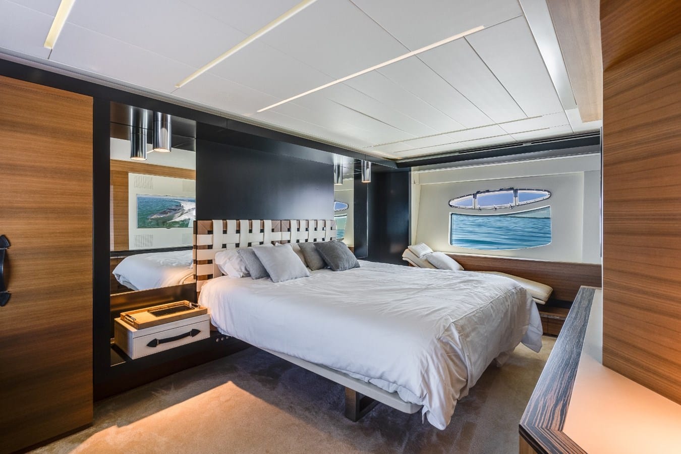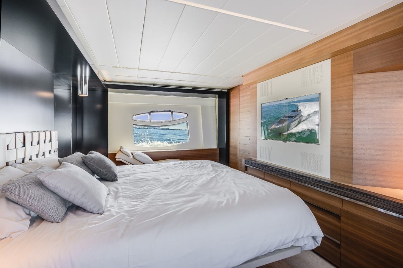 The moment you step through the hydraulic doors, you are transported into a different world. The spacious salon area includes an L-Shape sofa, a Samsung TV, dinning table as well as the captains’ chairs, and controls. Once you step down the stairs, you will find an impressive VIP Bedroom, a Master Bedroom, and two cabins with two twin beds each. This motor yacht may comfortably accommodate eight guests plus crew.
