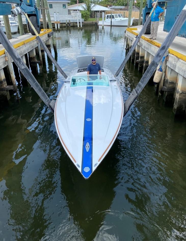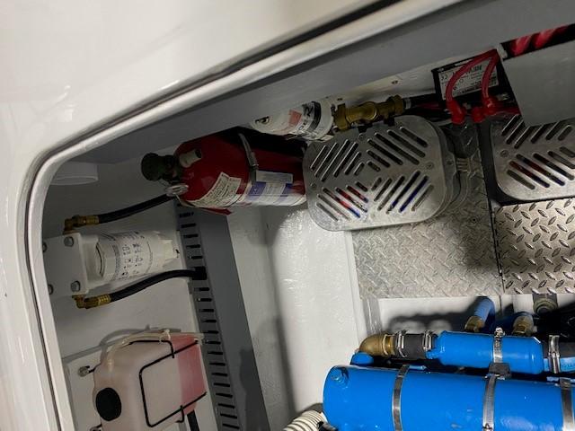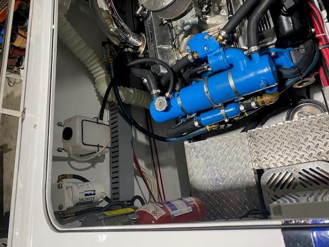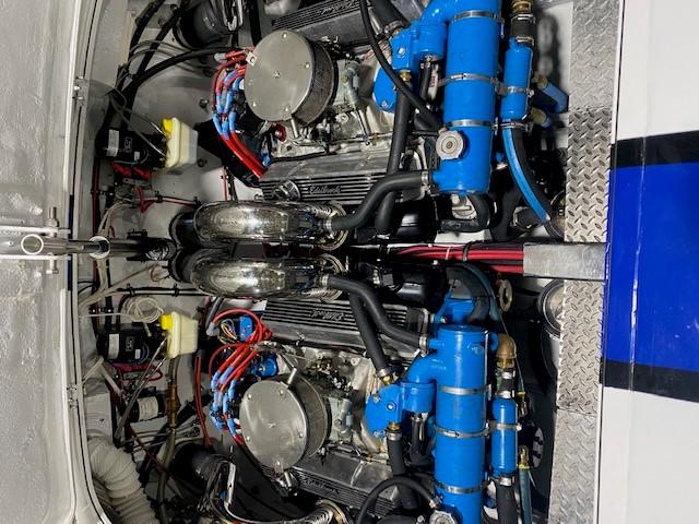 Features: Twin 415 HP 350 C.I.D. Hi-Perf Chervrolet/ Crusaders with 4 BBL Carbs, 4 bolt mains, steel cranks, oil coolers and remote filters / fresh water coolant / blue Stern Drive Full instrumentation plus speedometer / auto meter marine gauges, Dual K-5 hynautic external steering with stainless steel tie bar Kiekhaefer after planes Helm controlled hydraulic engine hatch.Twin electric and fuel pumps and remote fuel filters. Twin automatic halon fire extinguishers. Hull raw water pick-ups with shut-offs and sea strainers.