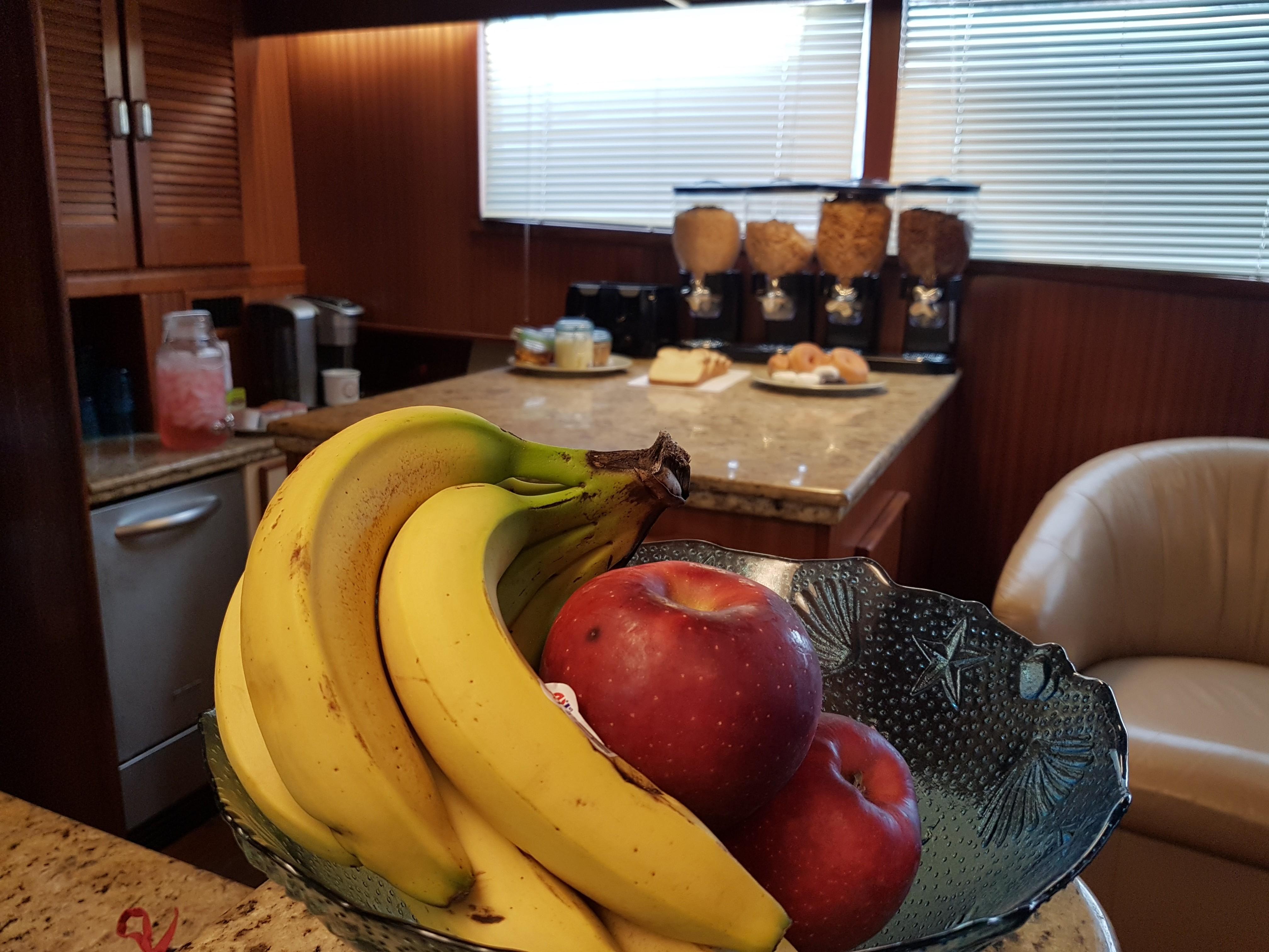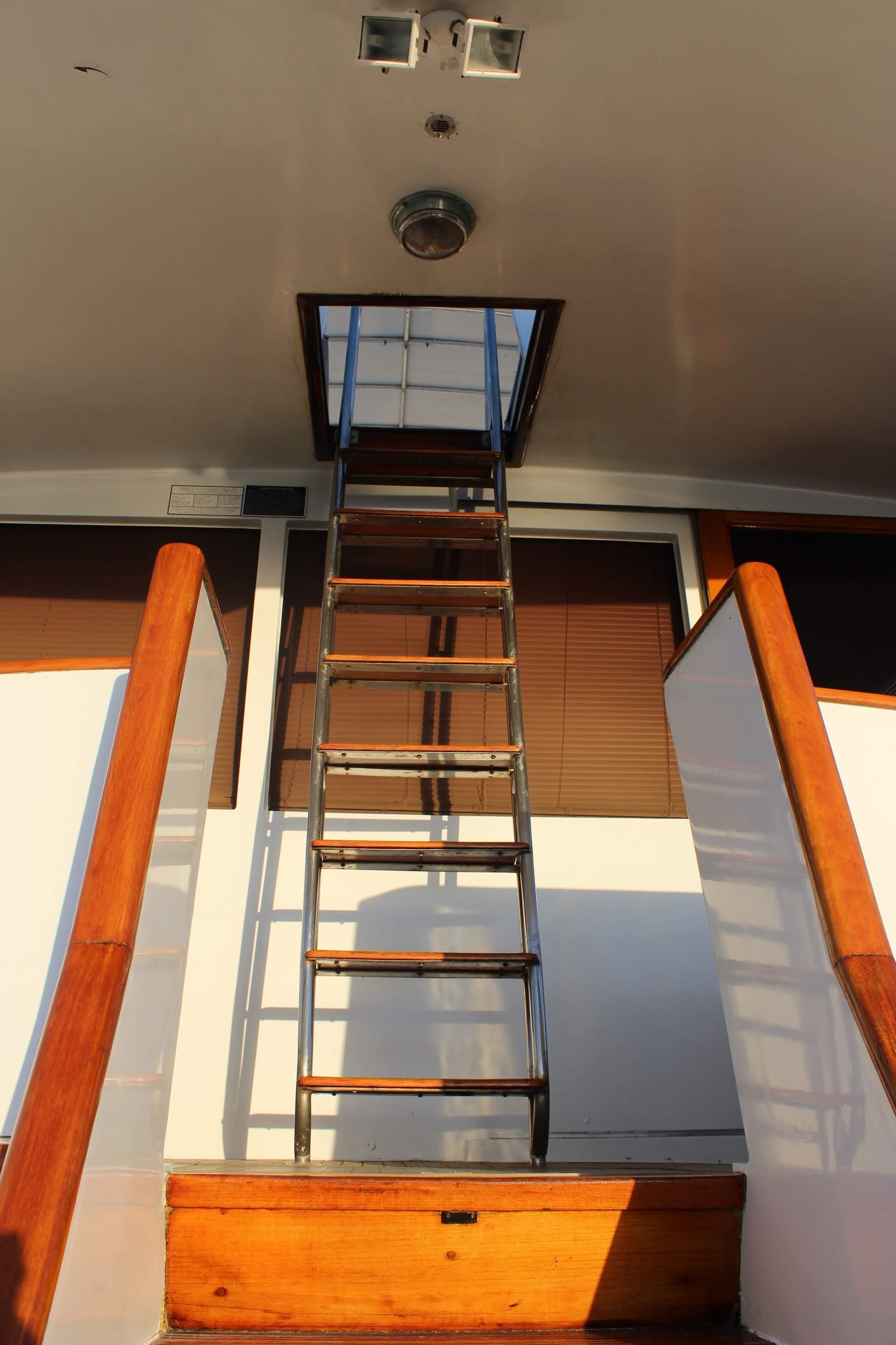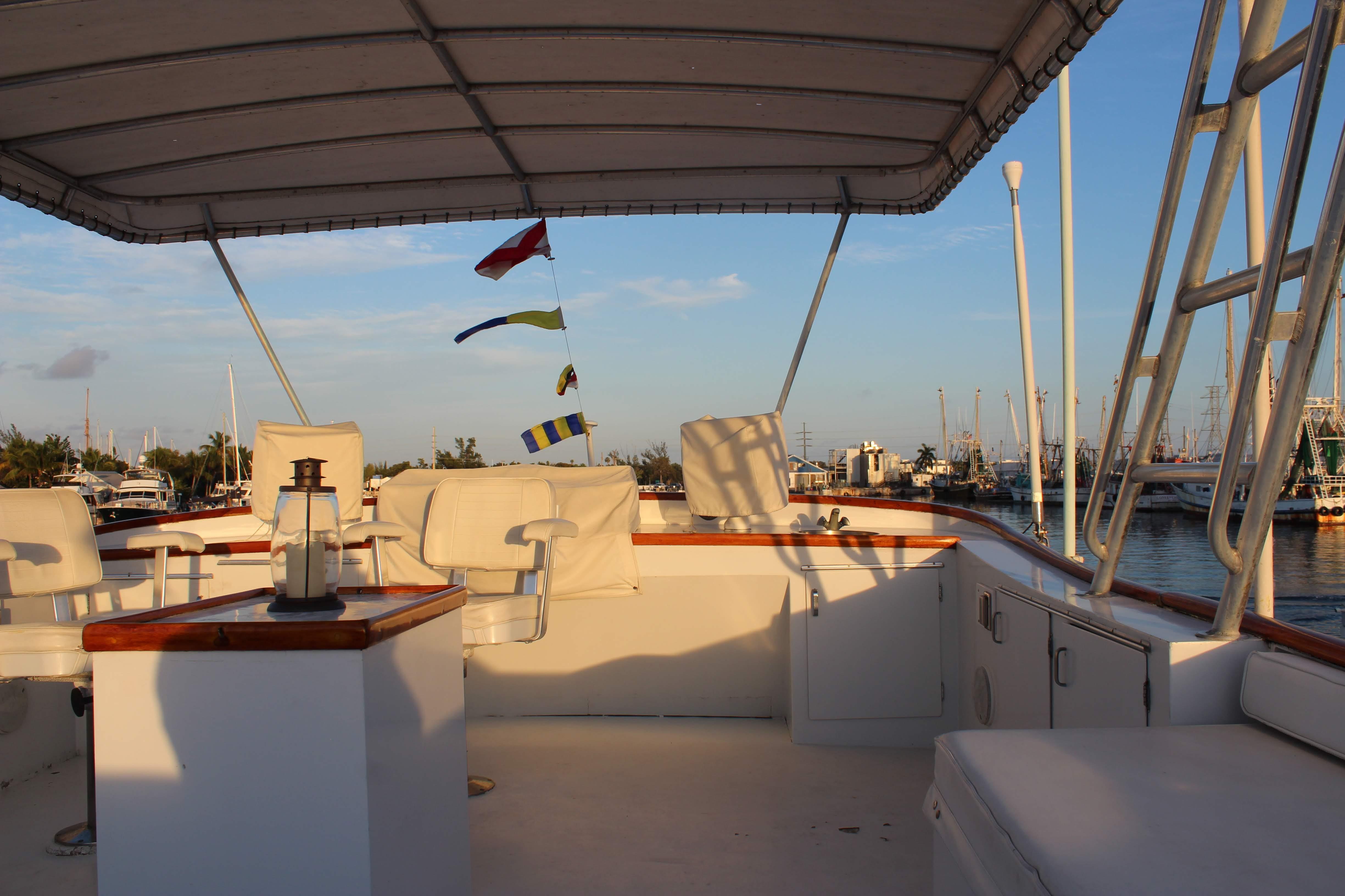A comfortable yacht, the Roamer features a split-level layout with a deckhouse salon and lower-level dining area, two staterooms (each with a private head, and crew quarters forward. The galley is on the deckhouse level, open to the spacious full-width and extended main salon with a large walk-behind bar. The small aft deck is suitable for line-handling duties, and while the flybridge isn’t large by today’s standards, it’s still able to accommodate a small crowd with ease.