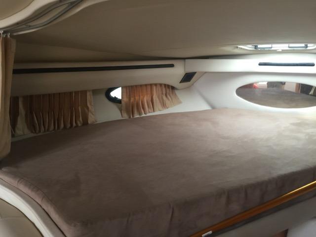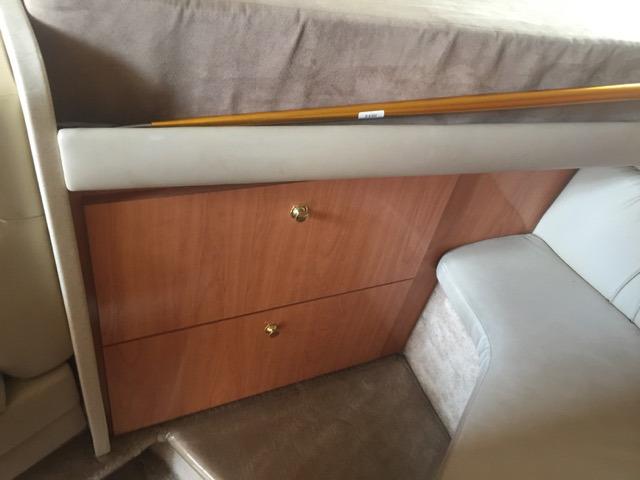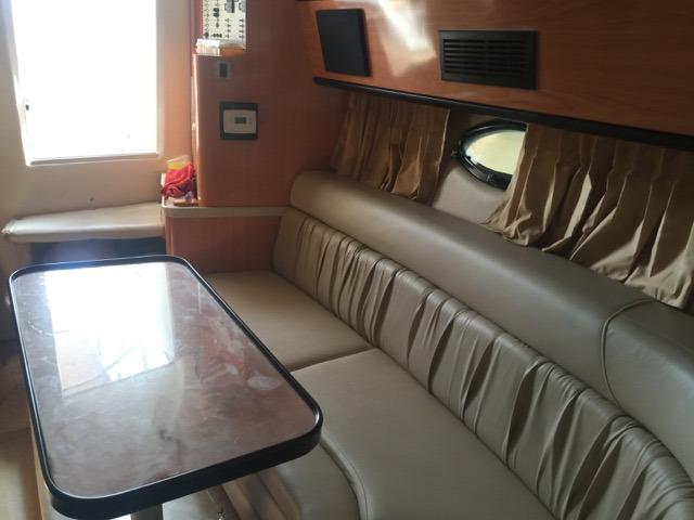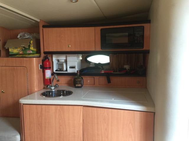 The galley offers a stainless sink, two-burner electric stove, coffee maker, microwave, concealed refrigerator and Corian countertops. The cockpit also has a sink and refrigerator, additional table, all to make life a little easier while out enjoying the water.