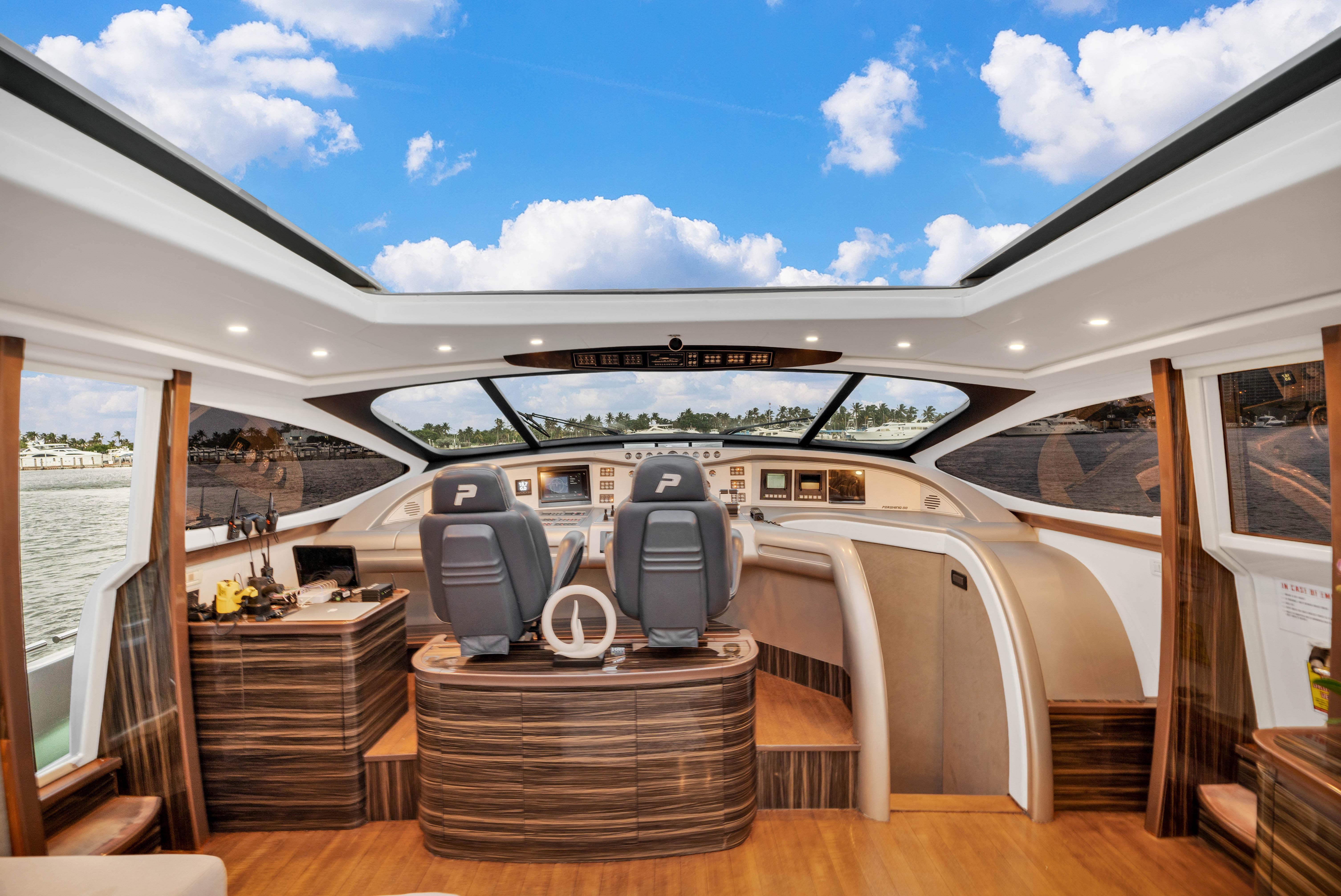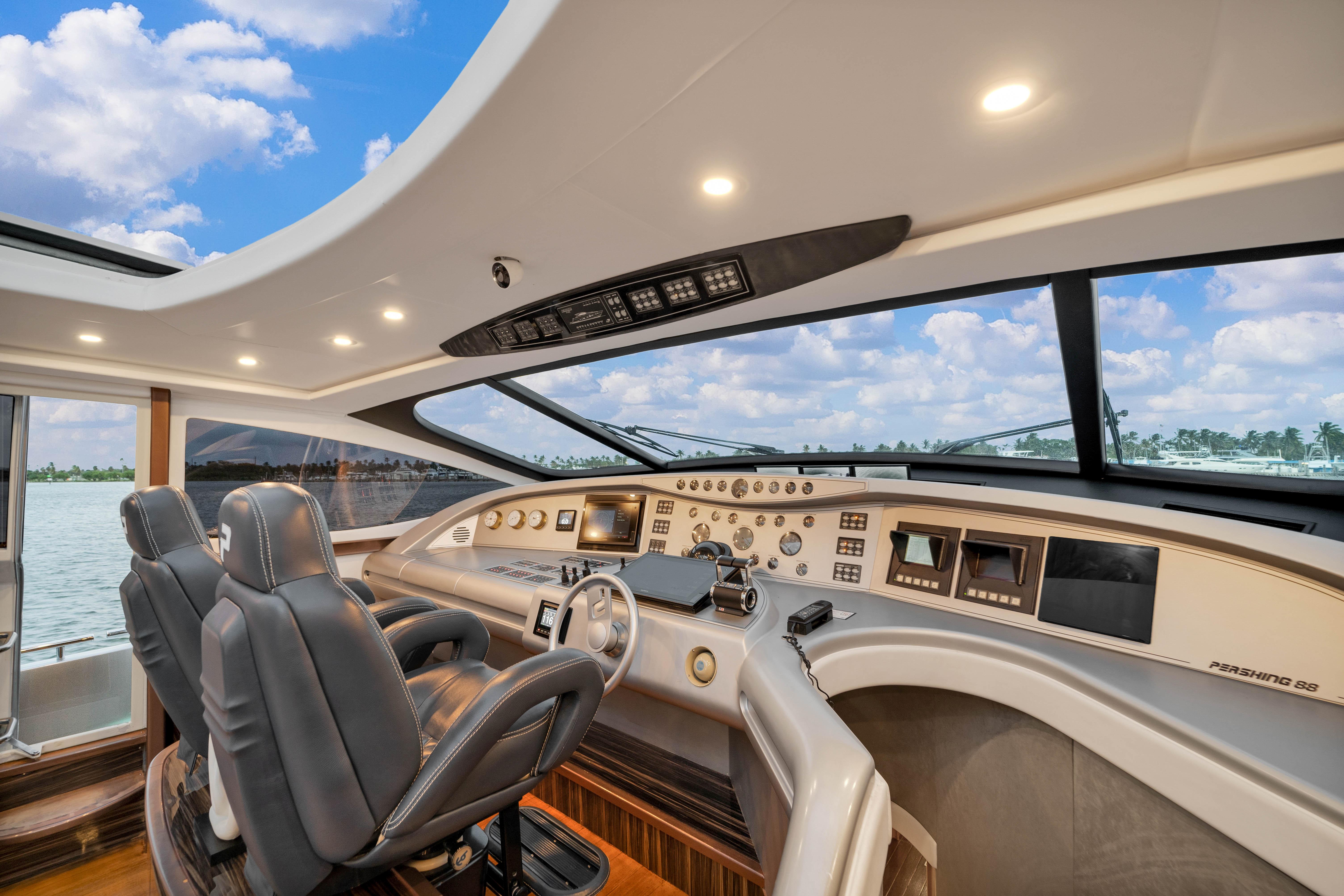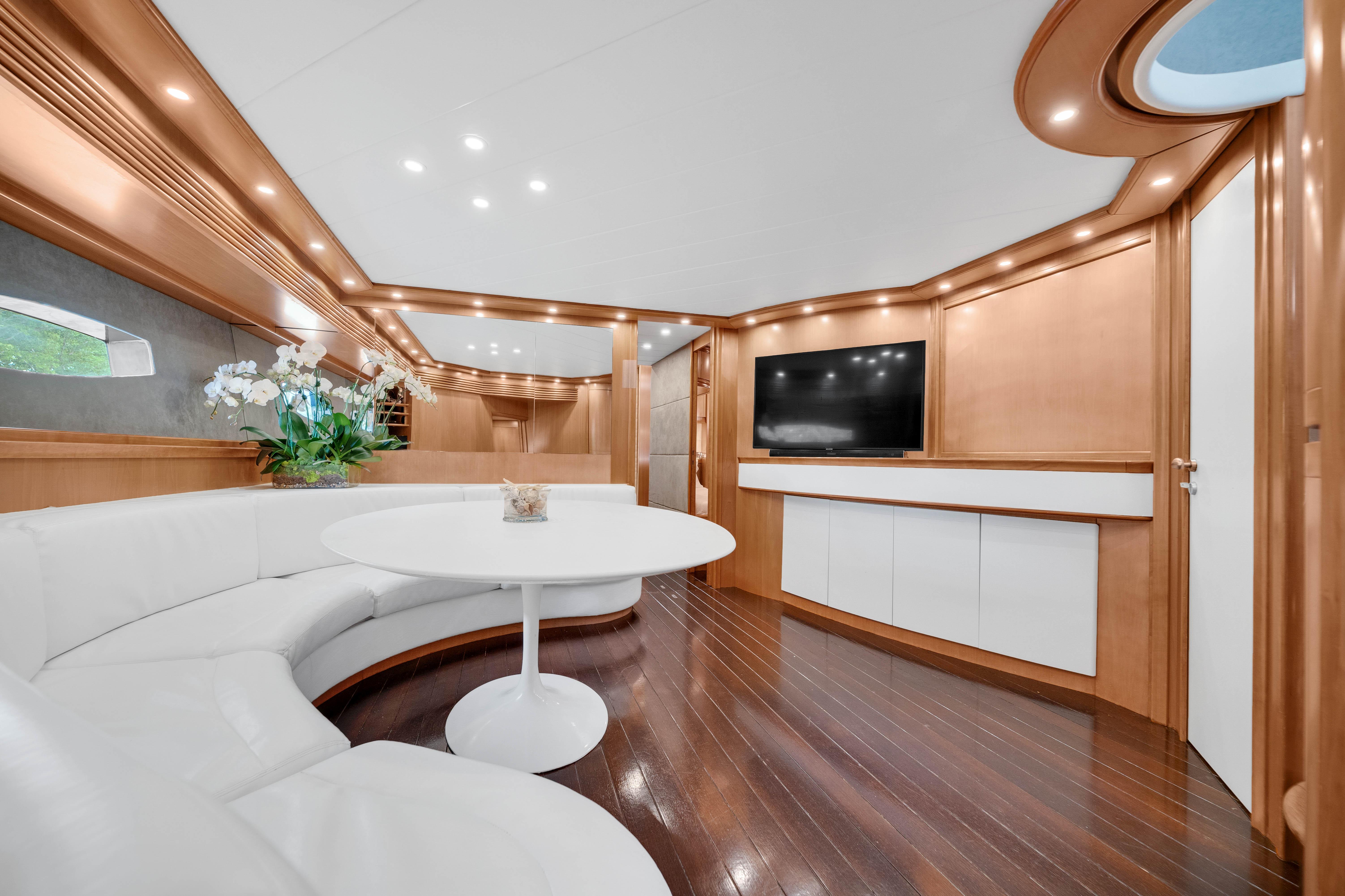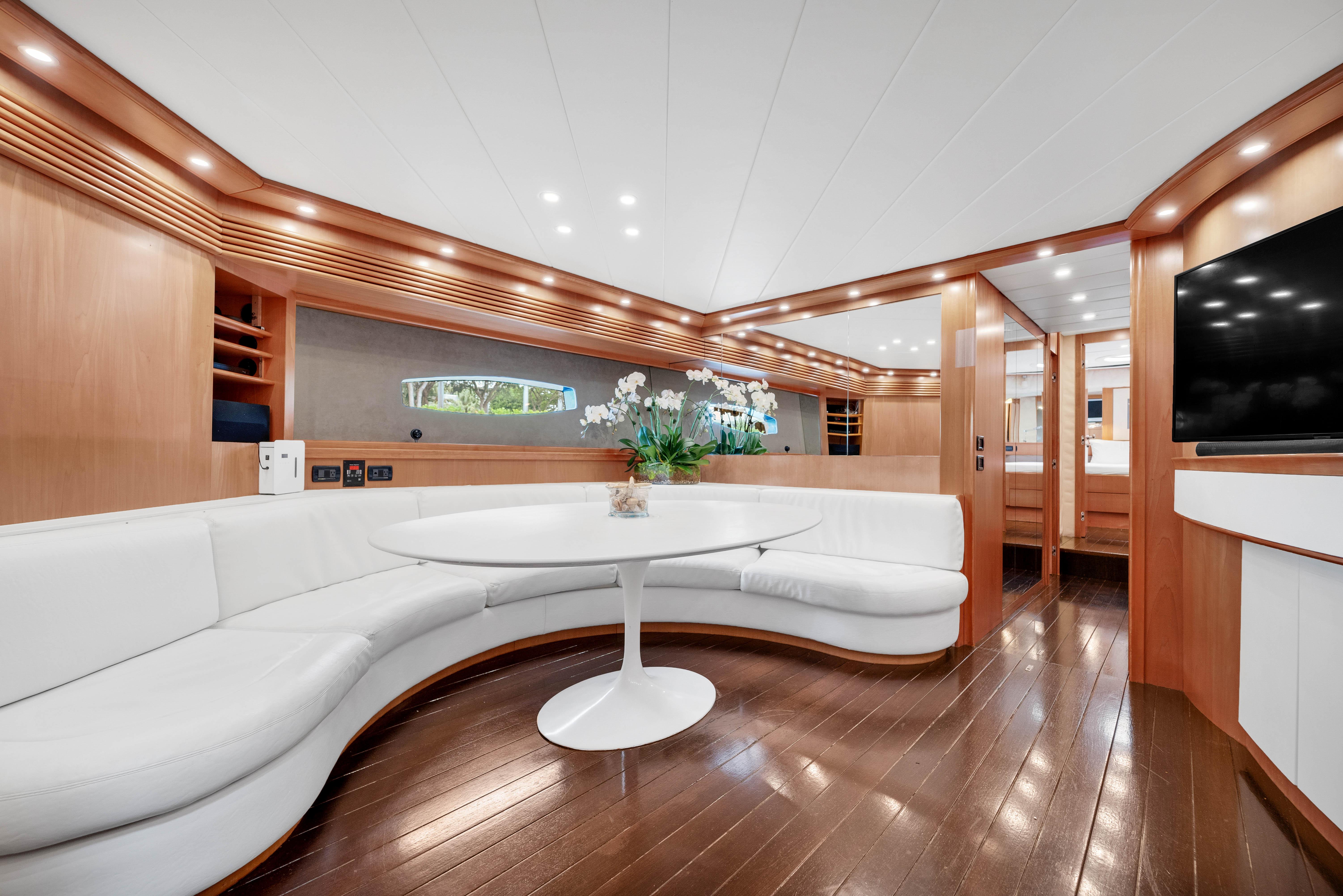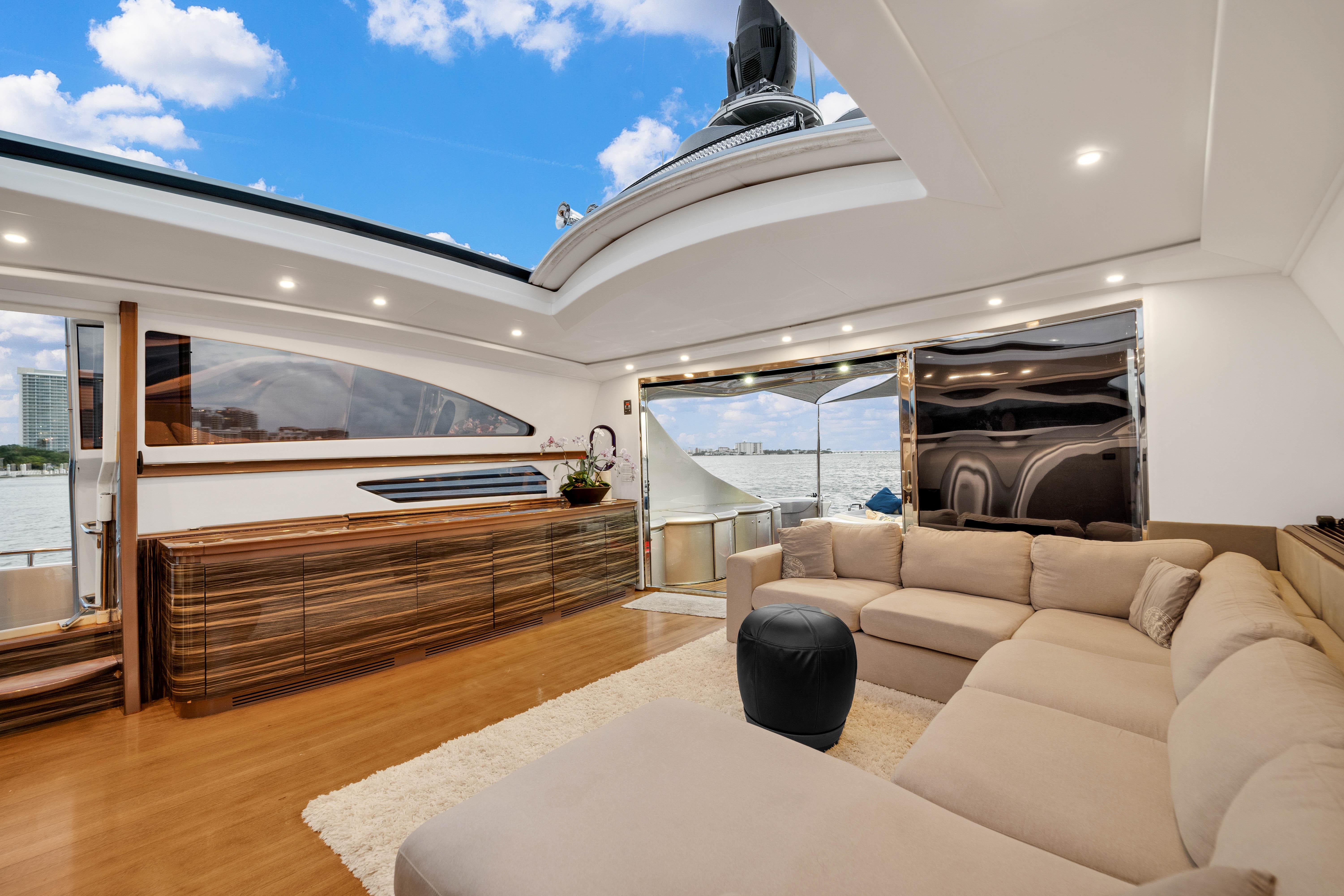 The upper Salon opens up to a built-in semicircular custom (NEW) Italian leather sofa set WITH 2 chairs and a table. Located starboard is a custom cabinetry . The elaborate surround sound and full entertainment system includes a Satellite System. The large electronic Sunroof takes entertaining to a new level.