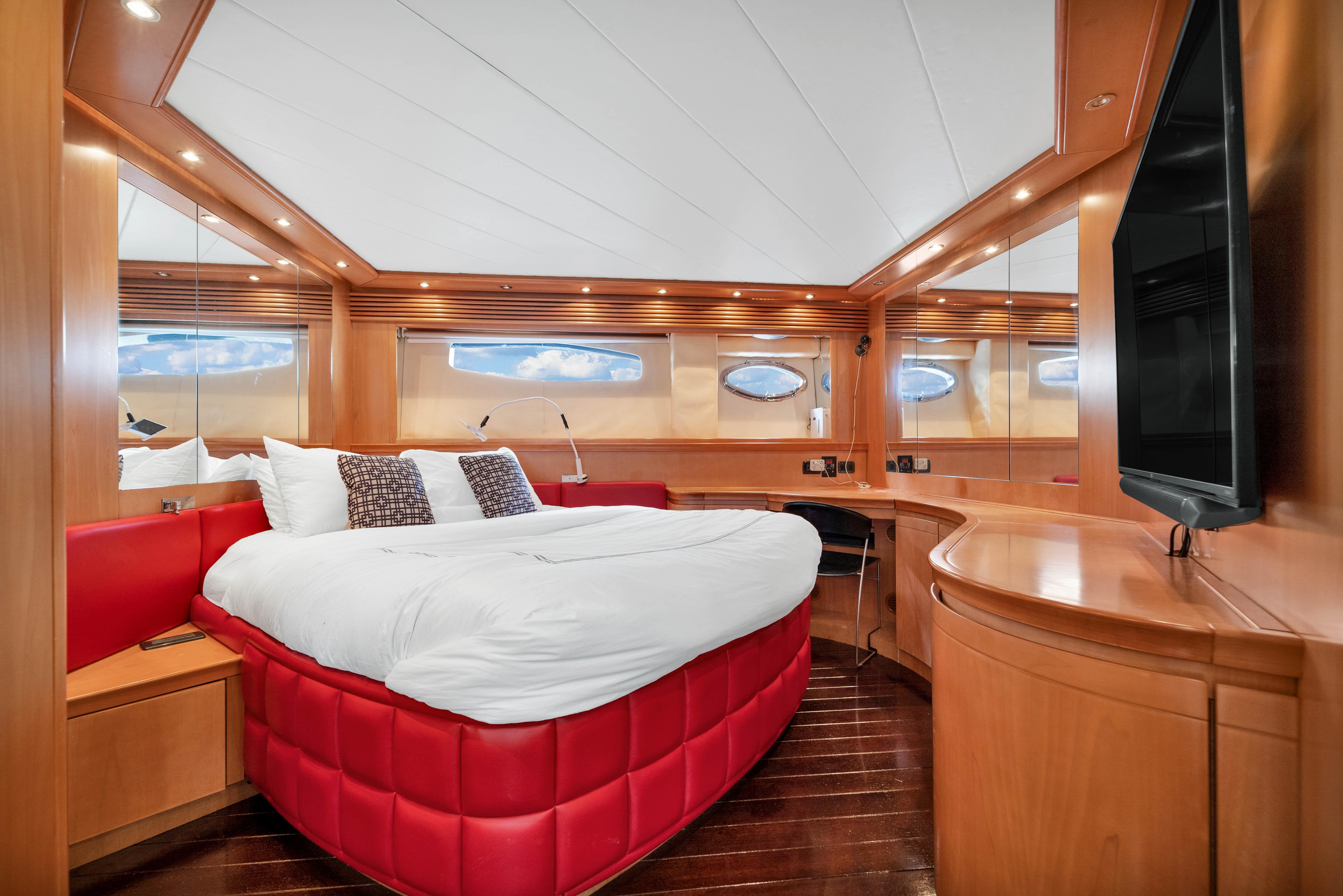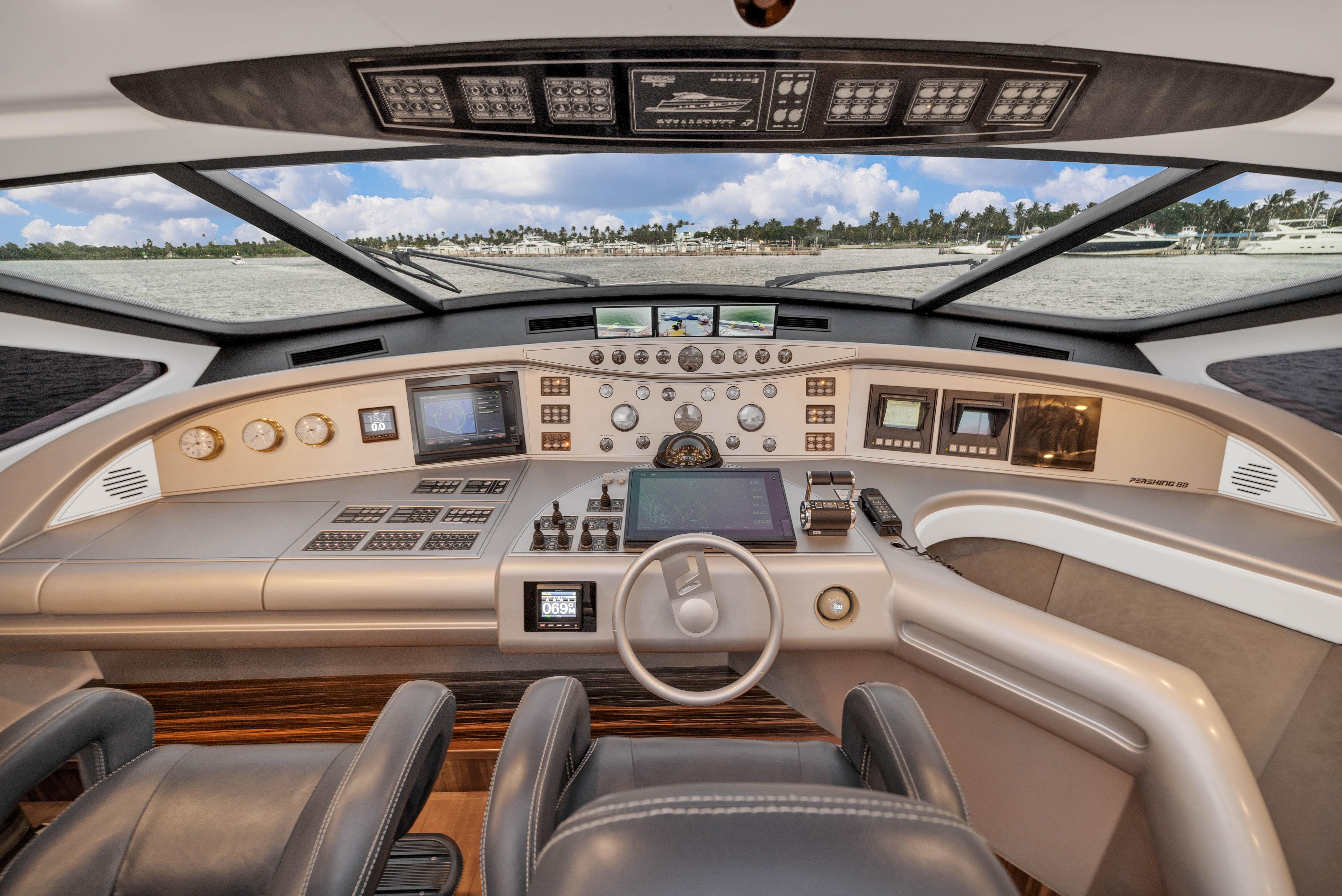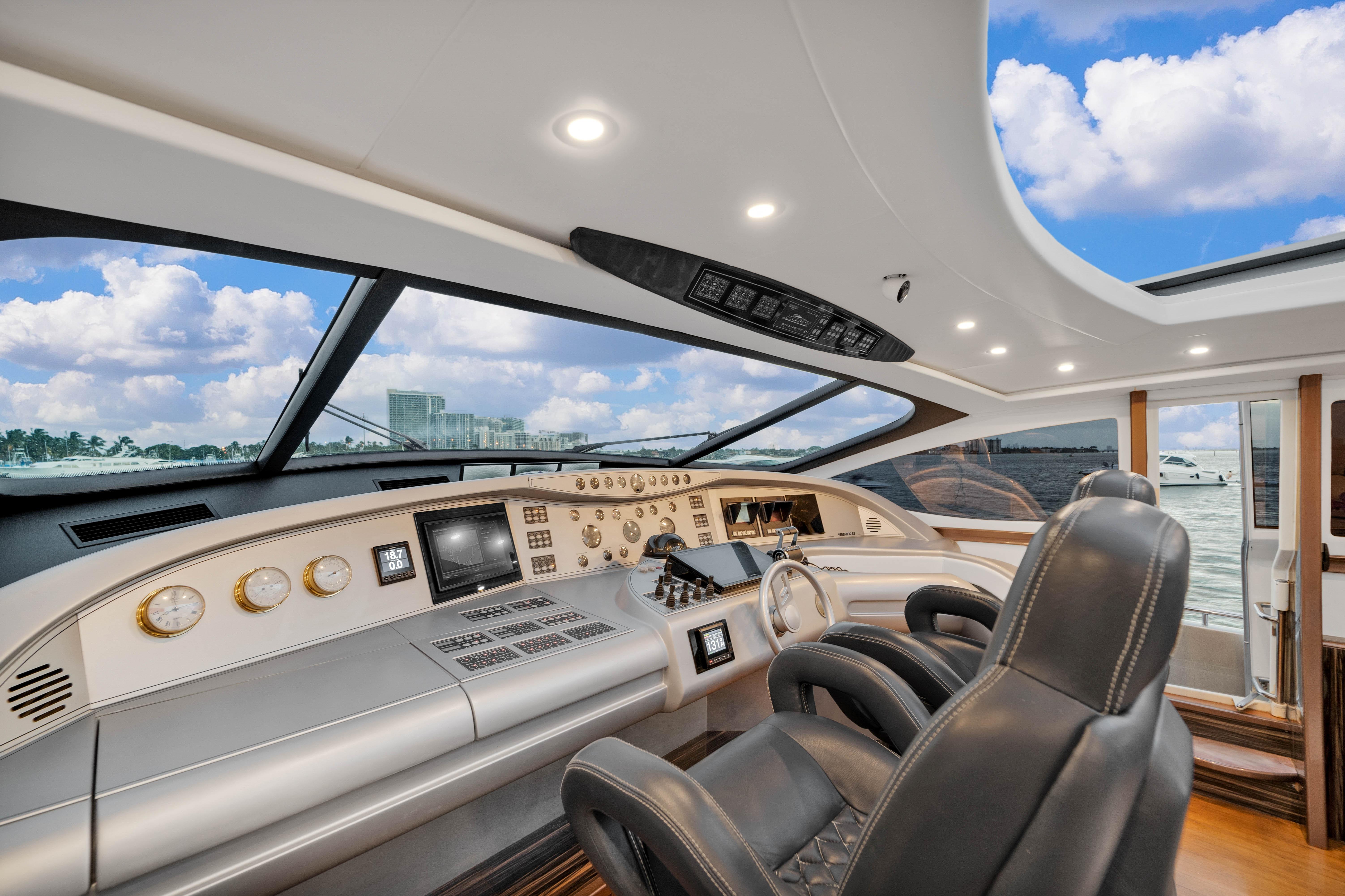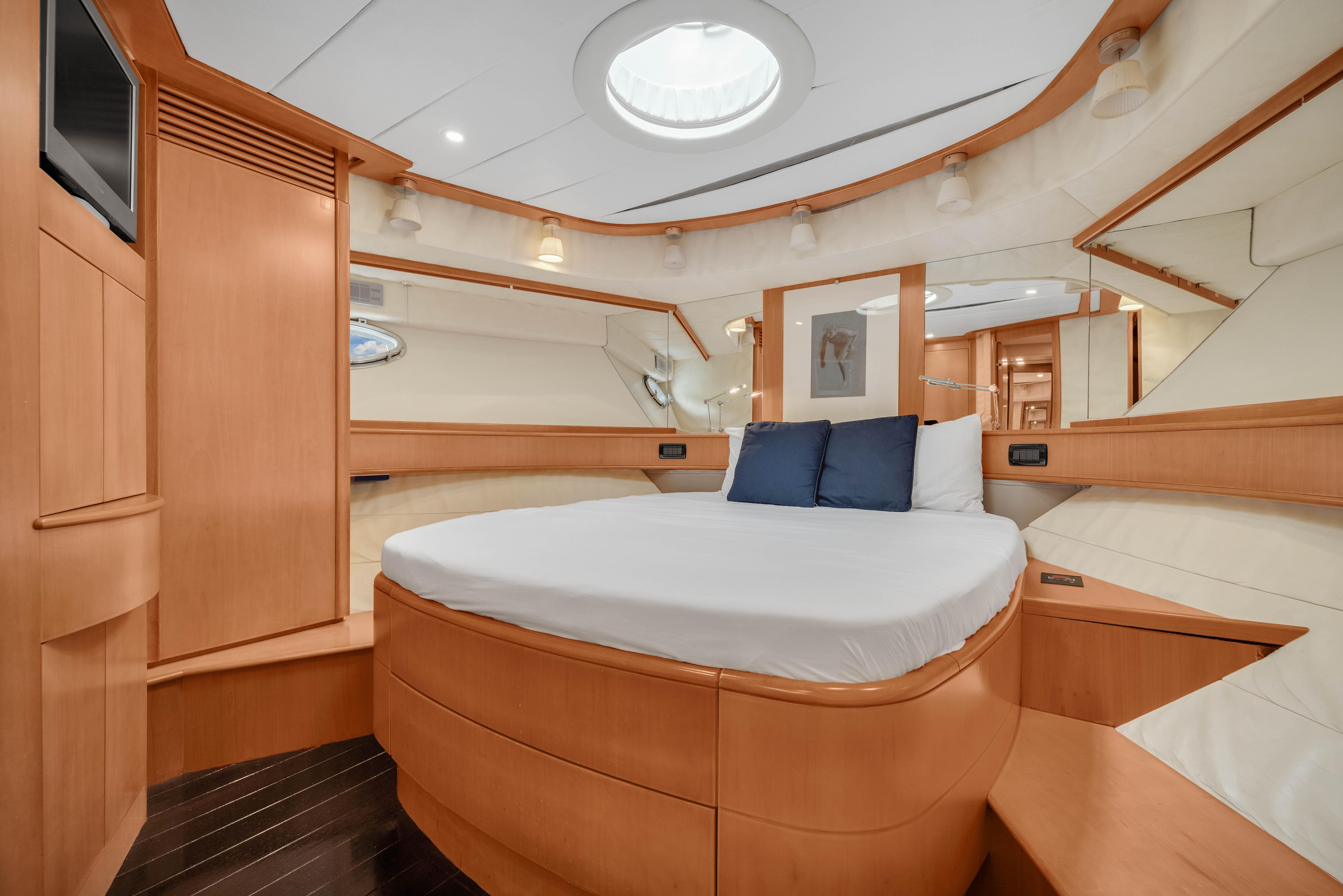 The upper Salon opens up to a built-in semicircular custom (NEW) Italian leather sofa set WITH 2 chairs and a table. Located starboard is a custom cabinetry . The elaborate surround sound and full entertainment system includes a Satellite System. The large electronic Sunroof takes entertaining to a new level.