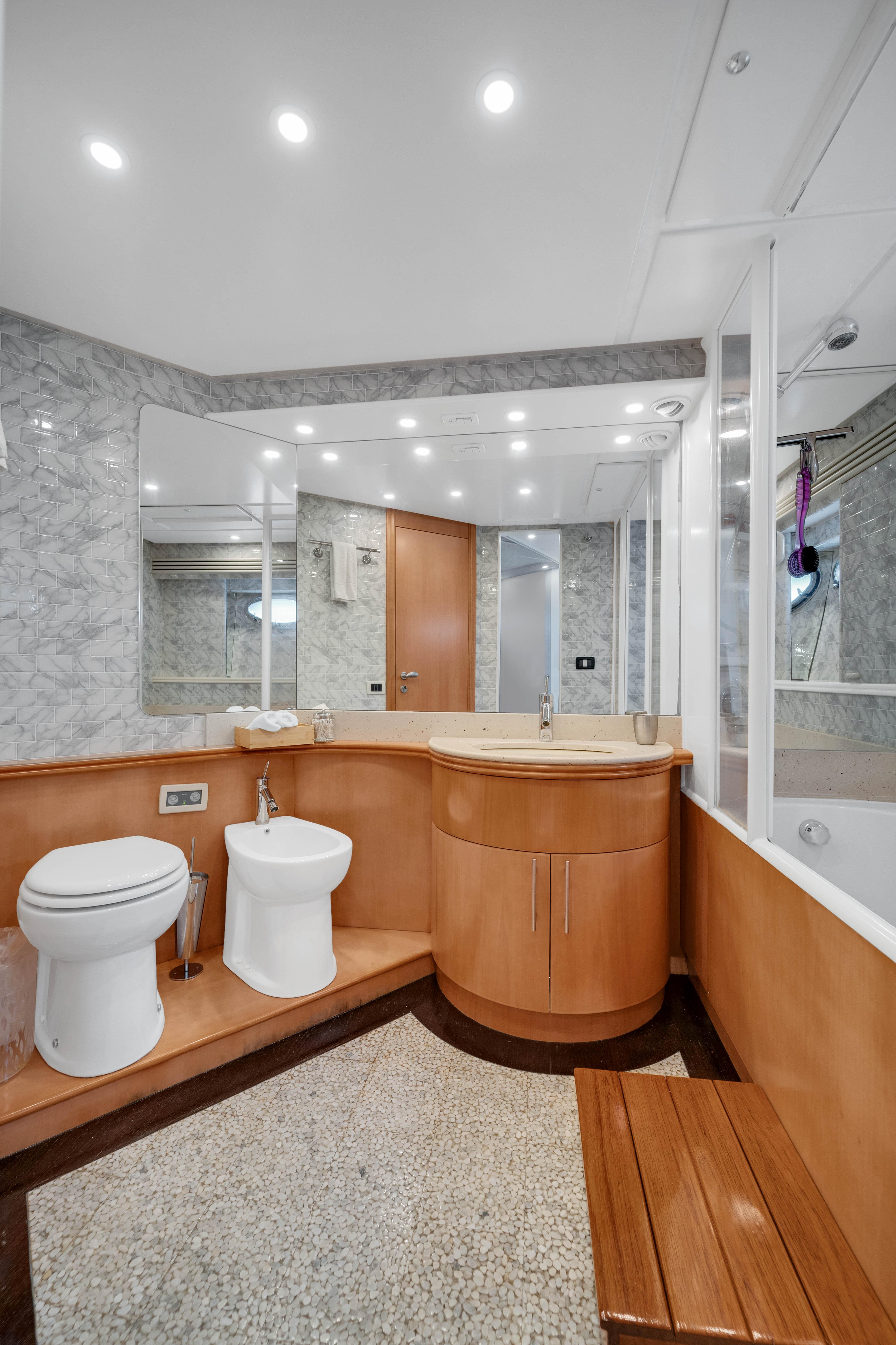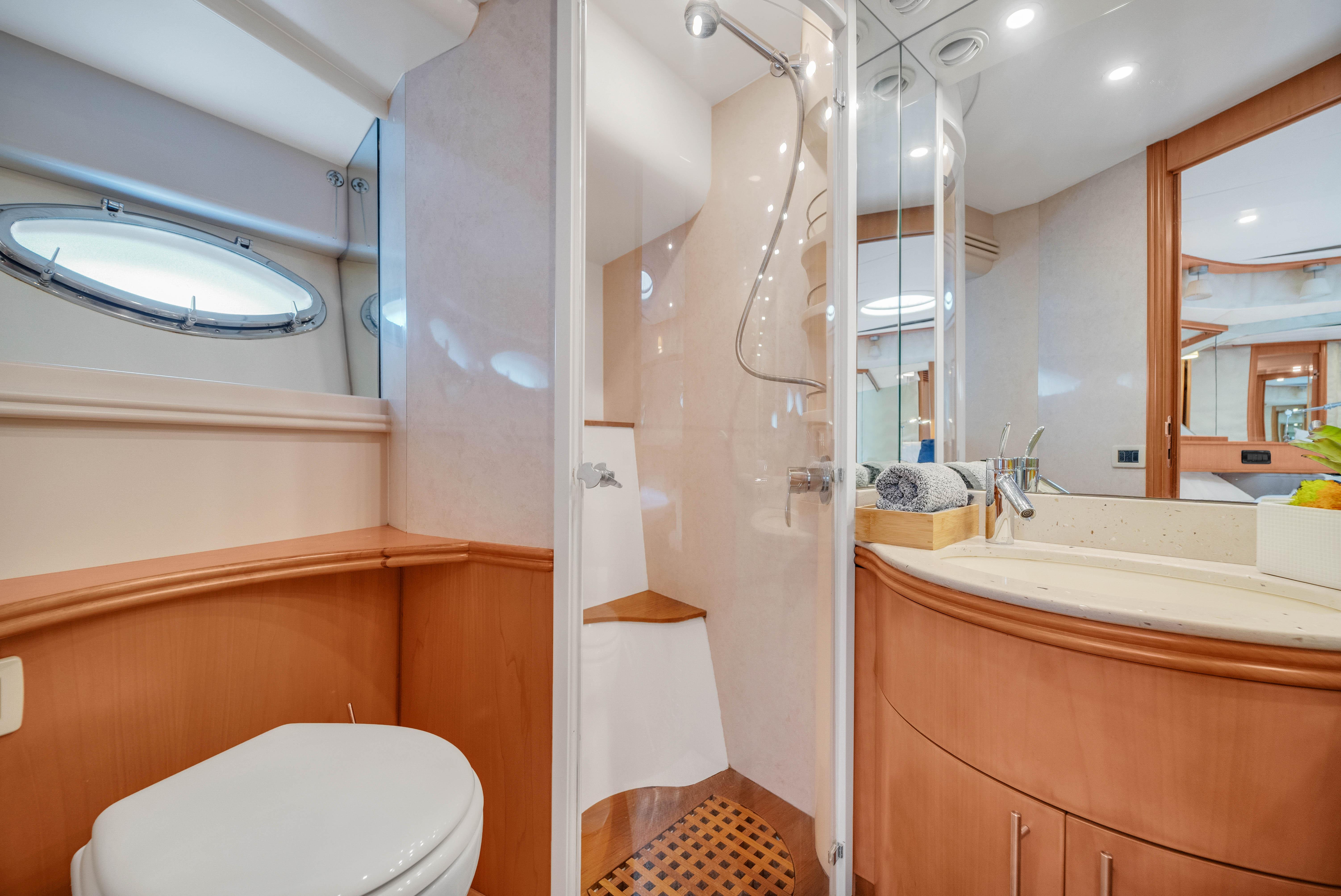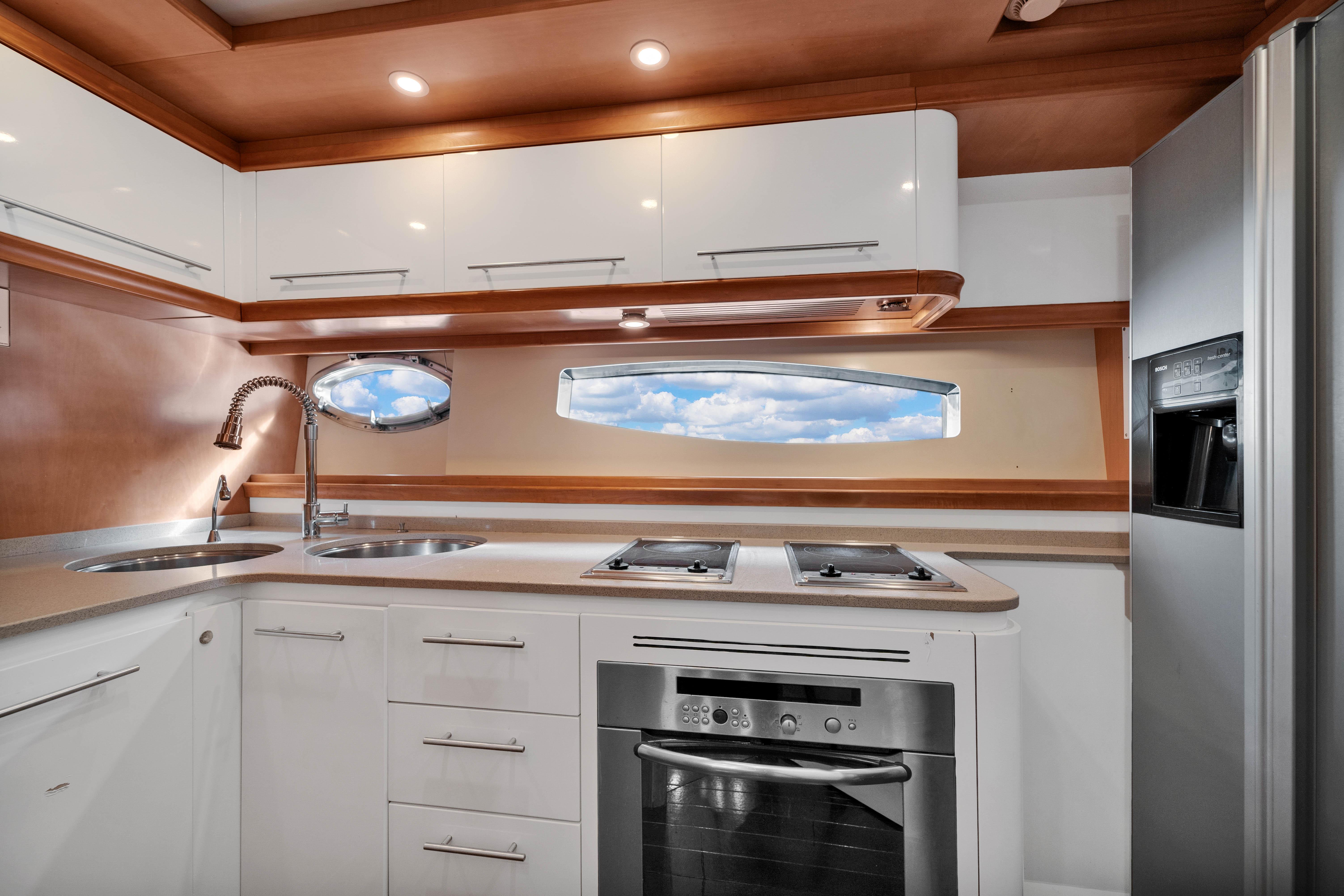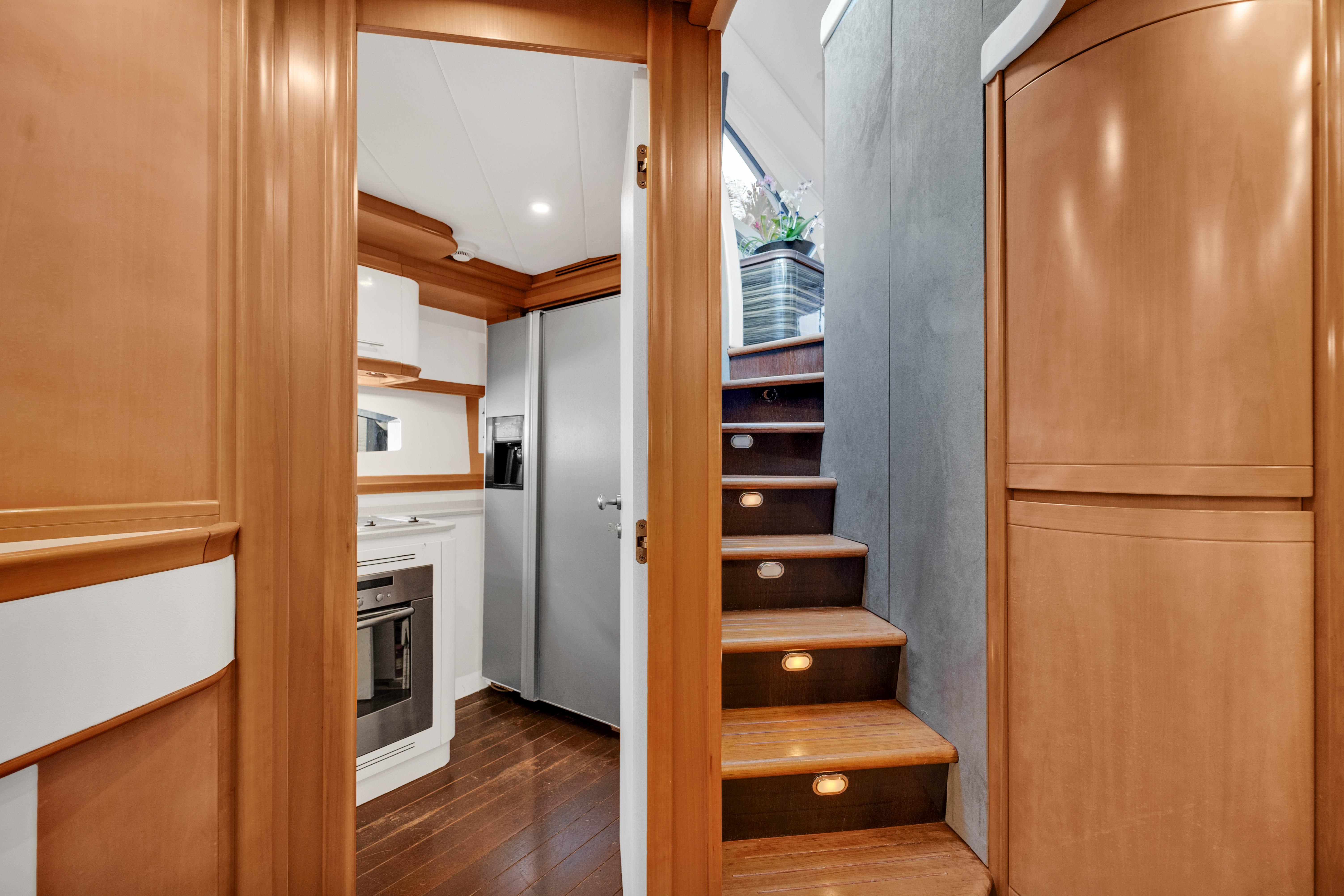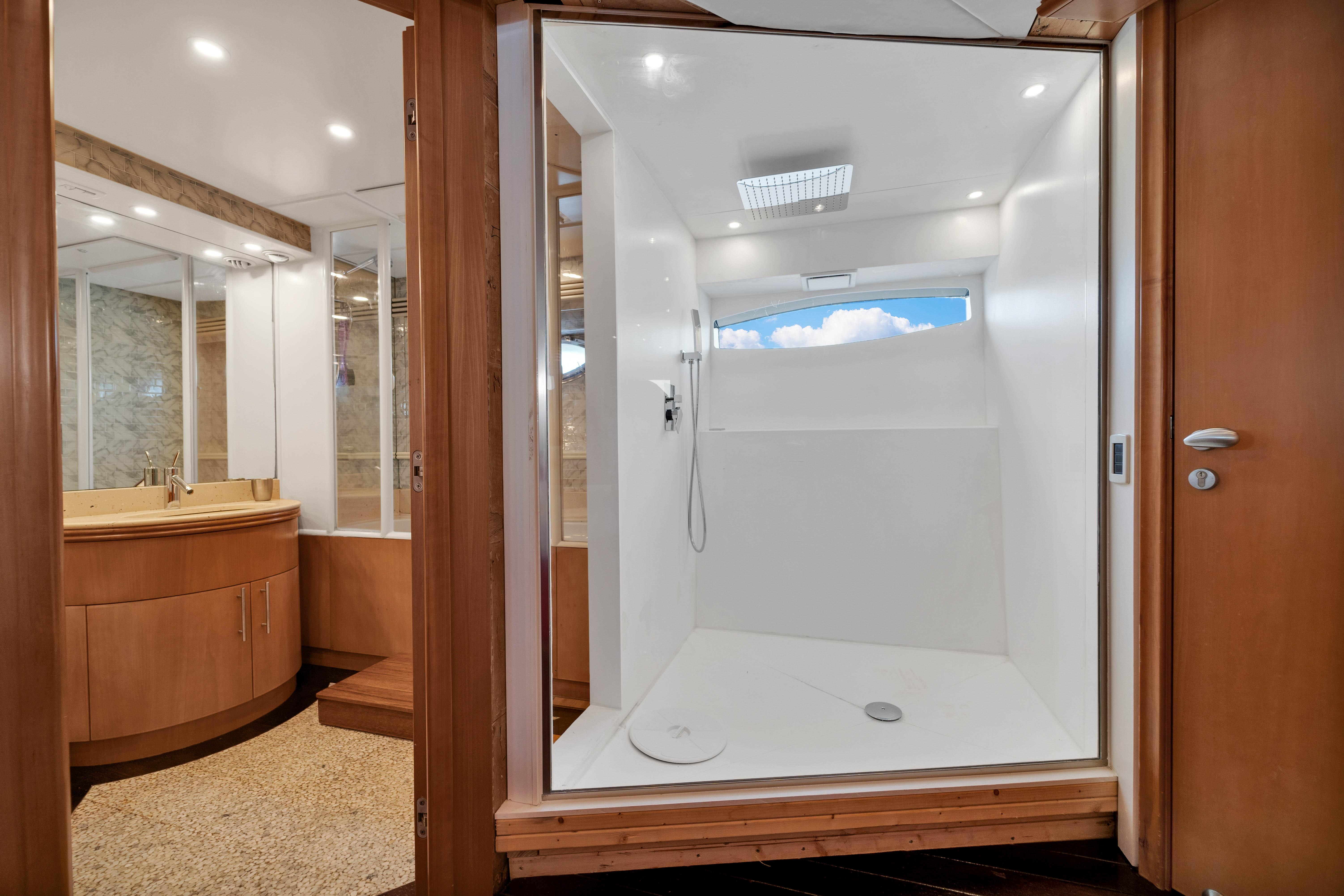 The upper Salon opens up to a built-in semicircular custom (NEW) Italian leather sofa set WITH 2 chairs and a table. Located starboard is a custom cabinetry . The elaborate surround sound and full entertainment system includes a Satellite System. The large electronic Sunroof takes entertaining to a new level.