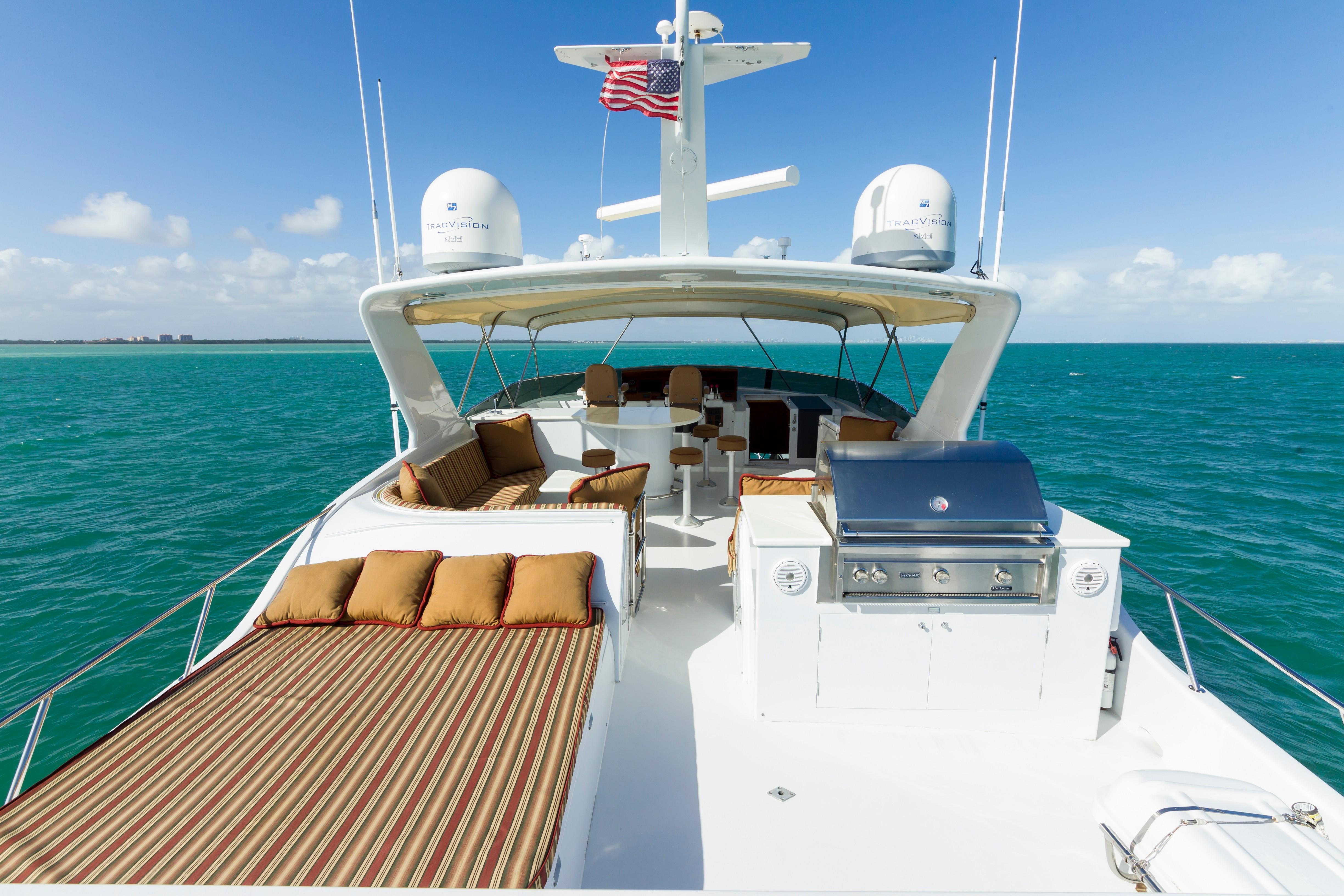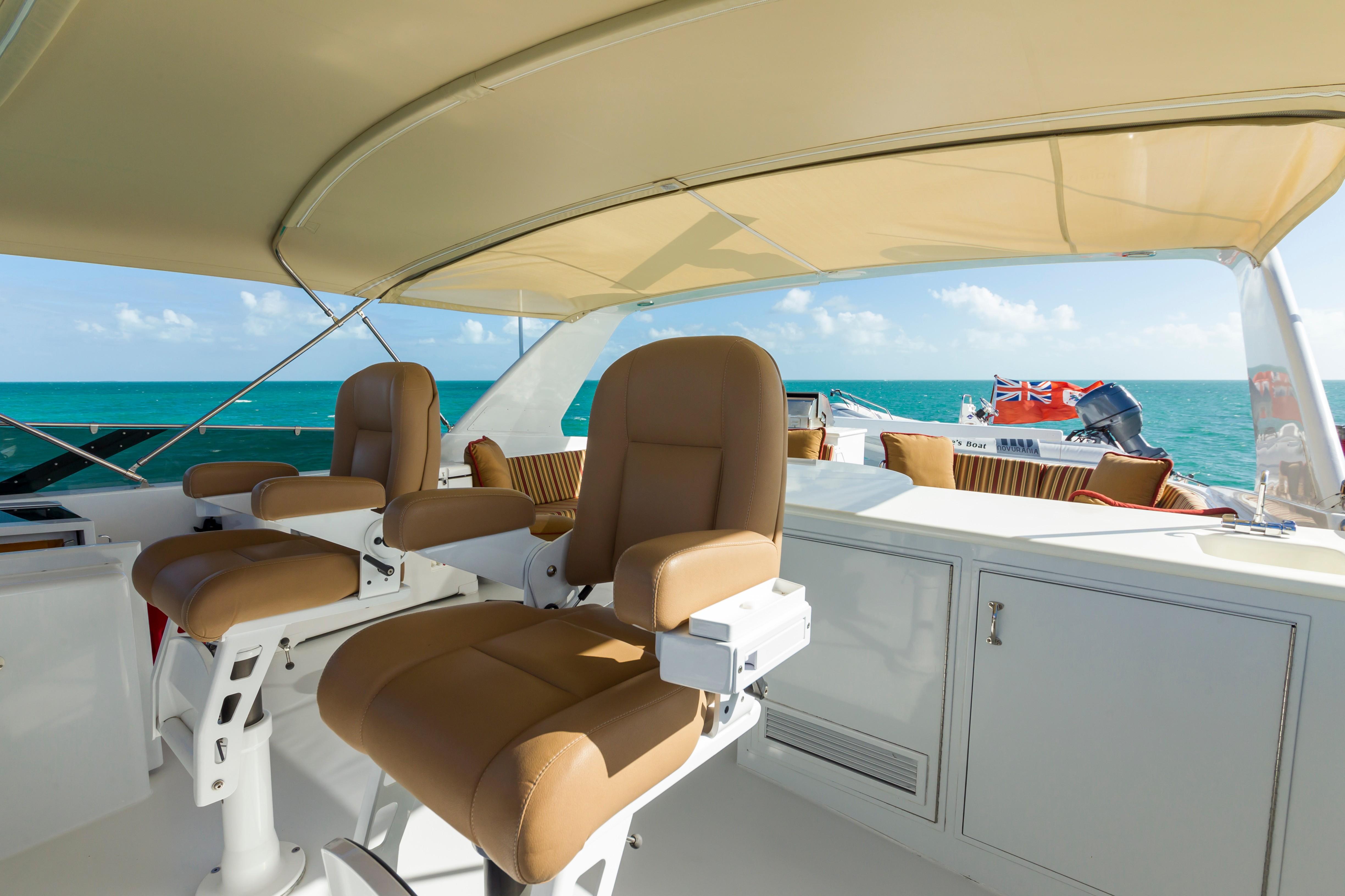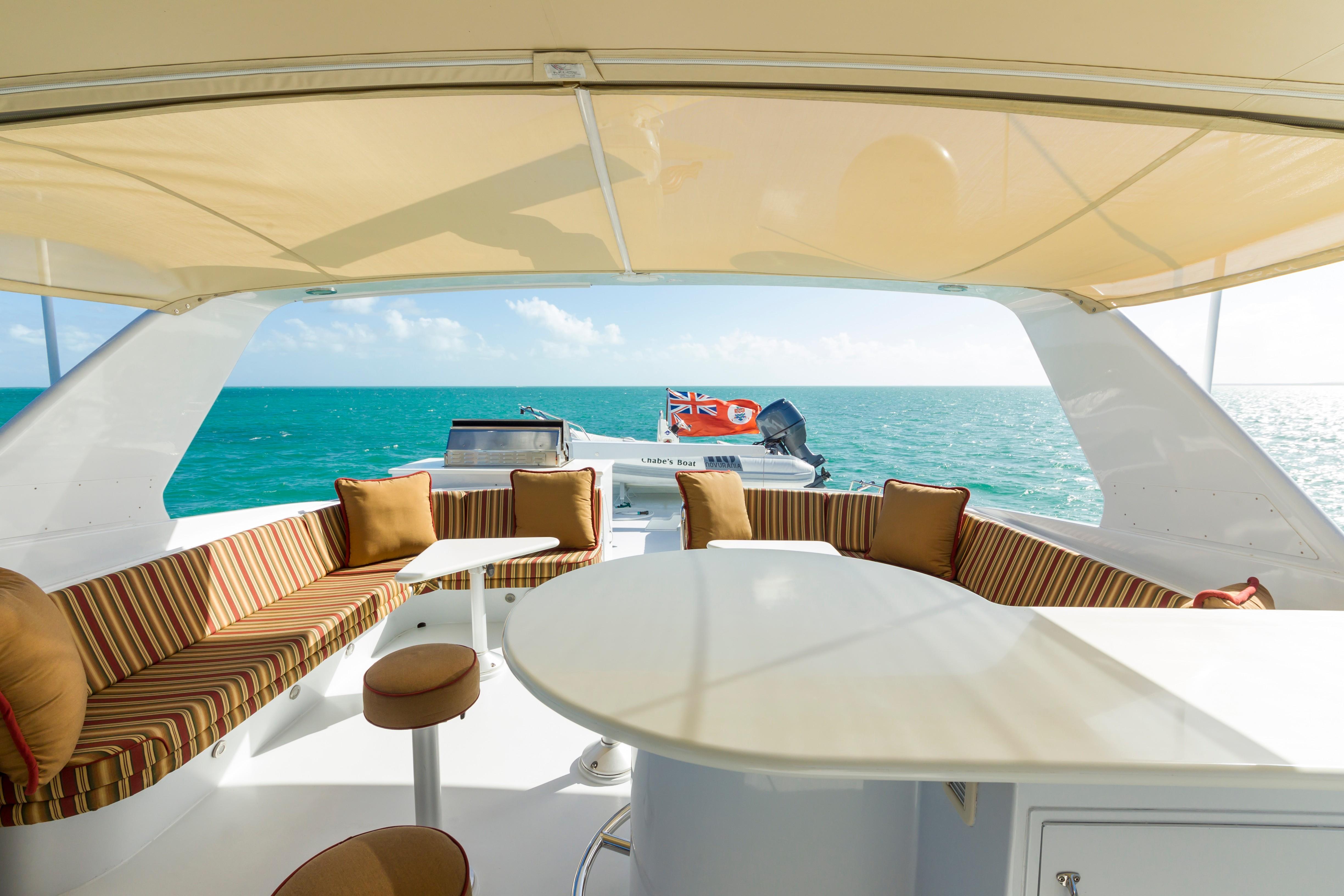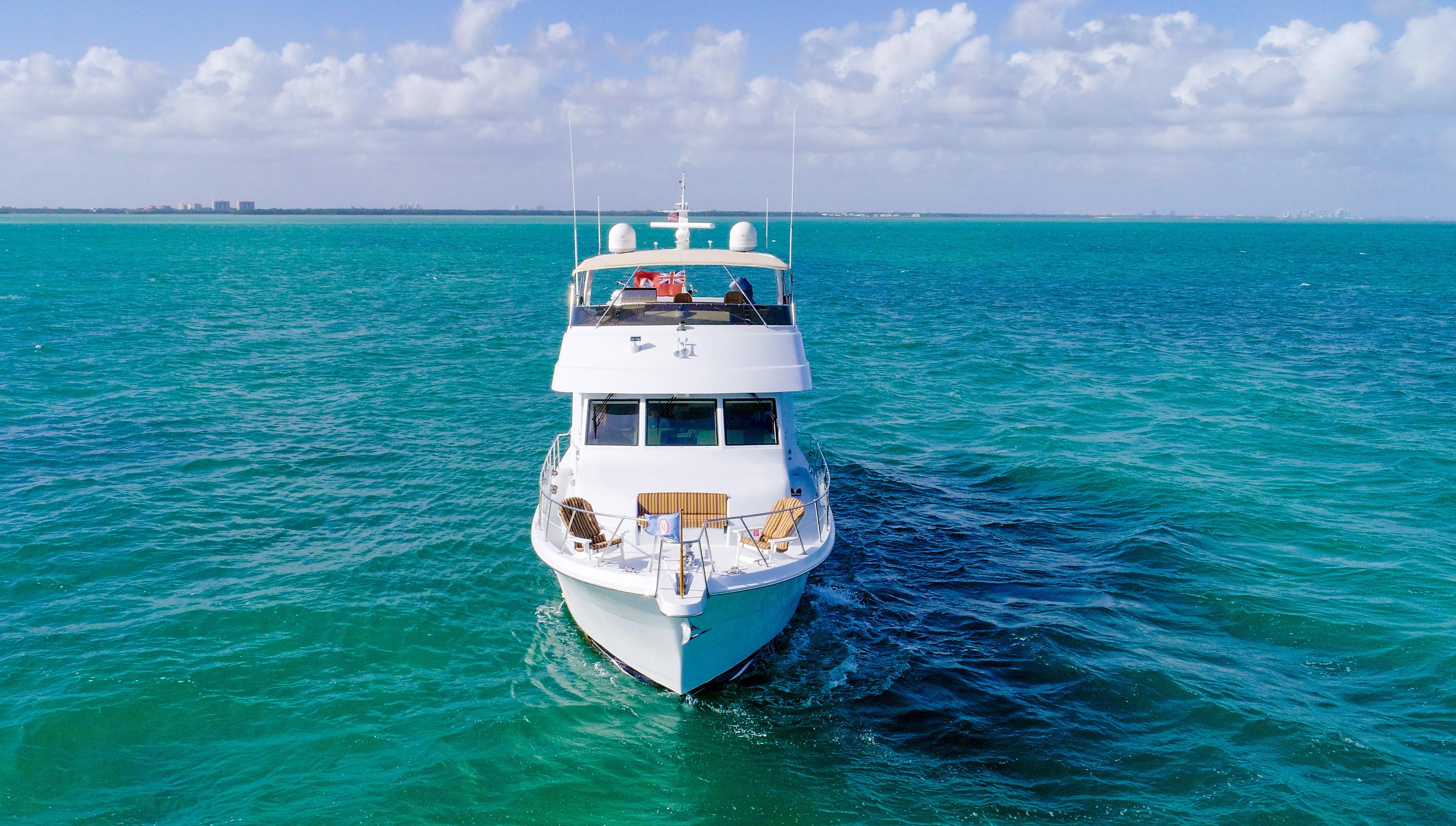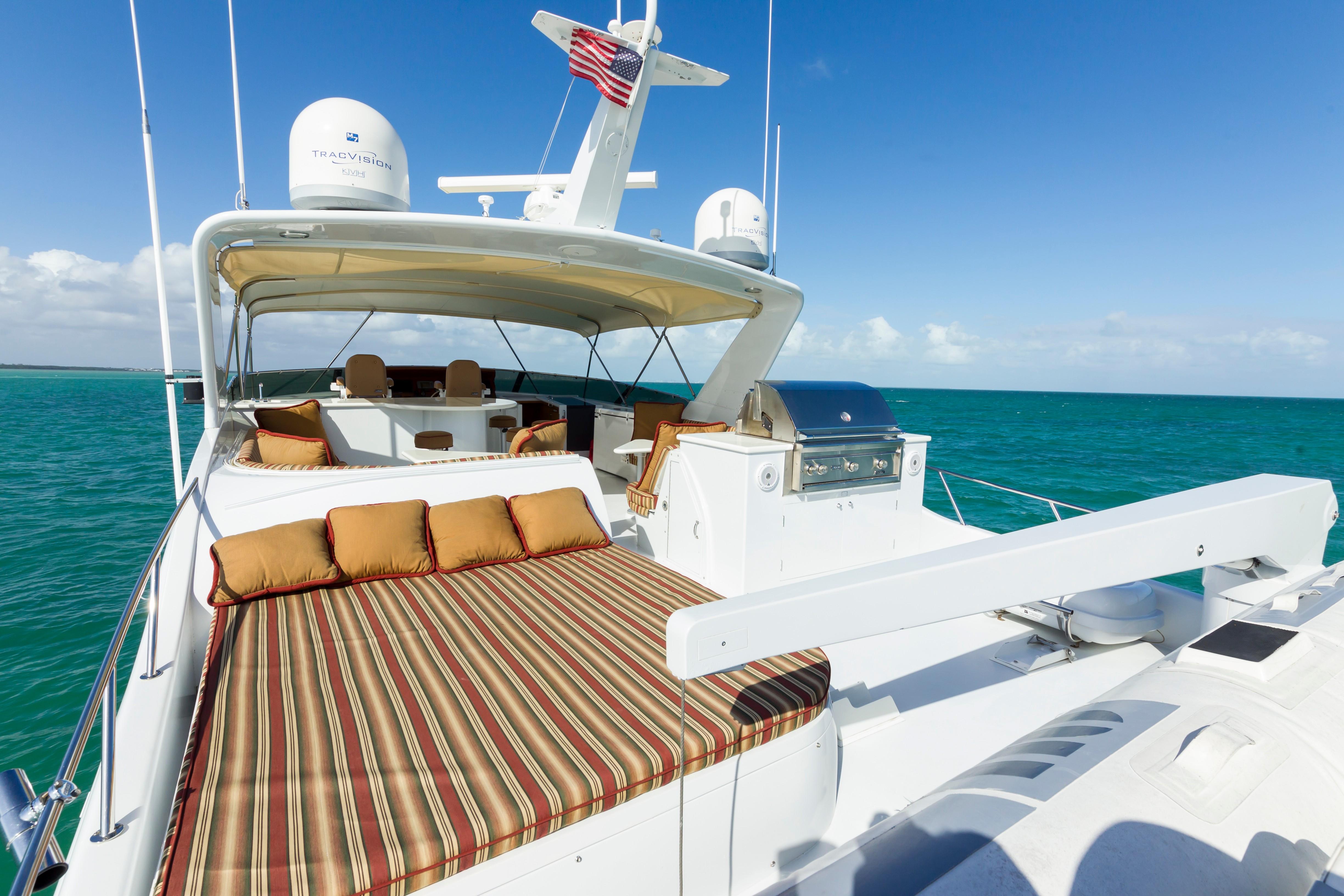 She features a 4 stateroom/4 head layout with a warm cherry wood interior. The master stateroom is aft with his and her heads. She is fully equipped with a Novurania tender with Yamaha 40 HP, spacious flybridge with key bar, custom built-in Lynx stainless steel grill, twin Onan 27.5KW generators, Naiad Multi-Sea 2000 stabilizers & complete electronics package. Powered by Caterpillars 3412E.