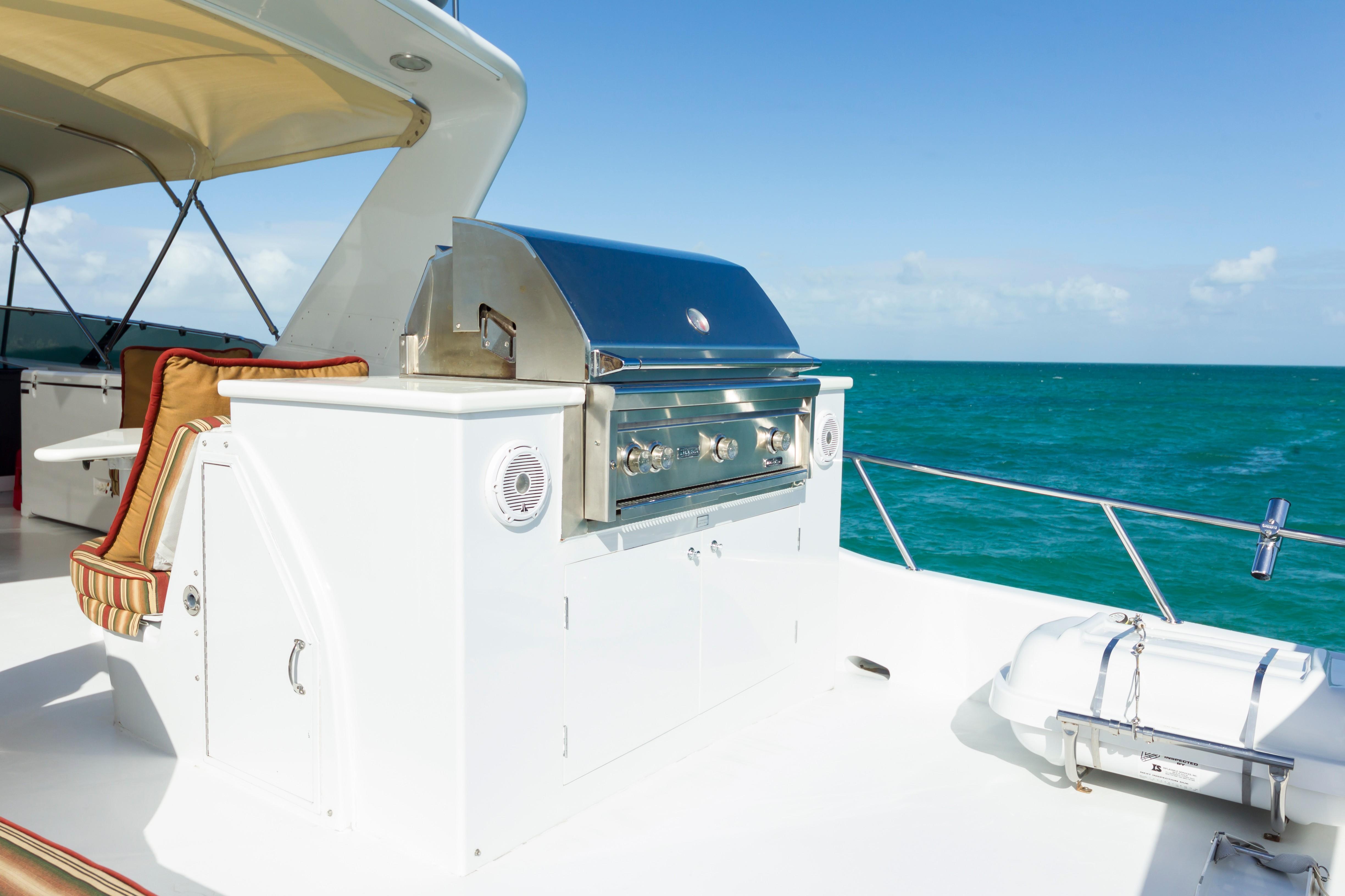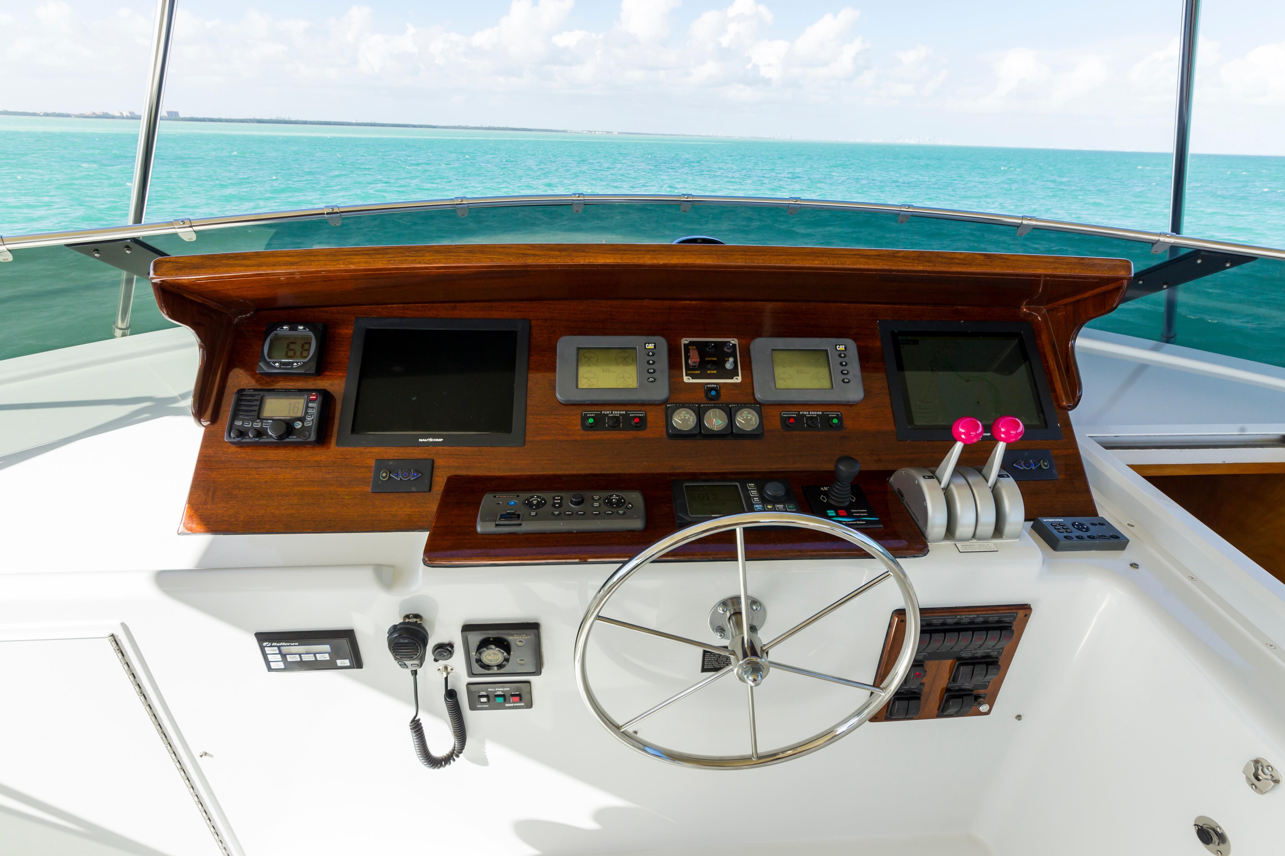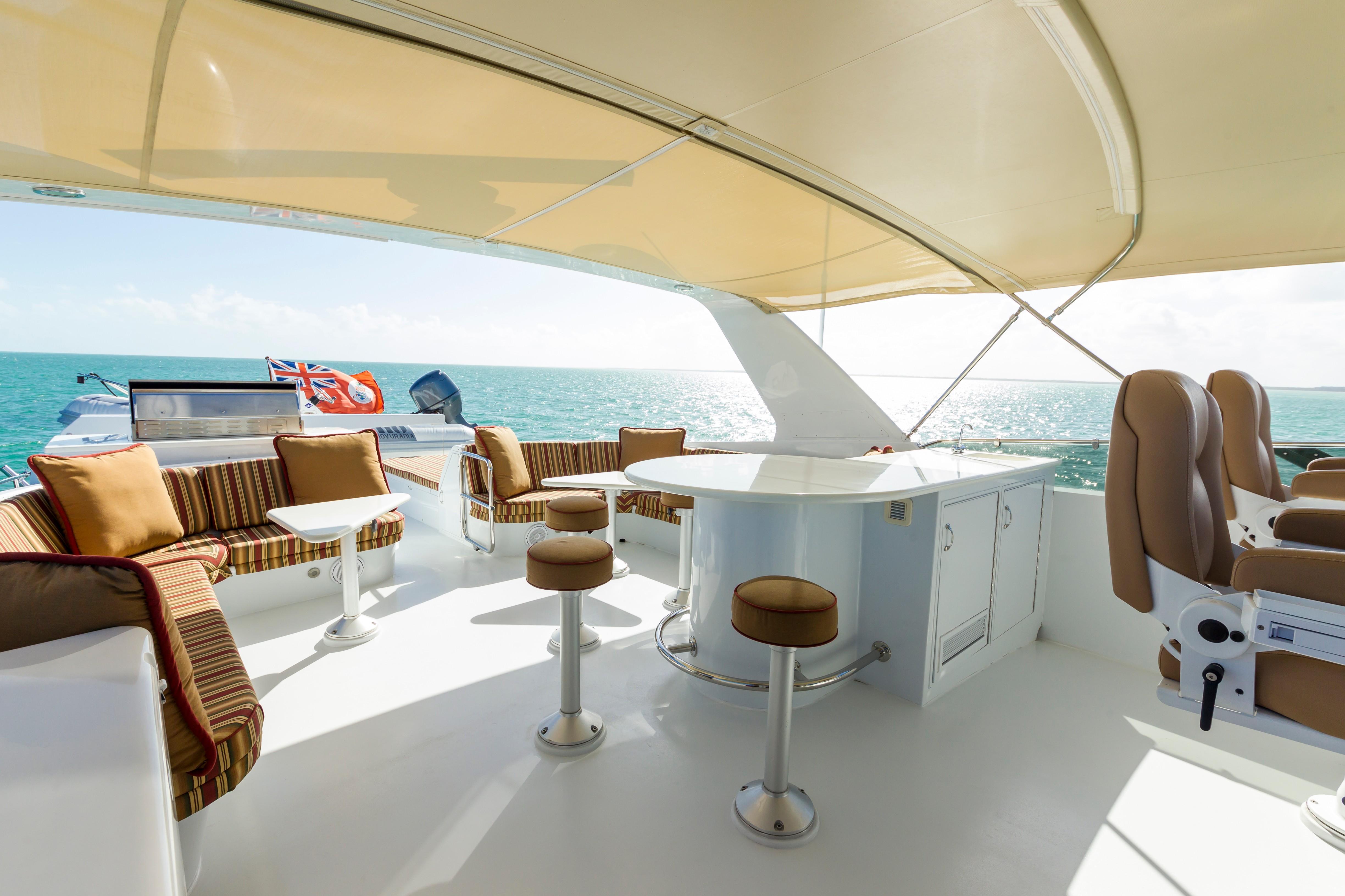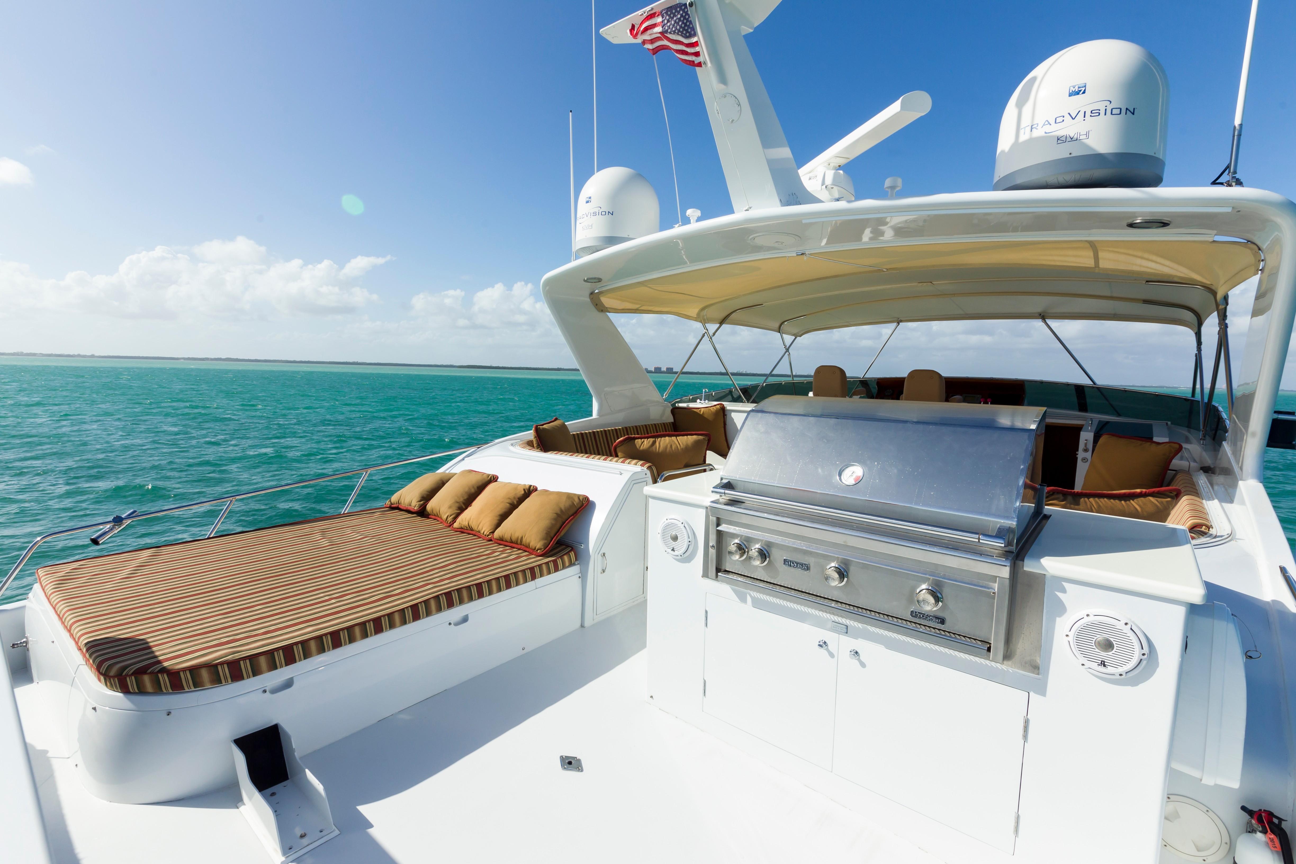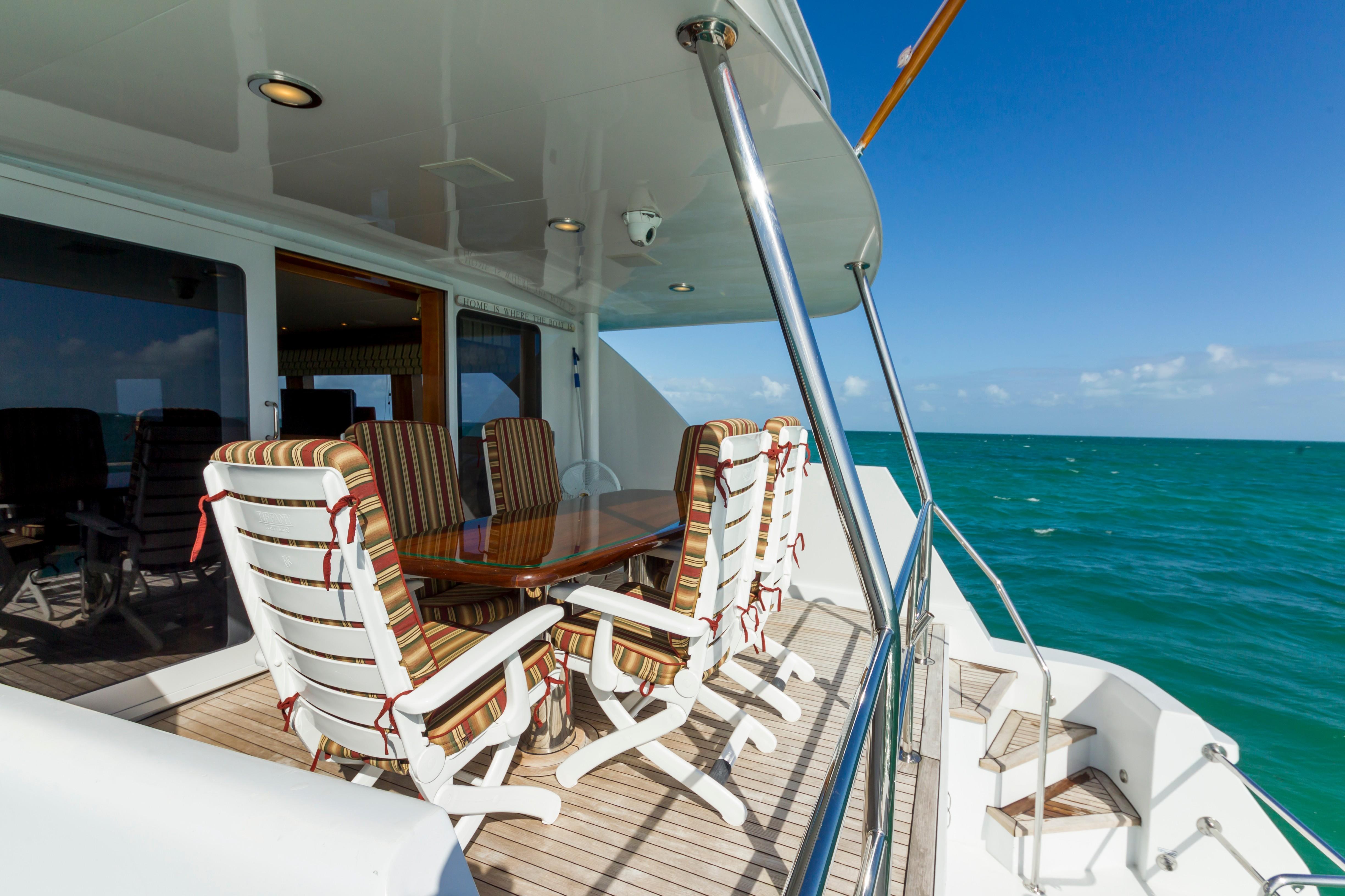 She features a 4 stateroom/4 head layout with a warm cherry wood interior. The master stateroom is aft with his and her heads. She is fully equipped with a Novurania tender with Yamaha 40 HP, spacious flybridge with key bar, custom built-in Lynx stainless steel grill, twin Onan 27.5KW generators, Naiad Multi-Sea 2000 stabilizers & complete electronics package. Powered by Caterpillars 3412E.
