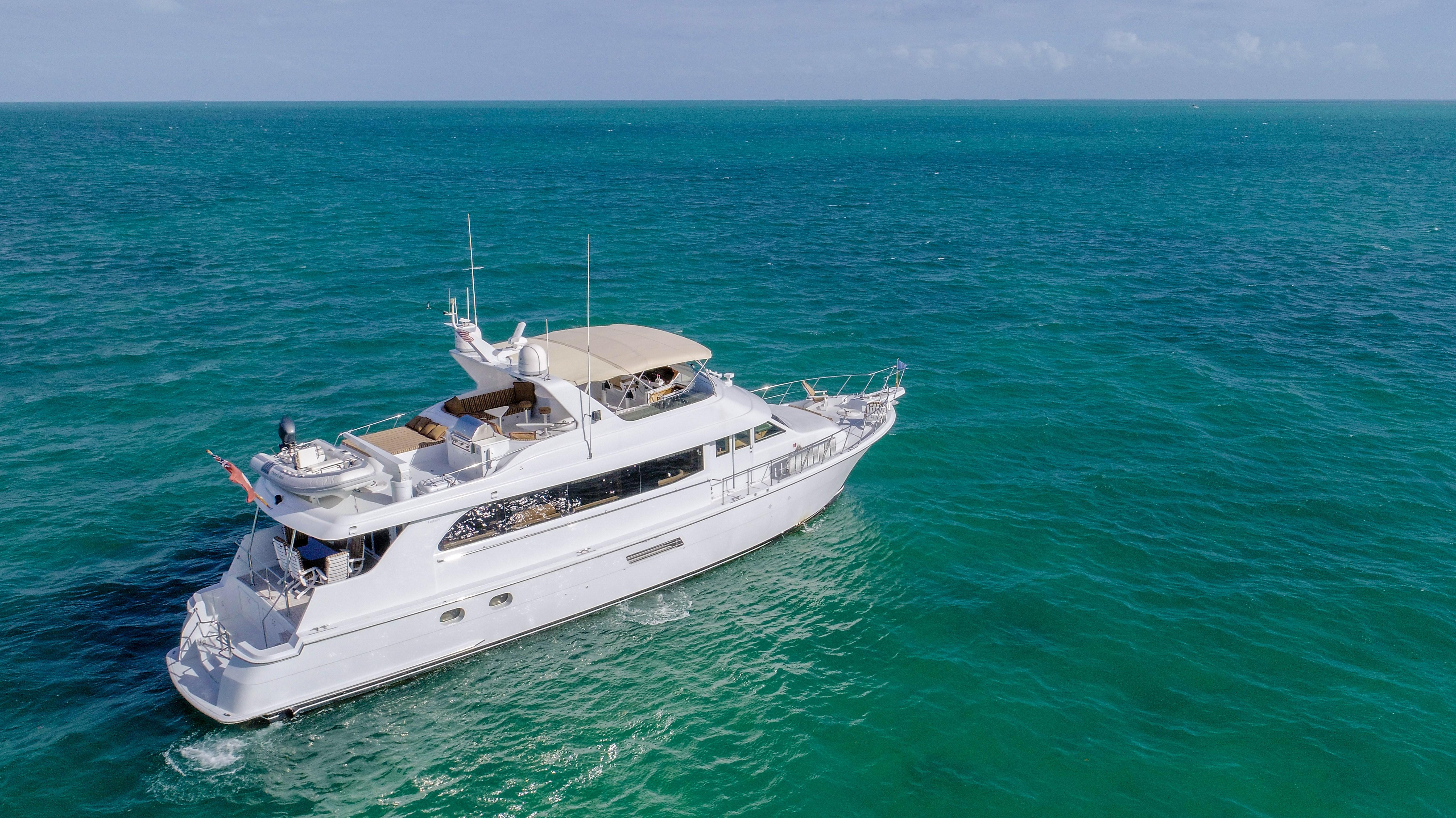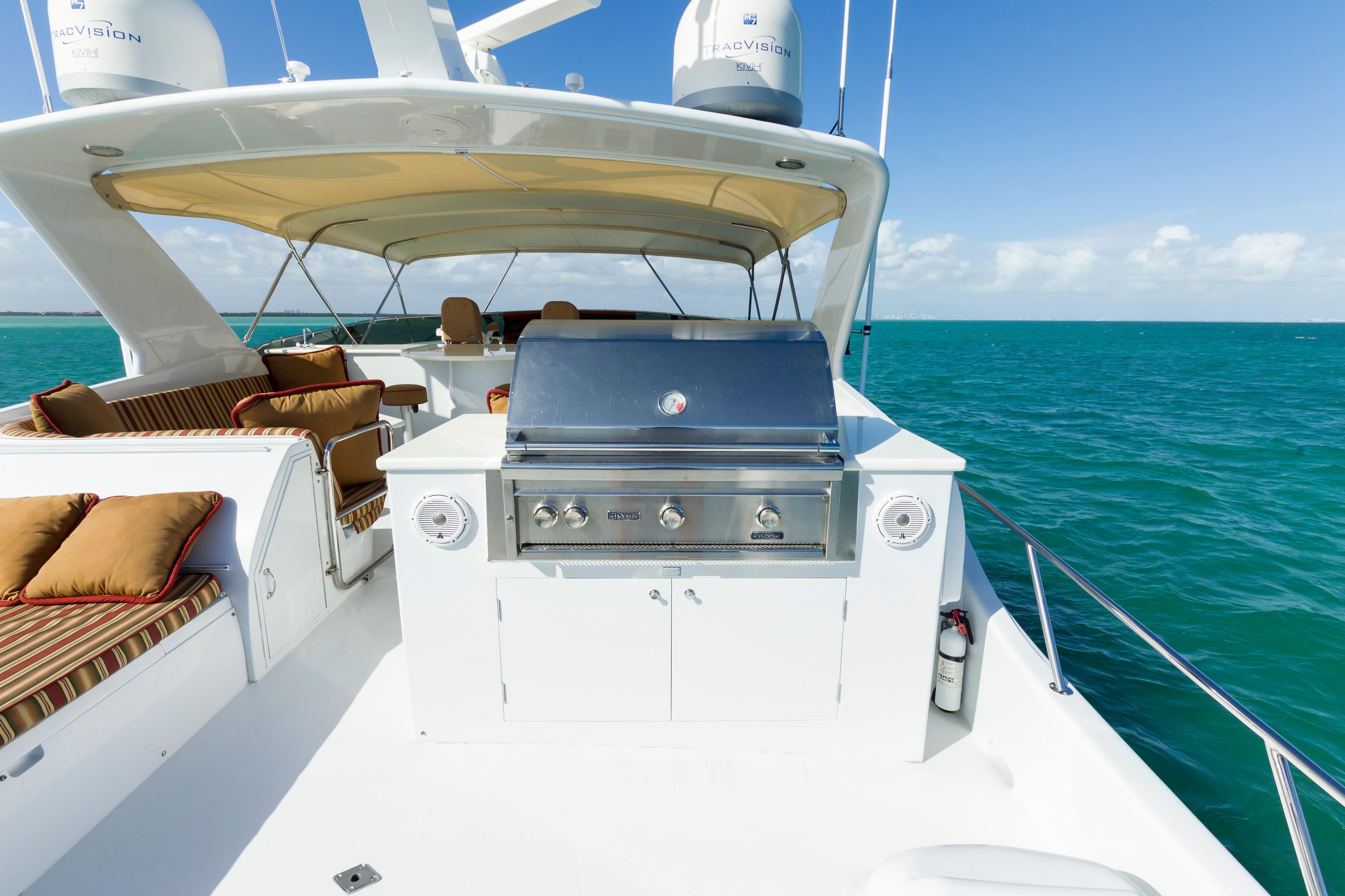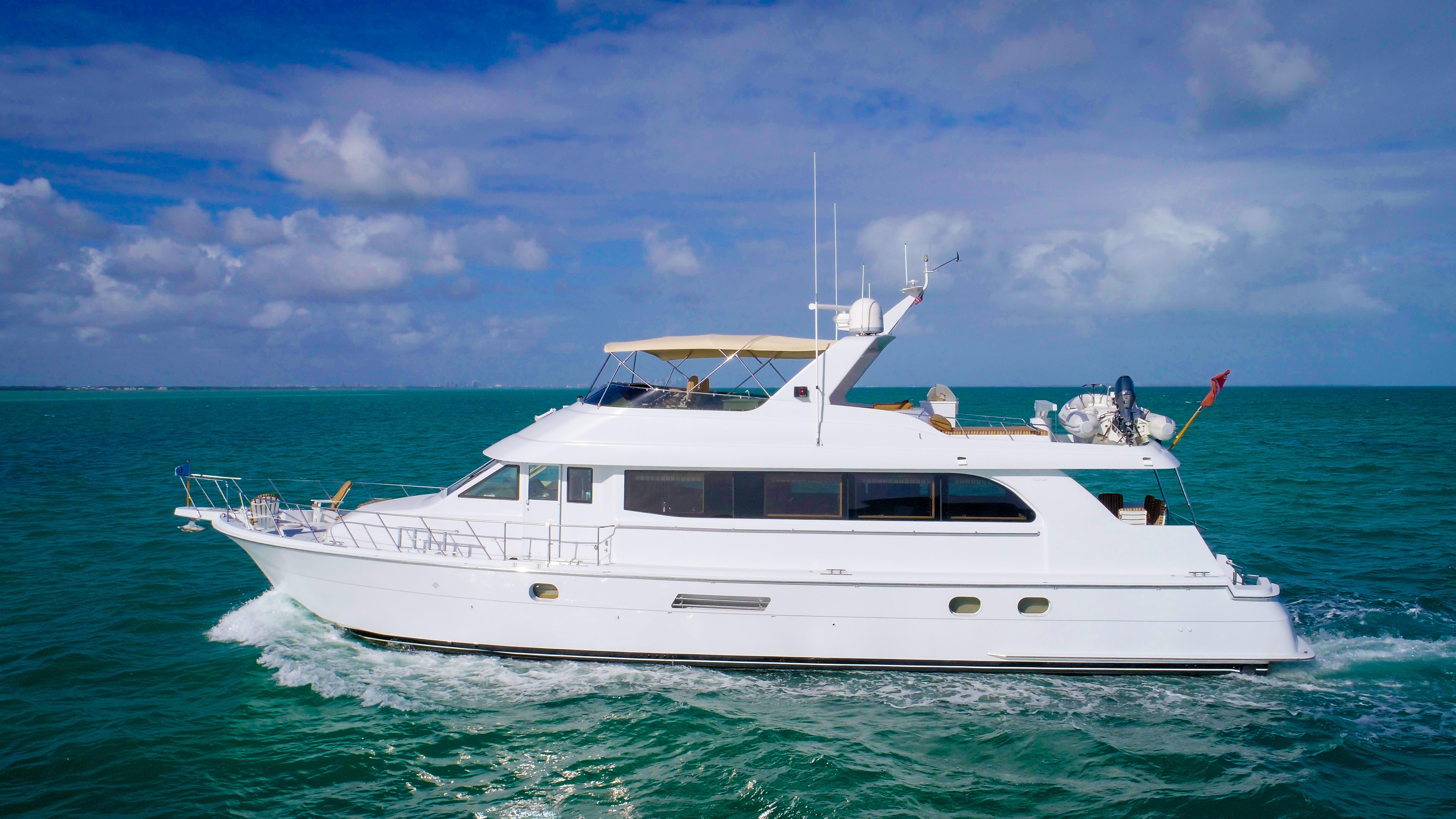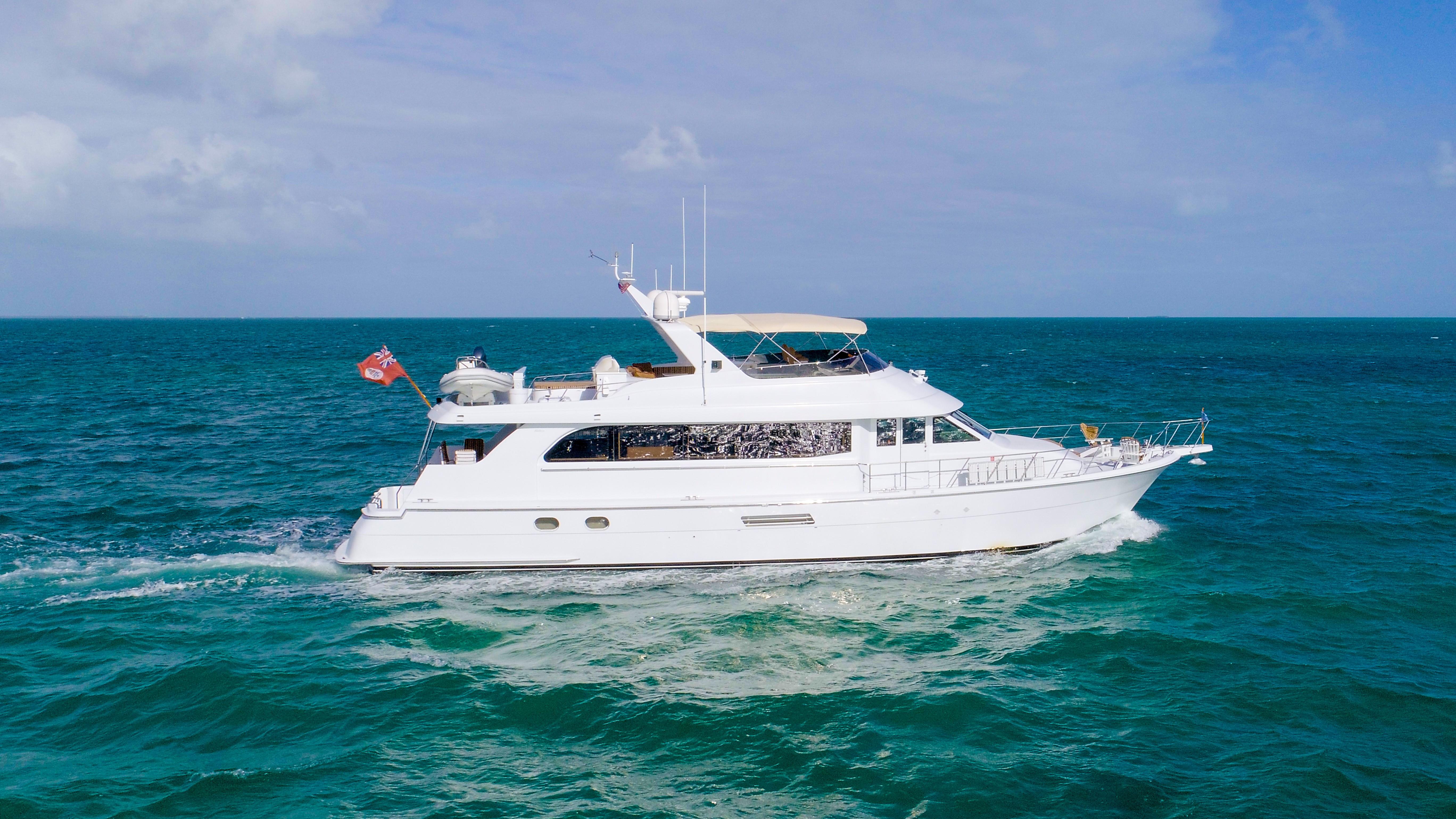 She features a 4 stateroom/4 head layout with a warm cherry wood interior. The master stateroom is aft with his and her heads. She is fully equipped with a Novurania tender with Yamaha 40 HP, spacious flybridge with key bar, custom built-in Lynx stainless steel grill, twin Onan 27.5KW generators, Naiad Multi-Sea 2000 stabilizers & complete electronics package. Powered by Caterpillars 3412E.