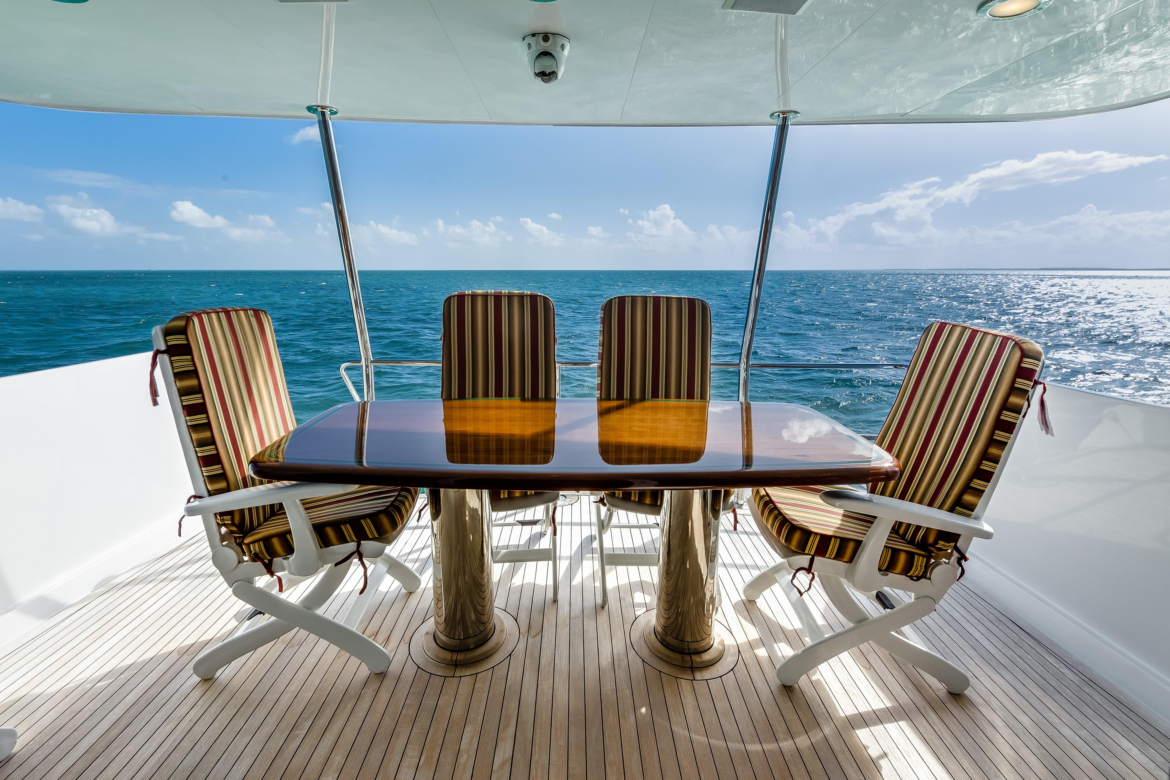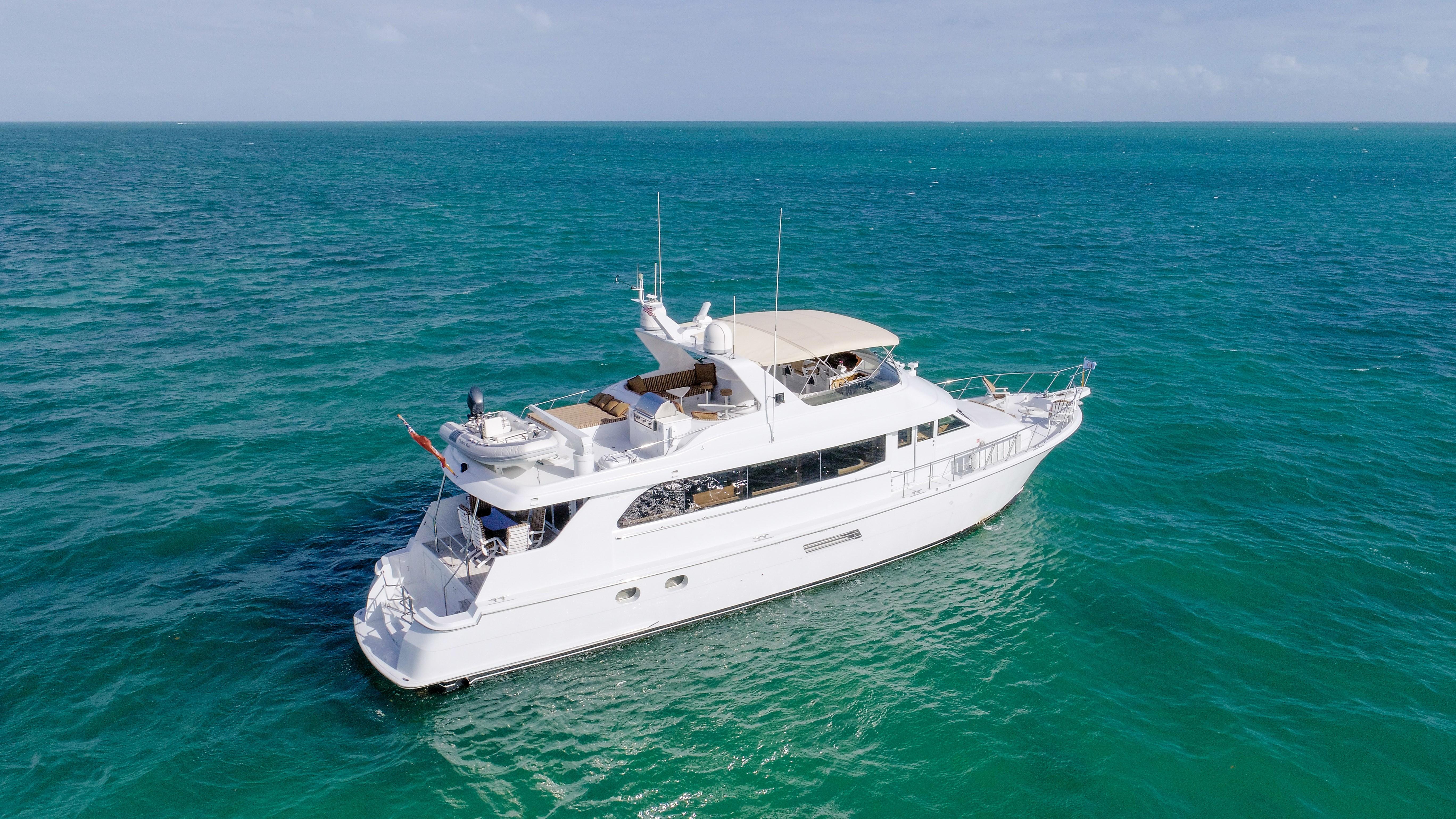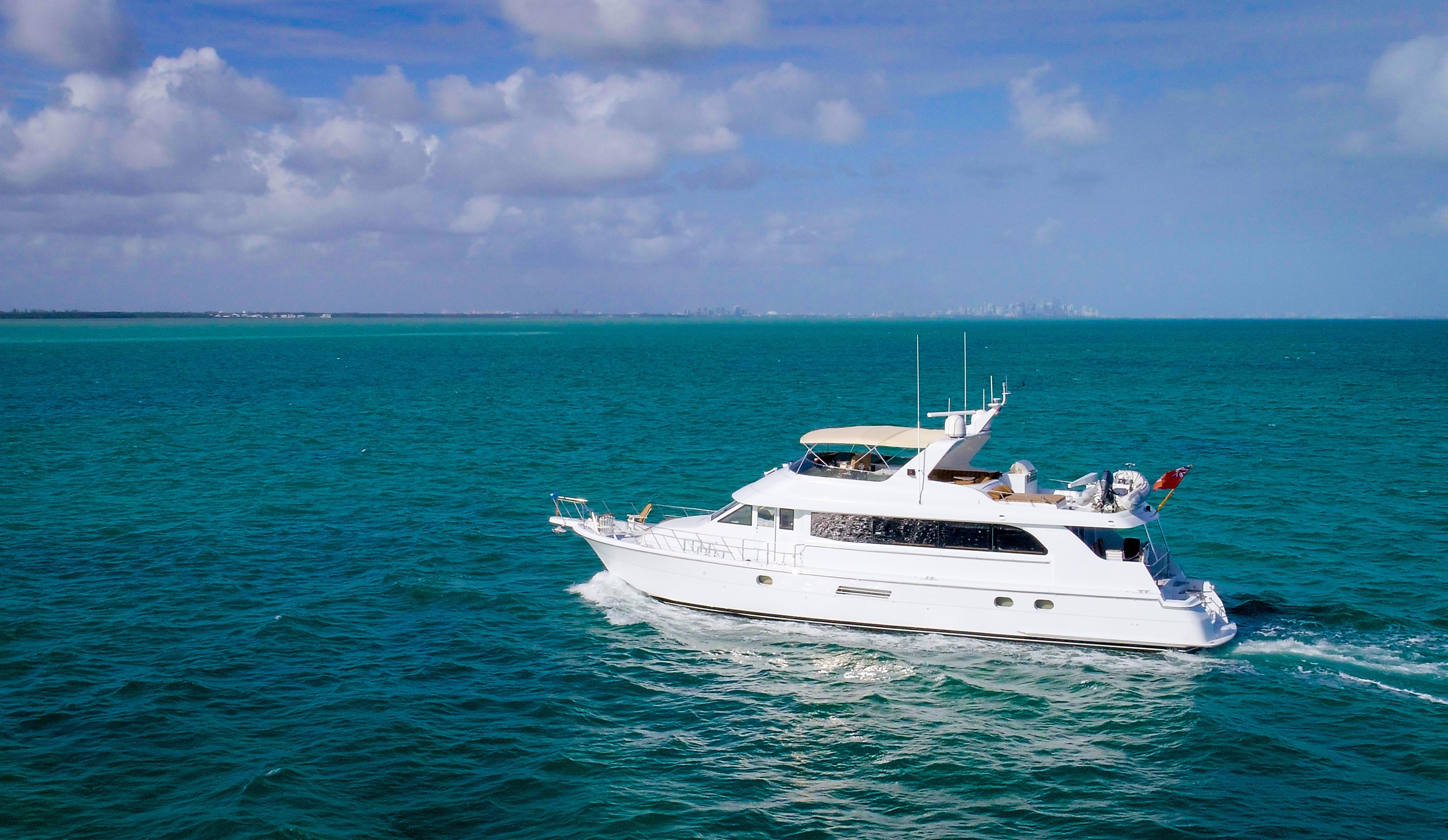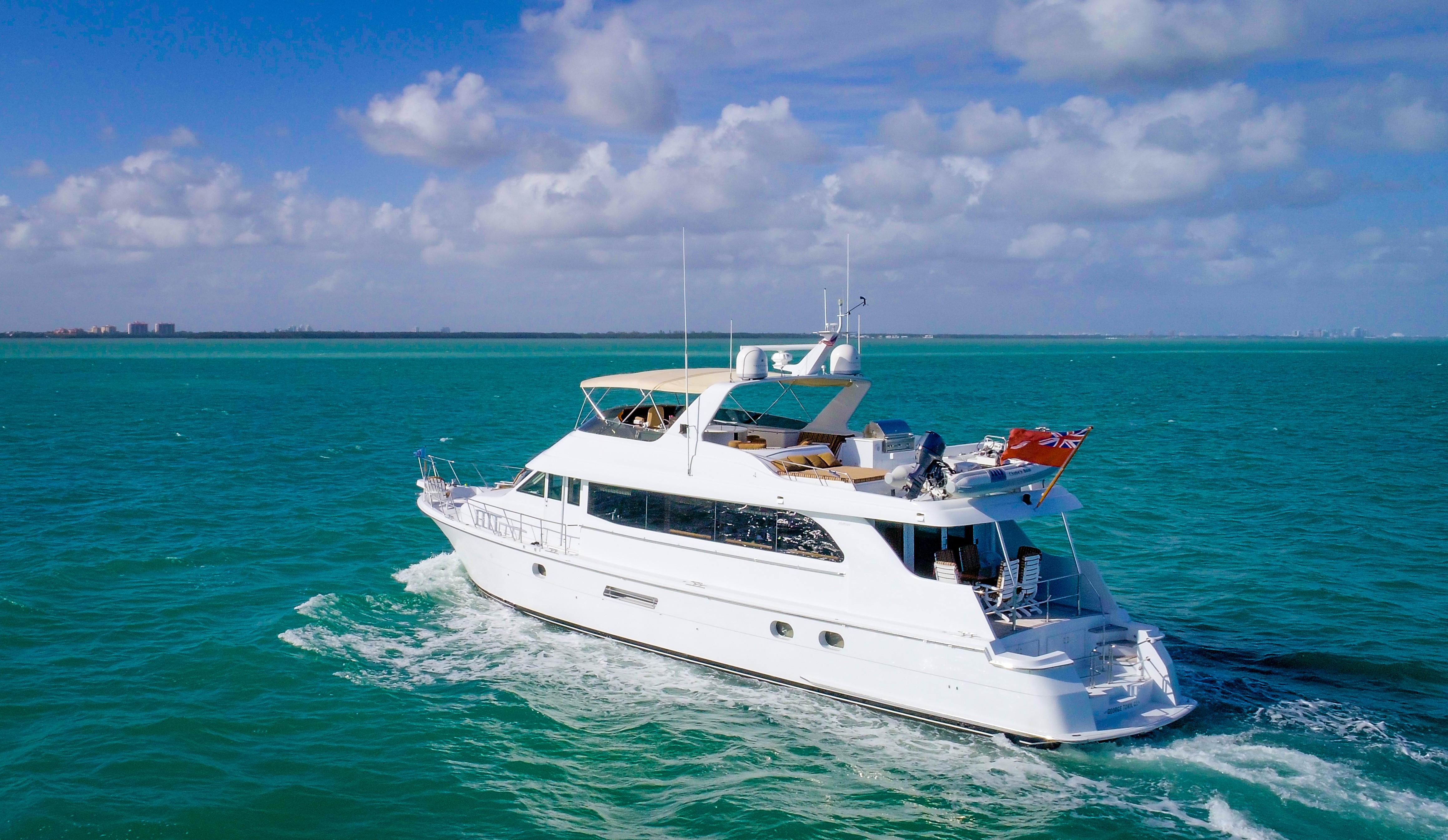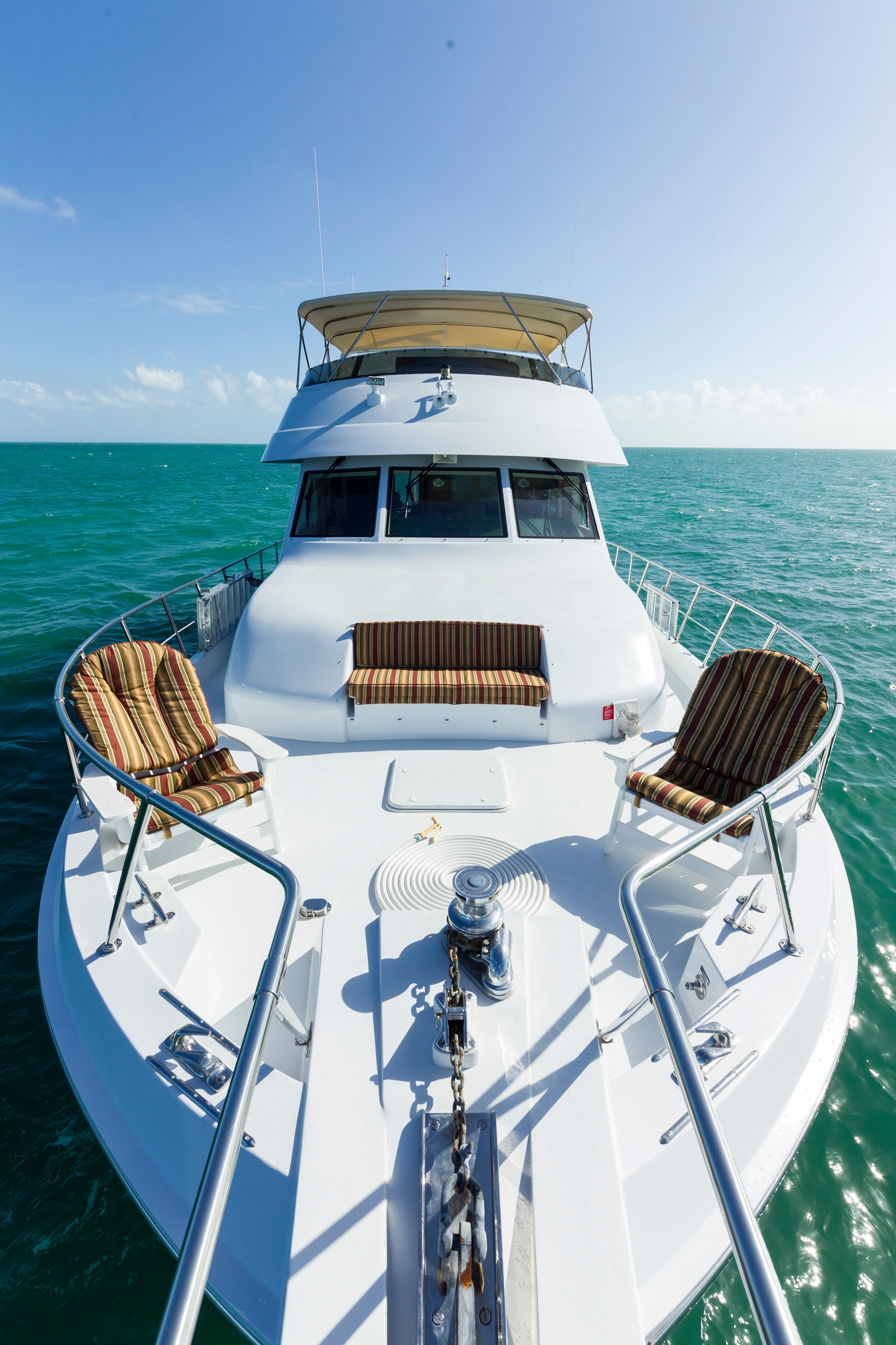 She features a 4 stateroom/4 head layout with a warm cherry wood interior. The master stateroom is aft with his and her heads. She is fully equipped with a Novurania tender with Yamaha 40 HP, spacious flybridge with key bar, custom built-in Lynx stainless steel grill, twin Onan 27.5KW generators, Naiad Multi-Sea 2000 stabilizers & complete electronics package. Powered by Caterpillars 3412E.