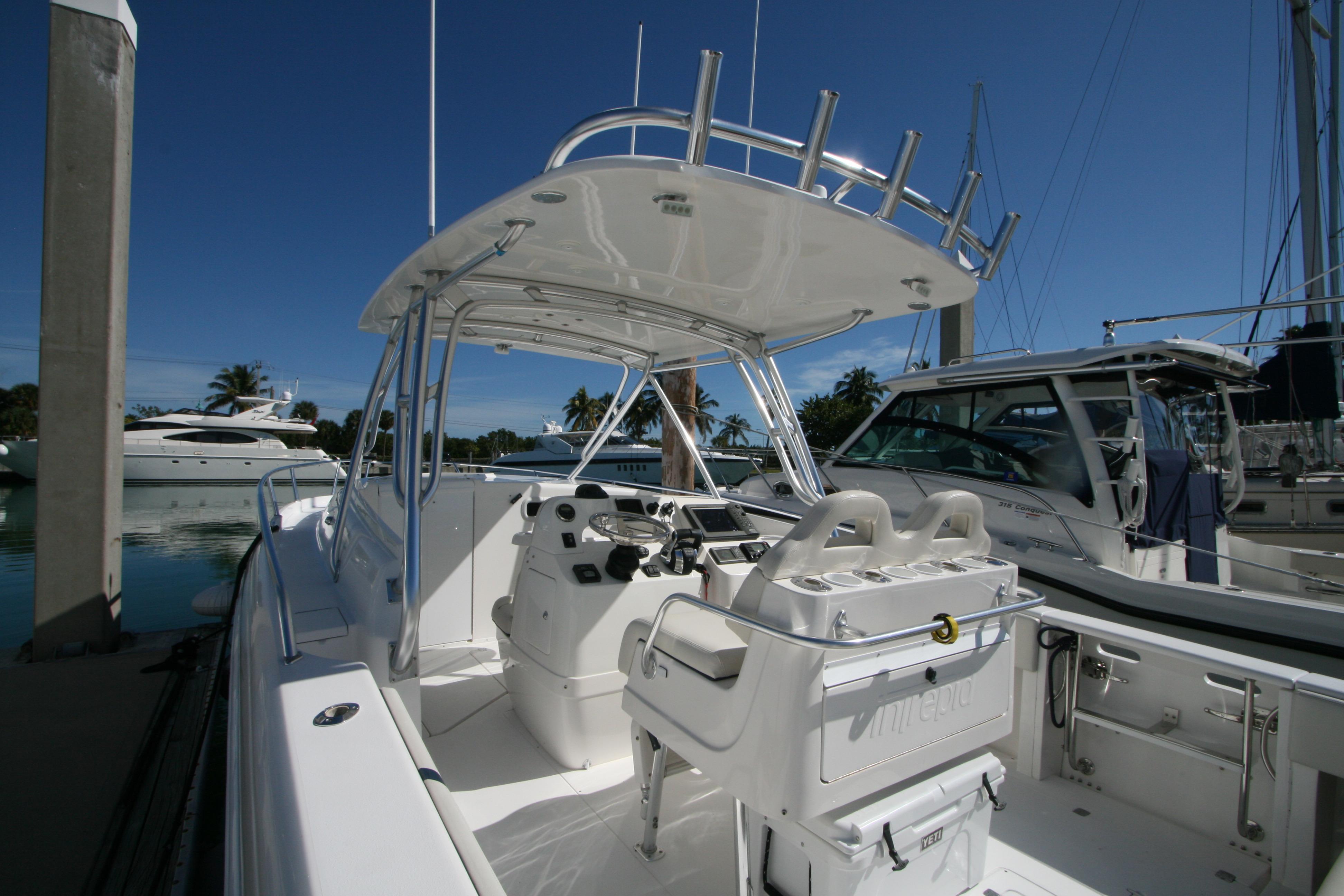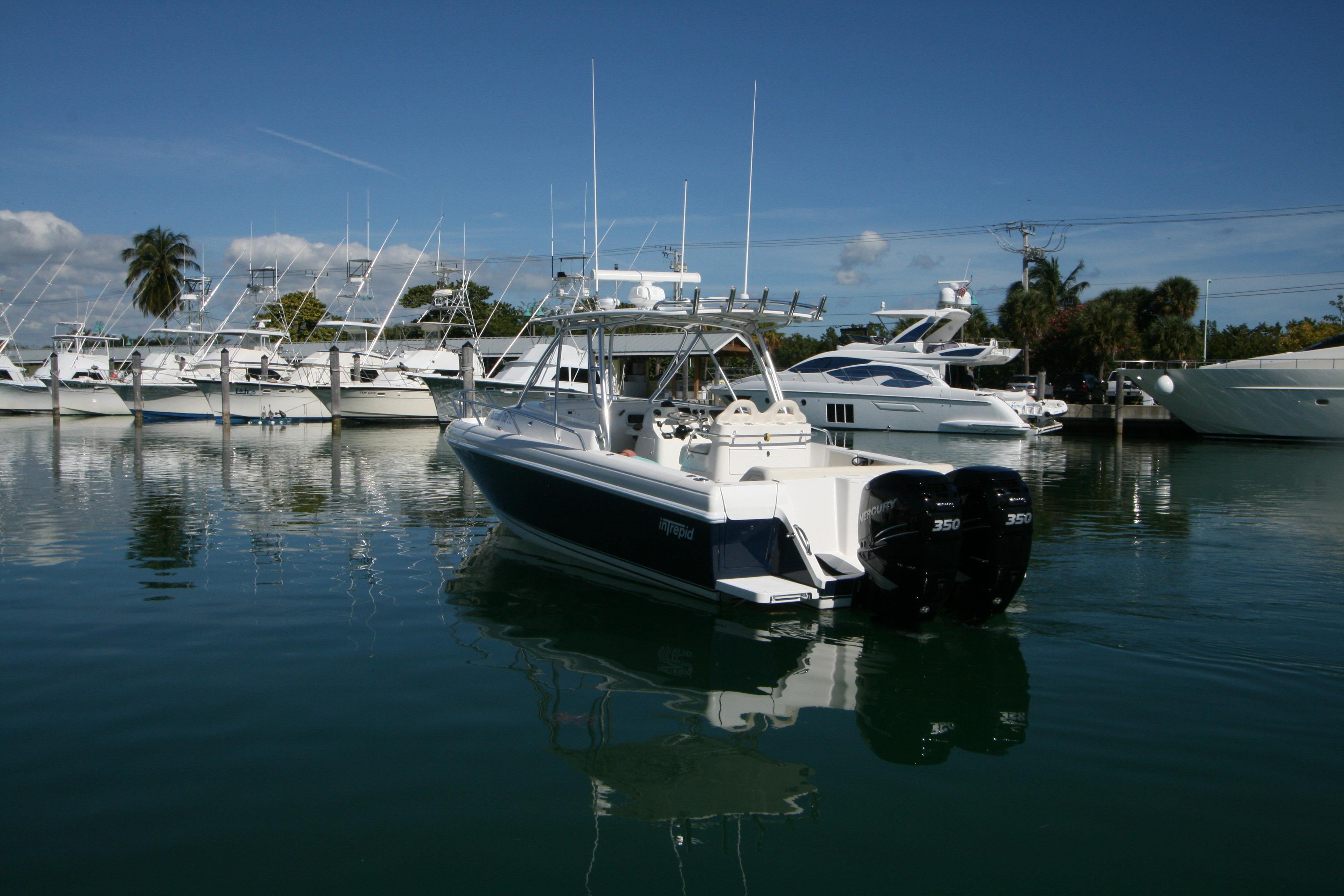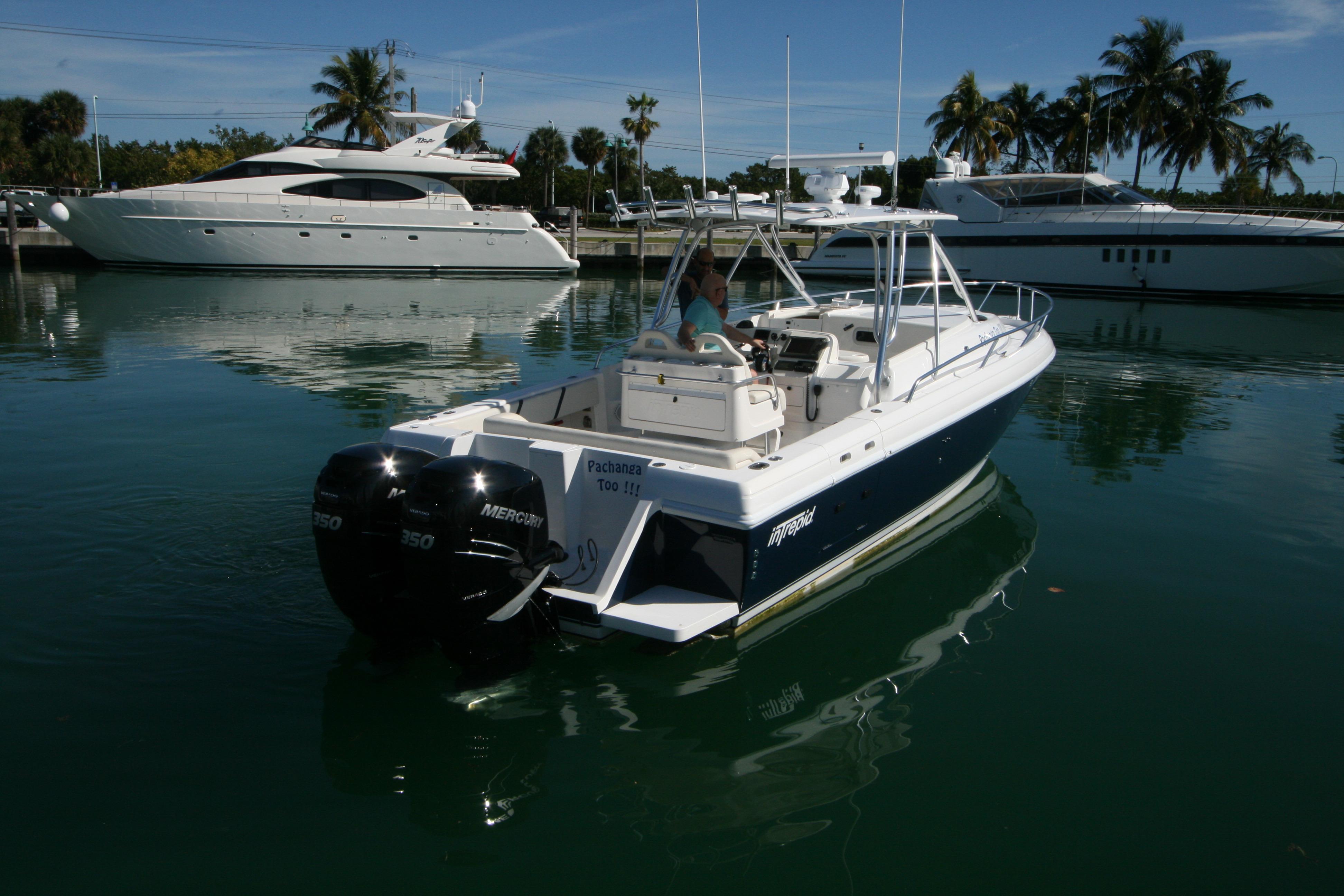 Re-powered in December 2015 with Twin Mercury Verado 4- Stroke 350hp and currently have 110 hours .This Intrepid is generously equipped with air conditioning, electric head, lee rod holders on gunwale, Lewar windlass, generator, bow thruster, fiberglass t-top, radar, autopilot, GPS, sounder, VHF radio, underwater lights and much more!!!