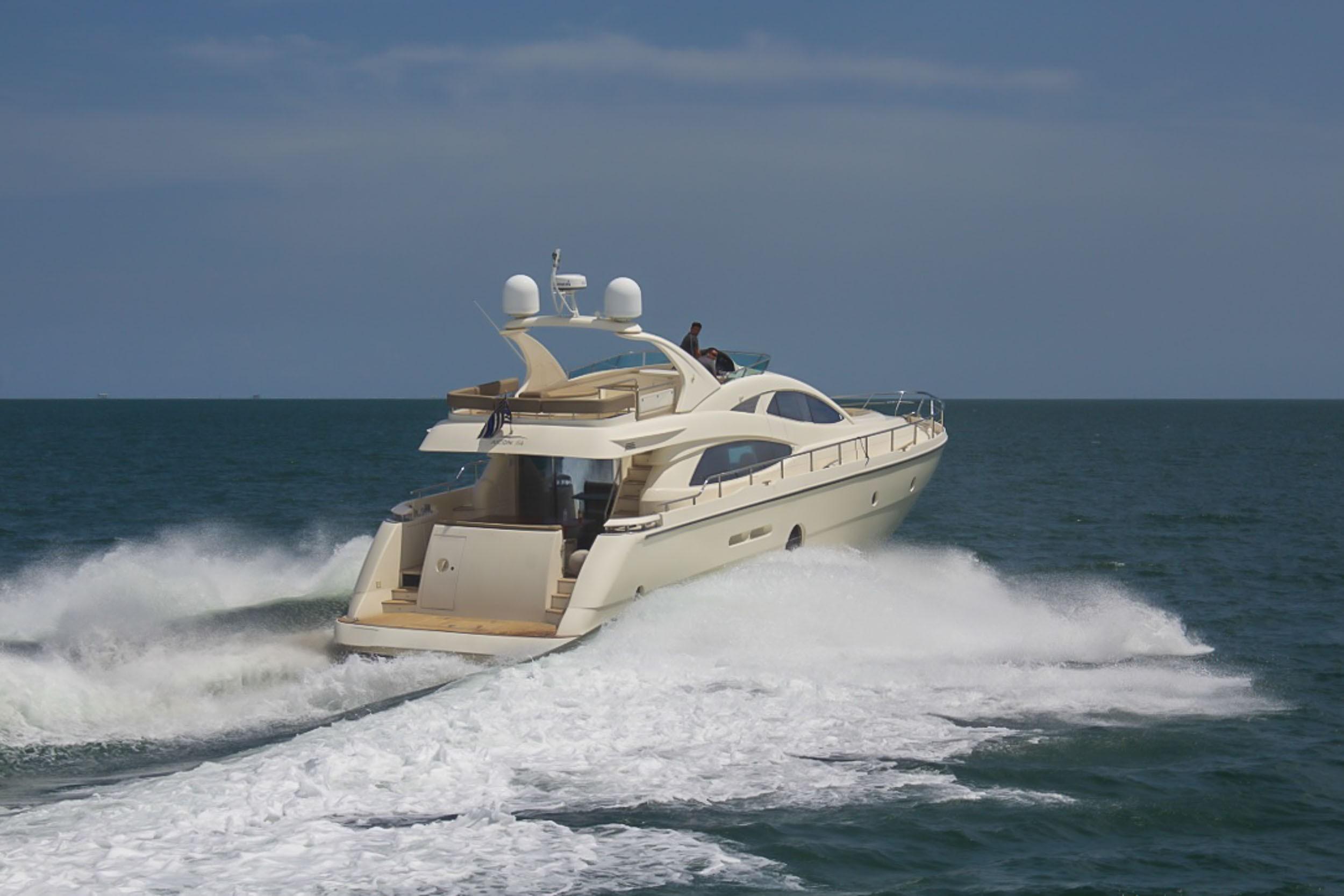 The Aicon 64’ is the definition of a Euro-Style Yacht. Curved and swift exterior lines give this vessel a unique style. Huge flybridge and cockpit provide plenty of entertaining space. The interior is very well thought out; although, the exterior has a curvy feel one would imagine the interior would match, but this is not the case. The designers using linear versus rounded contours were able to provide more interior space.