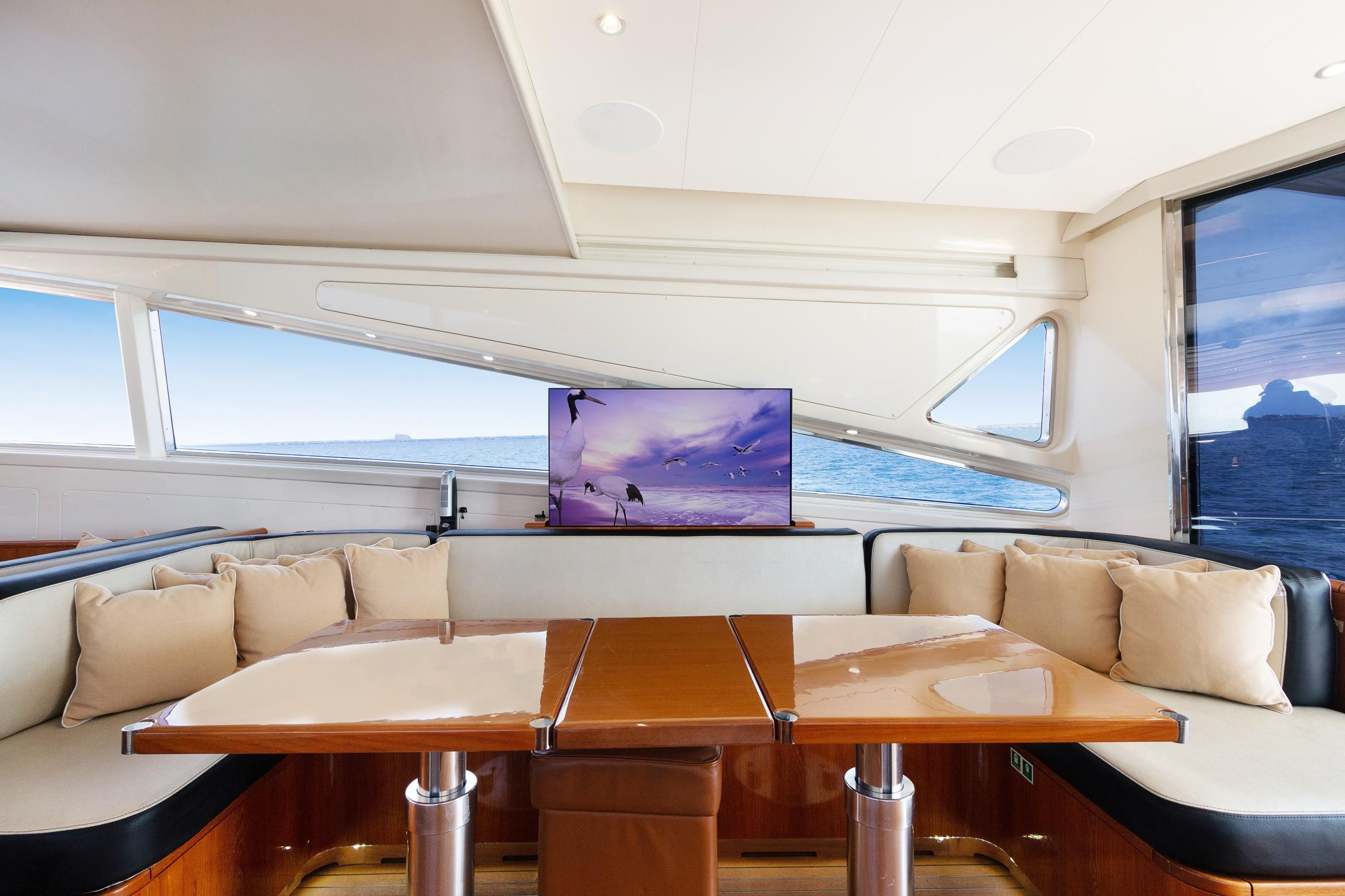 MASTER’S SITTING ROOM: Located forward of the Master Suite. Featured a sofa, two (2) leather armchairs, an LCD TV, an electric TV lift, a Blu-Ray disc player, an AV receiver, and plentiful storage for glassware and cutlery.