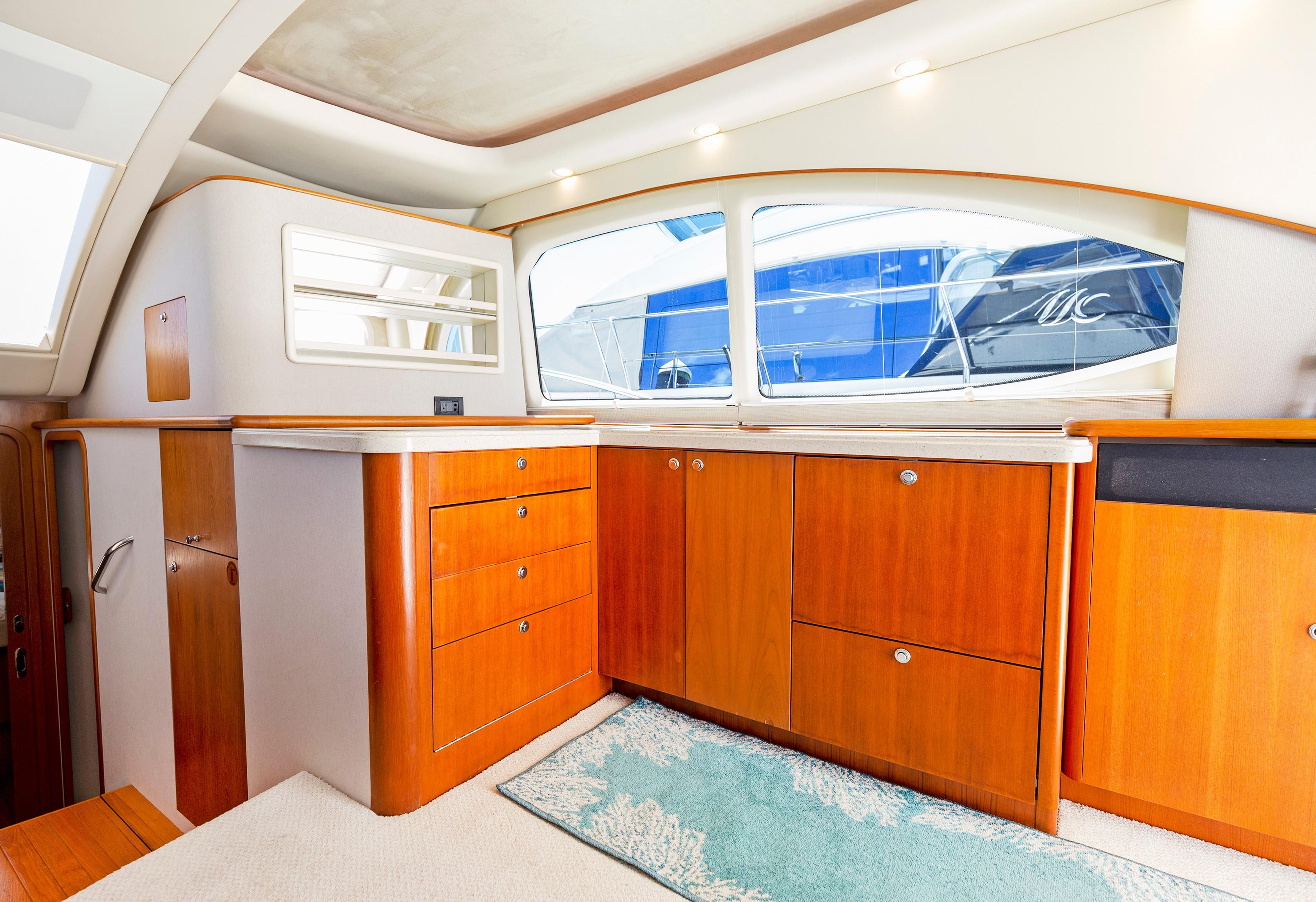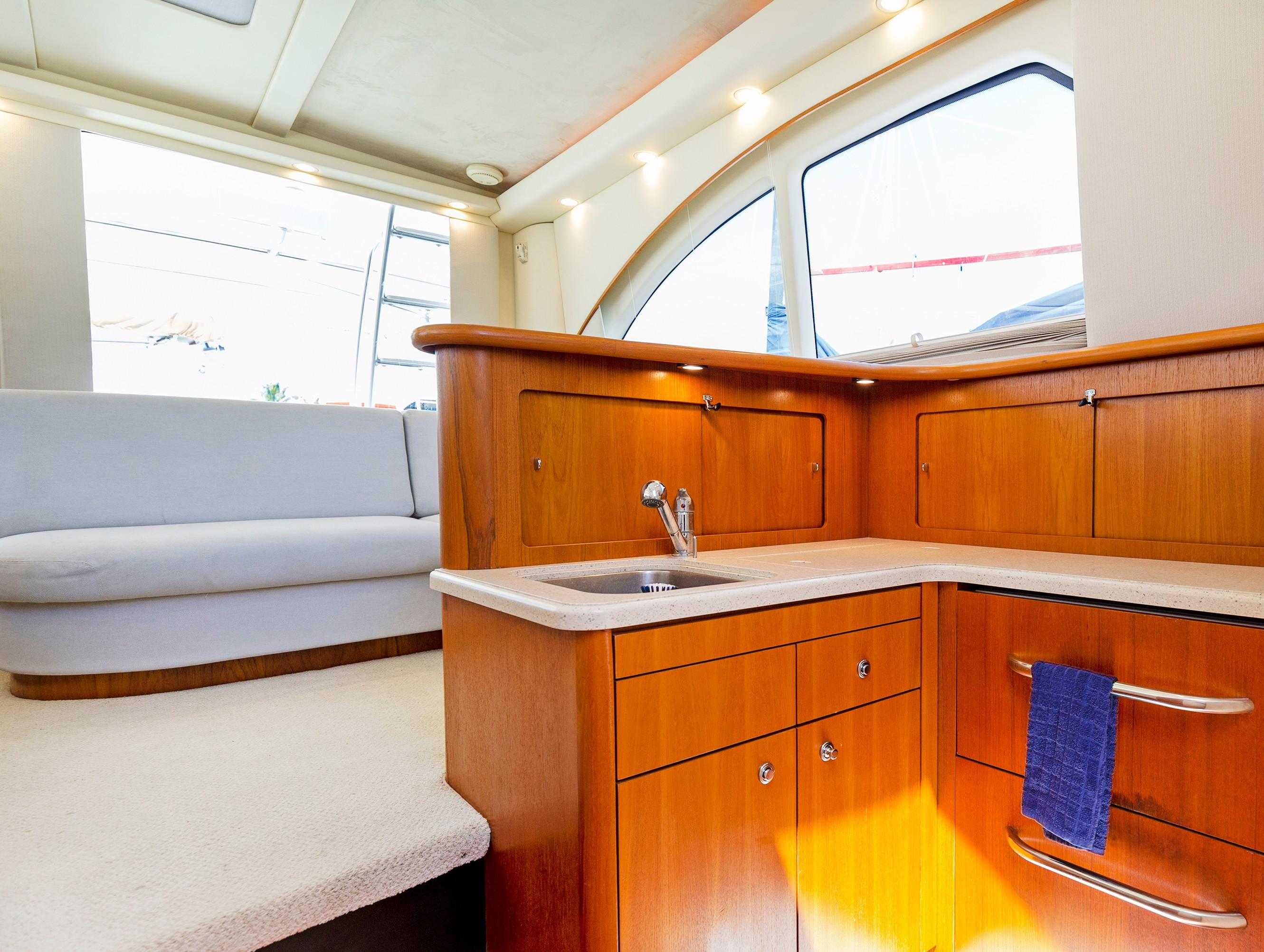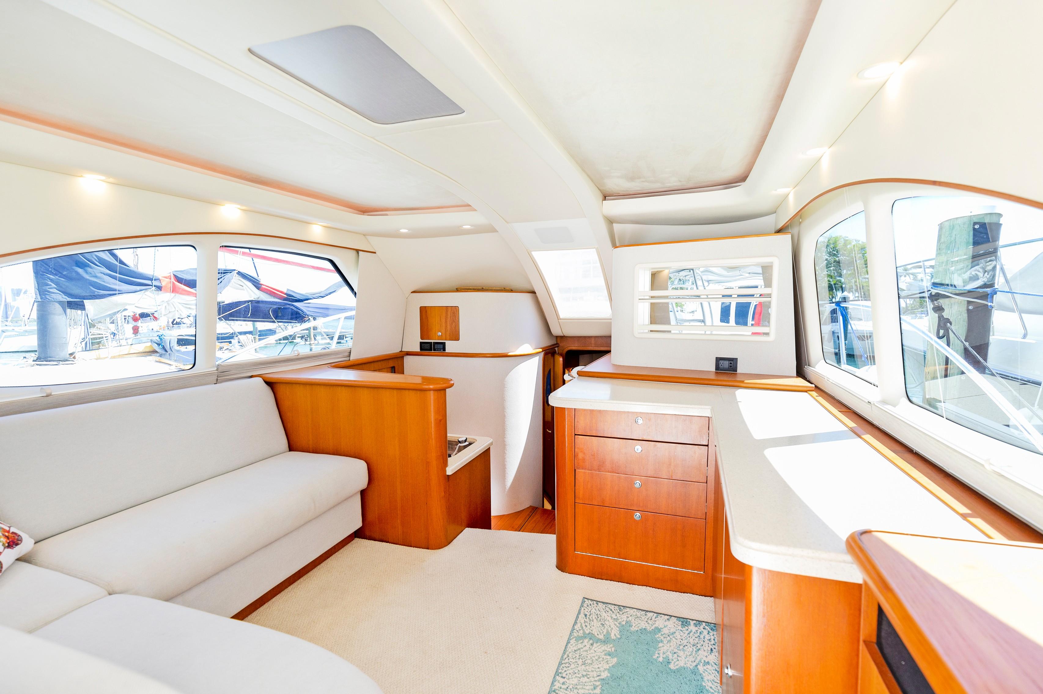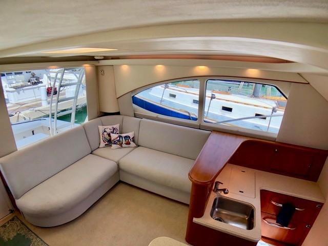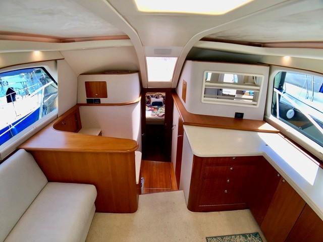 The Salon seats guests on the port-side pull-out sleeper sofa and features custom storage cabinets (great for tools, gear and barware) to starboard in place of a table/settee. The upgraded interior features Corian countertops and Sun Fabric on the sofa and walls, coupled with the custom carpet, they add a clean and bright look to the interior. The forward windshield window adds light to this already spacious living area.
