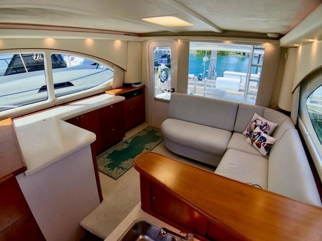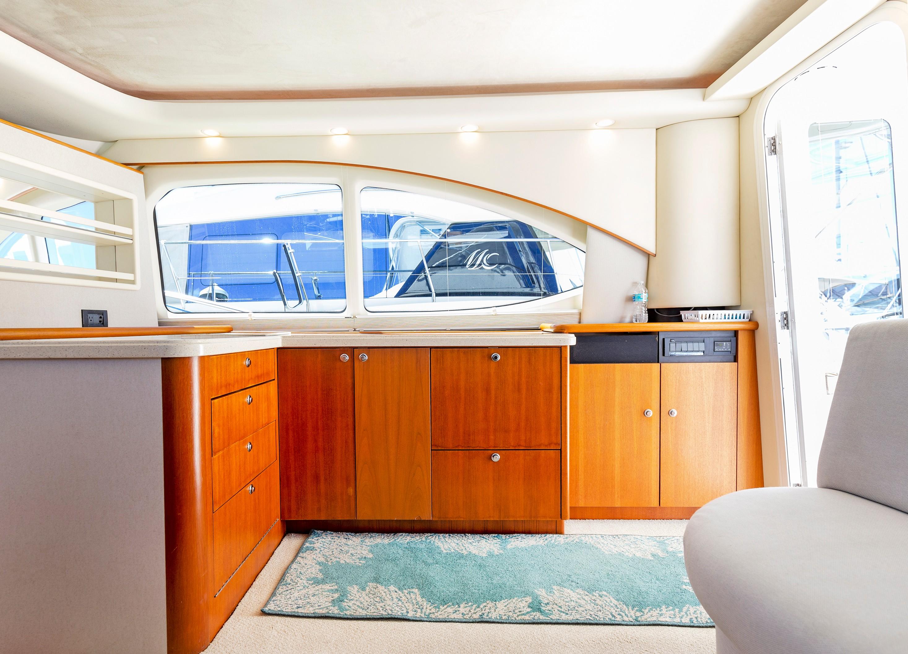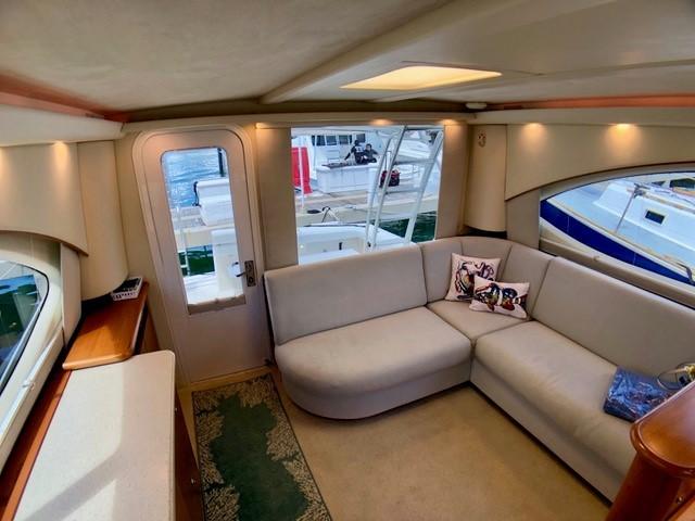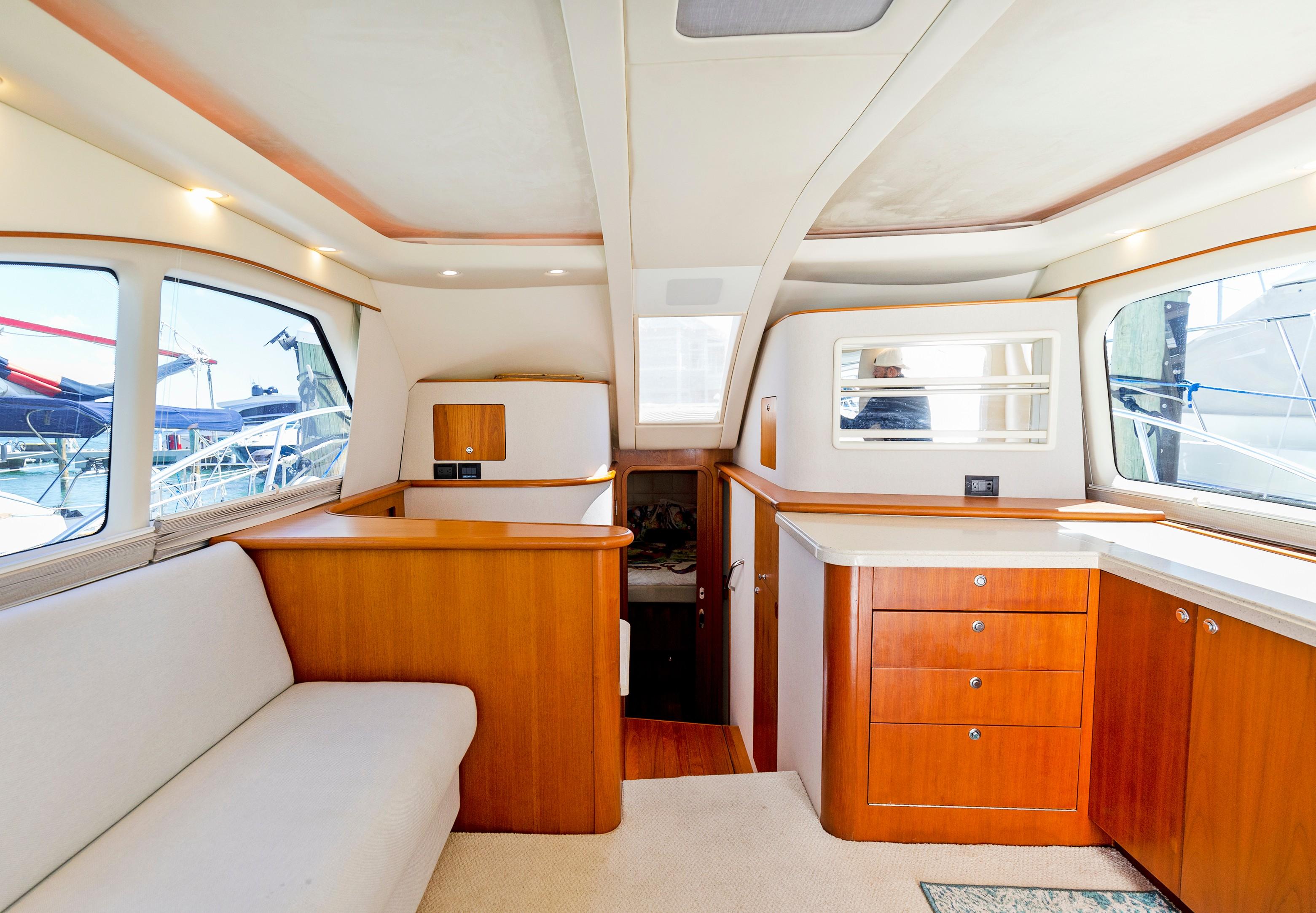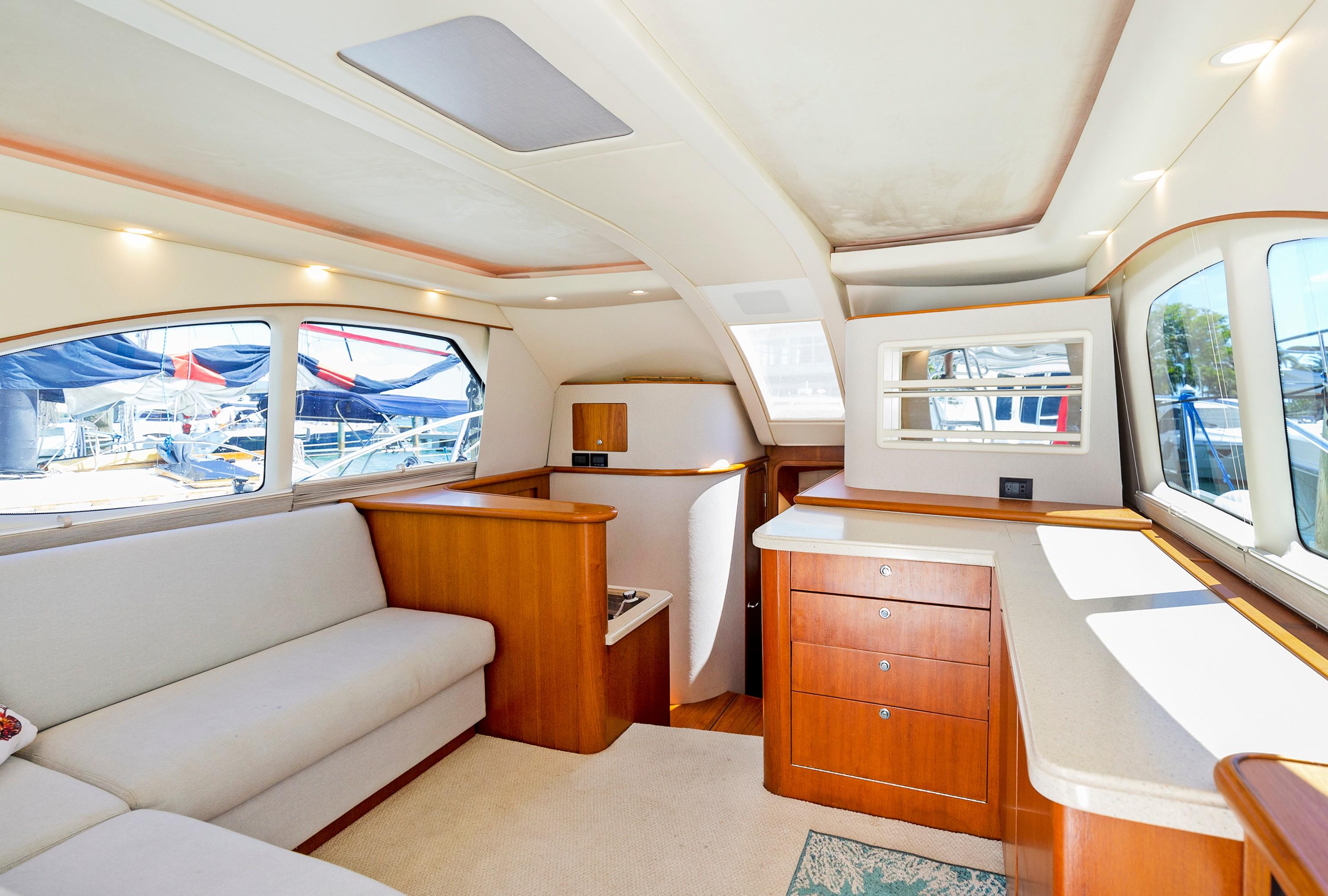 The Salon seats guests on the port-side pull-out sleeper sofa and features custom storage cabinets (great for tools, gear and barware) to starboard in place of a table/settee. The upgraded interior features Corian countertops and Sun Fabric on the sofa and walls, coupled with the custom carpet, they add a clean and bright look to the interior. The forward windshield window adds light to this already spacious living area.