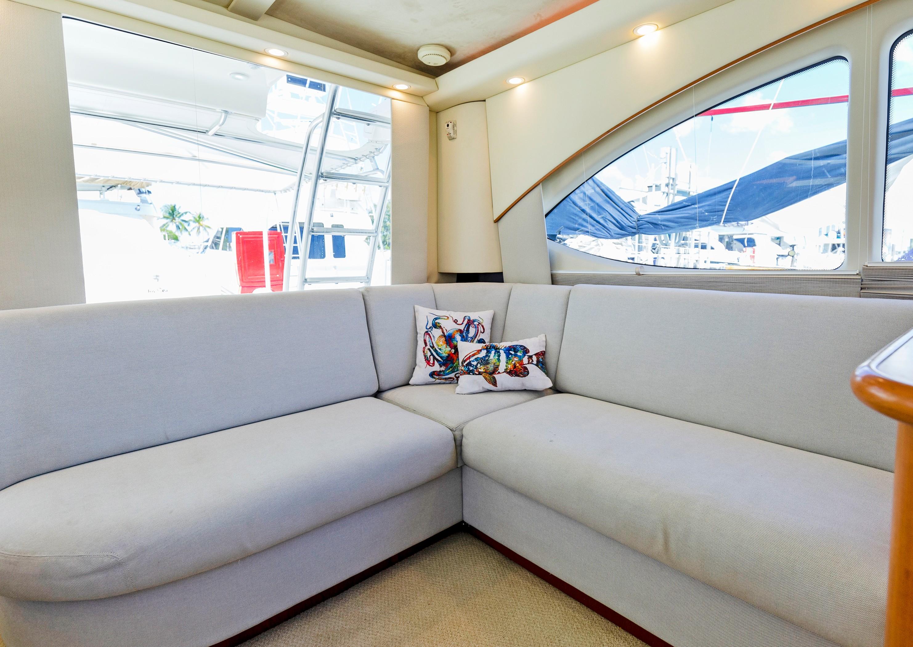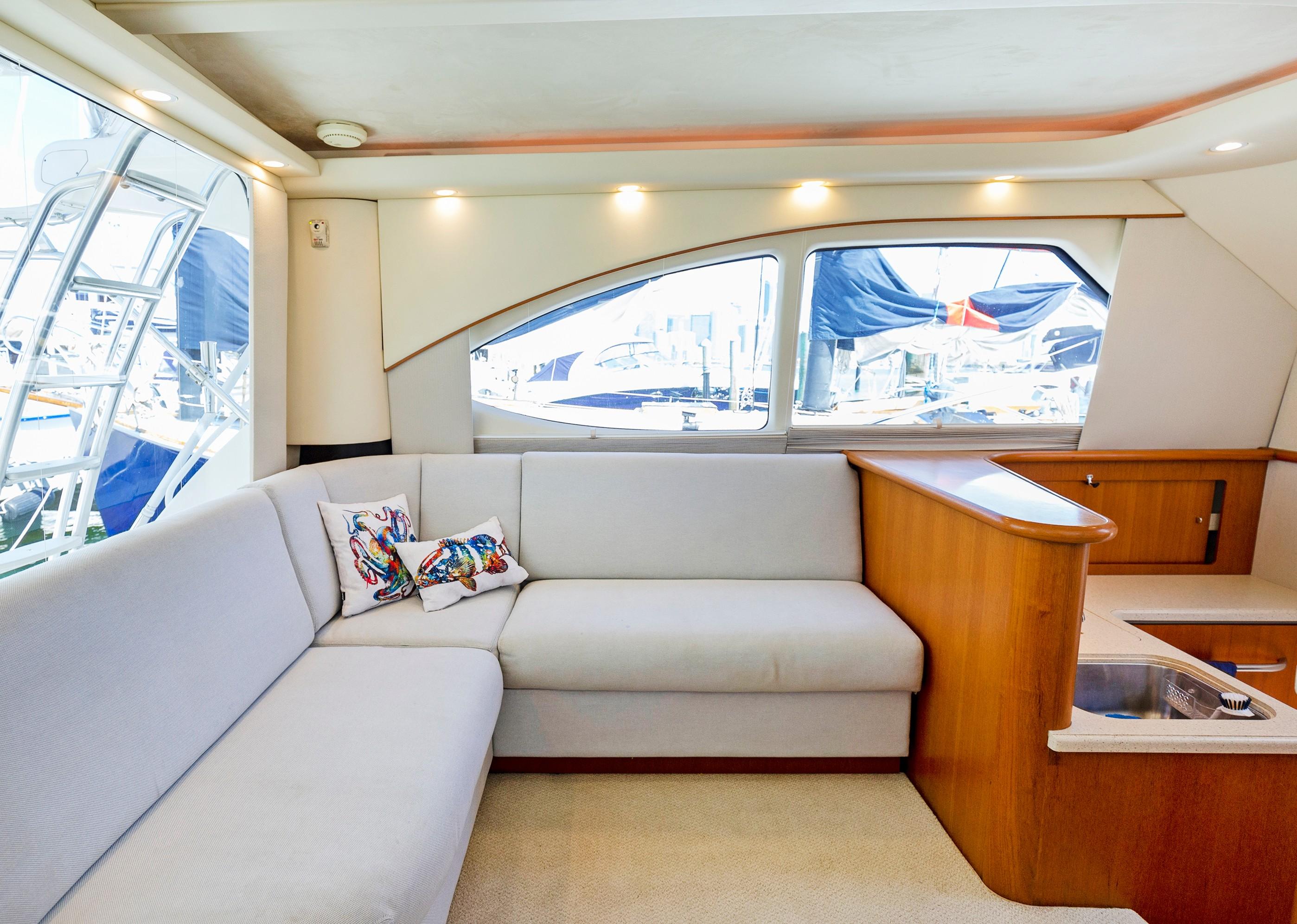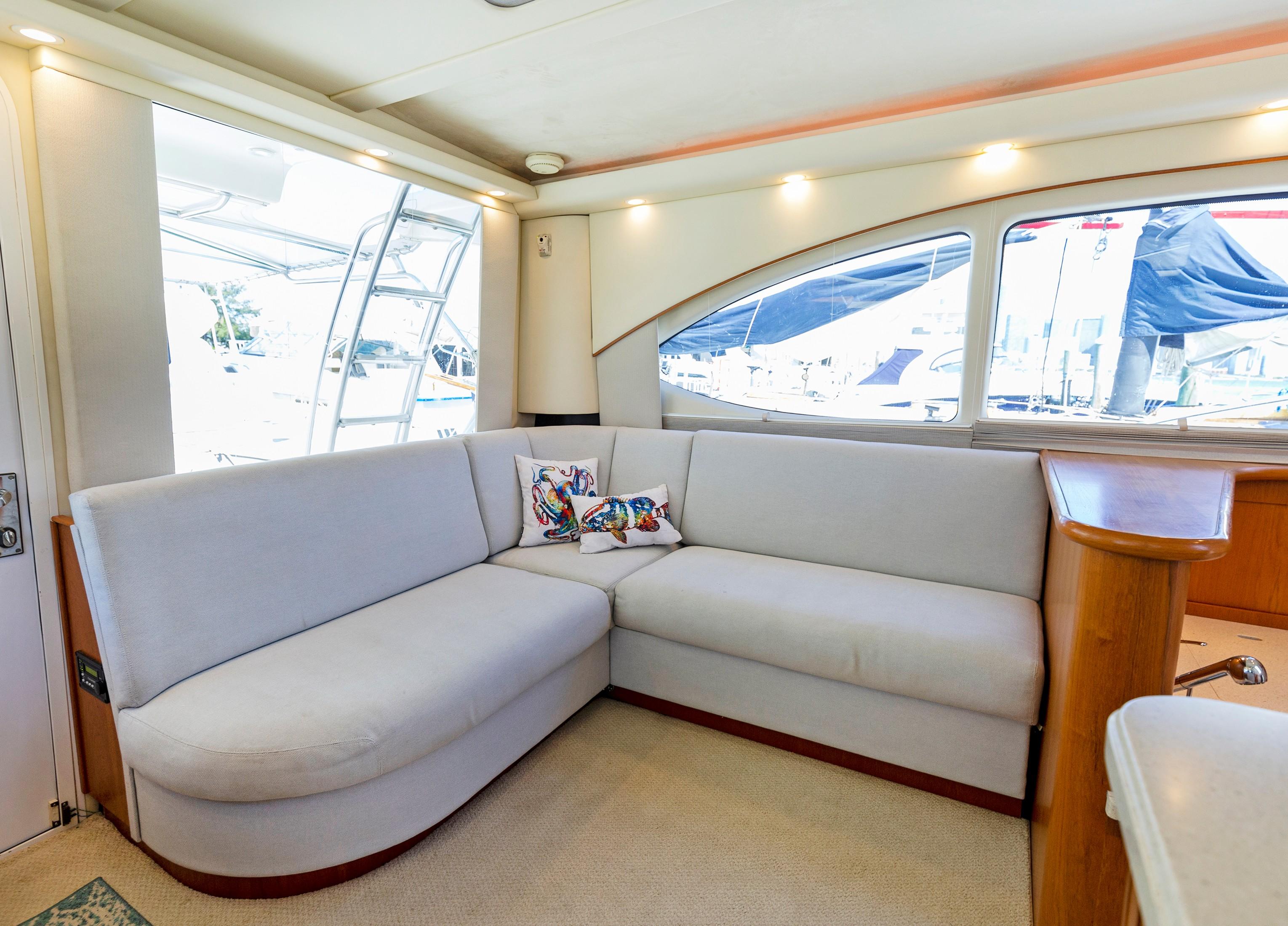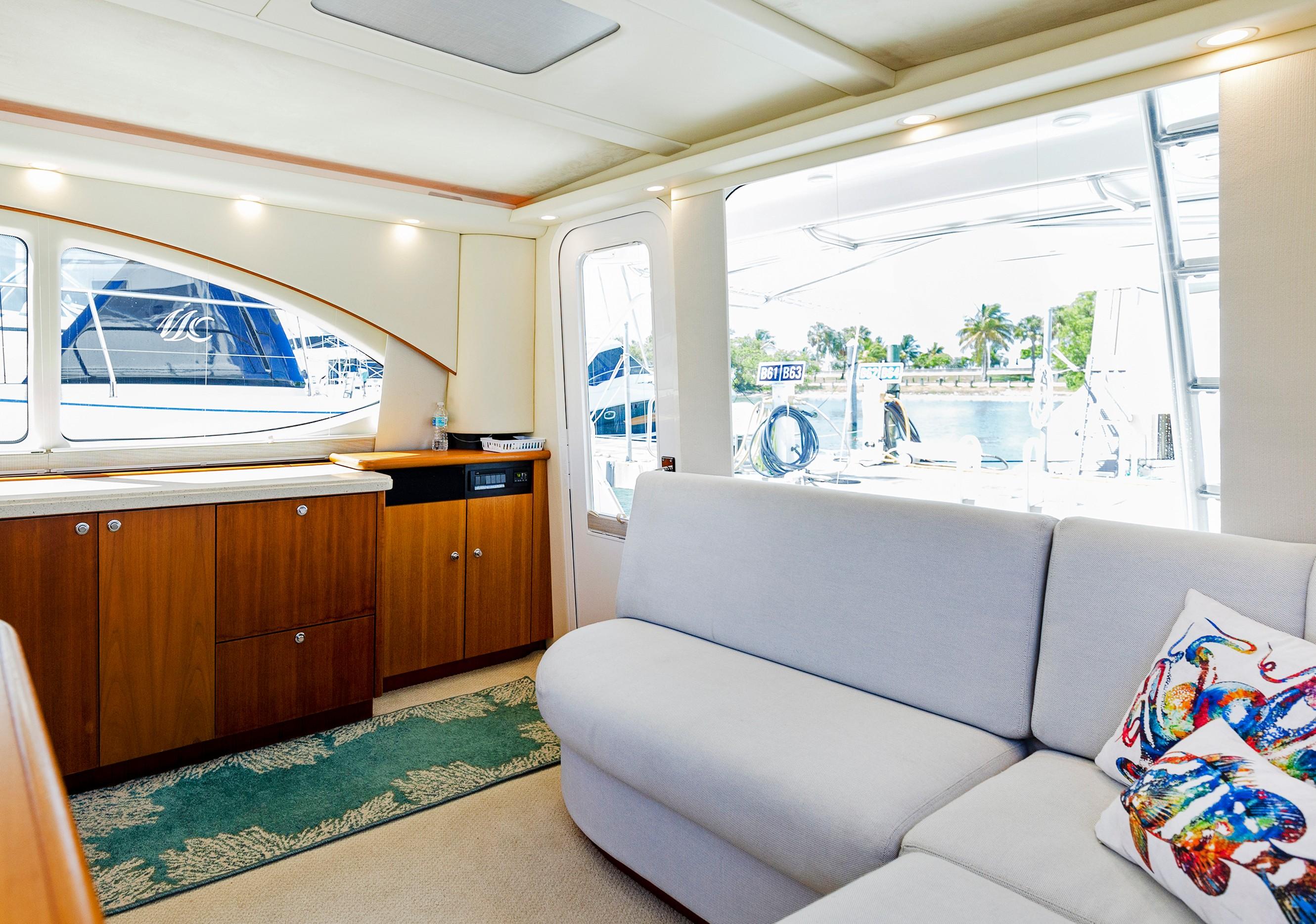 The Salon seats guests on the port-side pull-out sleeper sofa and features custom storage cabinets (great for tools, gear and barware) to starboard in place of a table/settee. The upgraded interior features Corian countertops and Sun Fabric on the sofa and walls, coupled with the custom carpet, they add a clean and bright look to the interior. The forward windshield window adds light to this already spacious living area.