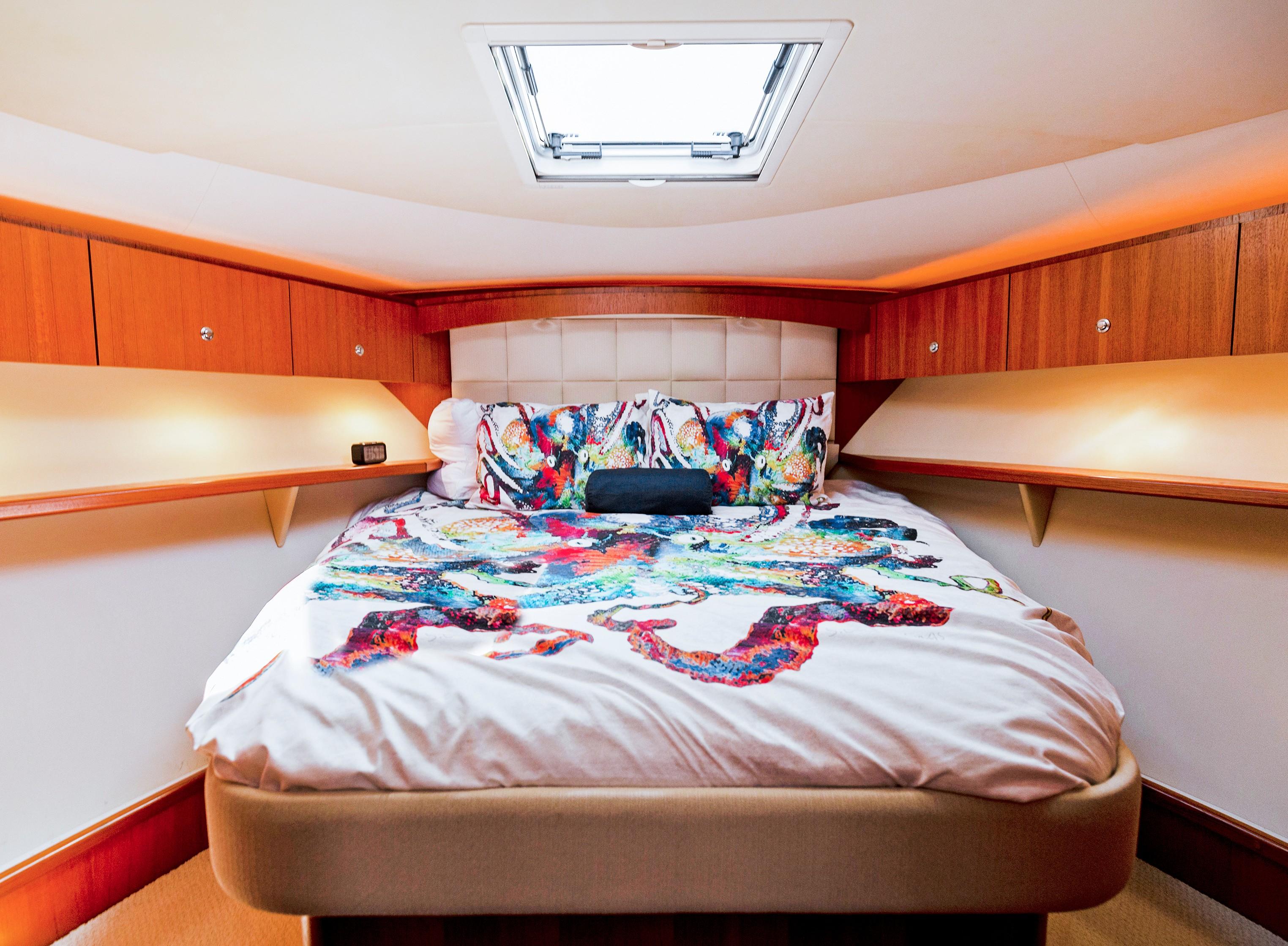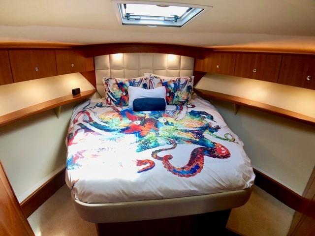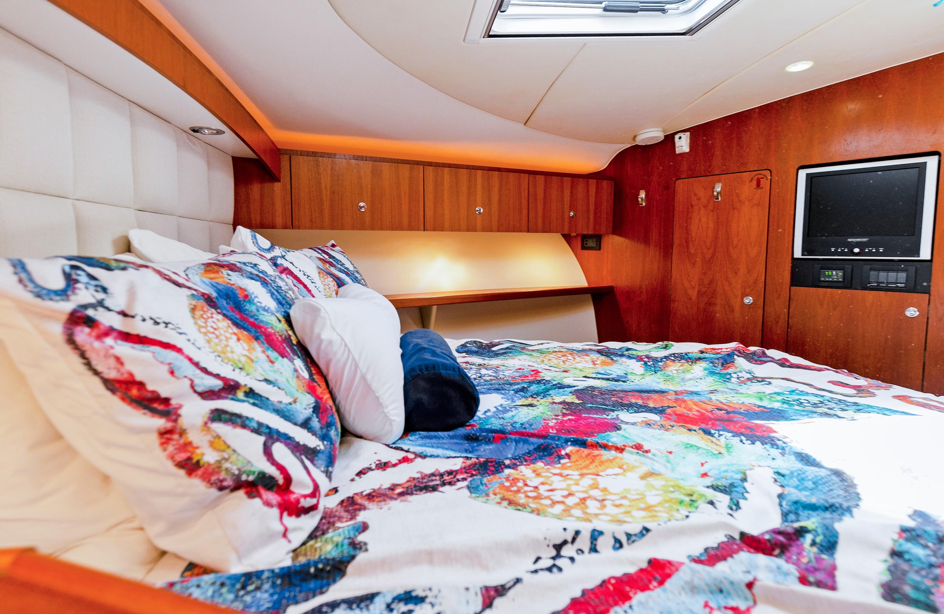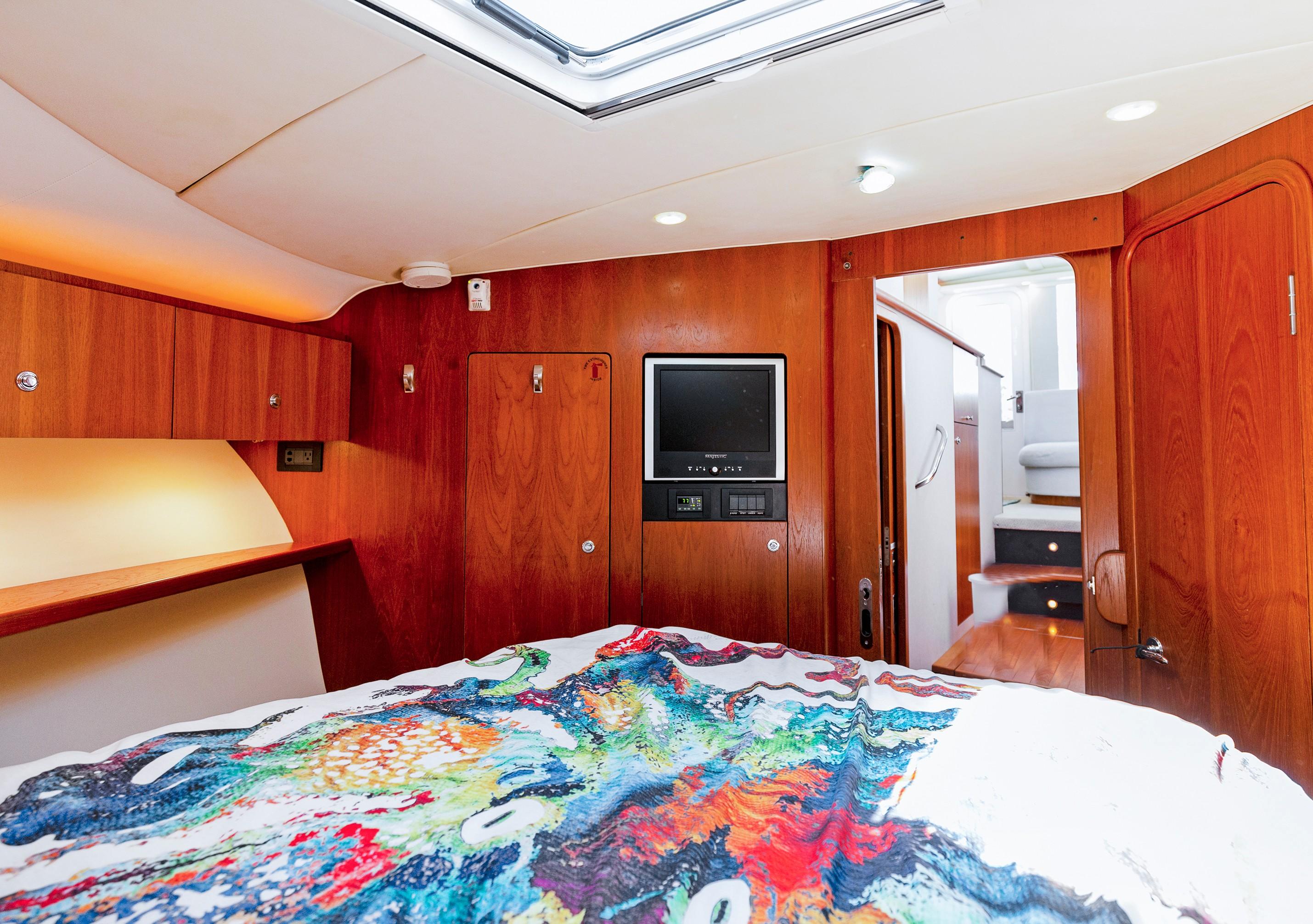 The Master Stateroom boasts a queen bed with tons of storage (underneath, closet and hanging lockers) and direct access to the head with full-stall shower and Vacuflush toilet. A Private guest stateroom features two custom bunks with extra storage and a closet. Sleep two more guests on the pull-out couch in the salon.