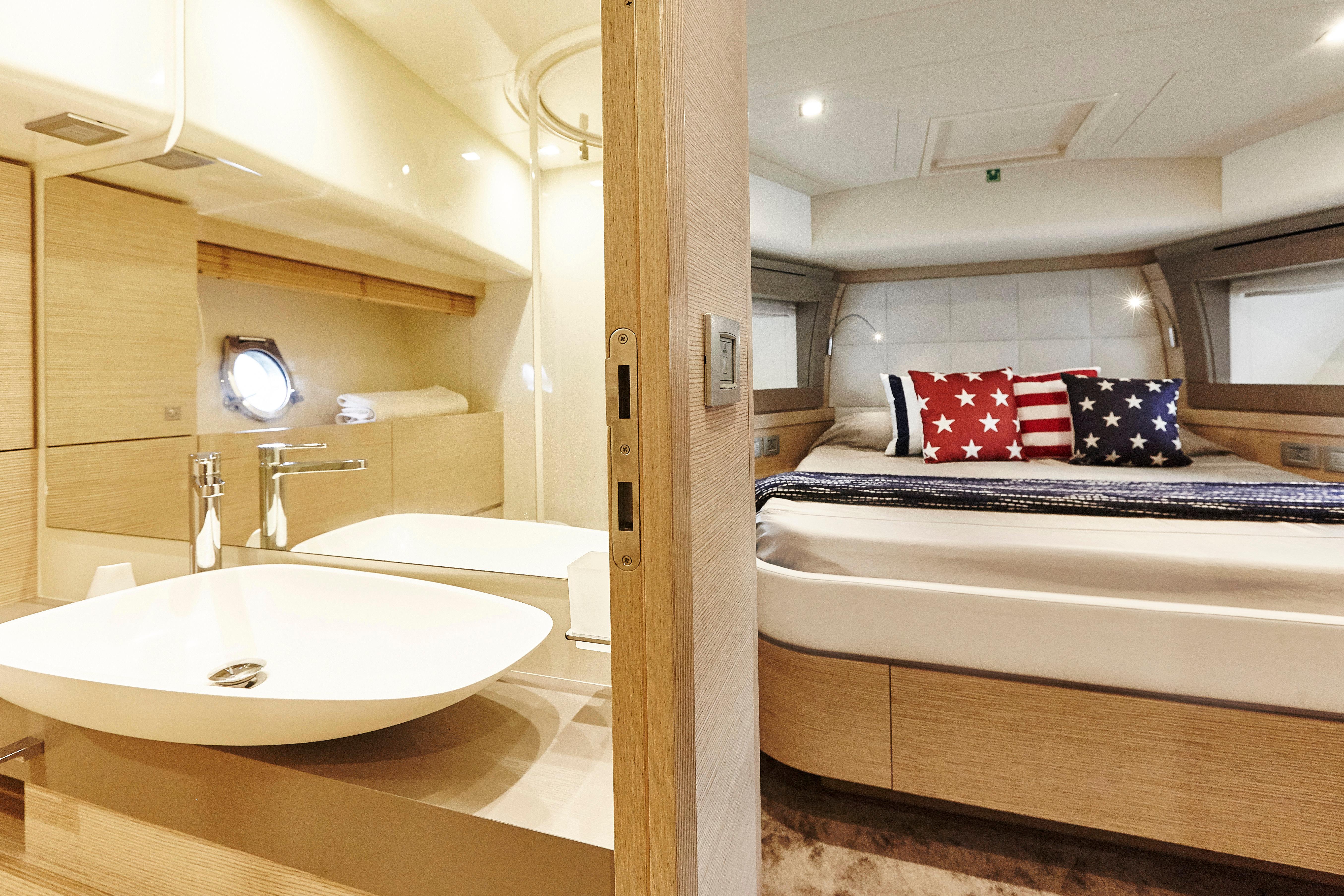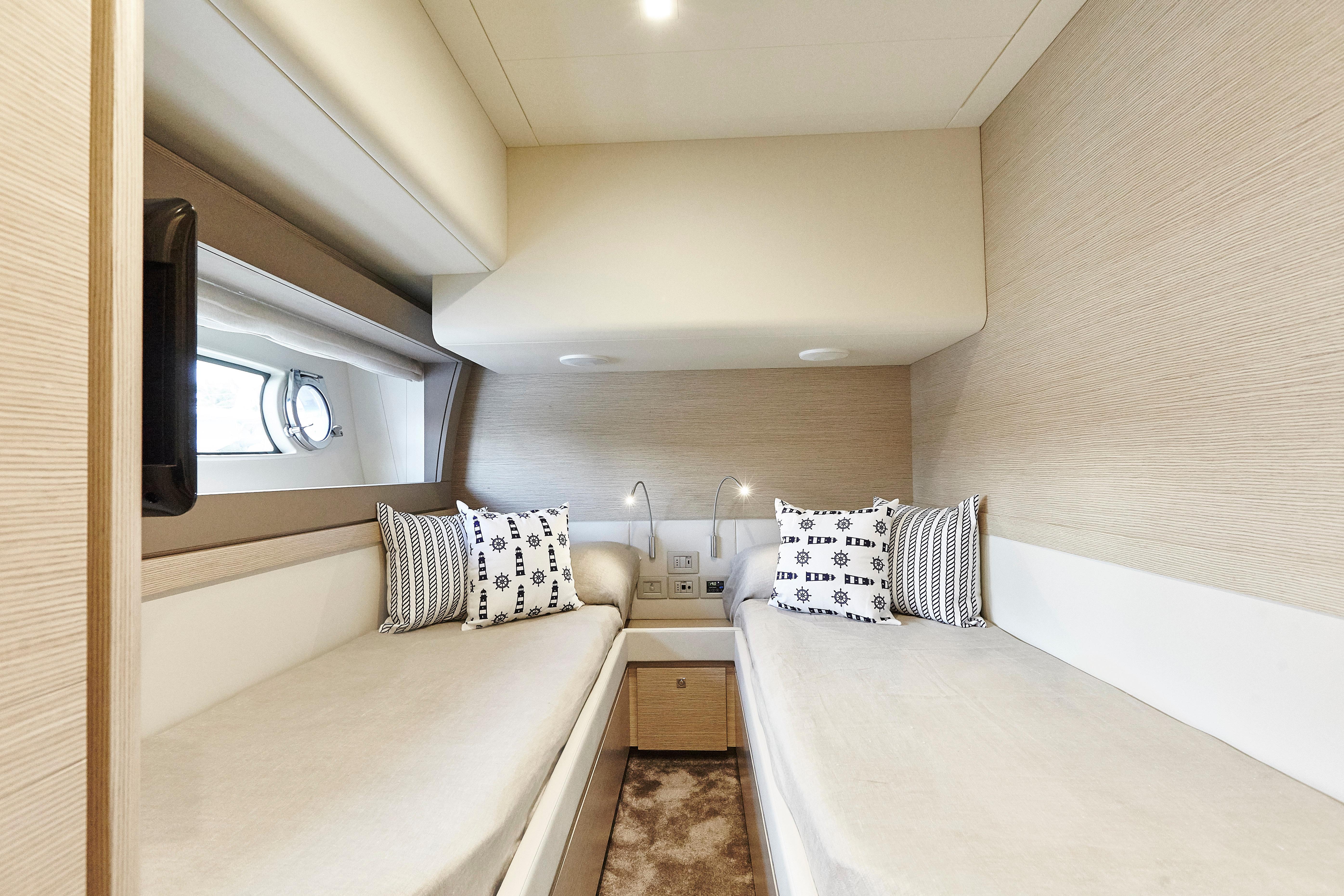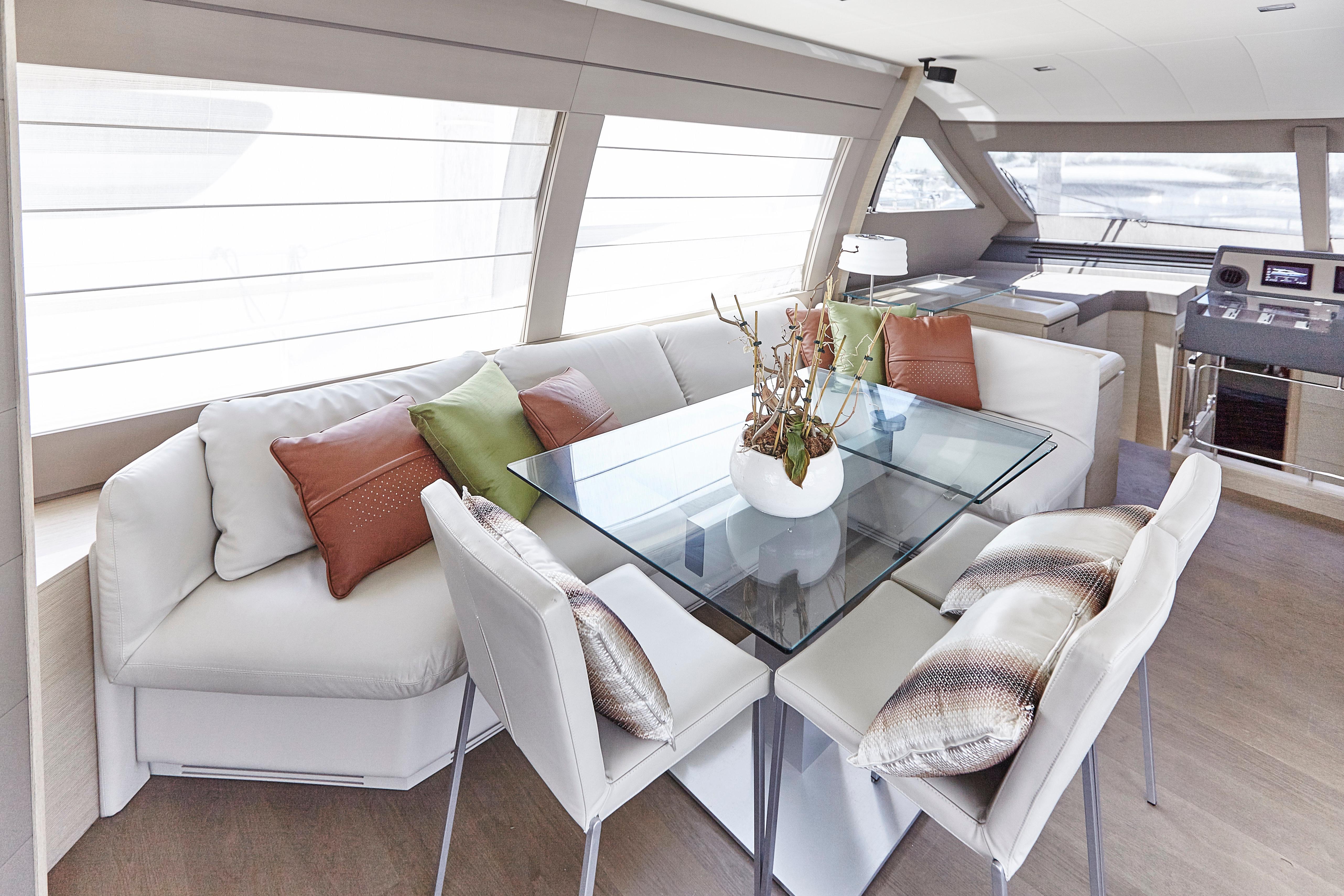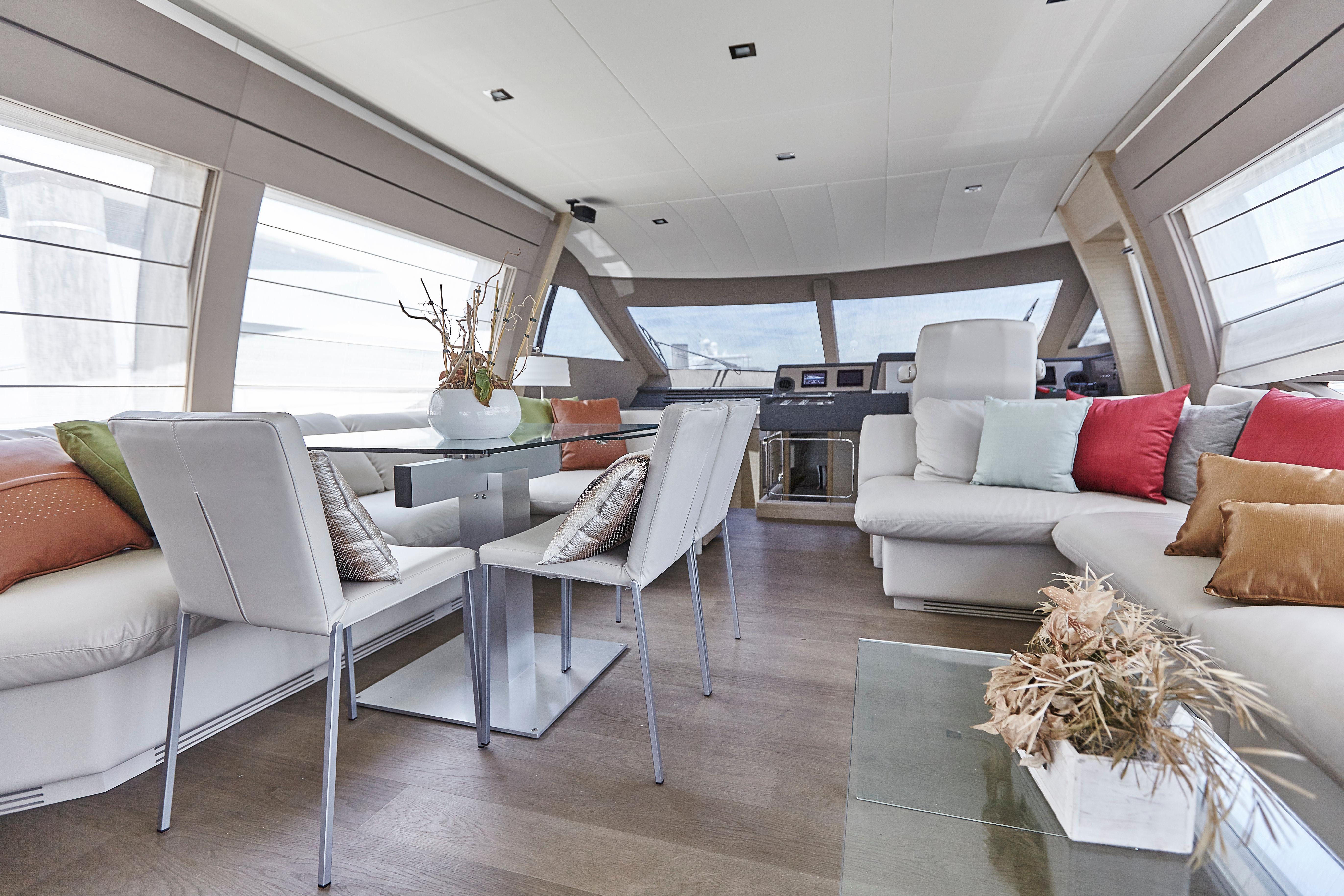 Ferretti Yachts 690 results from the usual collaboration between Studio Zuccon International Project, Ferretti Group Engineering, the team of engineers and architects of the Group, and AYT&D (Advanced Yacht Technology & Design), the research center of the Group. This model was first presented at the Cannes Boat Show in 2012 and features sleek and sporty external lines, with a continuous window from stern to bow, which is higher in correspondence of the gunwale. The hull features open-view windows in the owner cabin and other windows in the guest and VIP cabins to the bow. The external profile is enhanced by a flybridge with an elongated tail and a new generation roll bar. Ferretti Yachts 690, 21 meters long and more than 5.5 meters wide, is available with two different layouts, with three or four cabins. The main deck stands out for the rational distribution of spaces. The two options for the lower deck have a different position of the stairs, a lobby, guest cabins and bathrooms amidships. The full-beam owner cabin is more functional and spacious. Bathroom with separated shower and walk-in wardrobe behind the bed, increasing the distance between the owner cabin and the engine room, also separated from the crew cabin and from the fuel tank. The flybridge is highly innovative. The yacht is equipped with twin MTU 8V200 M94 engines.