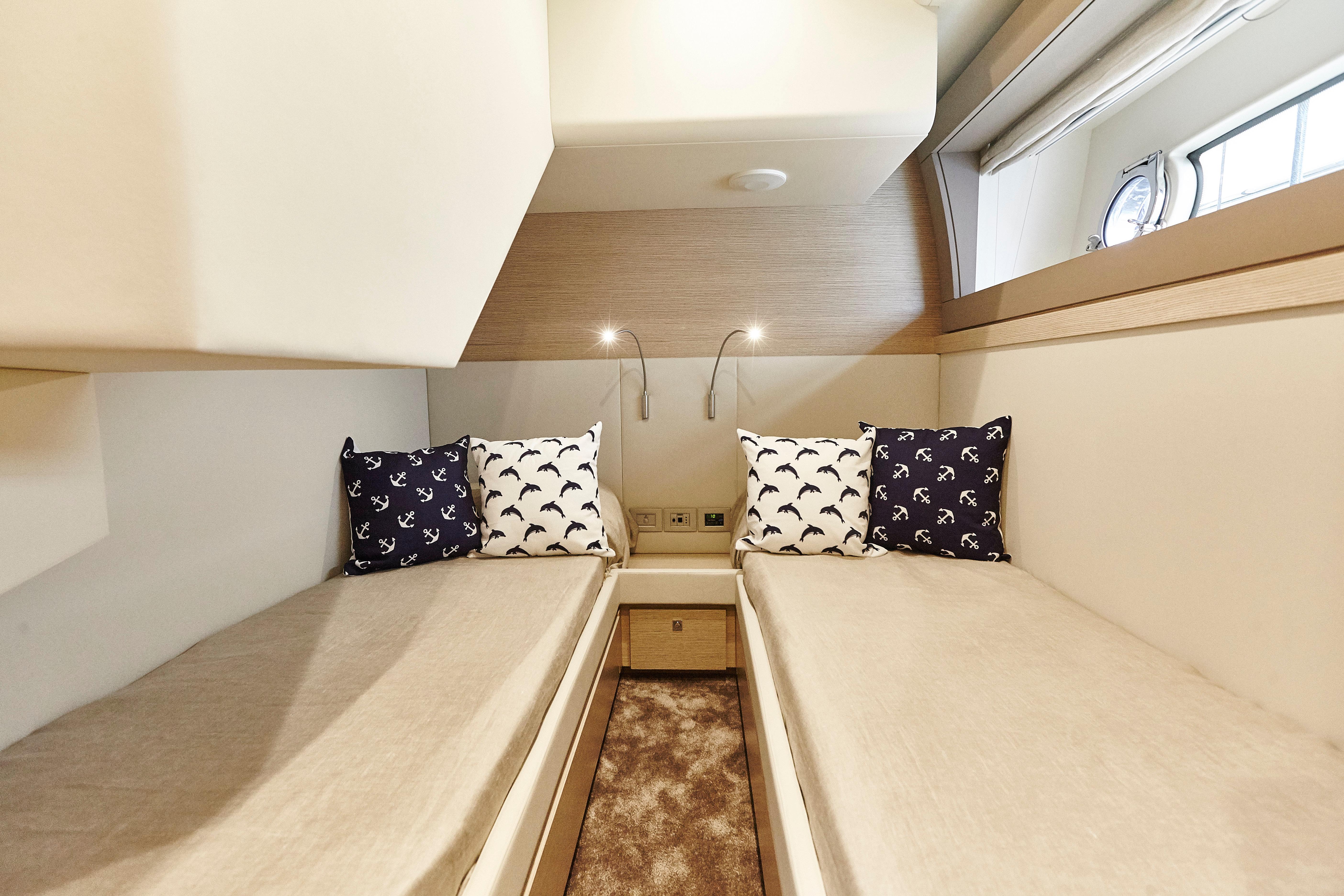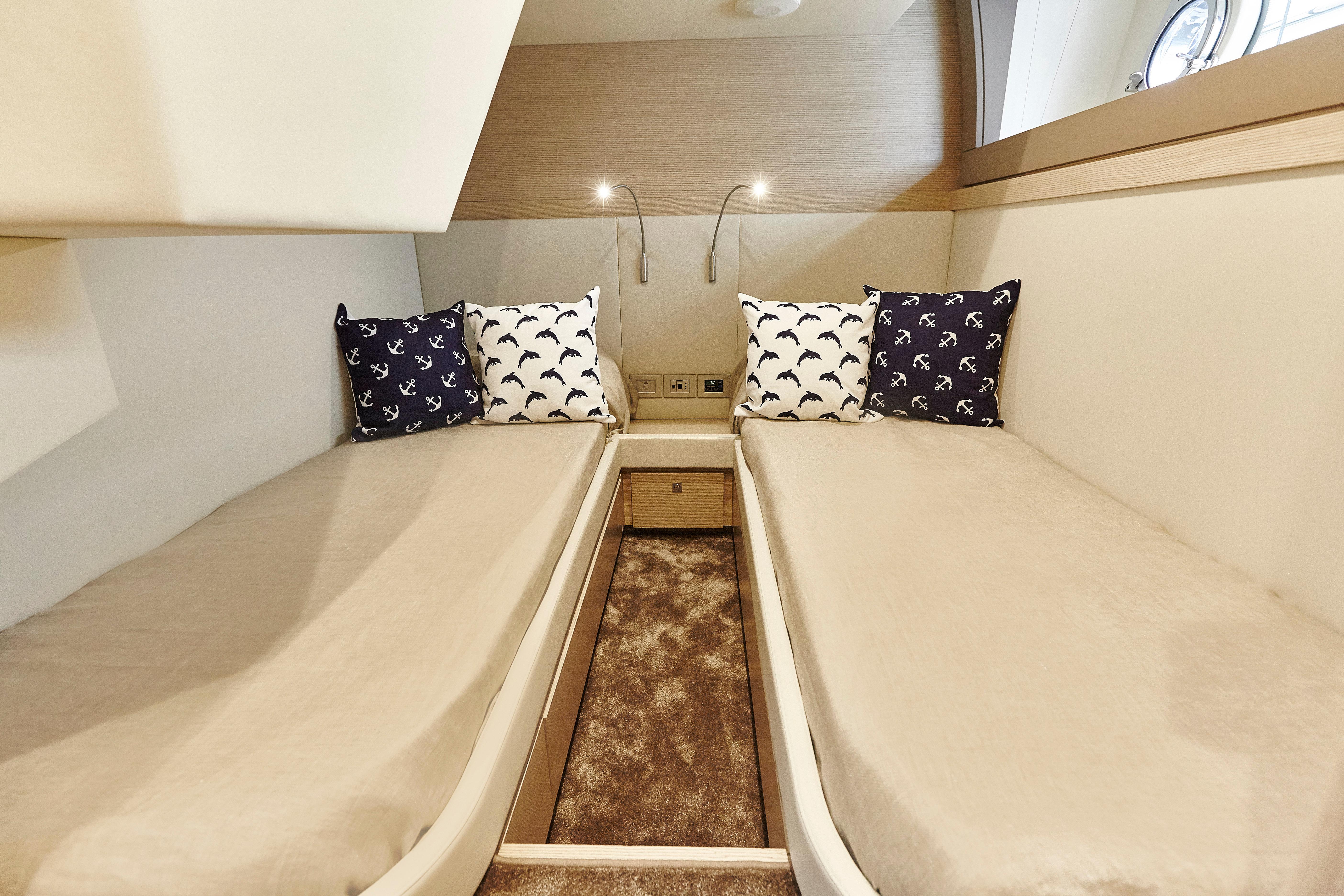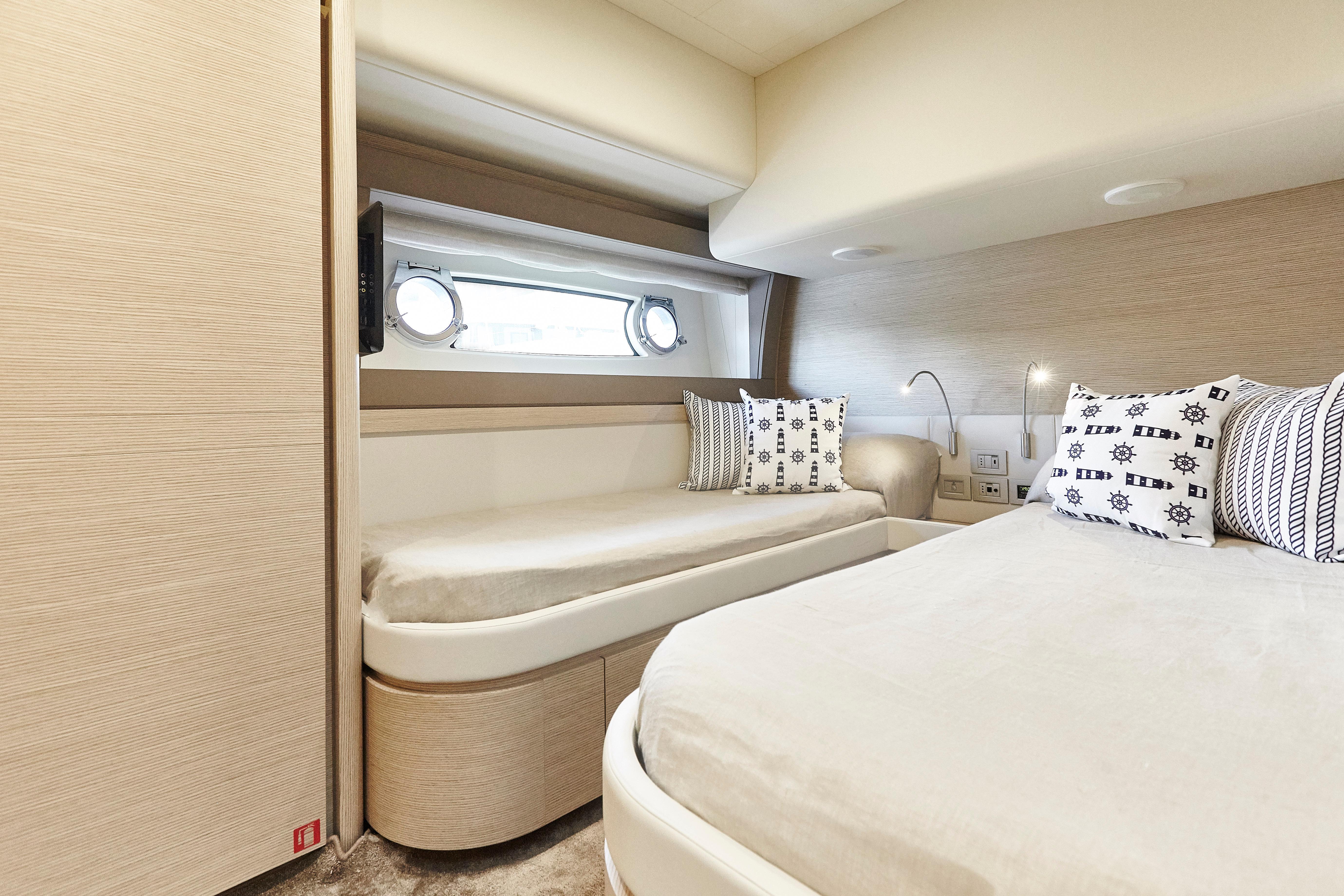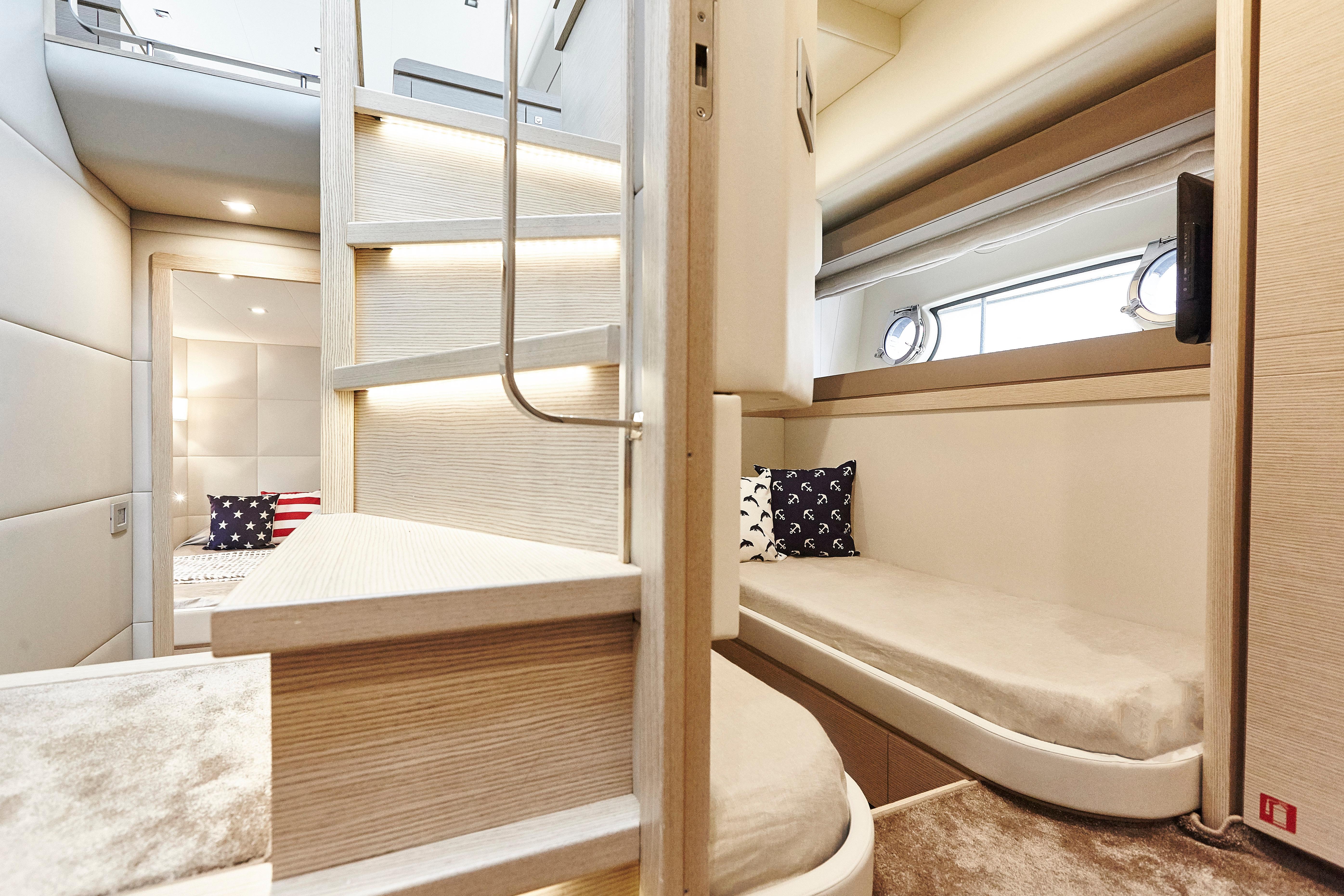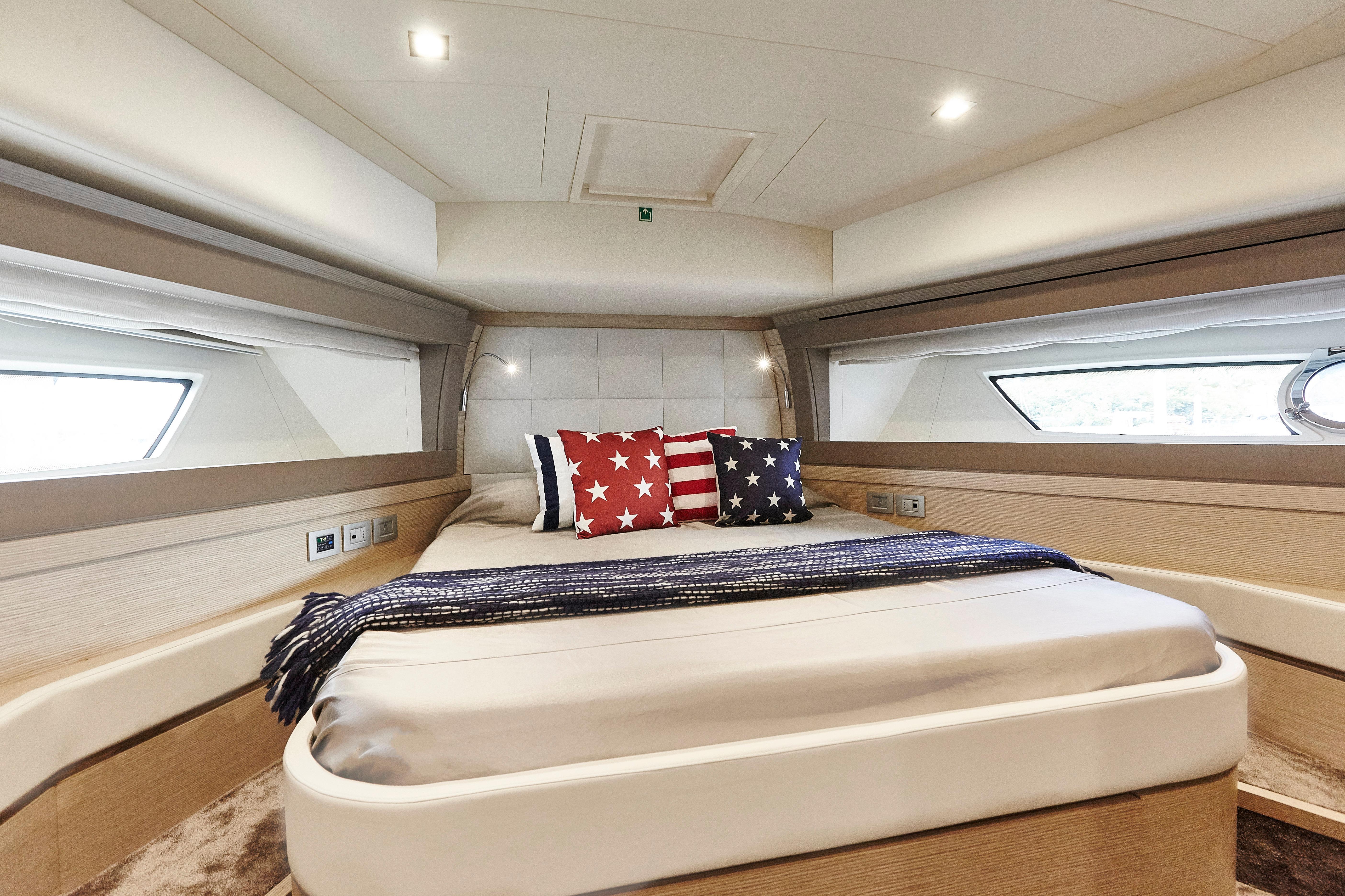 Ferretti Yachts 690 results from the usual collaboration between Studio Zuccon International Project, Ferretti Group Engineering, the team of engineers and architects of the Group, and AYT&D (Advanced Yacht Technology & Design), the research center of the Group. This model was first presented at the Cannes Boat Show in 2012 and features sleek and sporty external lines, with a continuous window from stern to bow, which is higher in correspondence of the gunwale. The hull features open-view windows in the owner cabin and other windows in the guest and VIP cabins to the bow. The external profile is enhanced by a flybridge with an elongated tail and a new generation roll bar. Ferretti Yachts 690, 21 meters long and more than 5.5 meters wide, is available with two different layouts, with three or four cabins. The main deck stands out for the rational distribution of spaces. The two options for the lower deck have a different position of the stairs, a lobby, guest cabins and bathrooms amidships. The full-beam owner cabin is more functional and spacious. Bathroom with separated shower and walk-in wardrobe behind the bed, increasing the distance between the owner cabin and the engine room, also separated from the crew cabin and from the fuel tank. The flybridge is highly innovative. The yacht is equipped with twin MTU 8V200 M94 engines.