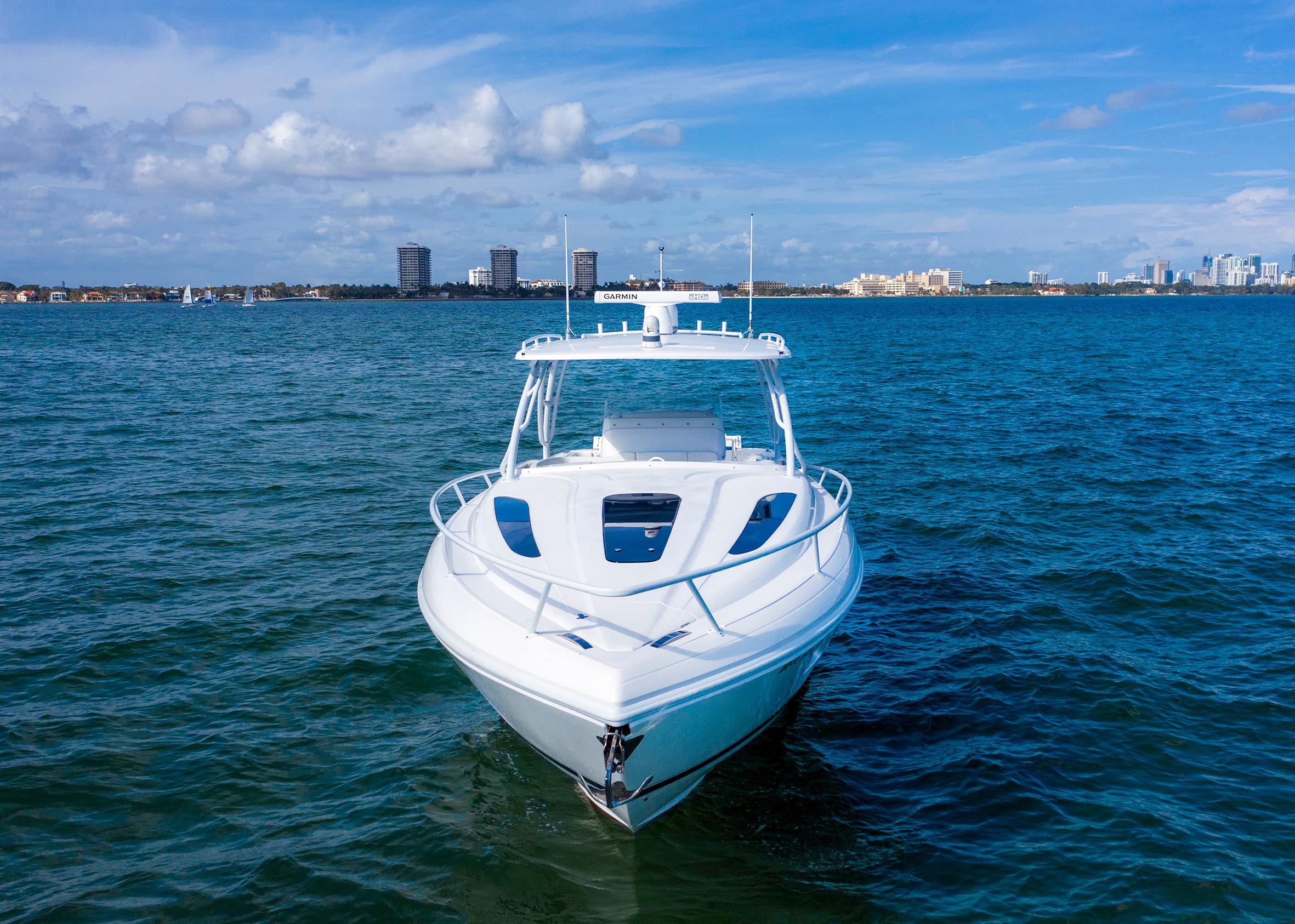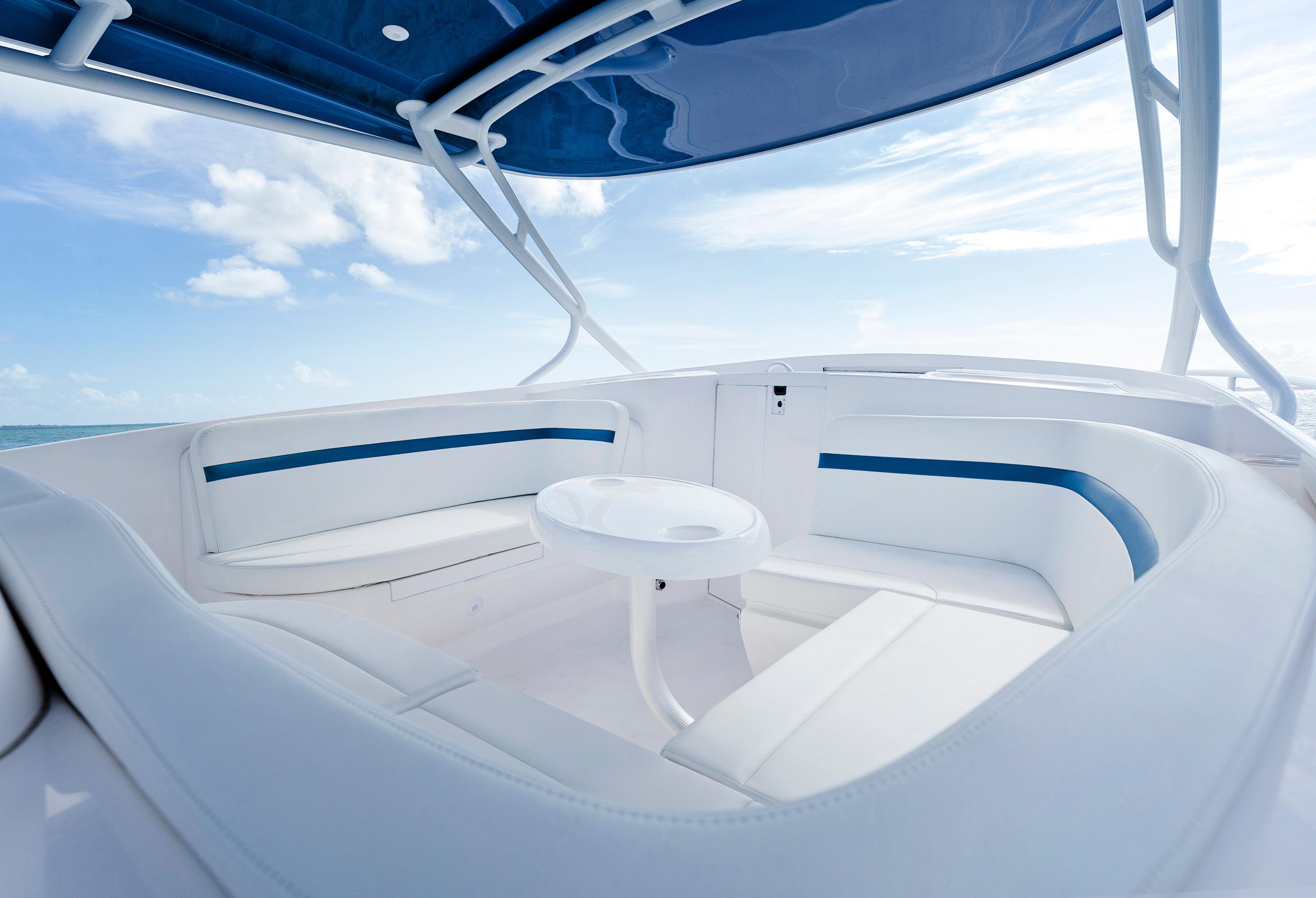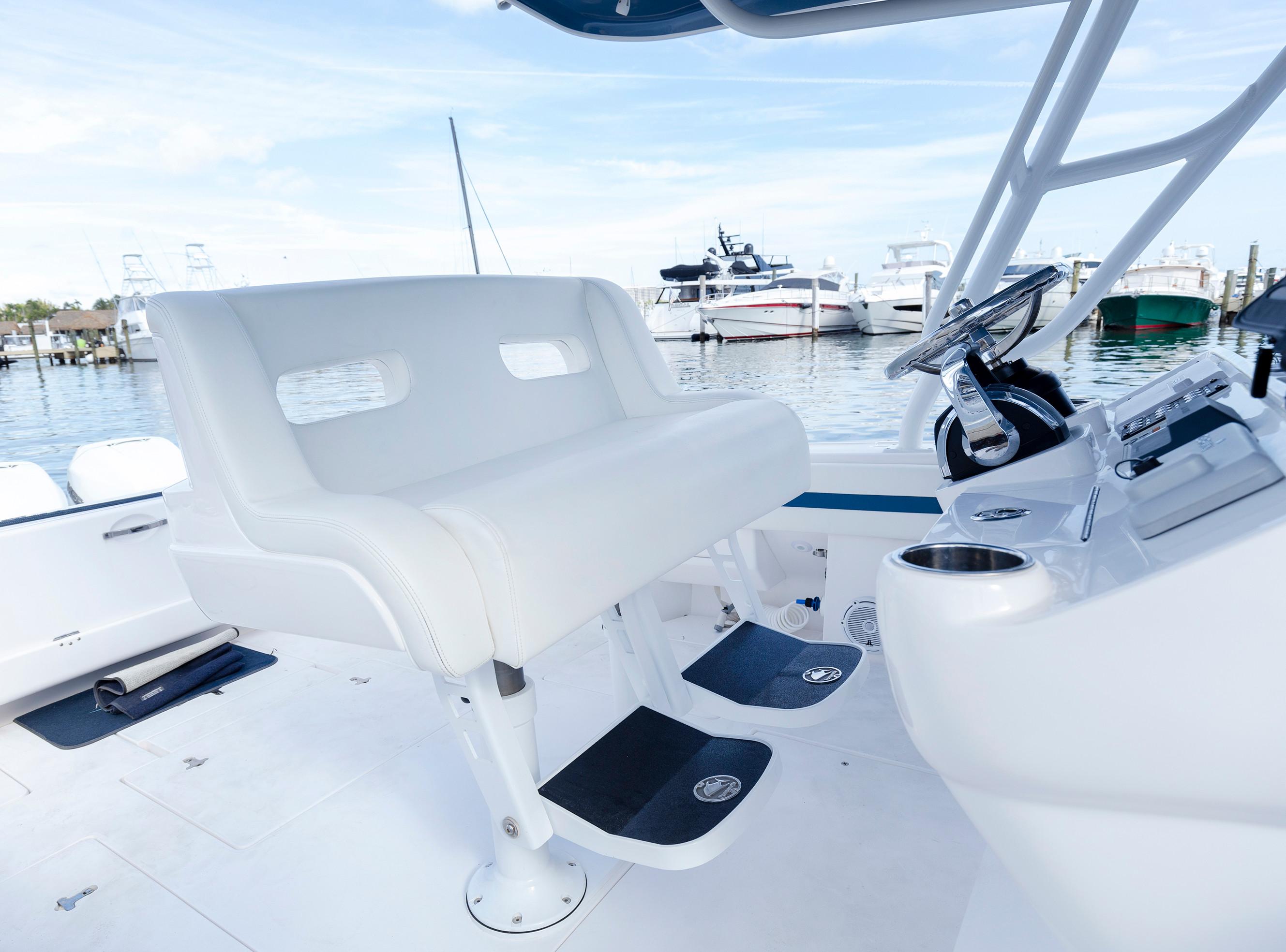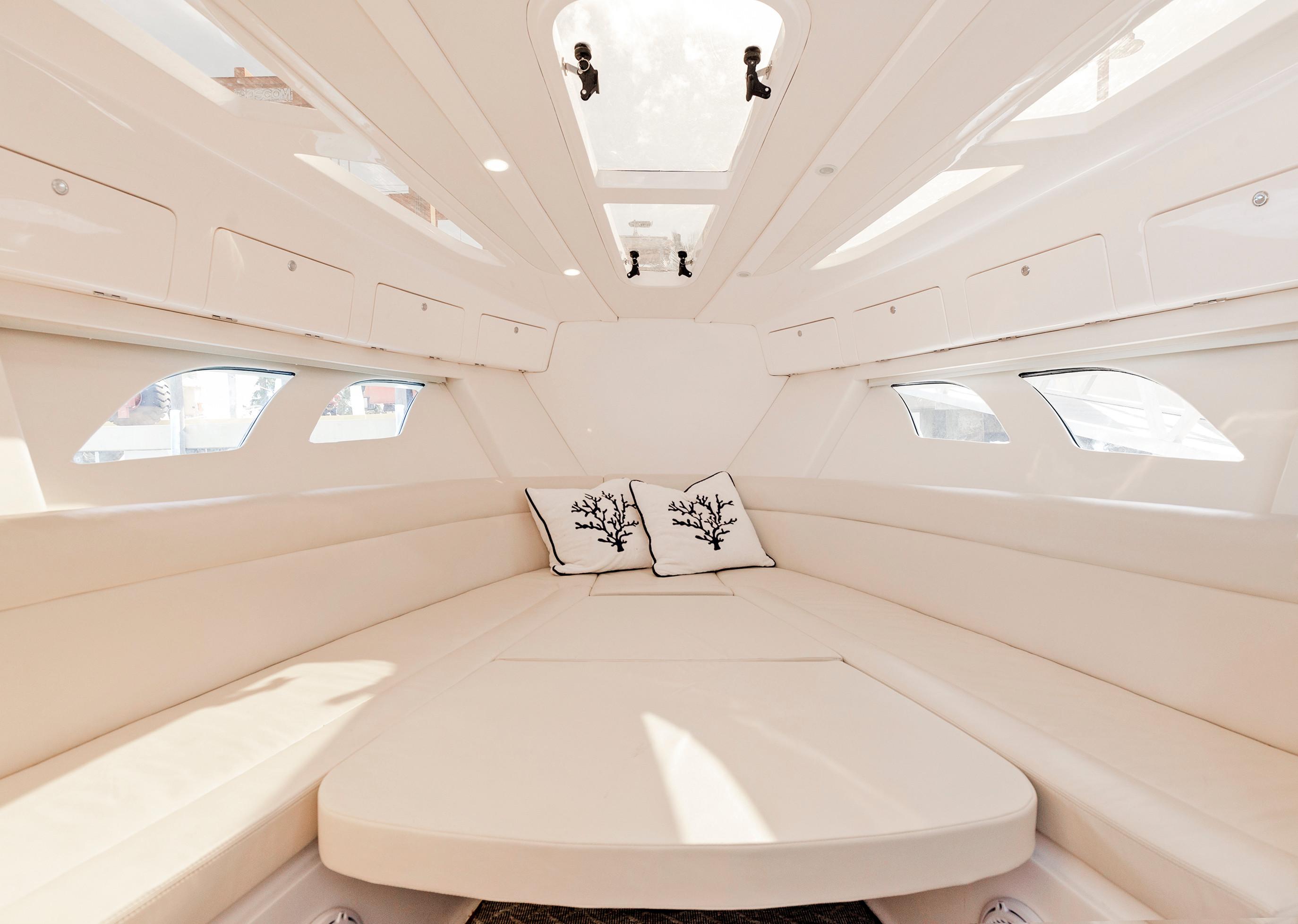 Sleek and stylish, the 407 Cuddy offers all the enhanced accommodations you would expect in a luxury performance cruiser. From a private head with shower stall and separate master berth with queen bed and hullside windows to a forward cabin section that easily converts to a large double berth. But none of it comes at the expense of the most advanced technology and fabrication techniques that deliver an incomparably smooth, dry ride with unparalleled performance. For divers and swimmers, it’s packed with thoughtful design features like a hullside dive door with step ladder and grab rails. Entertaining is elevated with cozy, custom seating and a stylish wet bar while serious sport fishermen will take note of the baitwells, rod holders, tank storage, tackle boxes and raw water washdown.
