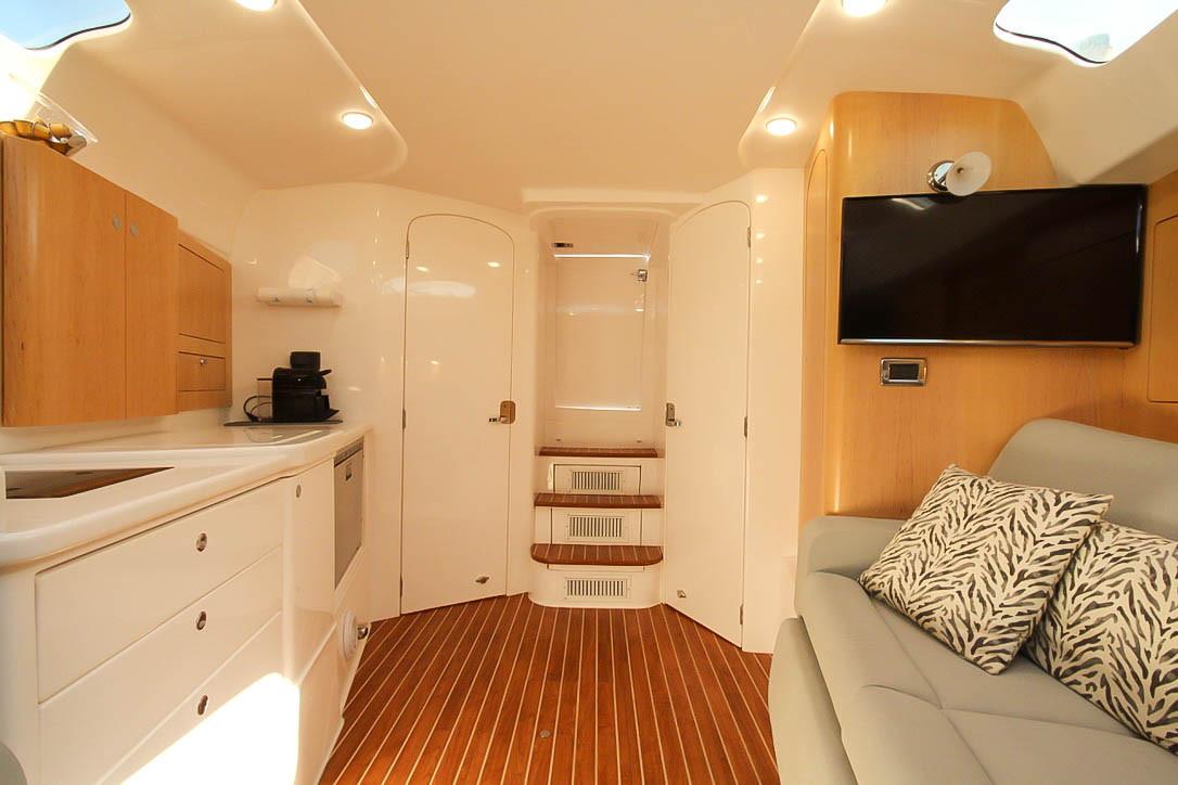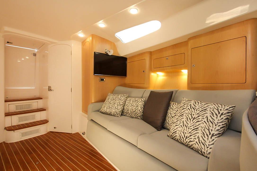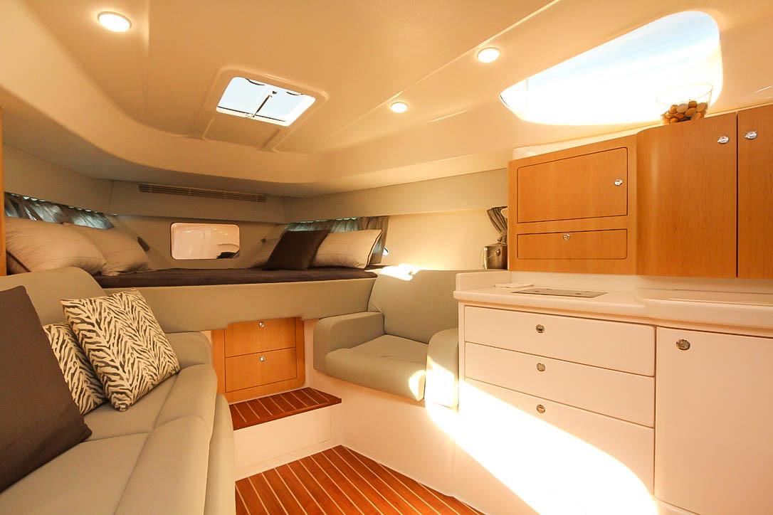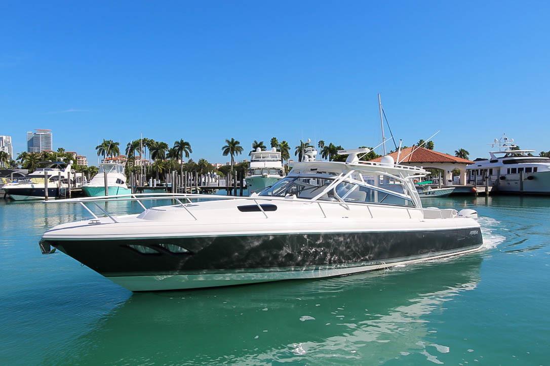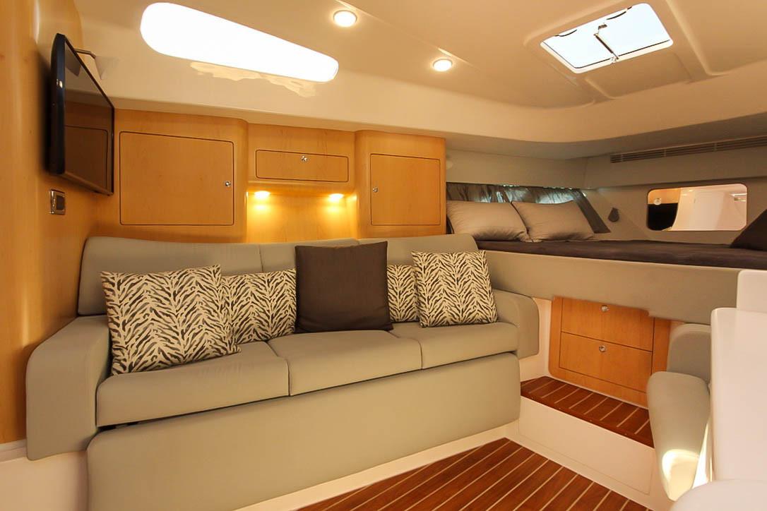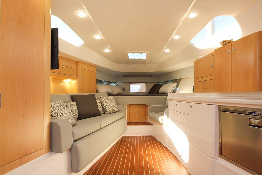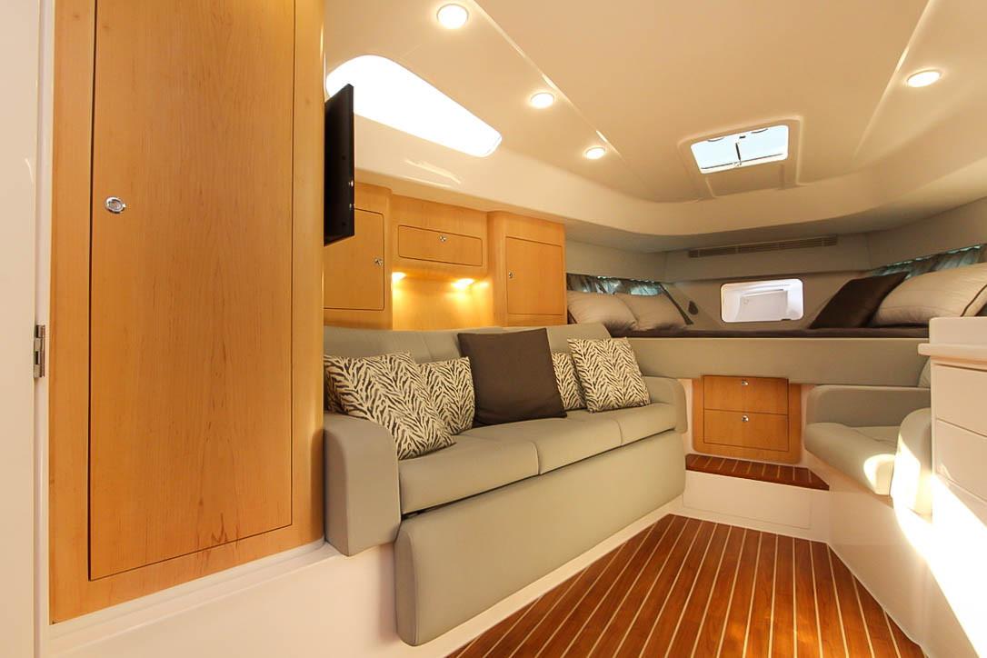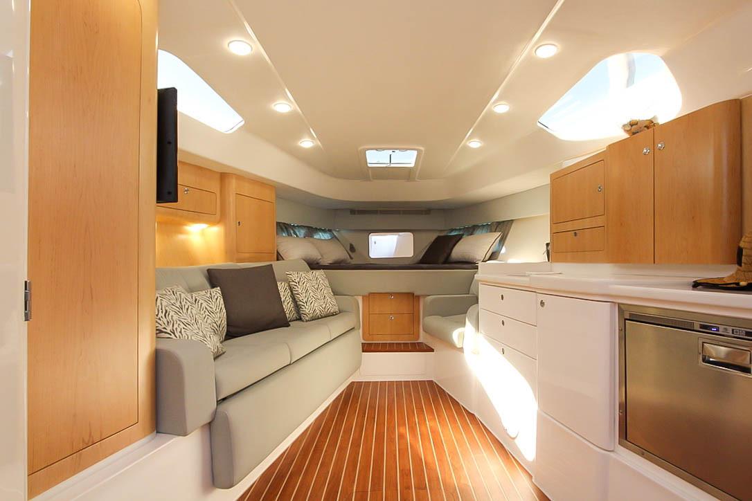 A cabin twice as large as an inboard of similar size? Heard. A racy, big water day boat for short hops ,complete, world-class amenities befitting a luxury yacht so you can hit the islands for a week at a time? Yes, we heard all of it. The 430 Sport Yacht boasts a helm with a pop-up console equipped with the latest flat-screen electronics while an optional power sunroof overlooks wraparound club-style seating that inspires comfortable interaction. During the day, the state-of-the-art accommodations in the cabin are flooded with natural sunlight aboard this one of a kind sport yacht. You told us what you wanted. And we delivered the 430 Sport Yacht as one very powerful, innovative and luxurious answer.