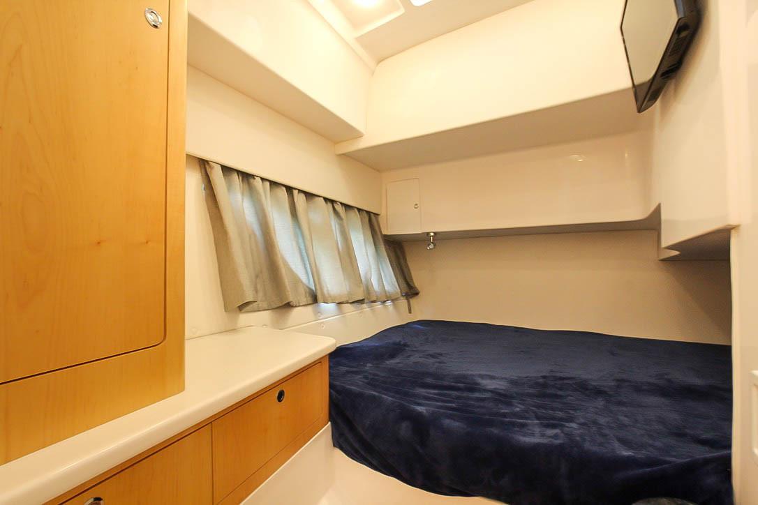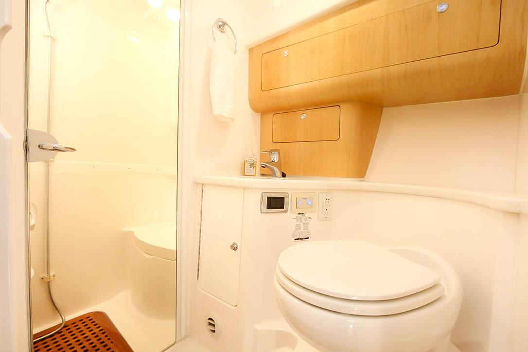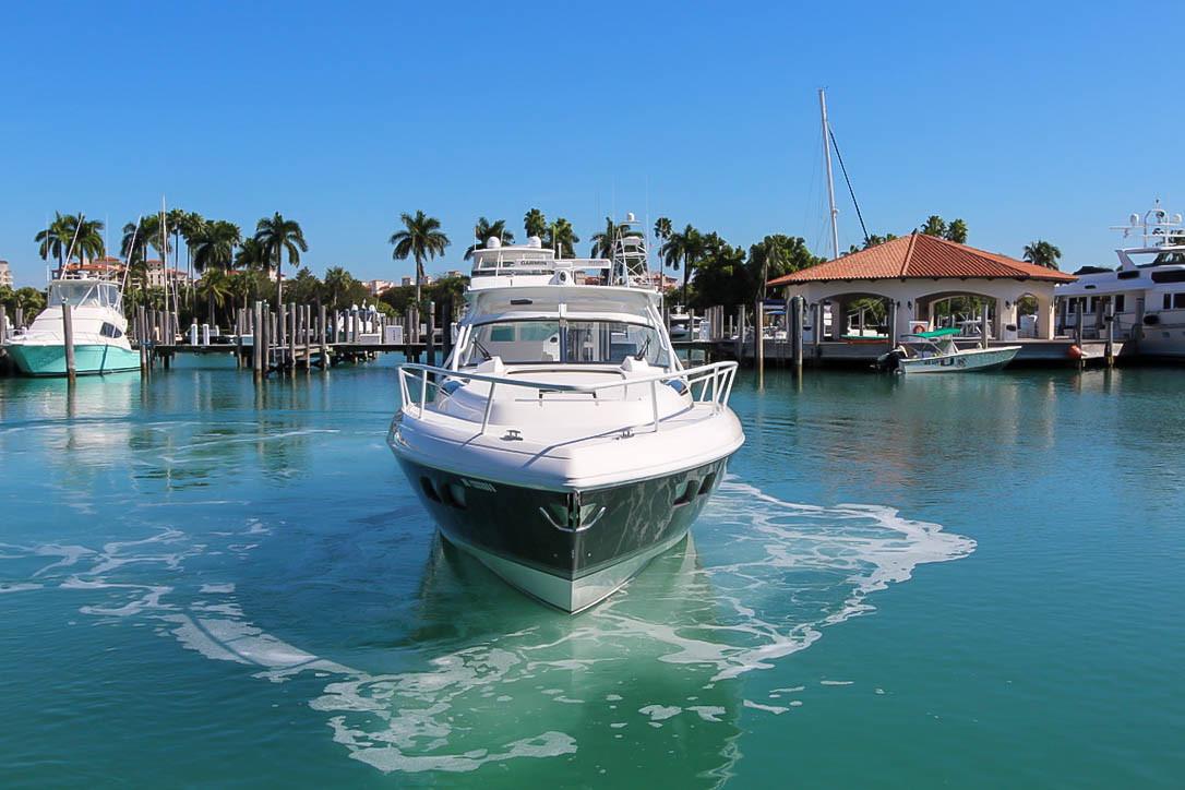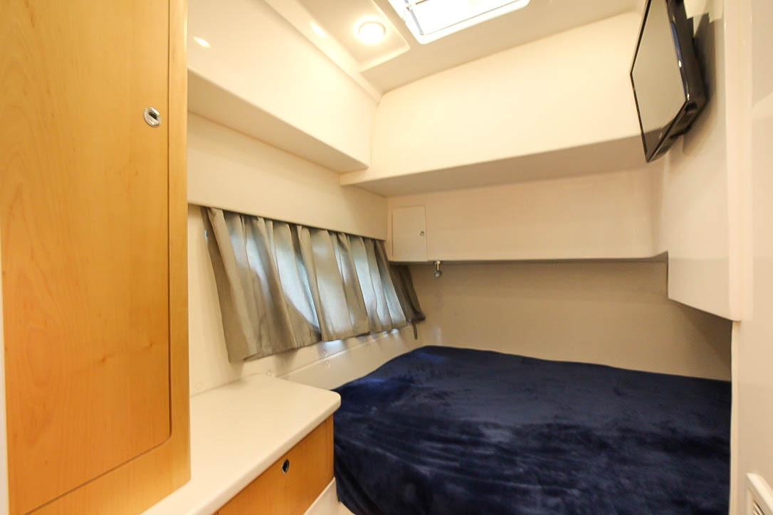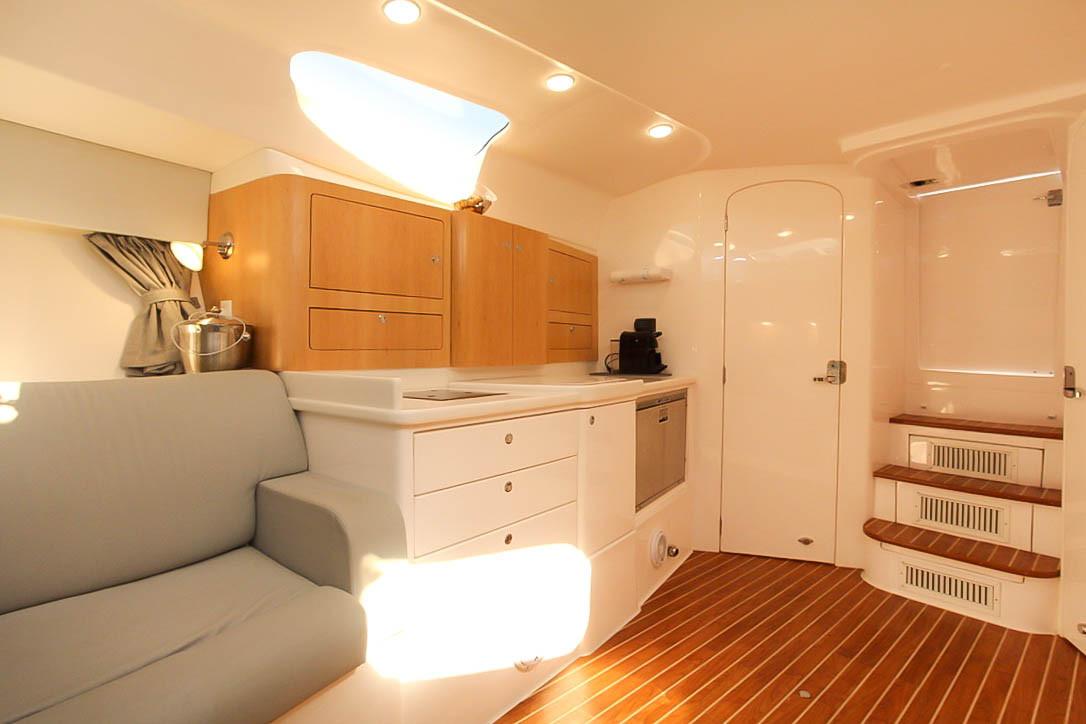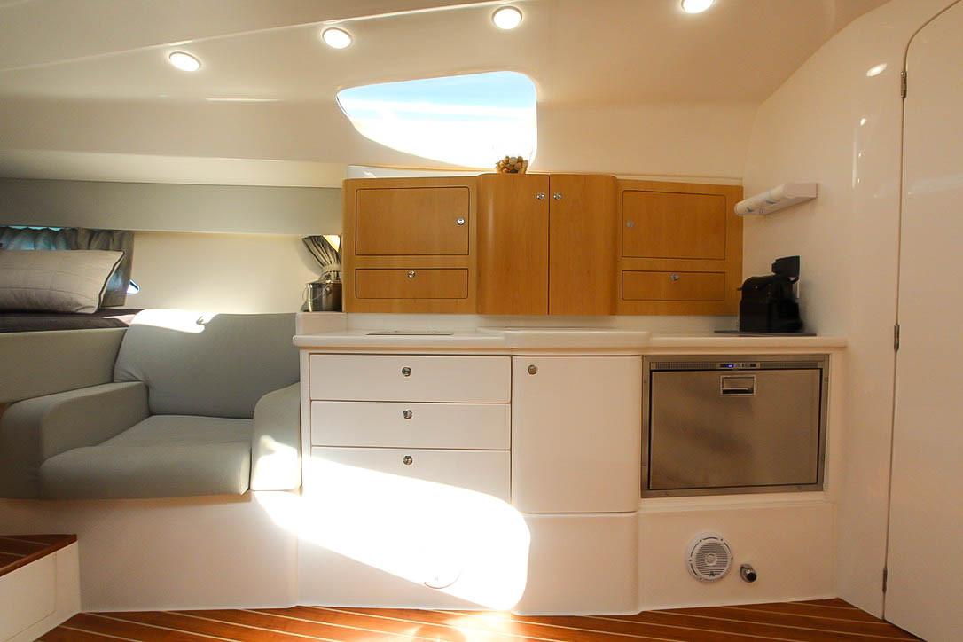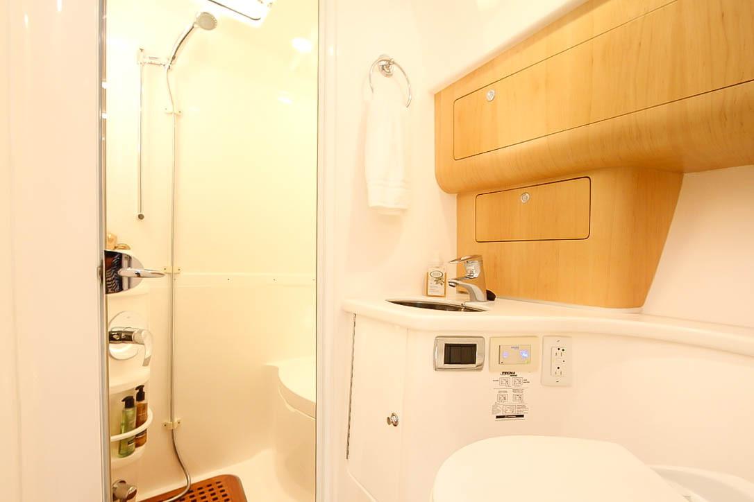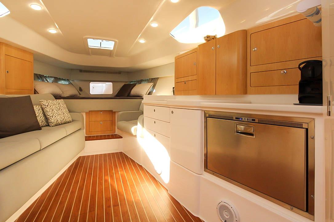 A cabin twice as large as an inboard of similar size? Heard. A racy, big water day boat for short hops ,complete, world-class amenities befitting a luxury yacht so you can hit the islands for a week at a time? Yes, we heard all of it. The 430 Sport Yacht boasts a helm with a pop-up console equipped with the latest flat-screen electronics while an optional power sunroof overlooks wraparound club-style seating that inspires comfortable interaction. During the day, the state-of-the-art accommodations in the cabin are flooded with natural sunlight aboard this one of a kind sport yacht. You told us what you wanted. And we delivered the 430 Sport Yacht as one very powerful, innovative and luxurious answer.