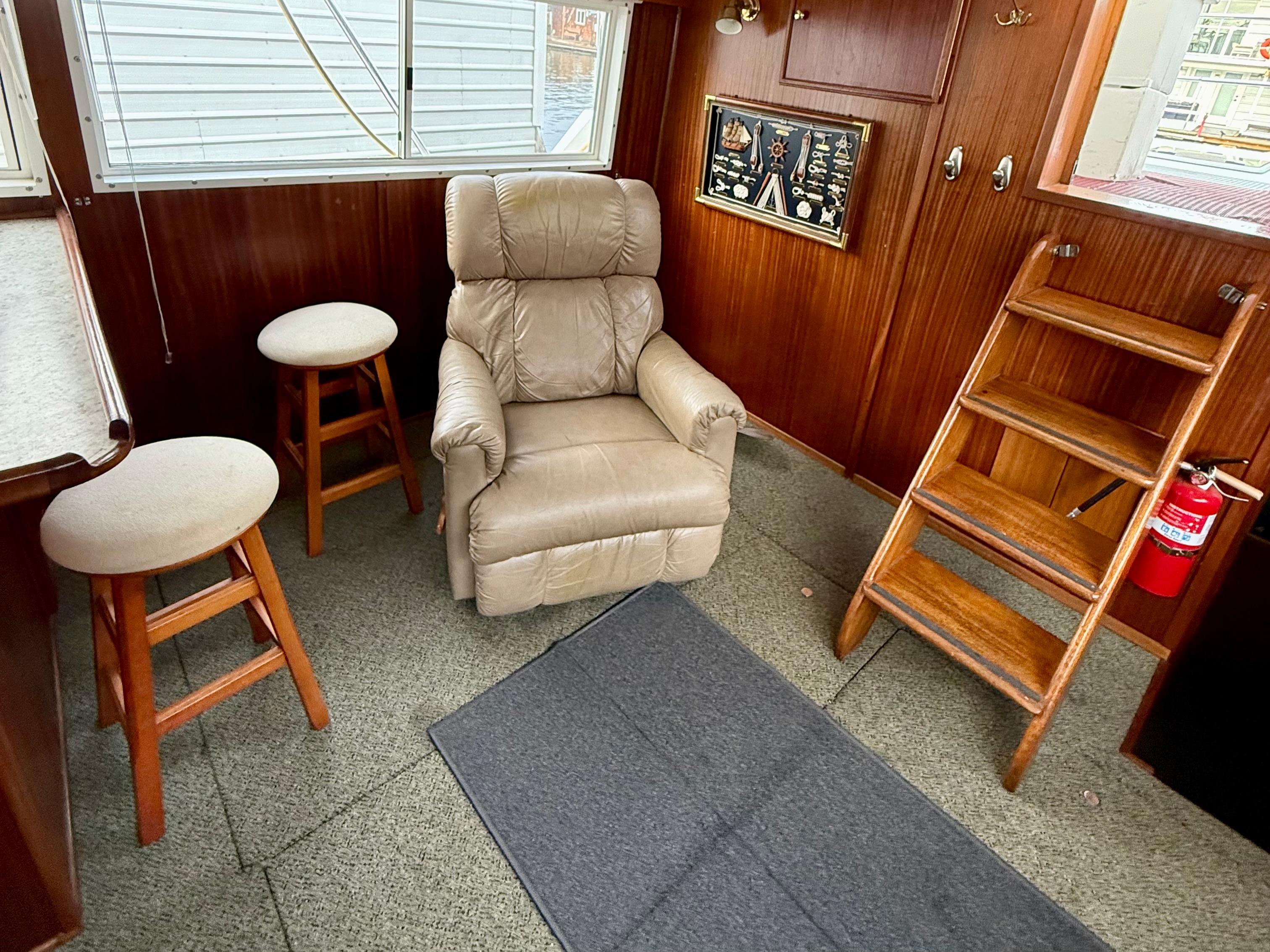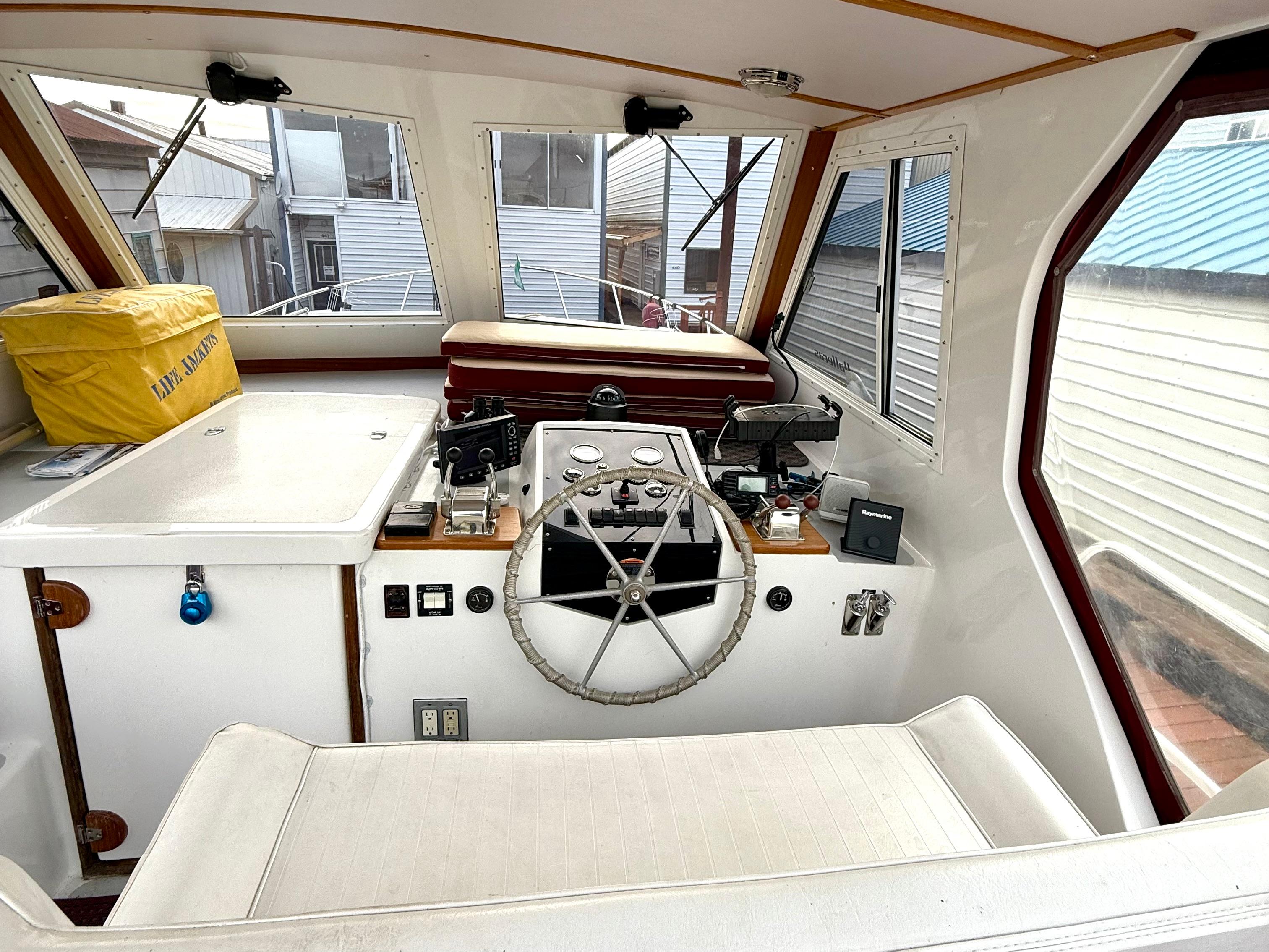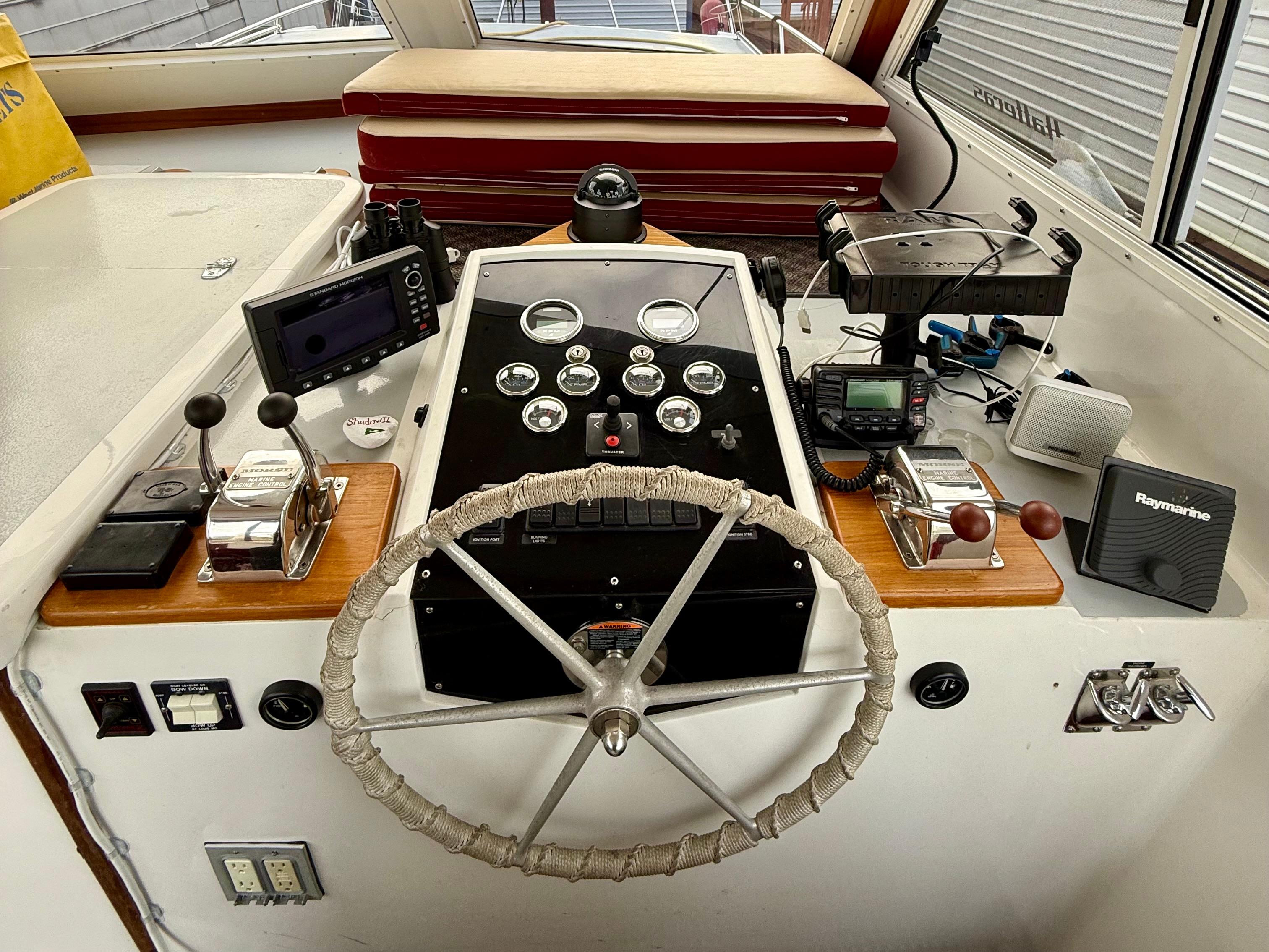Boarding Shadow II, you’re greeted by a spacious swim step and striking curved staircase — a custom addition that sets the tone for this distinctive yacht. Up top, the enclosed flybridge is ideal for Northwest cruising, with a Raymarine autopilot, thruster control, and Standard Horizon GPS/chartplotter at your fingertips.