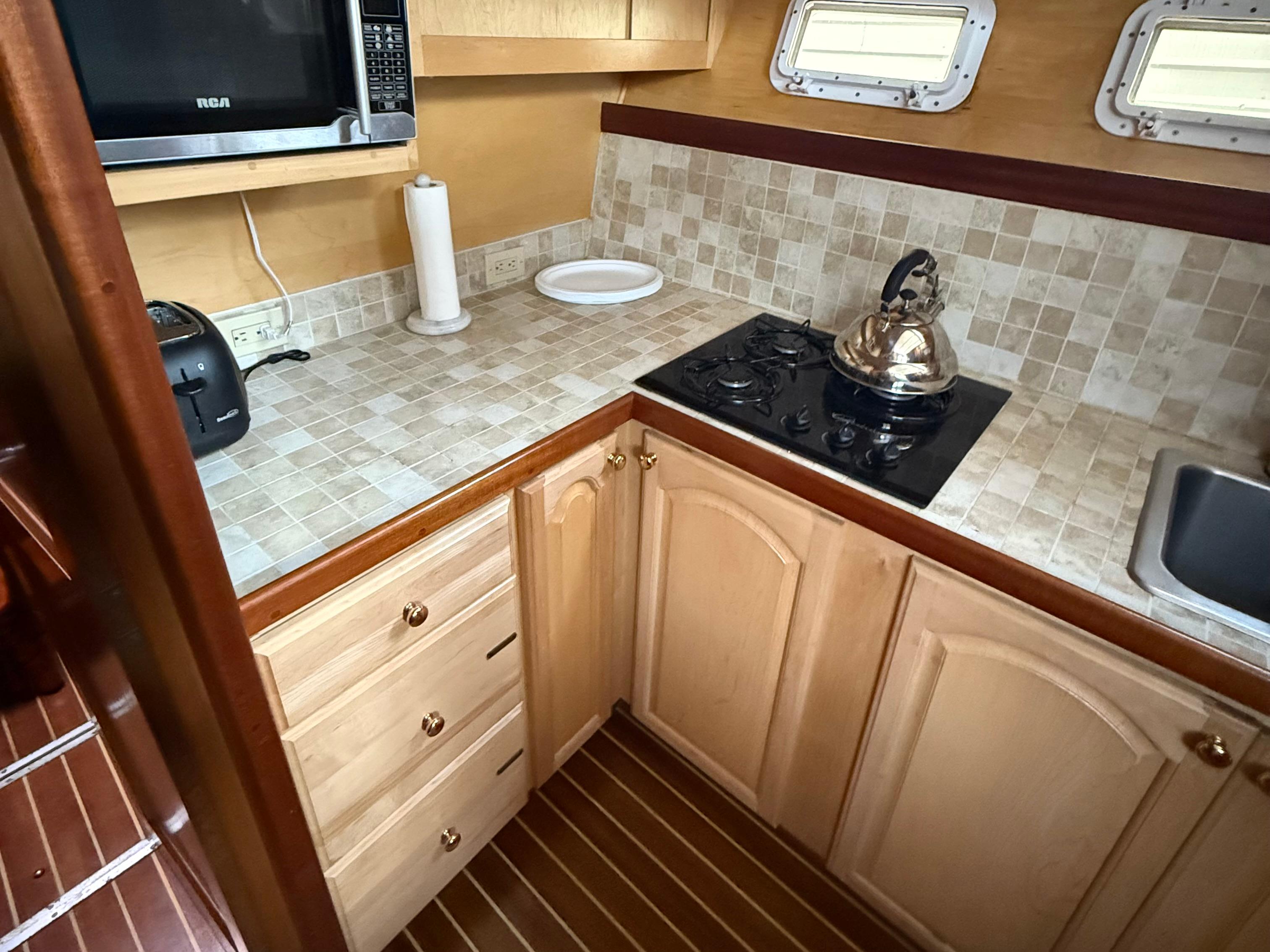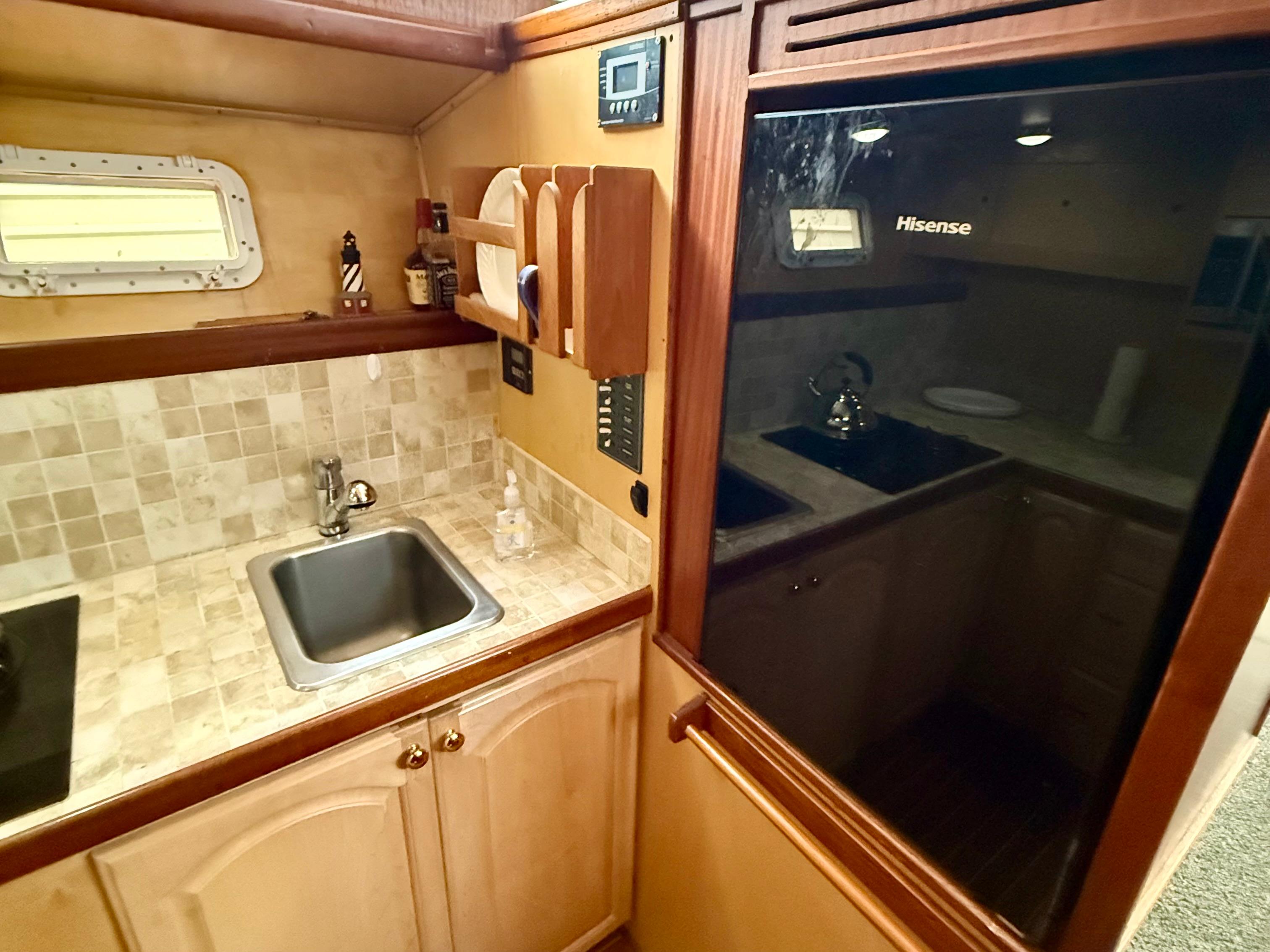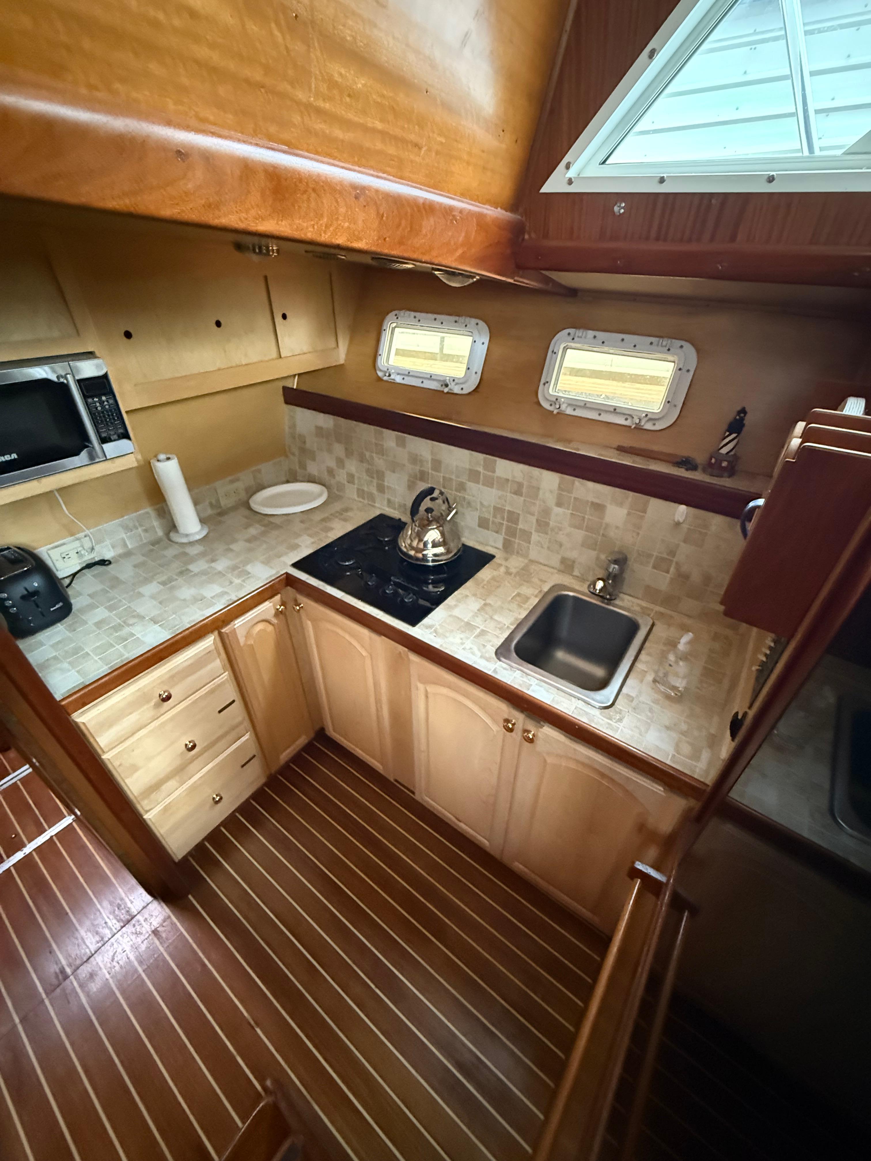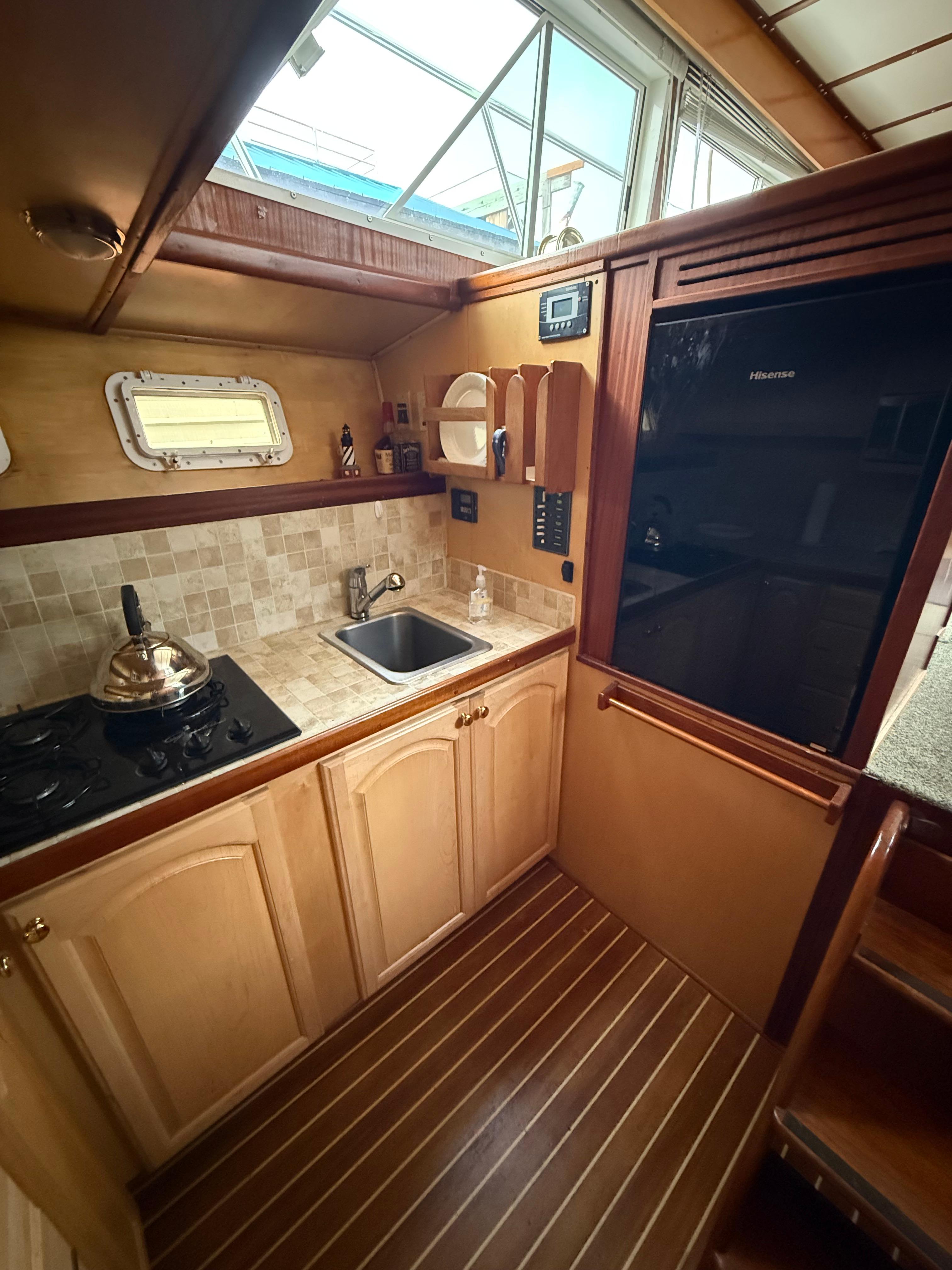 Step below to a salon that’s both expansive and inviting, wrapped in rich mahogany joinery. Whether you’re entertaining guests or relaxing at anchor, there’s room to spread out and enjoy. The forward galley includes a propane cooktop, microwave, and Hisense refrigerator — practical and ready for extended time aboard.