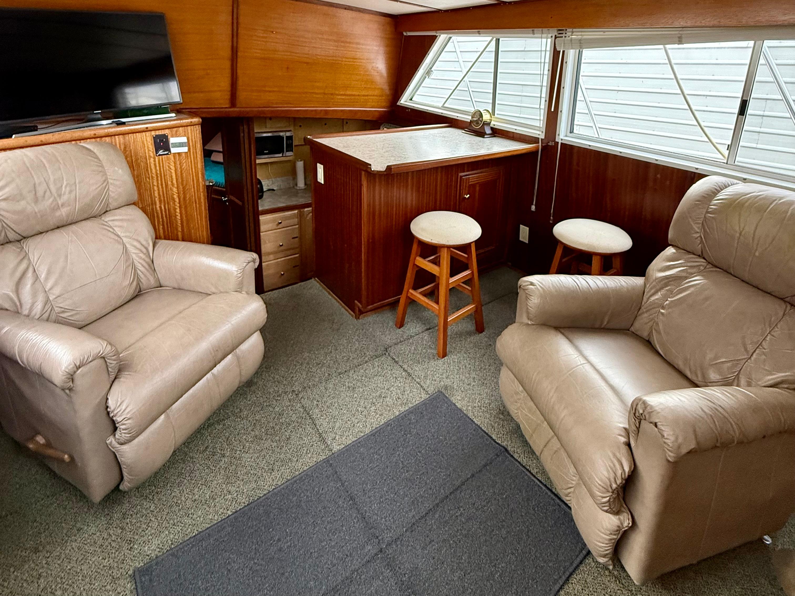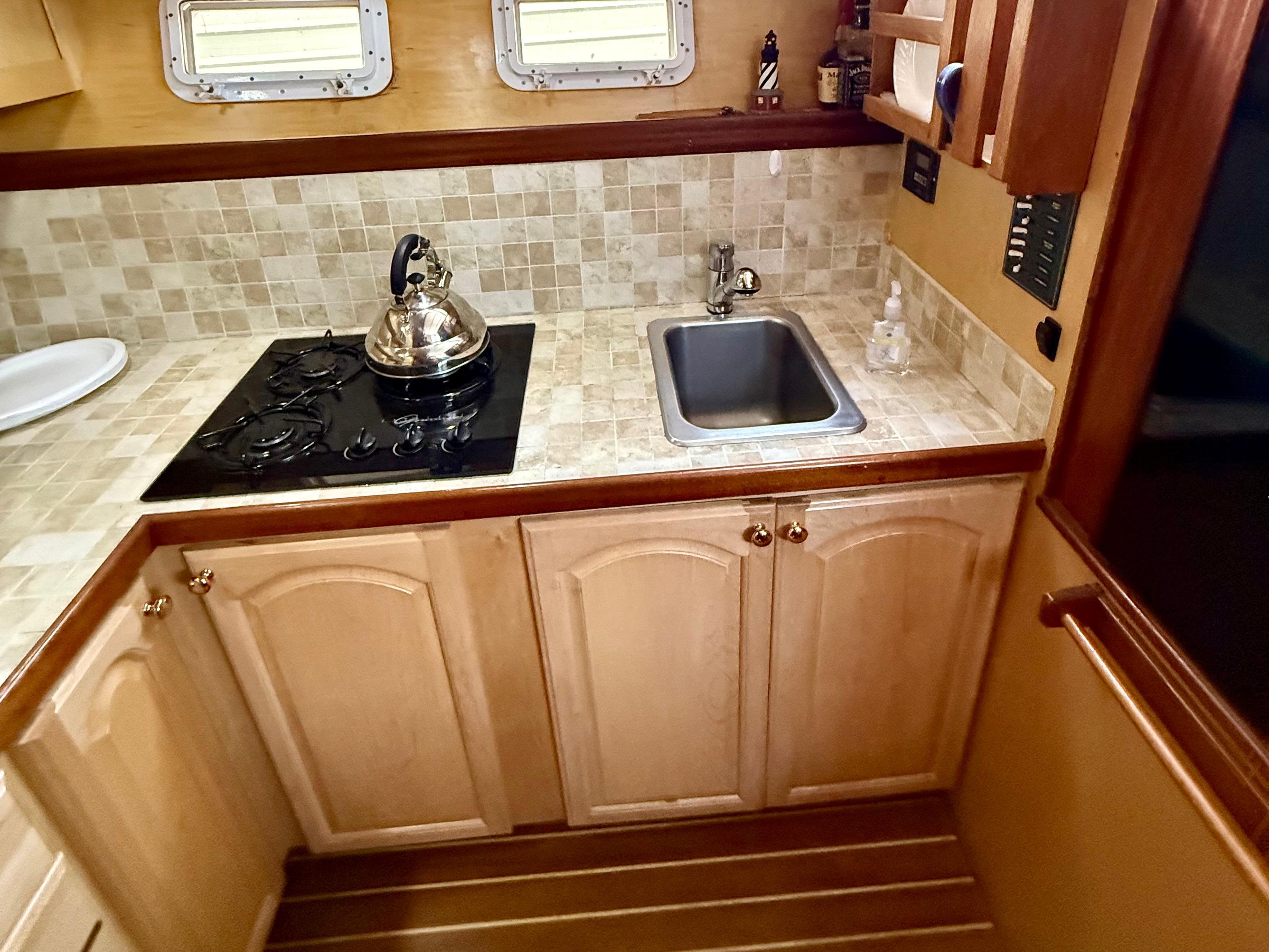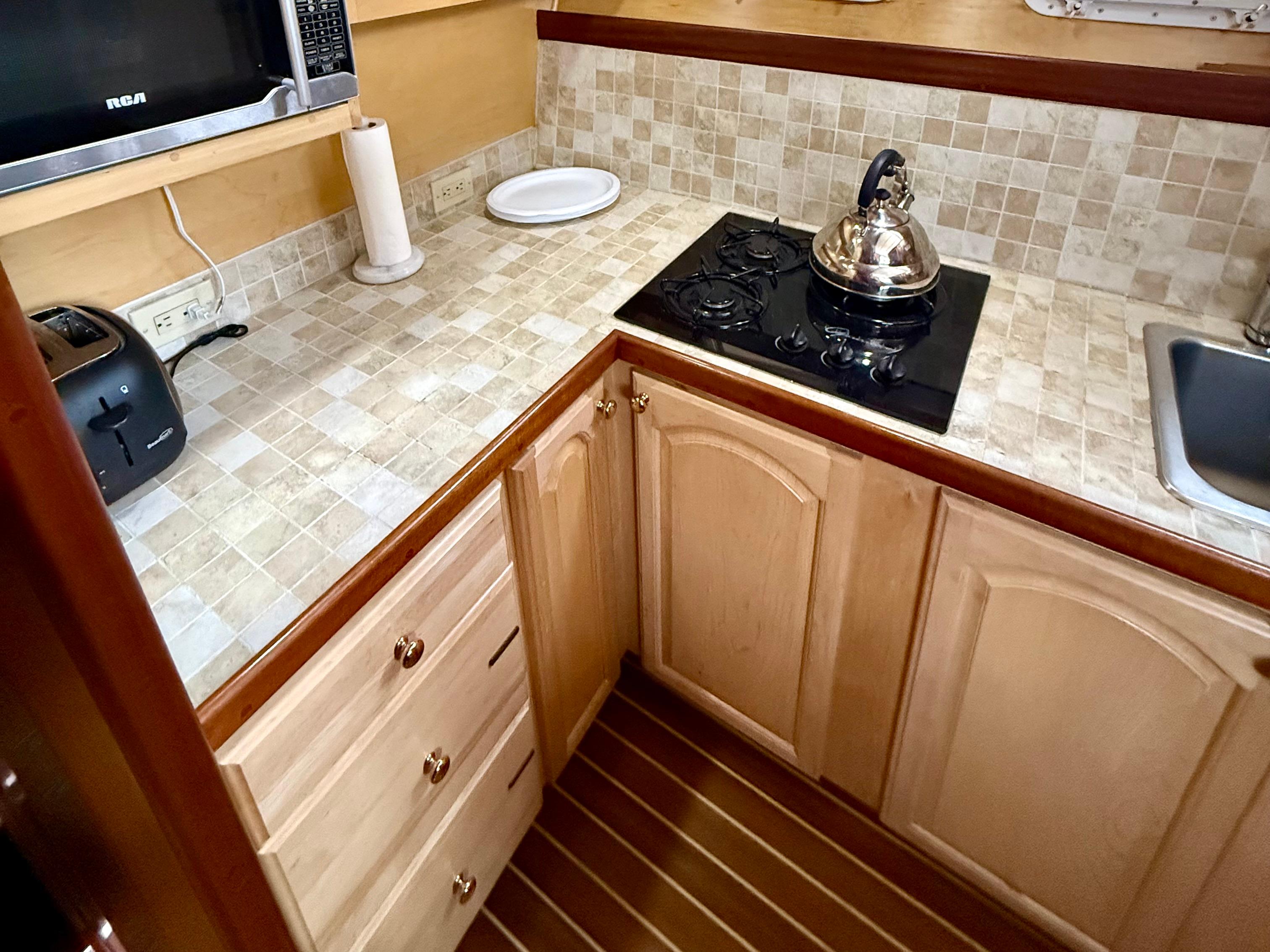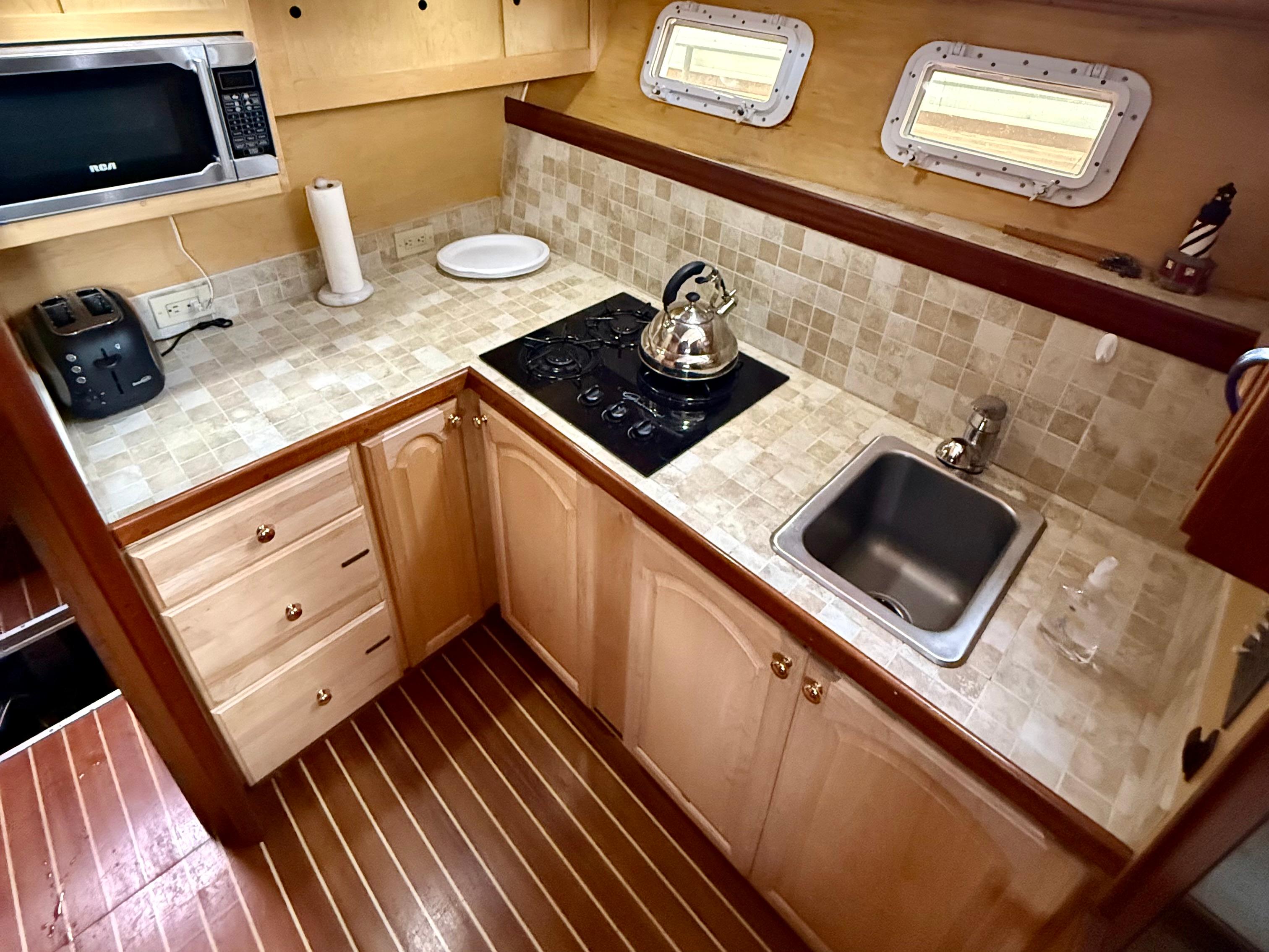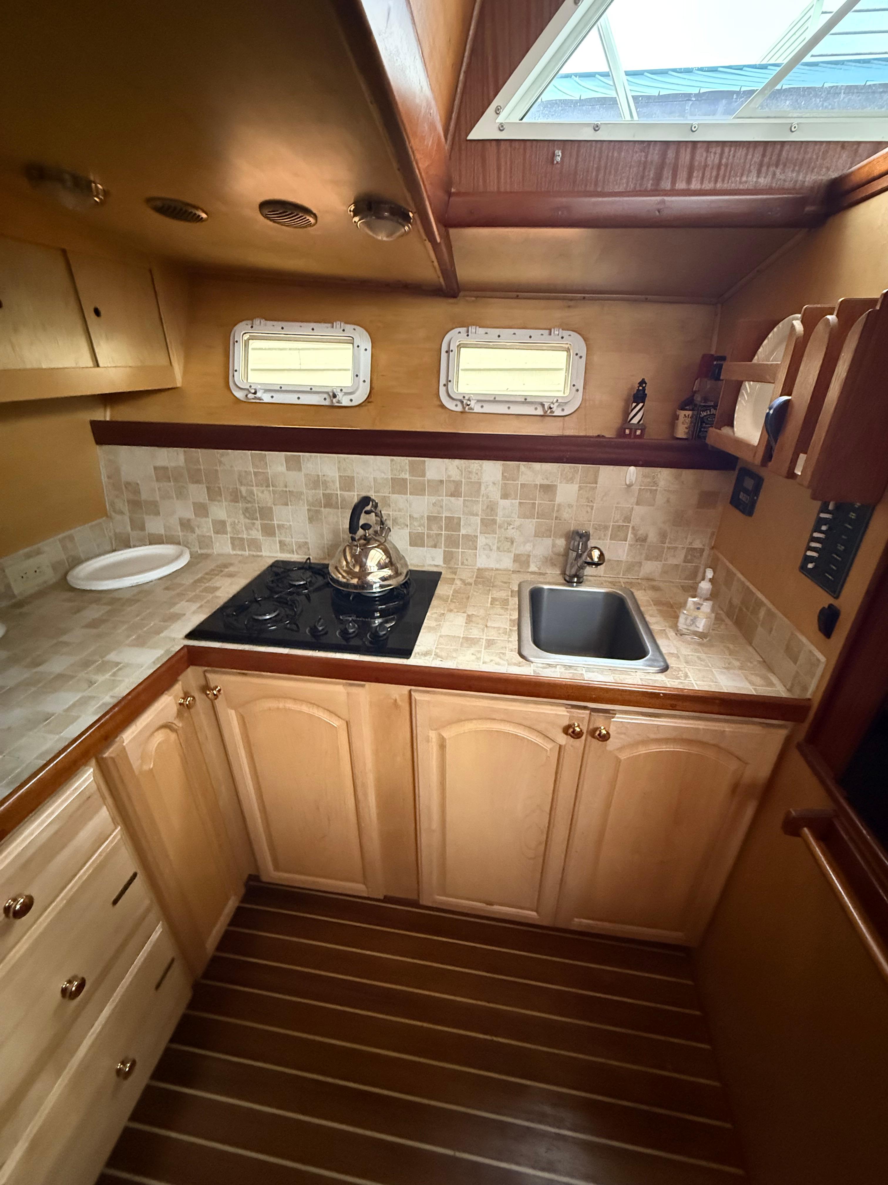 Step below to a salon that’s both expansive and inviting, wrapped in rich mahogany joinery. Whether you’re entertaining guests or relaxing at anchor, there’s room to spread out and enjoy. The forward galley includes a propane cooktop, microwave, and Hisense refrigerator — practical and ready for extended time aboard.