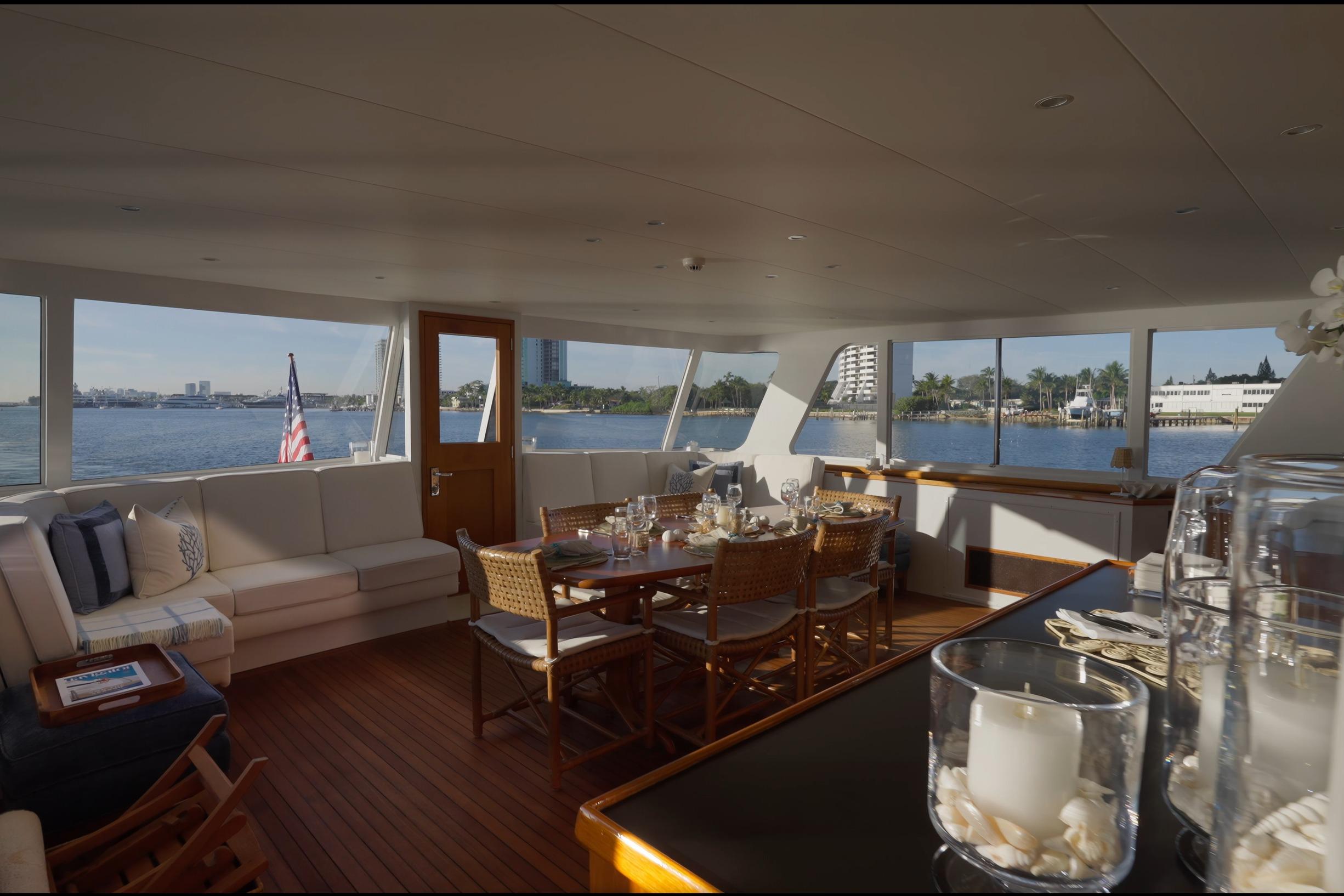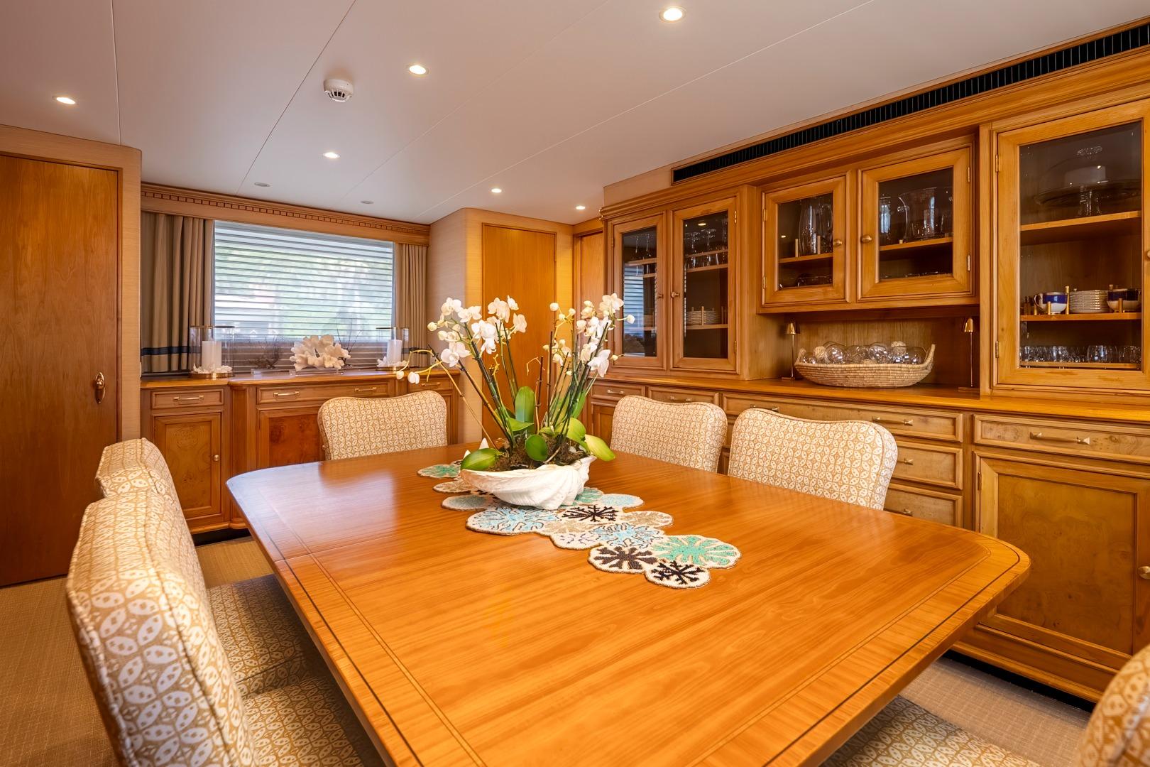 Her interior showcases a balance of traditional craftsmanship and understated contemporary elegance. The spacious main salon features warm butternut walnut joinery, six large windows for natural light, and an inviting mix of comfortable seating. Forward, a private formal dining area for six is surrounded by custom cabinetry. The full-beam galley is designed for professional use, fitted with stainless steel countertops, Wolf and GE appliances, three Samsung refrigerator/freezers, and a Miele dishwasher.