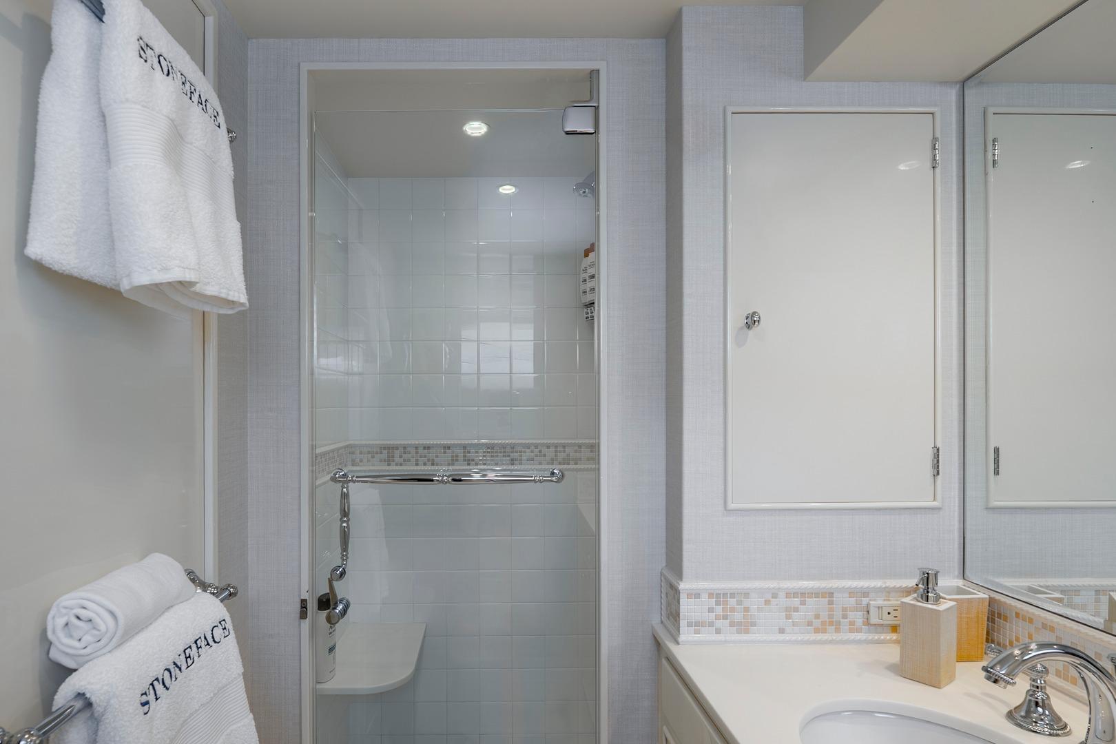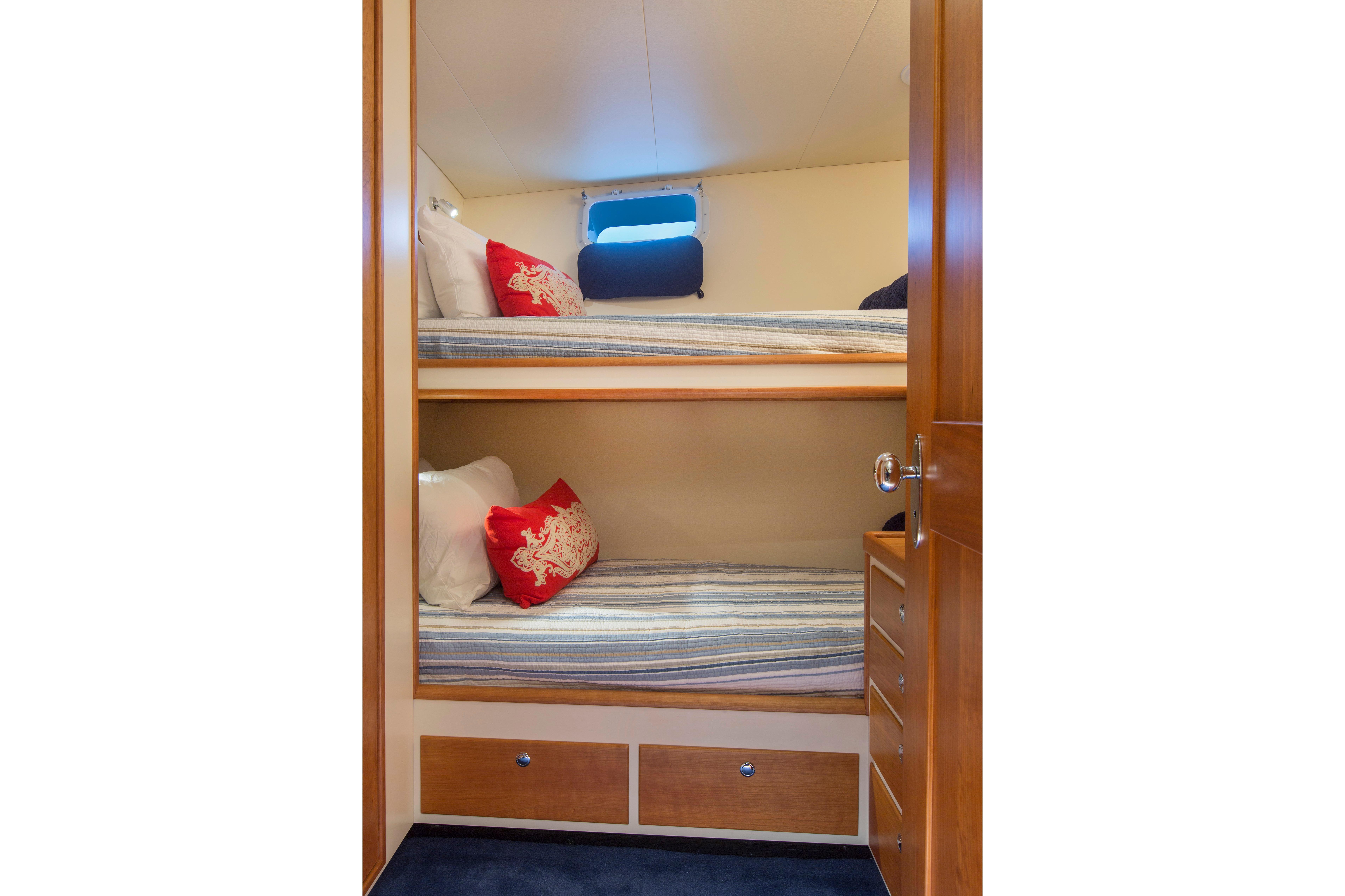 Accommodations for up to eight guests on the lower deck include a full-beam master suite with King size bed aft with generous storage, an en-suite bath, and four portholes that fill the space with natural light. Two identical twin guest cabins forward each offer Pullman berths, en-suite baths, and abundant storage. Crew quarters for up to four (five if there is a couple aboard) are positioned forward and include a large crew mess, laundry,, and direct access to the engine room – ensuring optimal functionality for extended cruising.