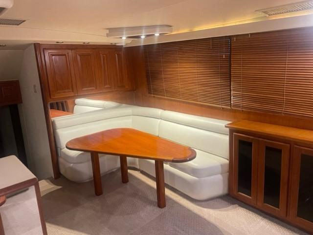 galley is forward, and a teak TV cabinet, wet bar and an L-shaped