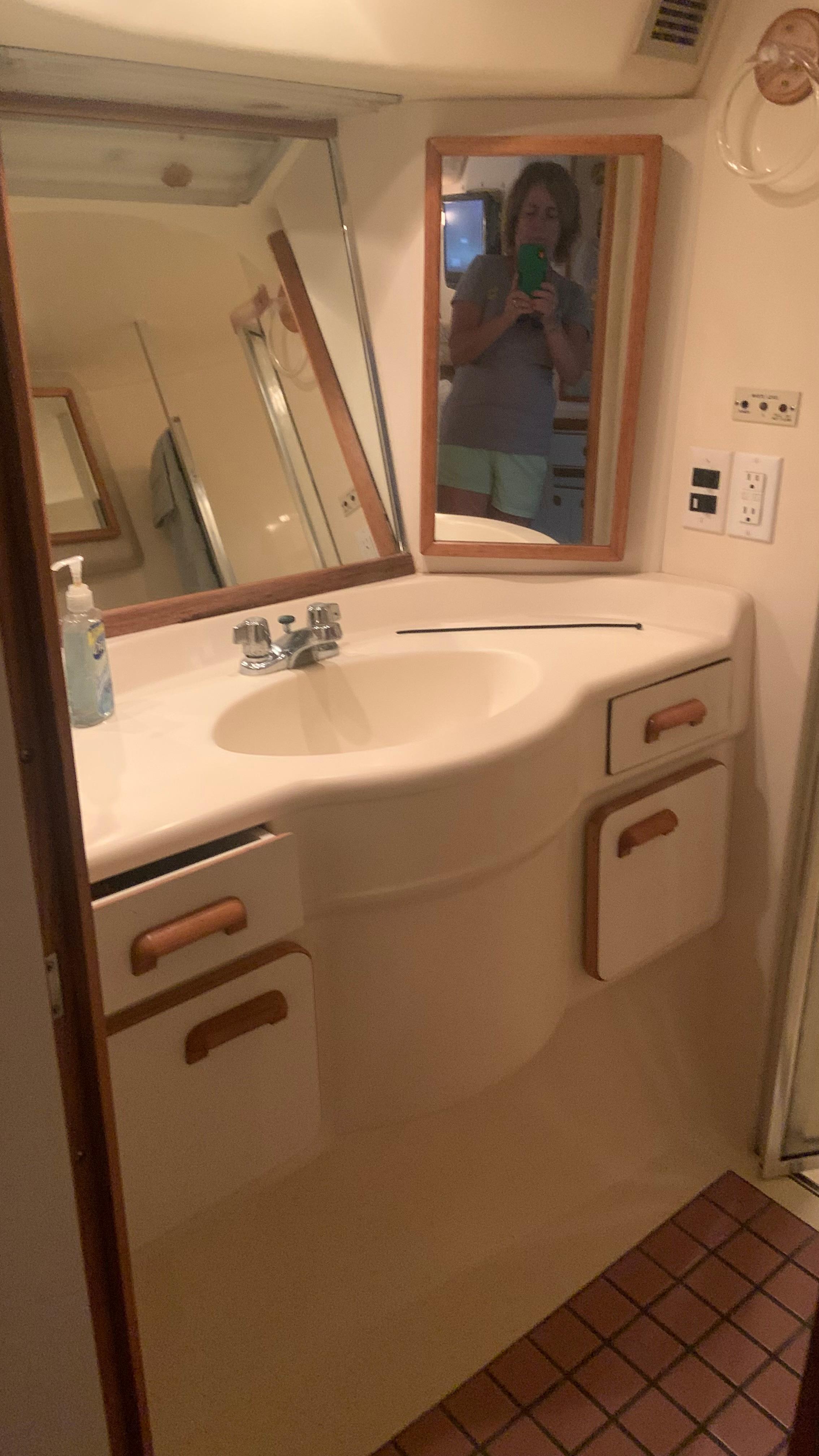 Portside, across from the galley, the guest stateroom includes a double bed with upper berth, cedar hanging locker, and full head with vanity and shower. Forward, a comfortable settee and a queen-size bed in the master stateroom. Cedar-lined hanging lockers with mirrored doors and a large mirrored dresser are included. The en-suite master head has a ceramic tile floor, VacuFlush head, vanity, and shower with a built-in seat.