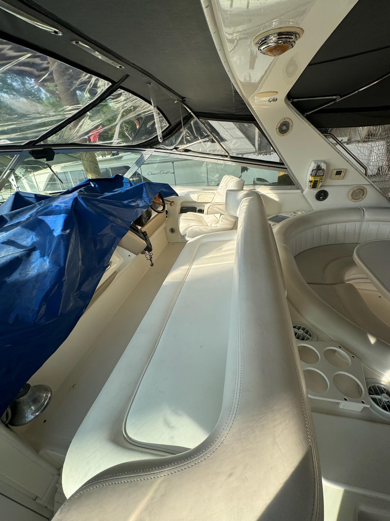 The distinctive Sea Ray 500 Sundancer mid-cabin combines impeccable lines, luxurious comfort, and unconditional seaworthiness. The 500 Sundancer is designed for serious cruising in uncompromised comfort. At the helm station, an adjustable captain’s chair faces a wrap-around instrument console. Adjacent to the swivel helm seat is a large padded bench. The large, open cockpit provides a wet bar for refreshments, comfortable wraparound seating for eight, and a custom-engineered digital cassette stereo system with four speakers and cockpit remote control. Down four steps, the salon features a plush circular sofa with a convertible cocktail table – ottoman which can be raised to form a convenient dining table. An advanced stereo system, featuring cassette and compact disc, is acoustically matched to the interior to provide custom-equalized sound. A custom-built breakfast counter with padded bar stools separates the salon from a fully appointed walk-in galley with refrigerator – freezer, three-burner cooktop, and microwave. Portside, across from the galley, the guest stateroom includes a double bed with upper berth, cedar hanging locker, and full head with vanity and shower. Forward, a comfortable settee and a queen-size bed with custom designed sheets and bedspread grace the master stateroom. Cedar-lined hanging lockers with mirrored doors and a large mirrored dresser are included. The en-suite master head has a ceramic tile floor, VacuFlush head, vanity, and shower with a built-in seat.