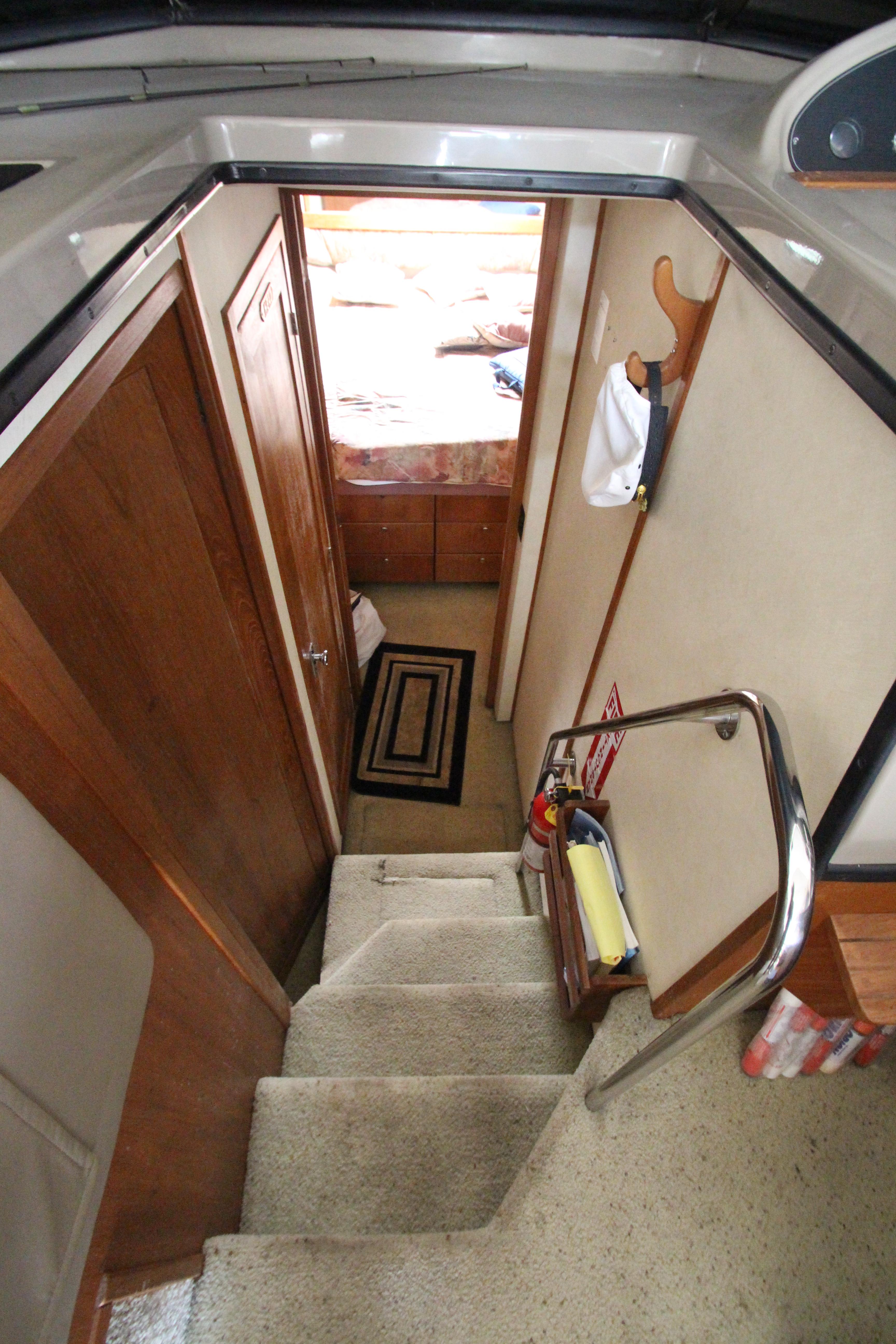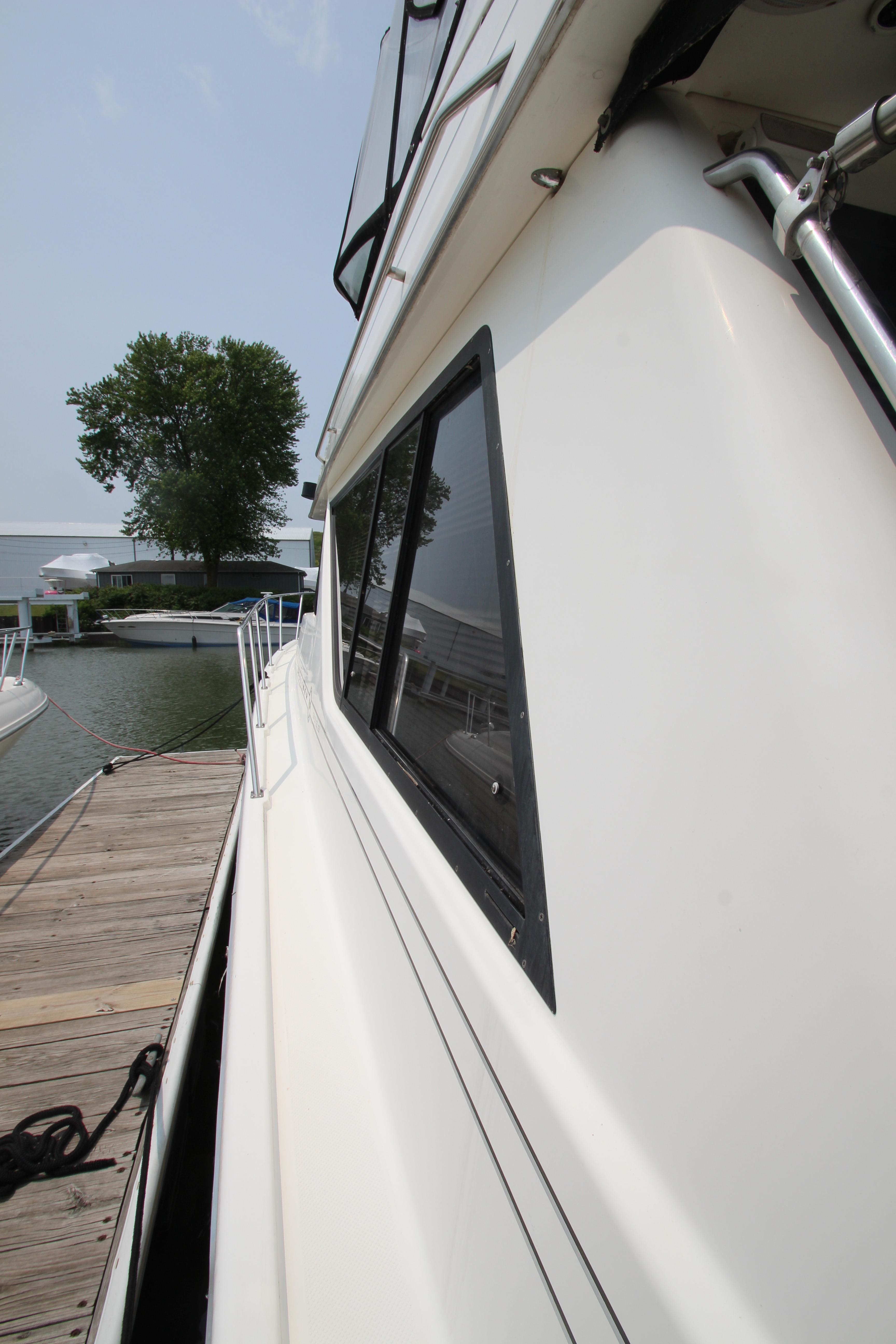 transom door, port and starboard cockpit steps, wide side decks, and a comfortable flybridge with seating for six. Most 3988s were delivered with twin Cummins diesels with 315 horsepower.Cummins diesels cruise in