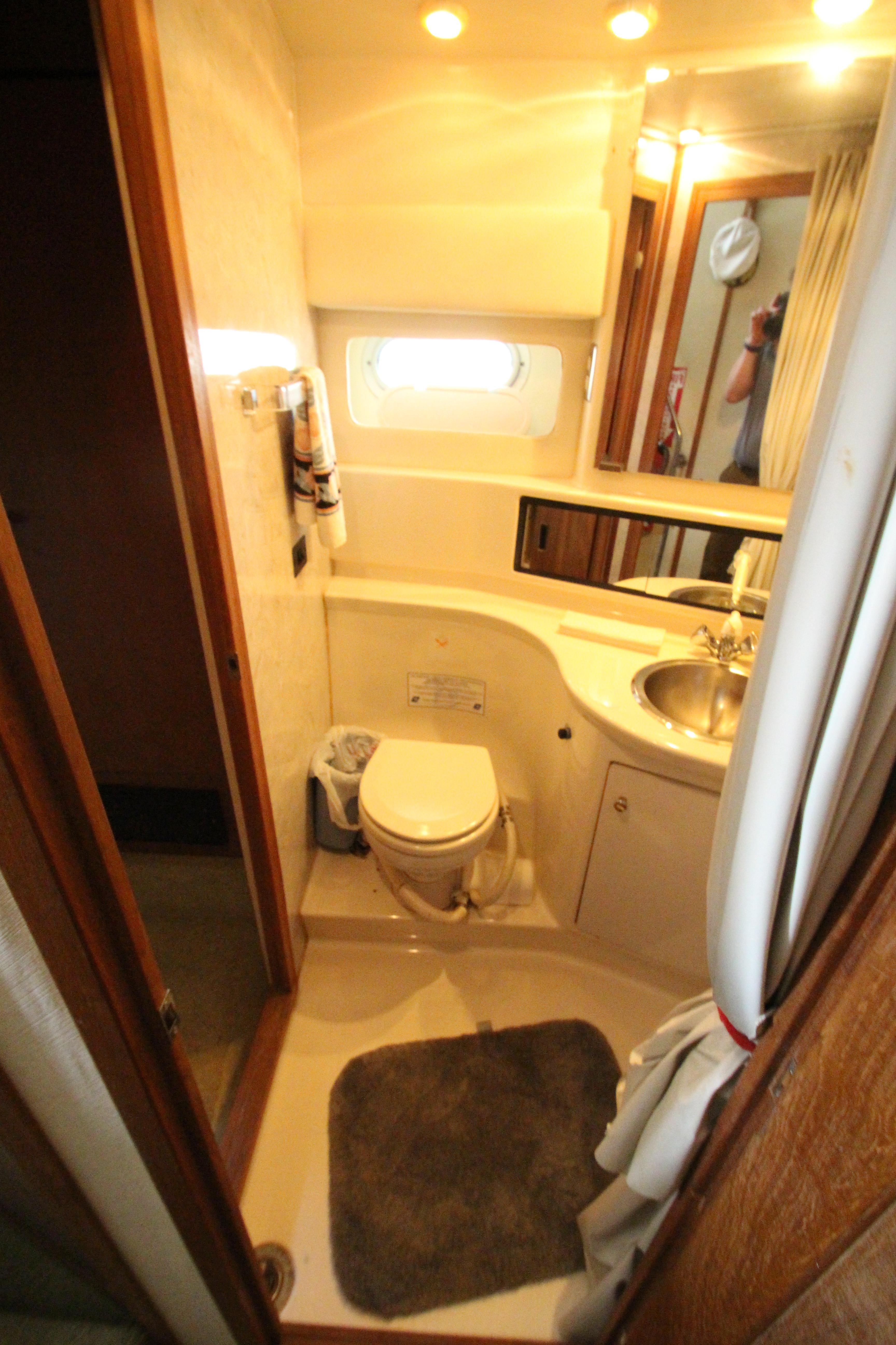 Vessel is equipped with two heads with push-button electric flush; both heads have showers and one has an enclosed shower with a full bathtub.