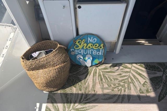 Flybridge offers helm seating for captain and guests, with full instrumentation including GPS, VHF radio, depth sounder, and autopilot. The aft deck is ideal for al fresco dining, with easy access to the swim platform for water activities. Eisenglass full enclosure for weather protection.