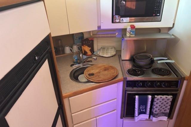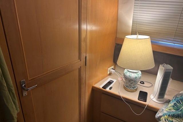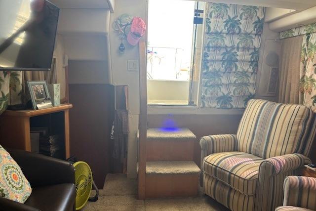 This vessel has a bright, airy salon with comfortable seating, a convertible dinette, and panoramic windows for excellent visibility. The full galley is equipped with a refrigerator/freezer, microwave, electric stove, and ample storage – perfect for entertaining. Aft Master Stateroom: Queen berth, private head with separate stall shower, flat screen TV, hanging lockers, and vanity.