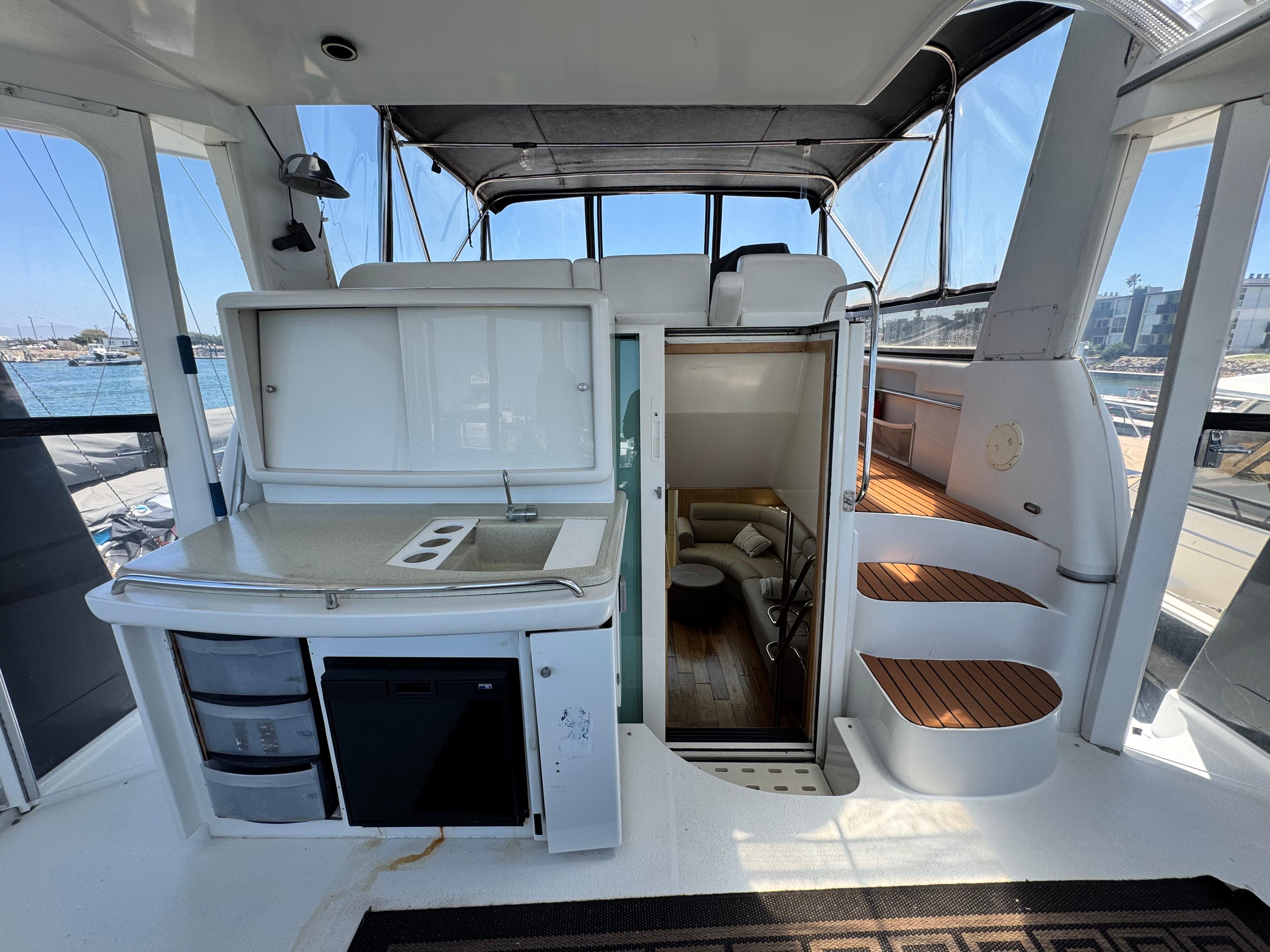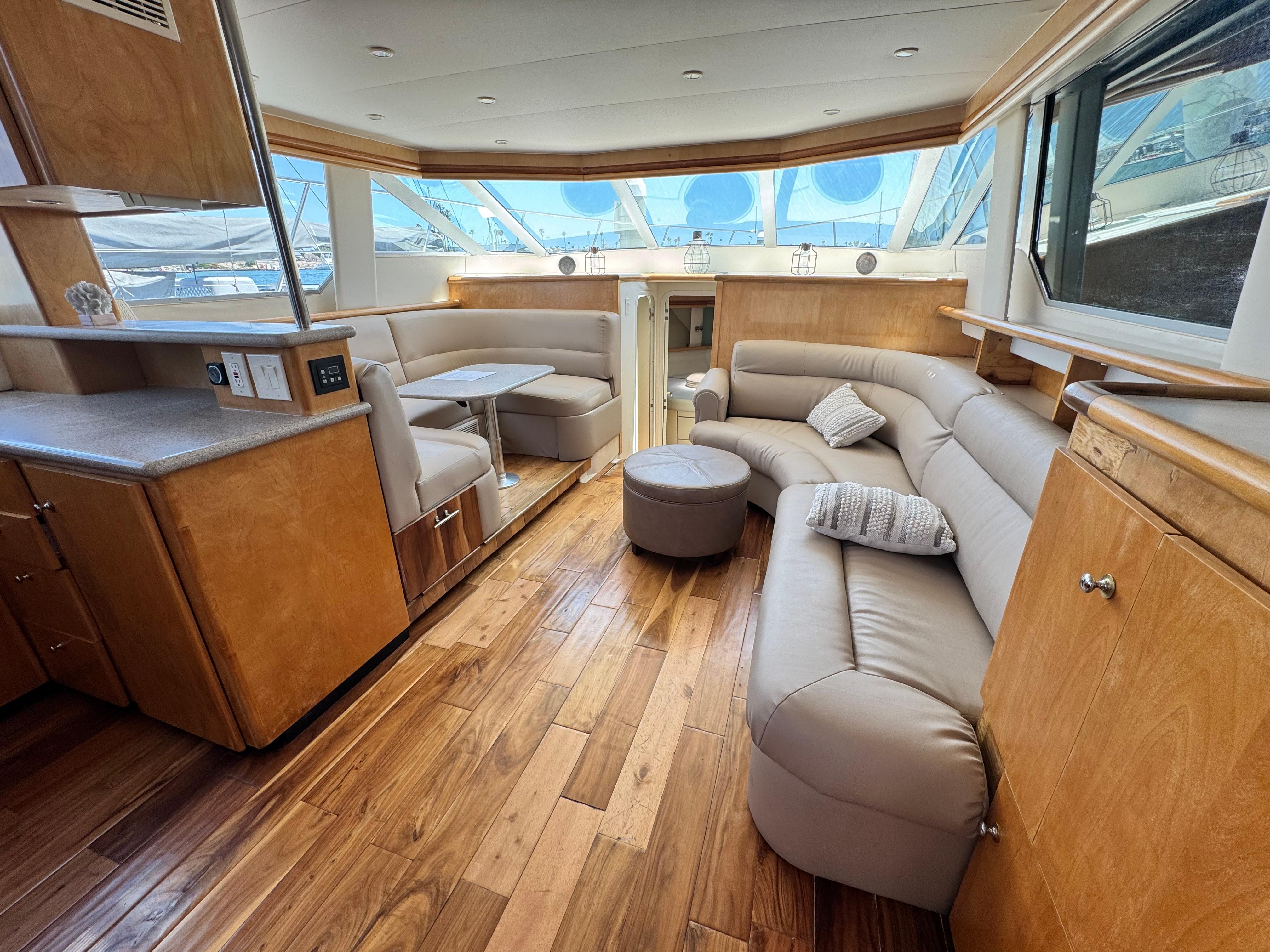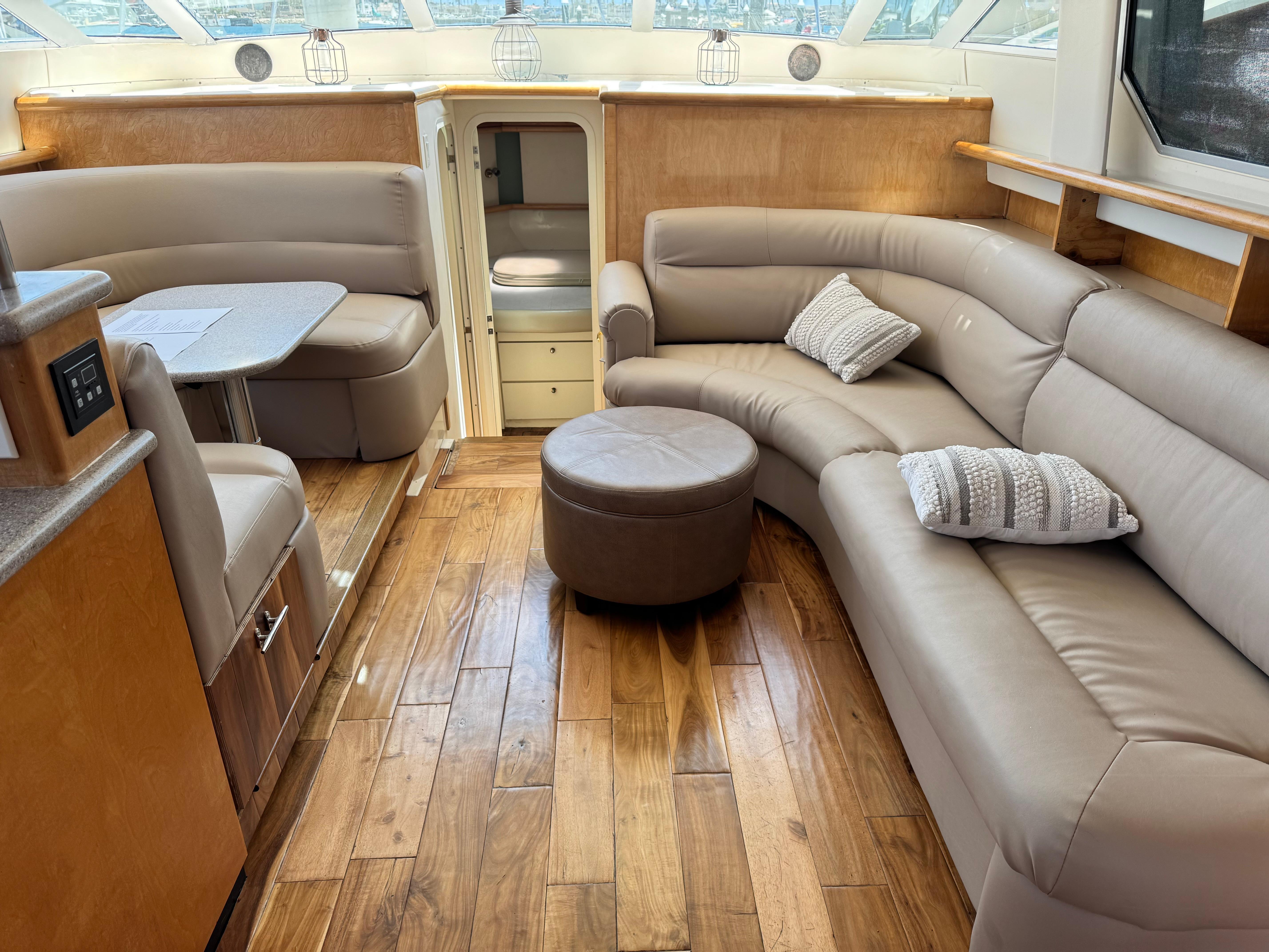 Extensive work has been completed on the boat in recent months, including a remodeled interior with all-new leather upholstery. The interior wood has been sanded and varnished. Additional upgrades include a new refrigerator and new kitchen tiling.