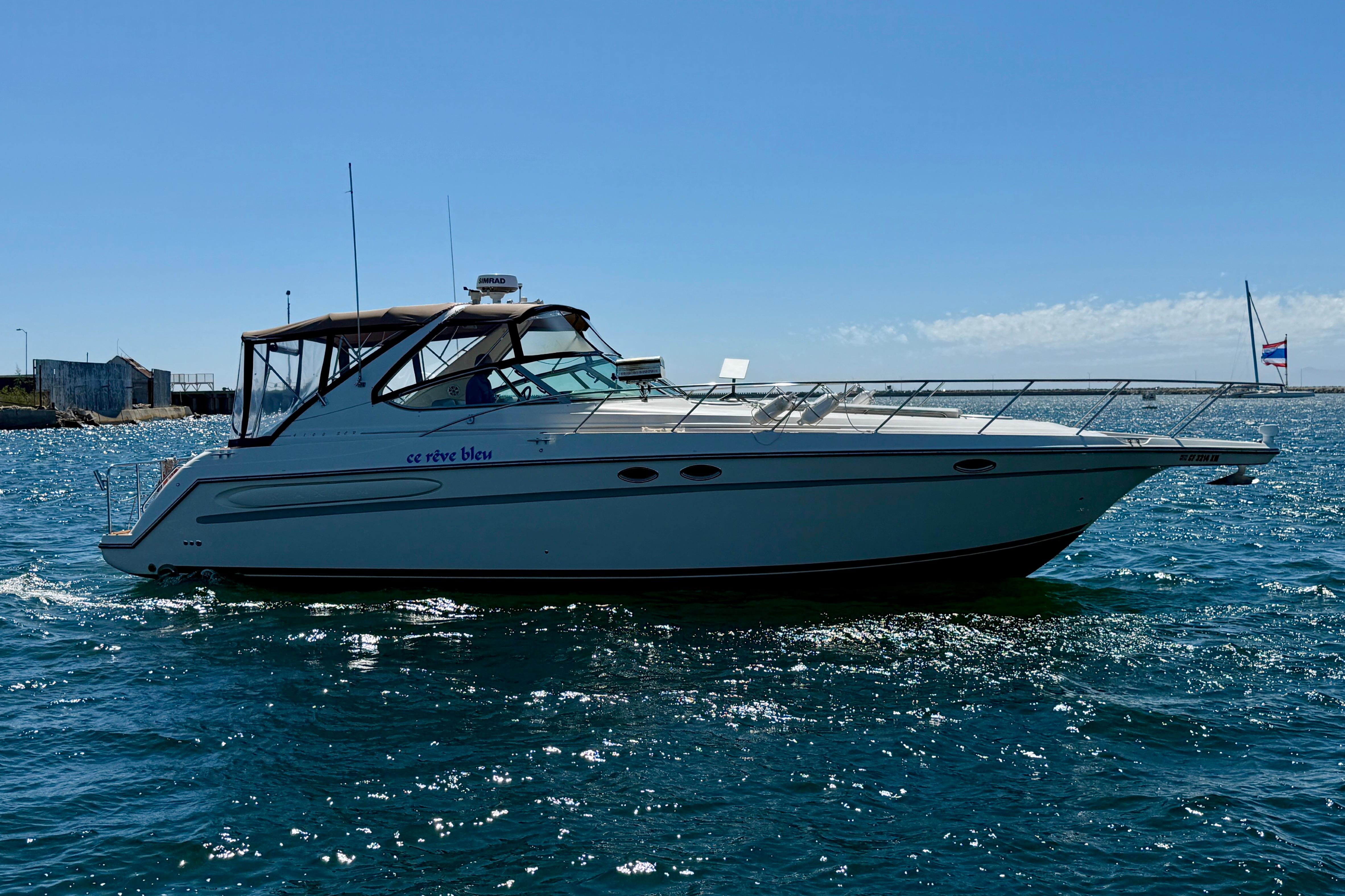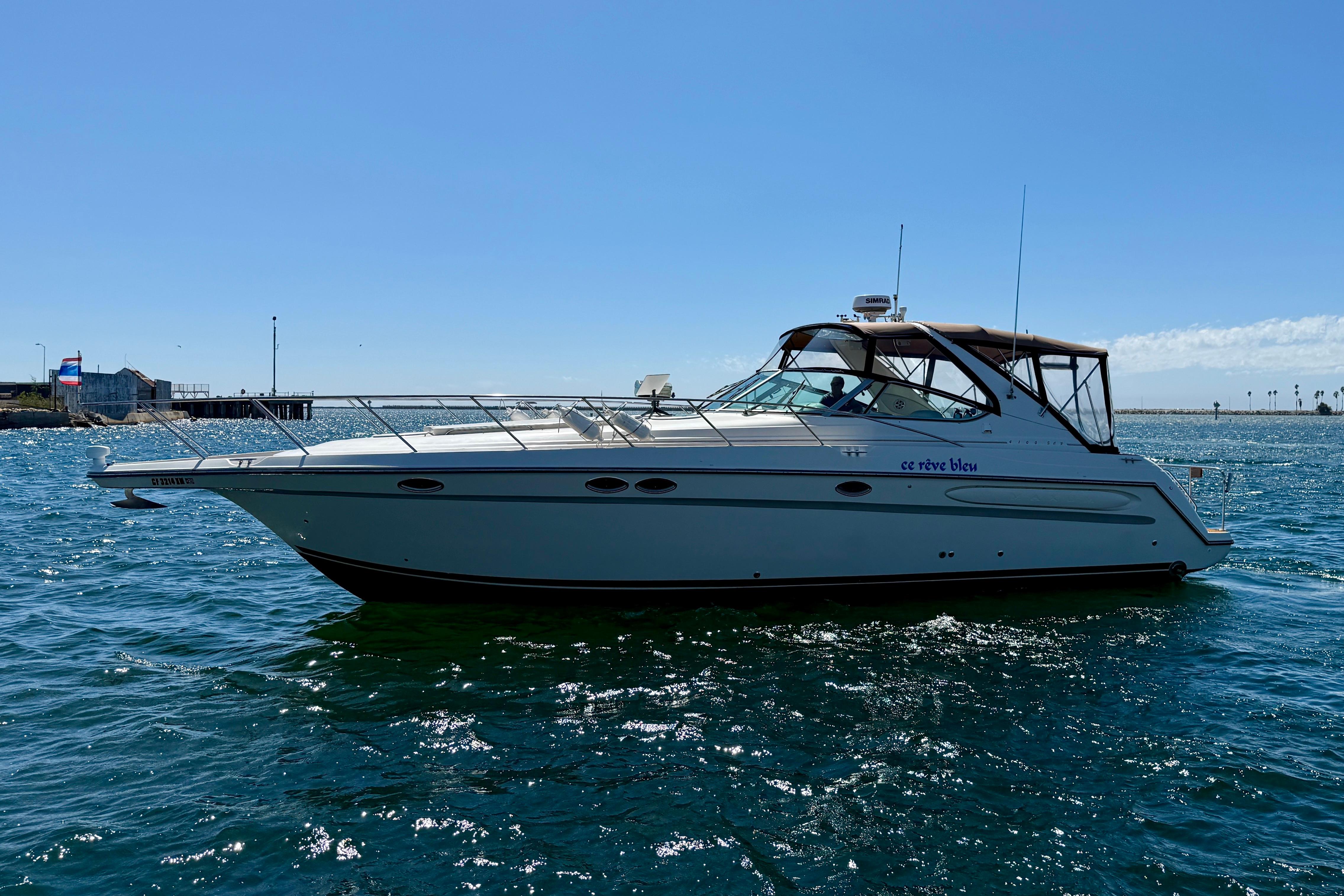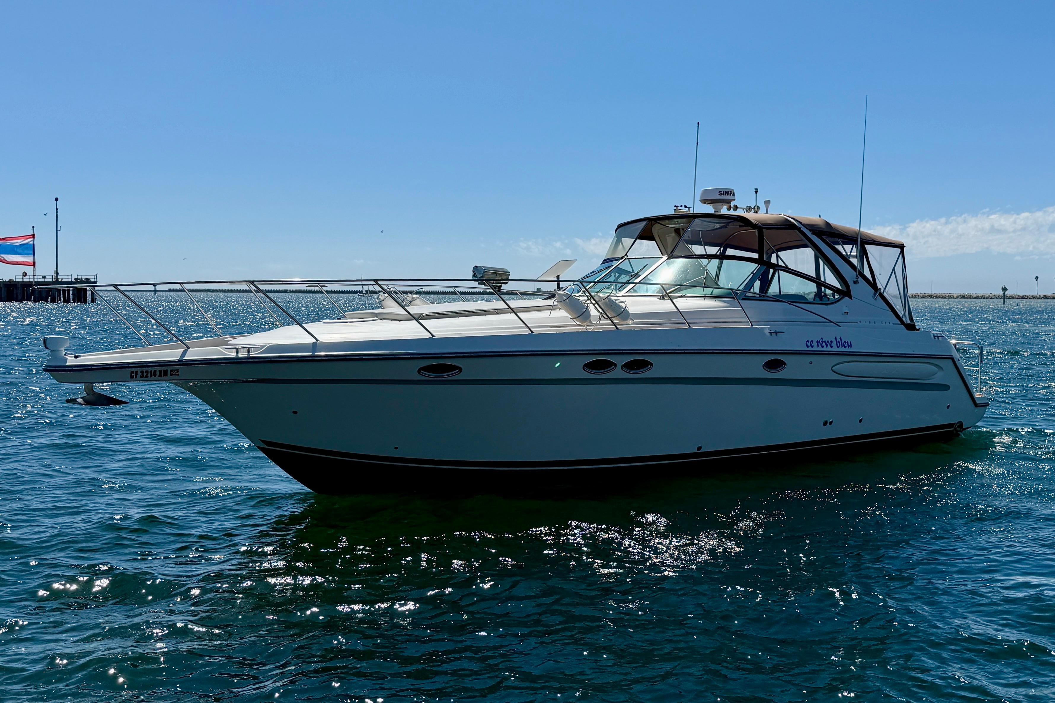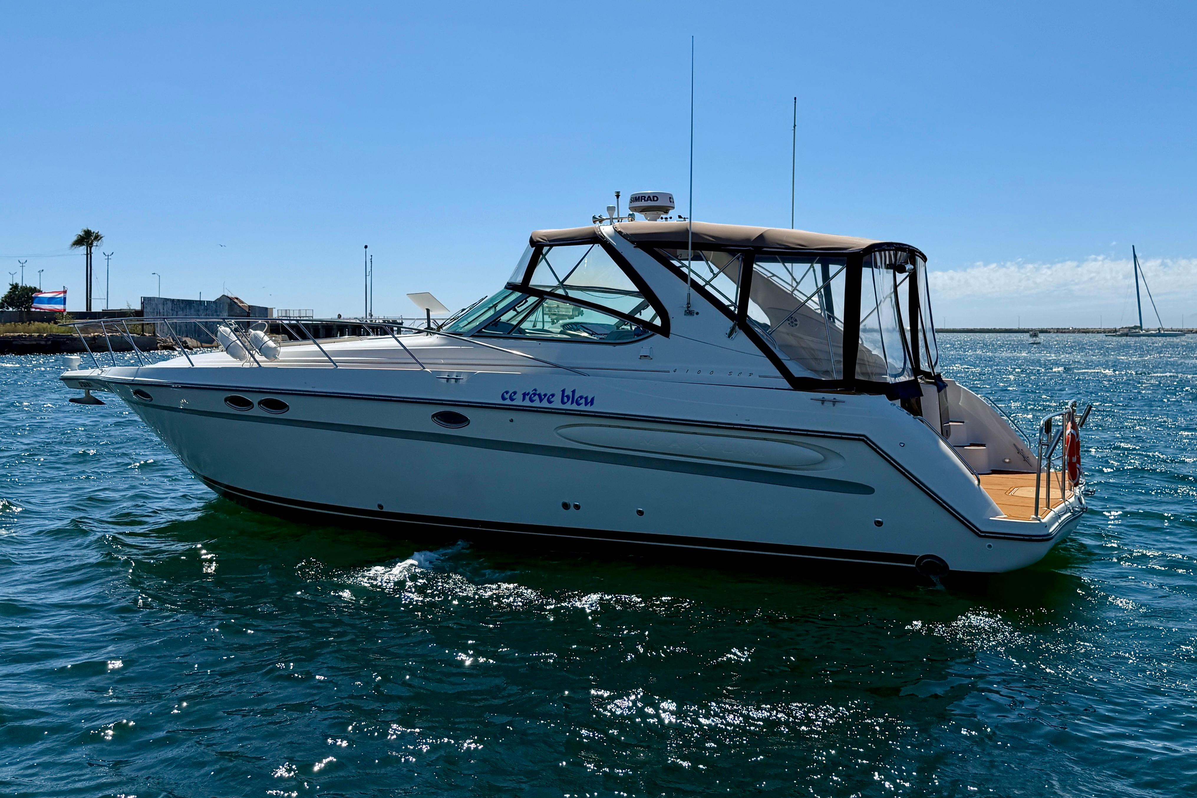 Introducing “Ce Reve Bleu”, a 1997 Maxum 4100 SCR, a remarkable express cruiser that seamlessly blends performance and comfort. This vessel boasts a sleek fiberglass hull designed for both stability and elegance. The seller has had her managed by a professional yacht management company