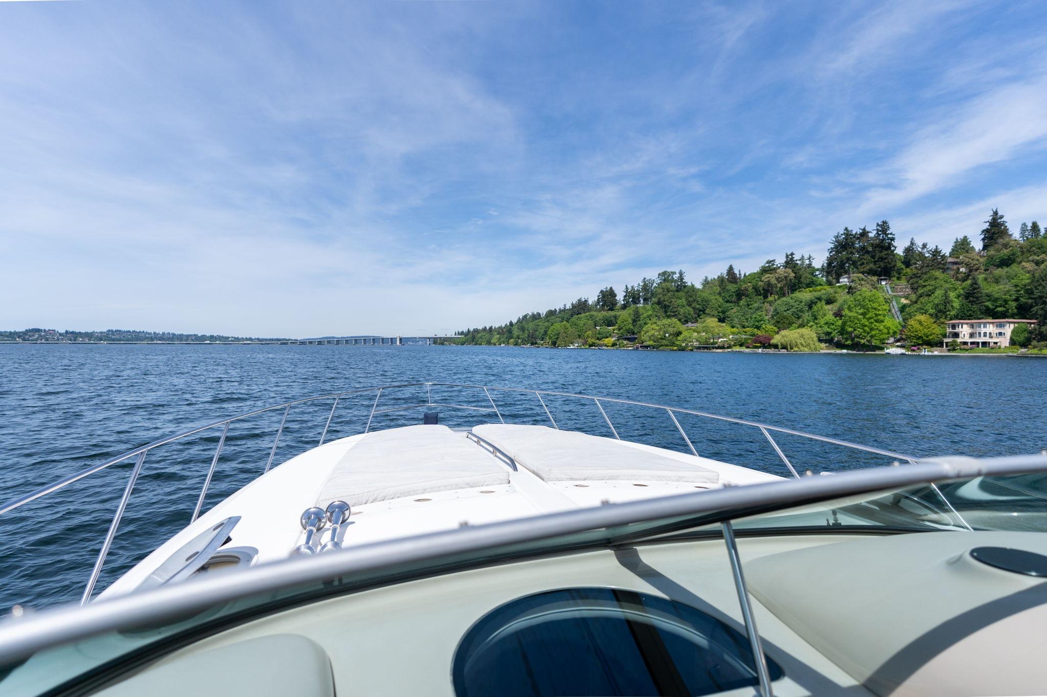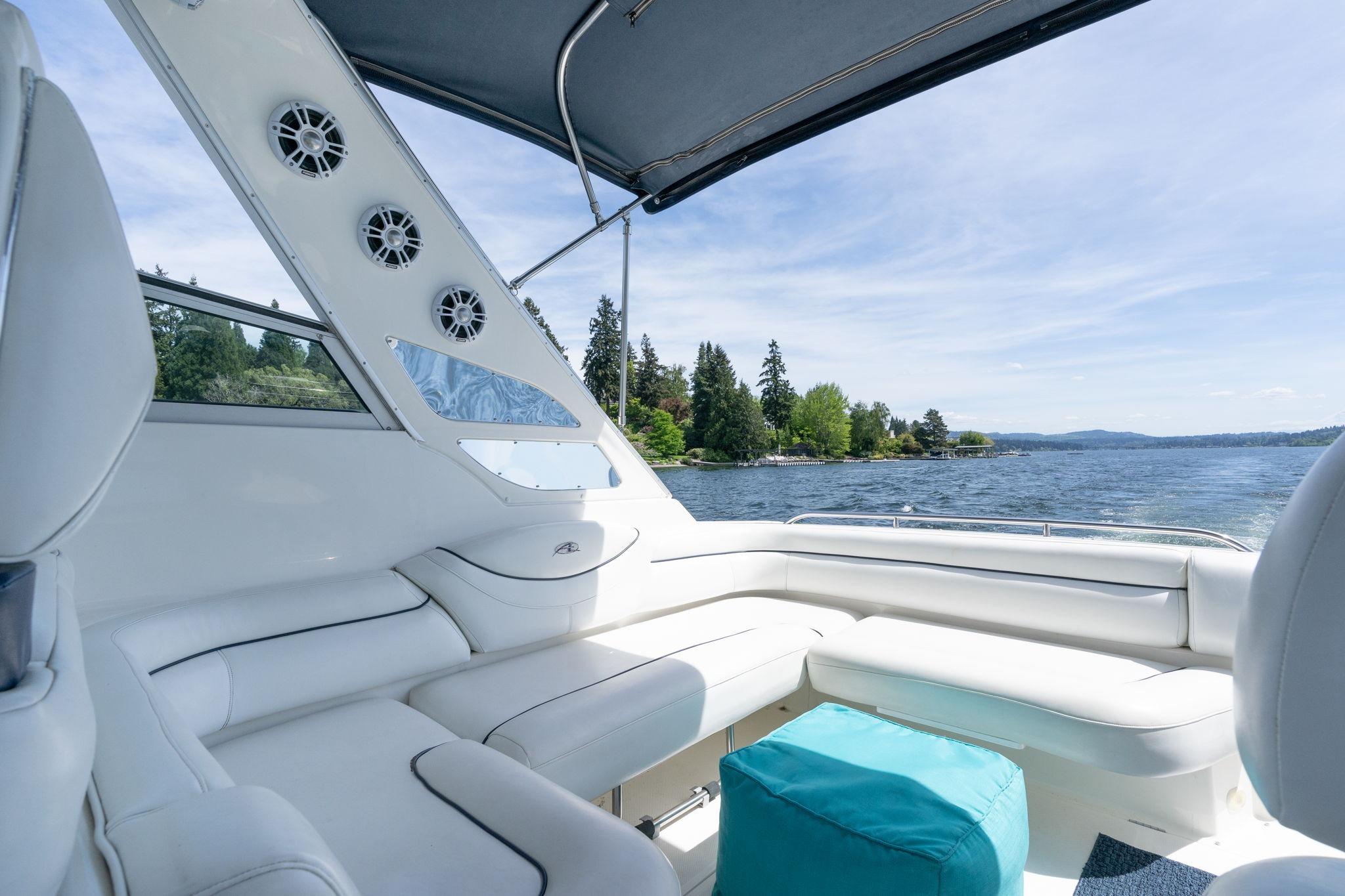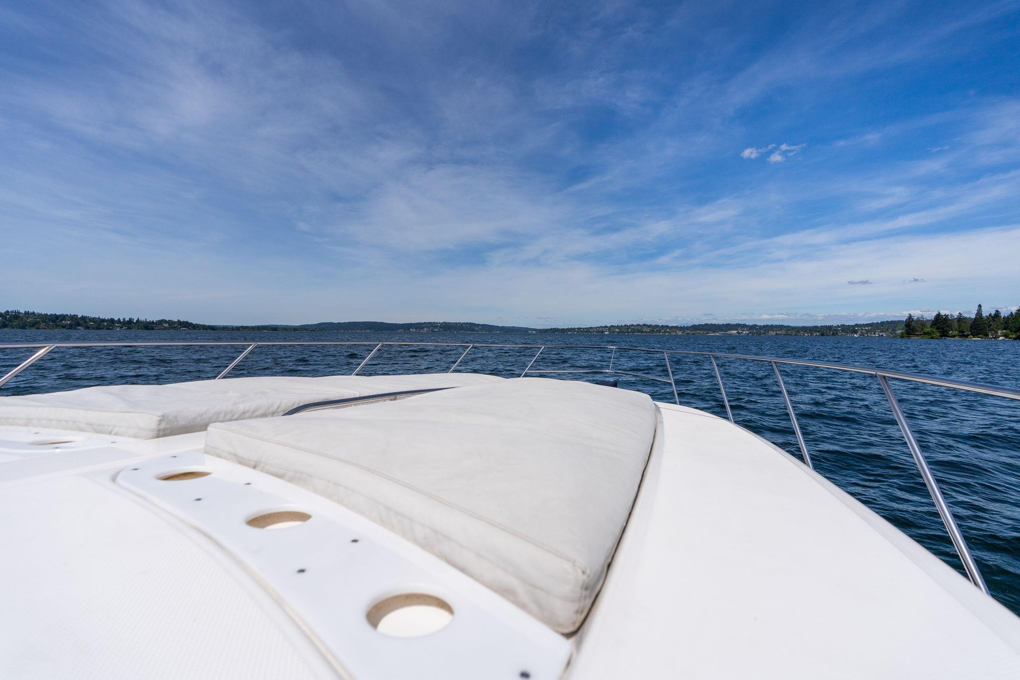 Huge open cockpit area with forward tilted radar arch and large wrap around windshield. Huge flat bow area. Does need a missing sunpad but a great area to relax and lay out or seat up to 10 guests!
