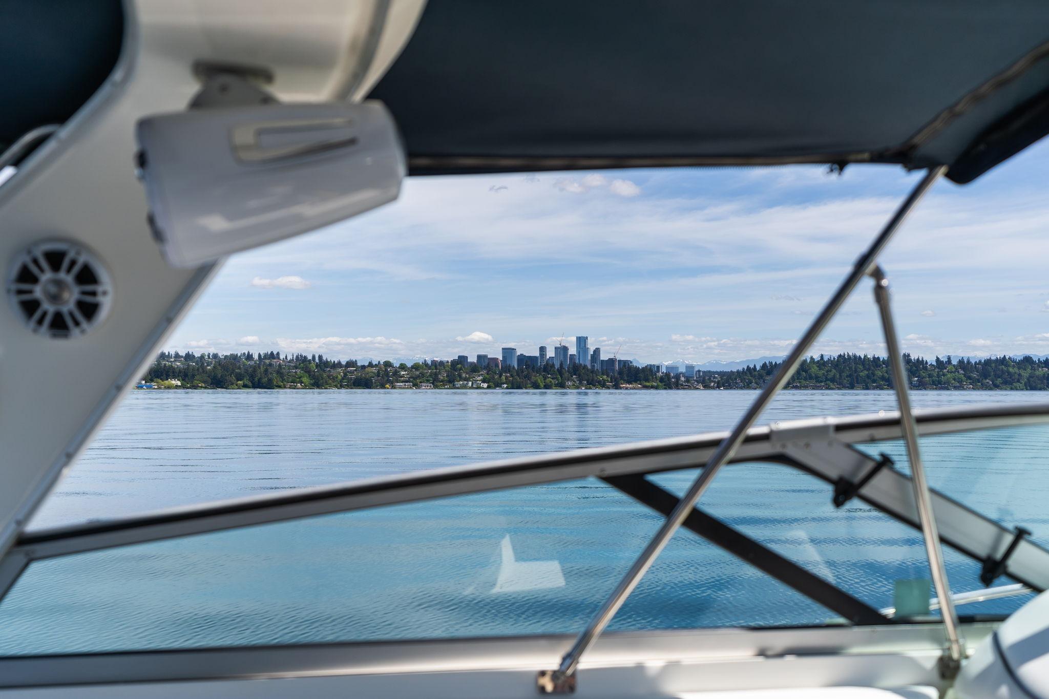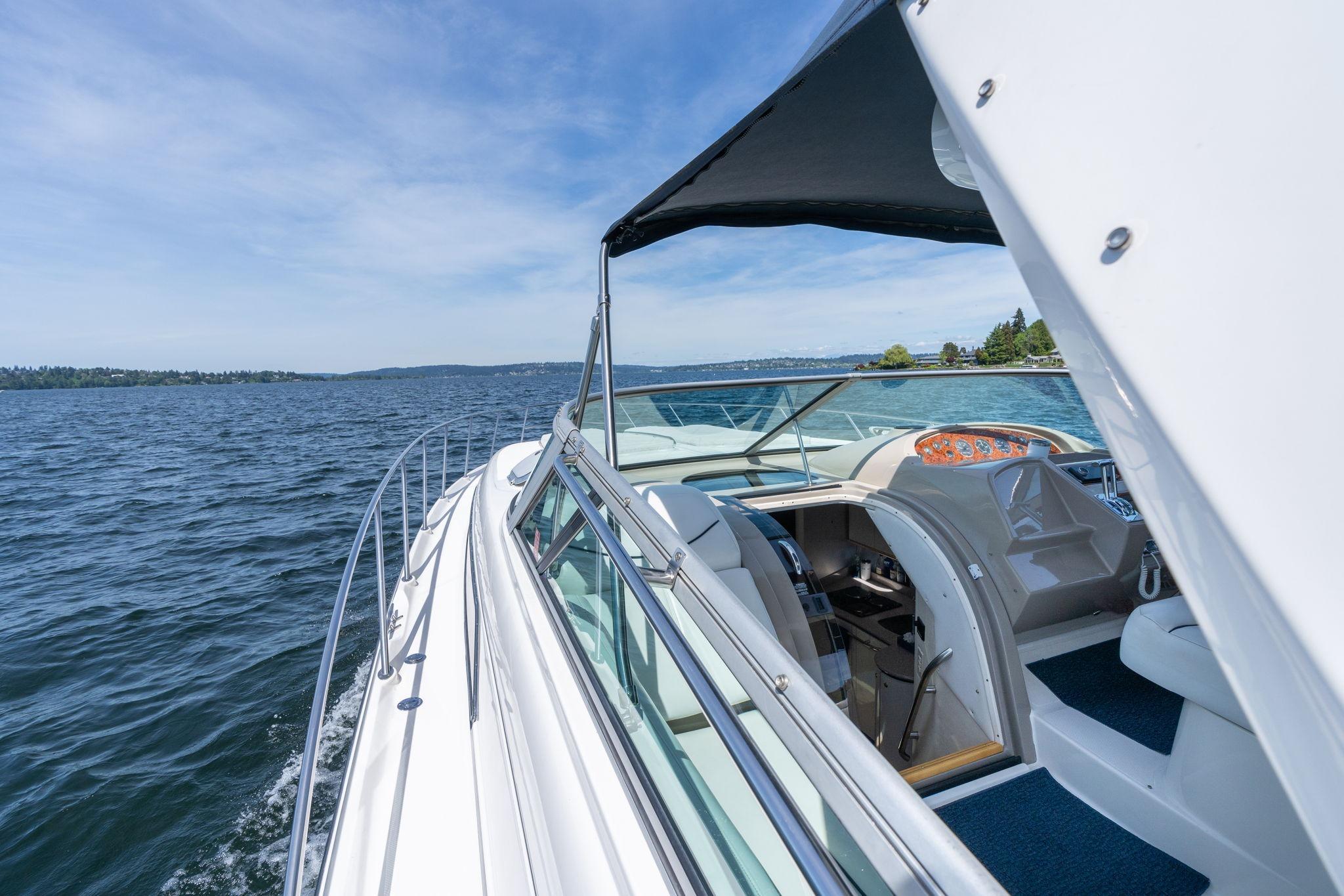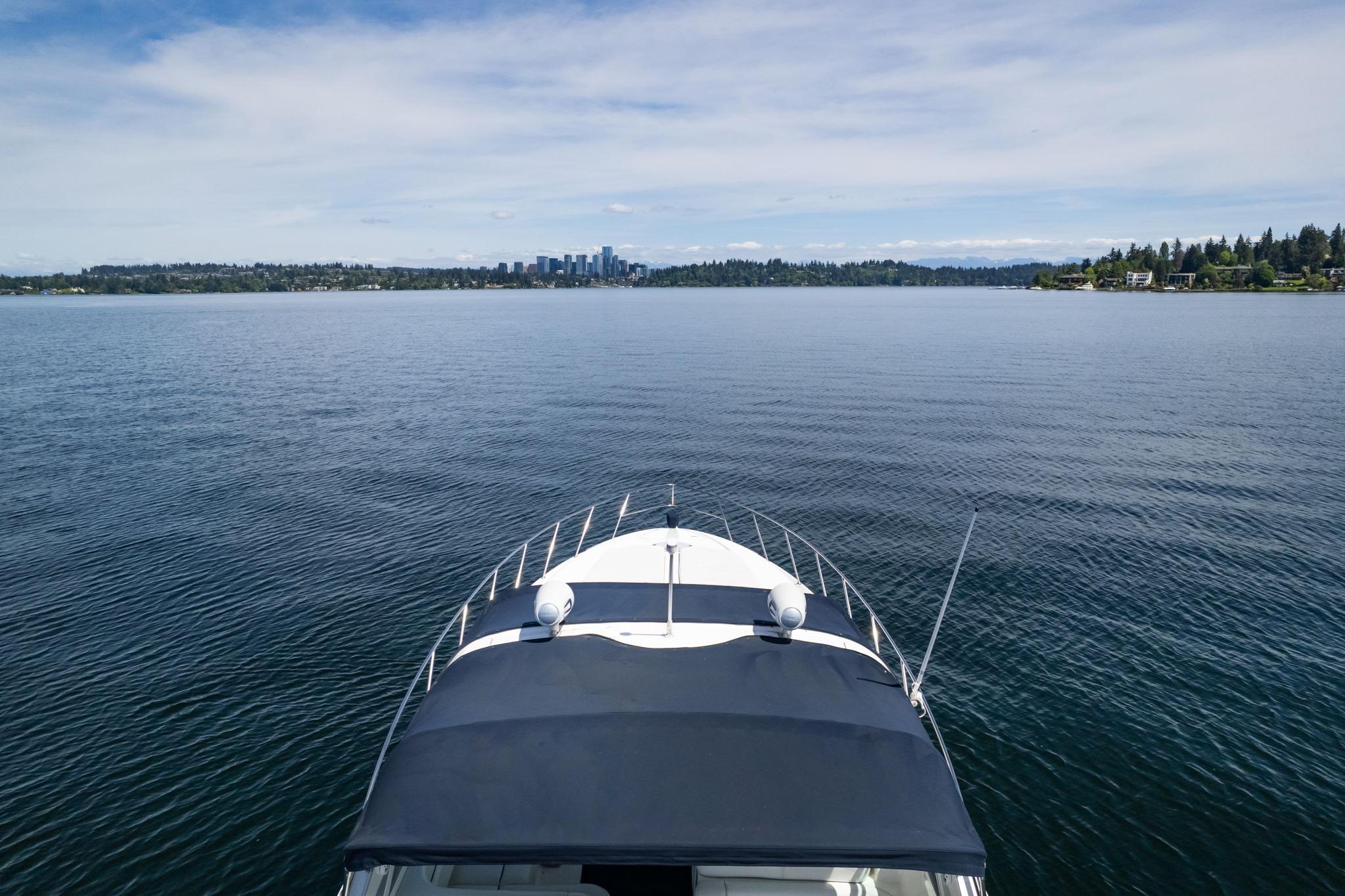 Huge open cockpit area with forward tilted radar arch and large wrap around windshield. Huge flat bow area. Does need a missing sunpad but a great area to relax and lay out or seat up to 10 guests!