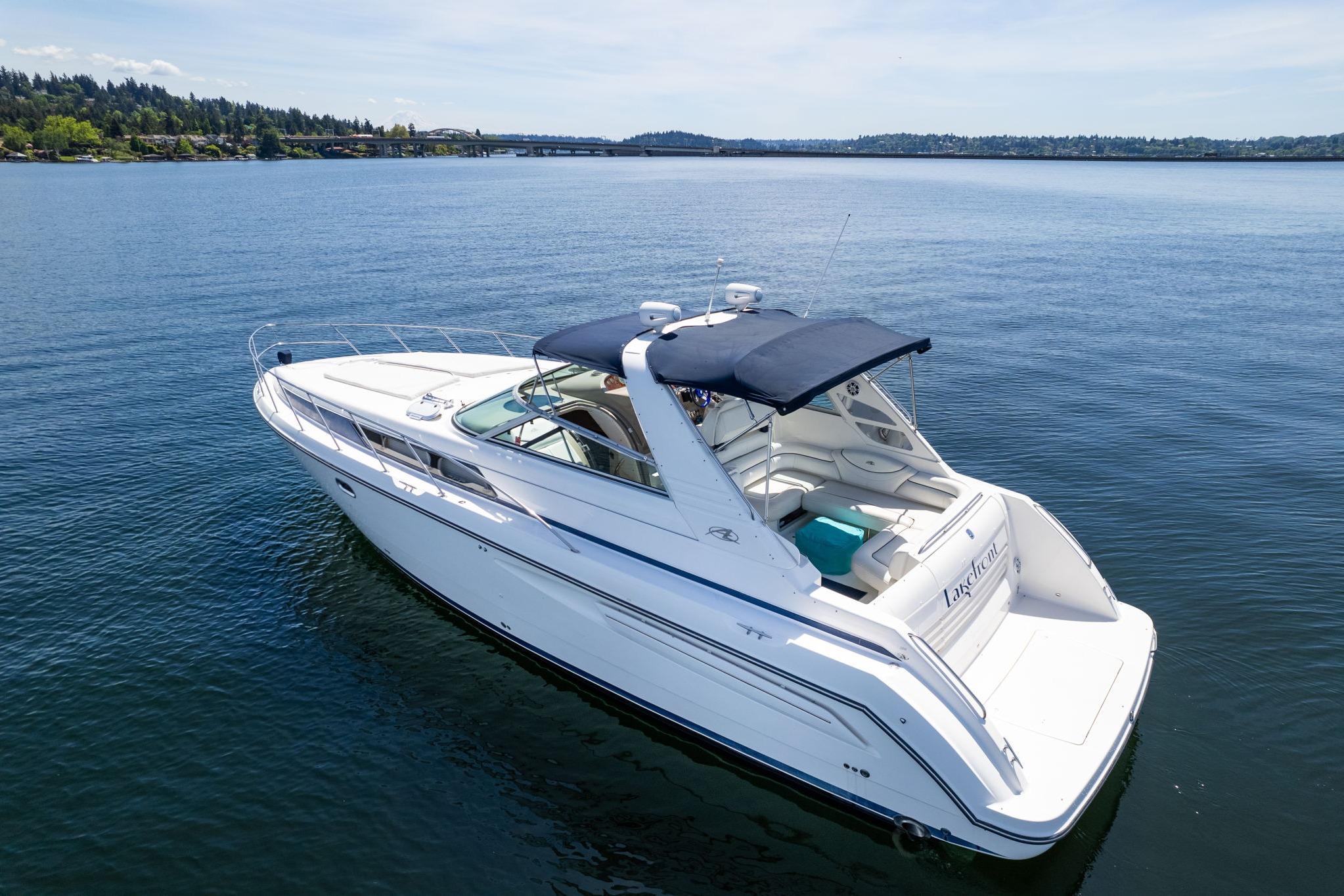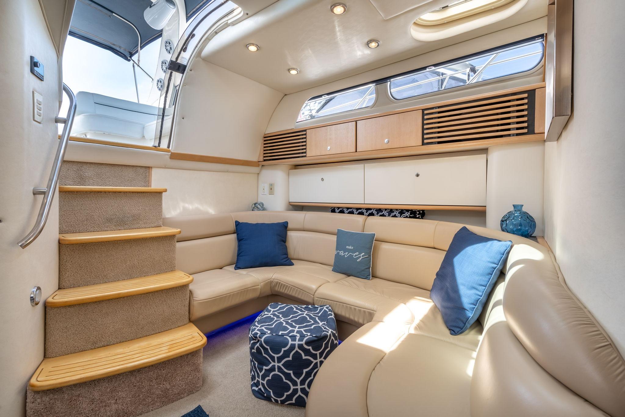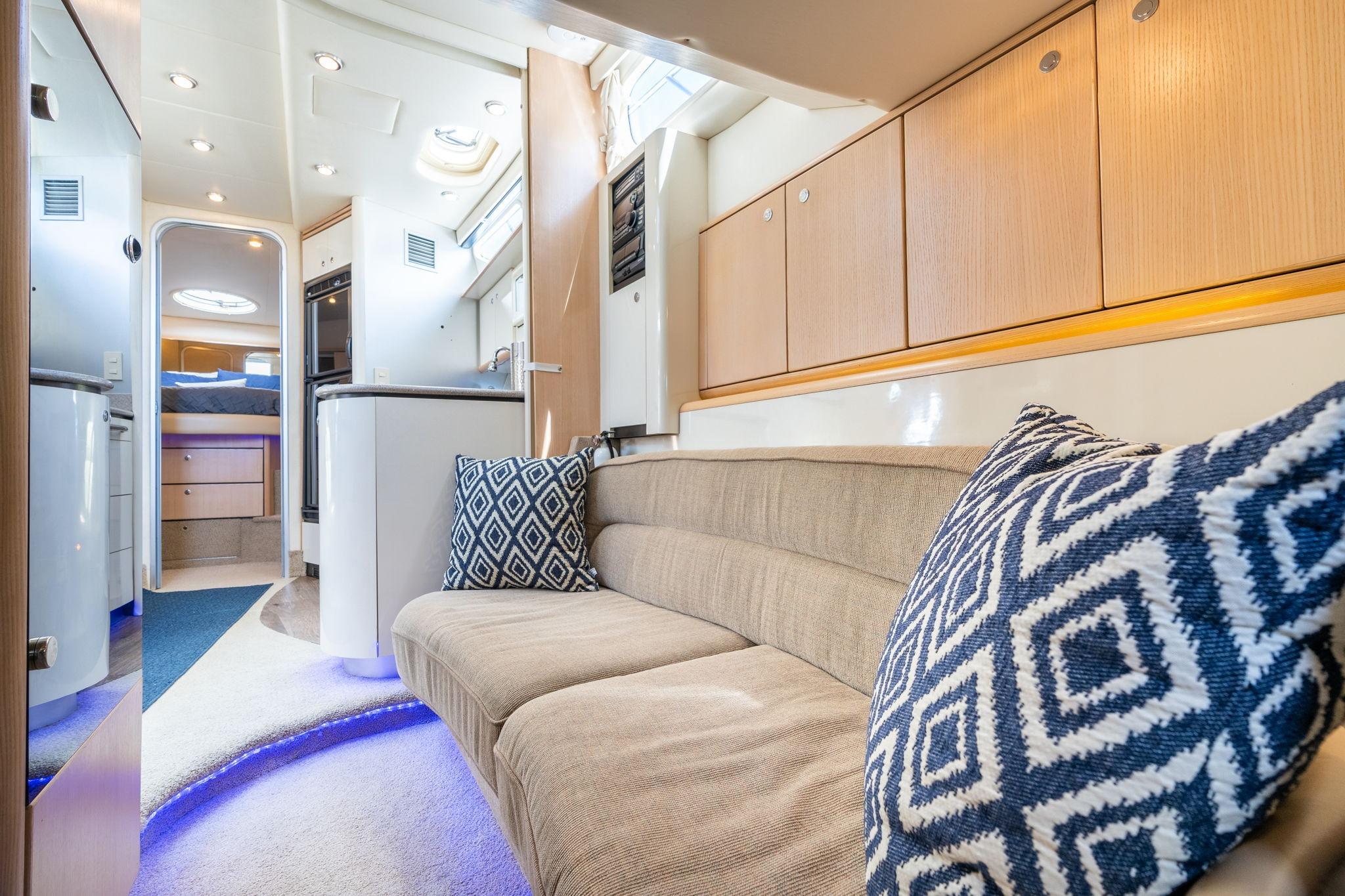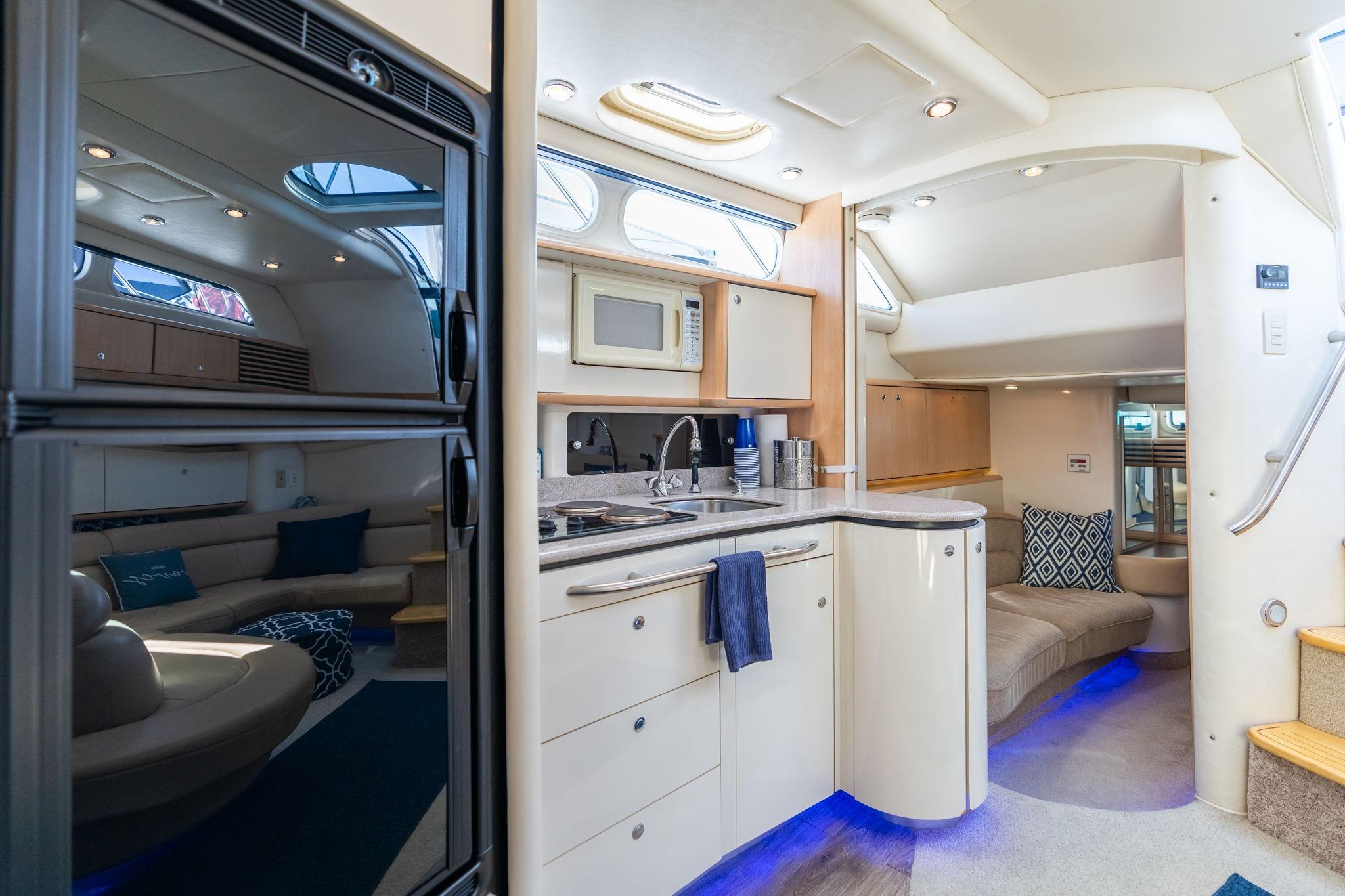 Large galley with near full sized refridgerator is a rare find, 2 queen sized berths, front master stateroom and shared bath with enclosed stand up shower. Rear queen 2nd berth with sitting area, large u shaped lounge with table (I have removed the table in my boat for a more open feel)