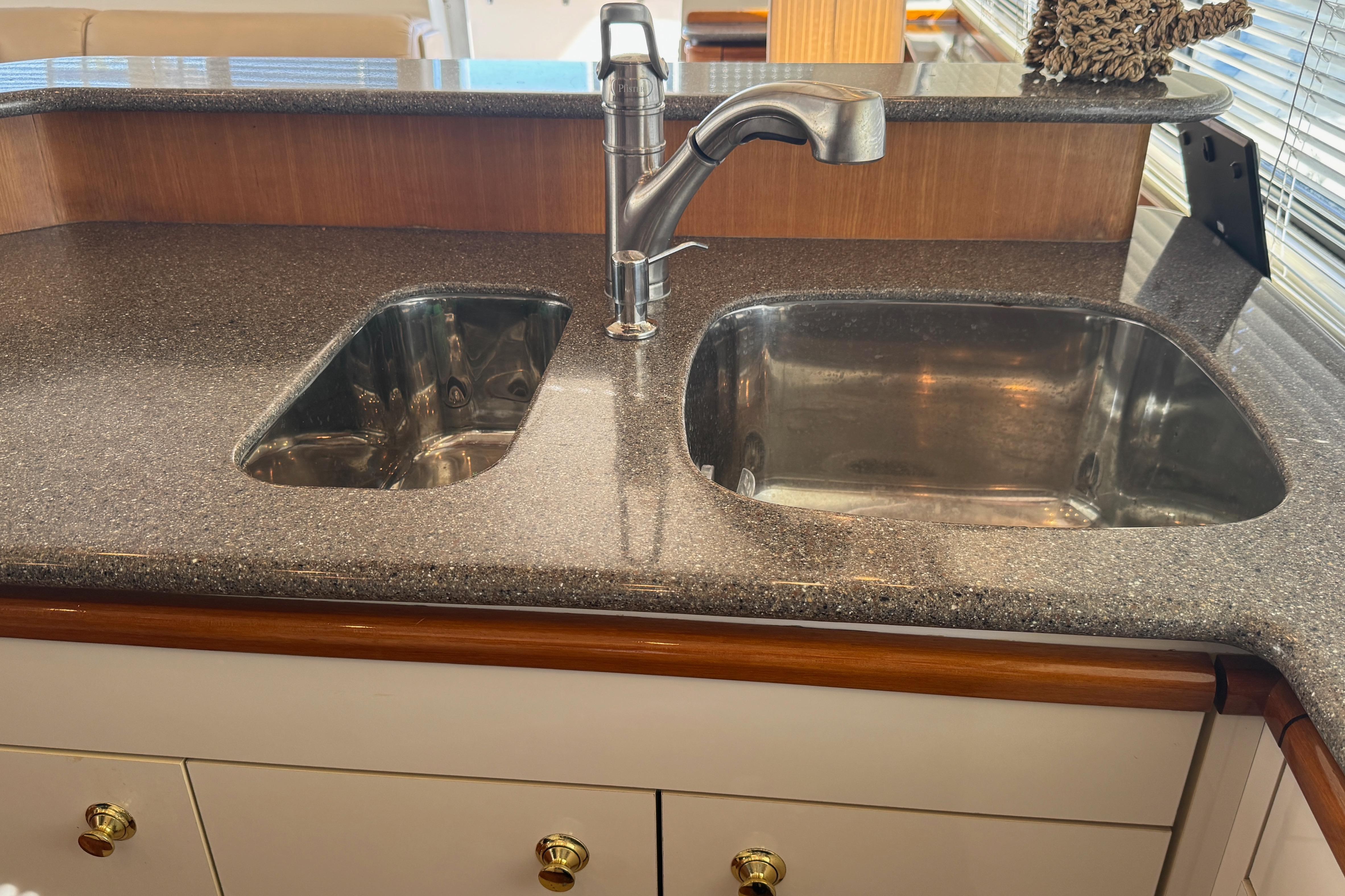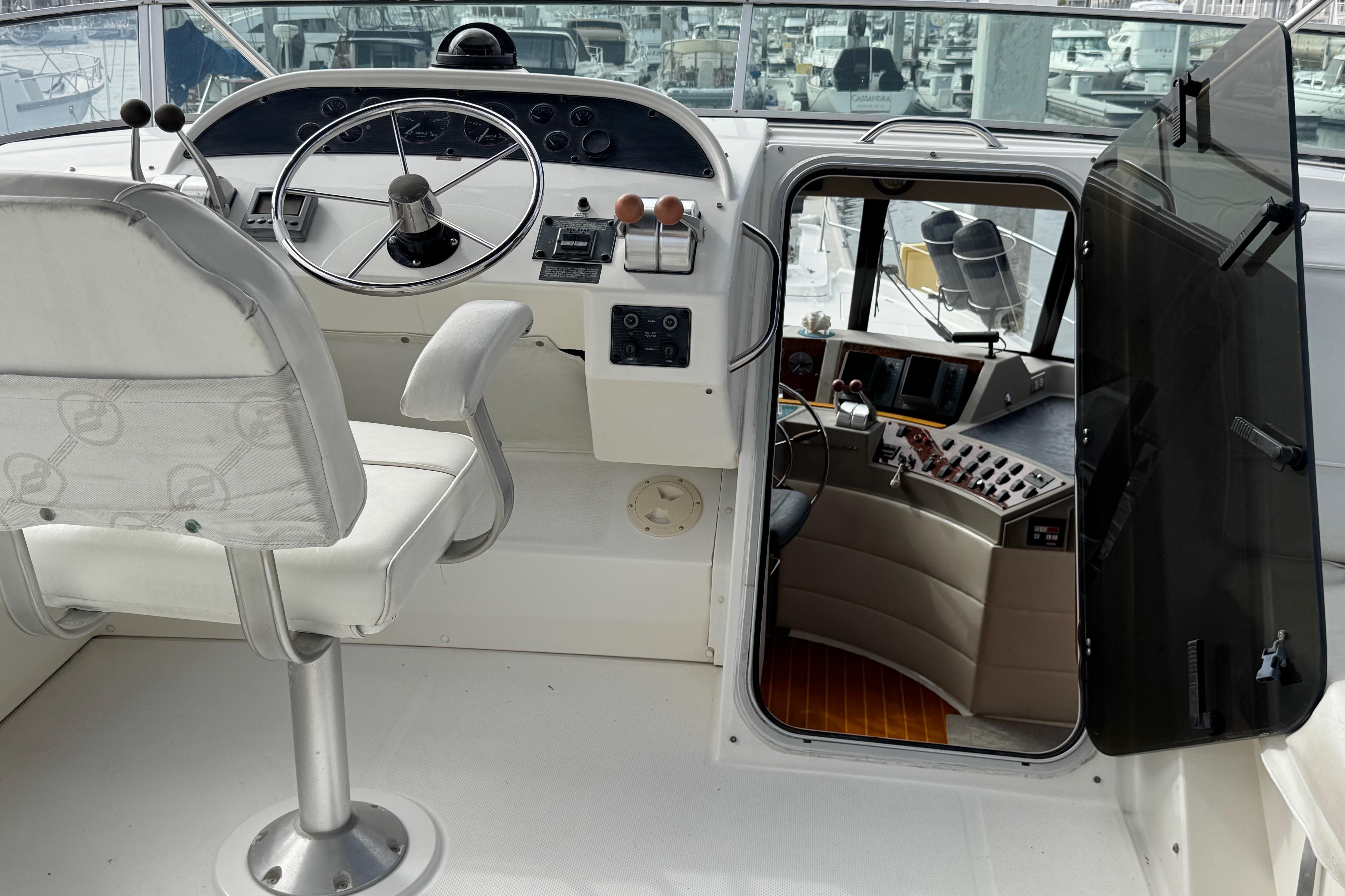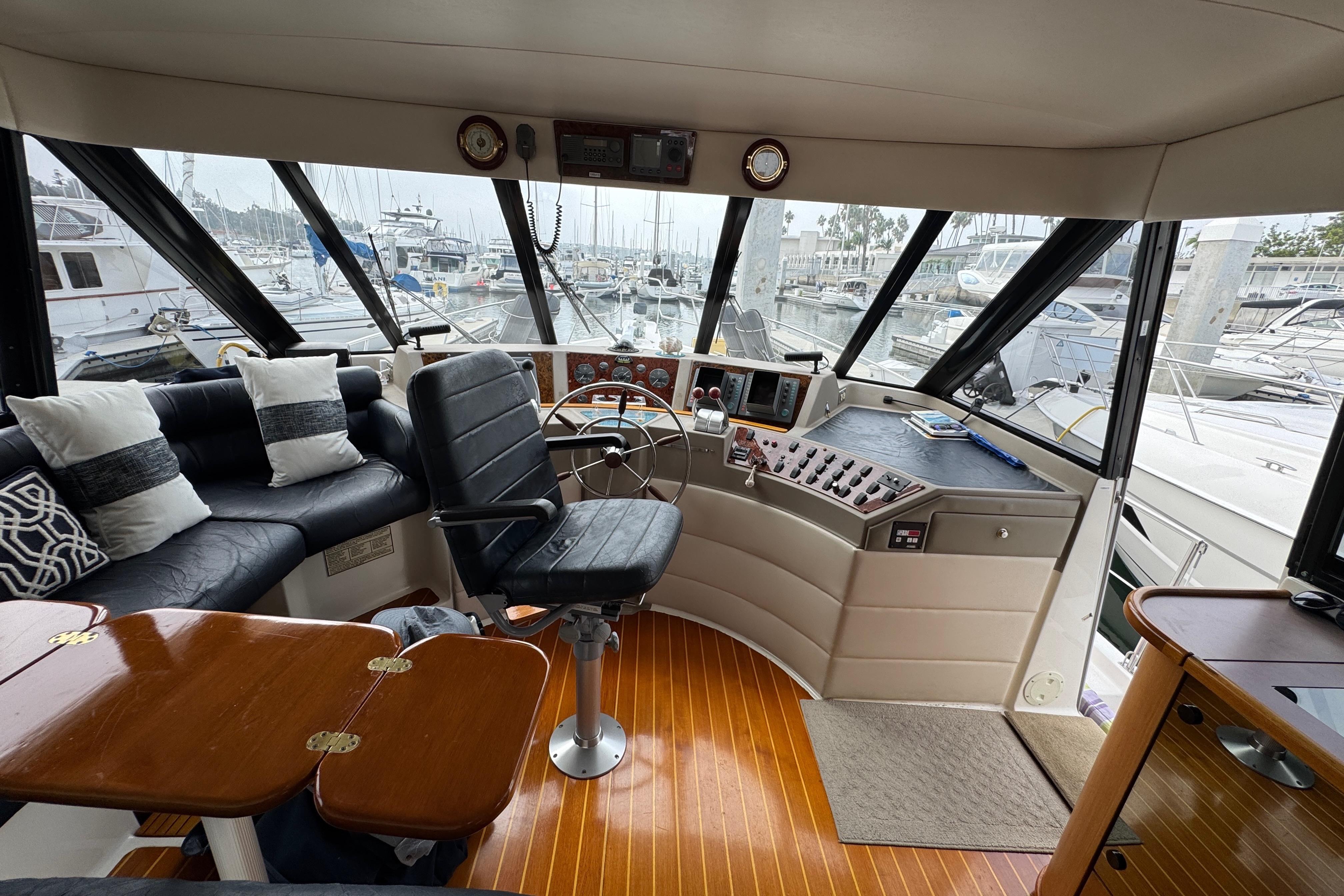 Visibility from the raised pilothouse is excellent. The cockpit is sheltered from the sun by a bridge overhang, and port/starboard pilothouse doors provide quick access to the foredeck.