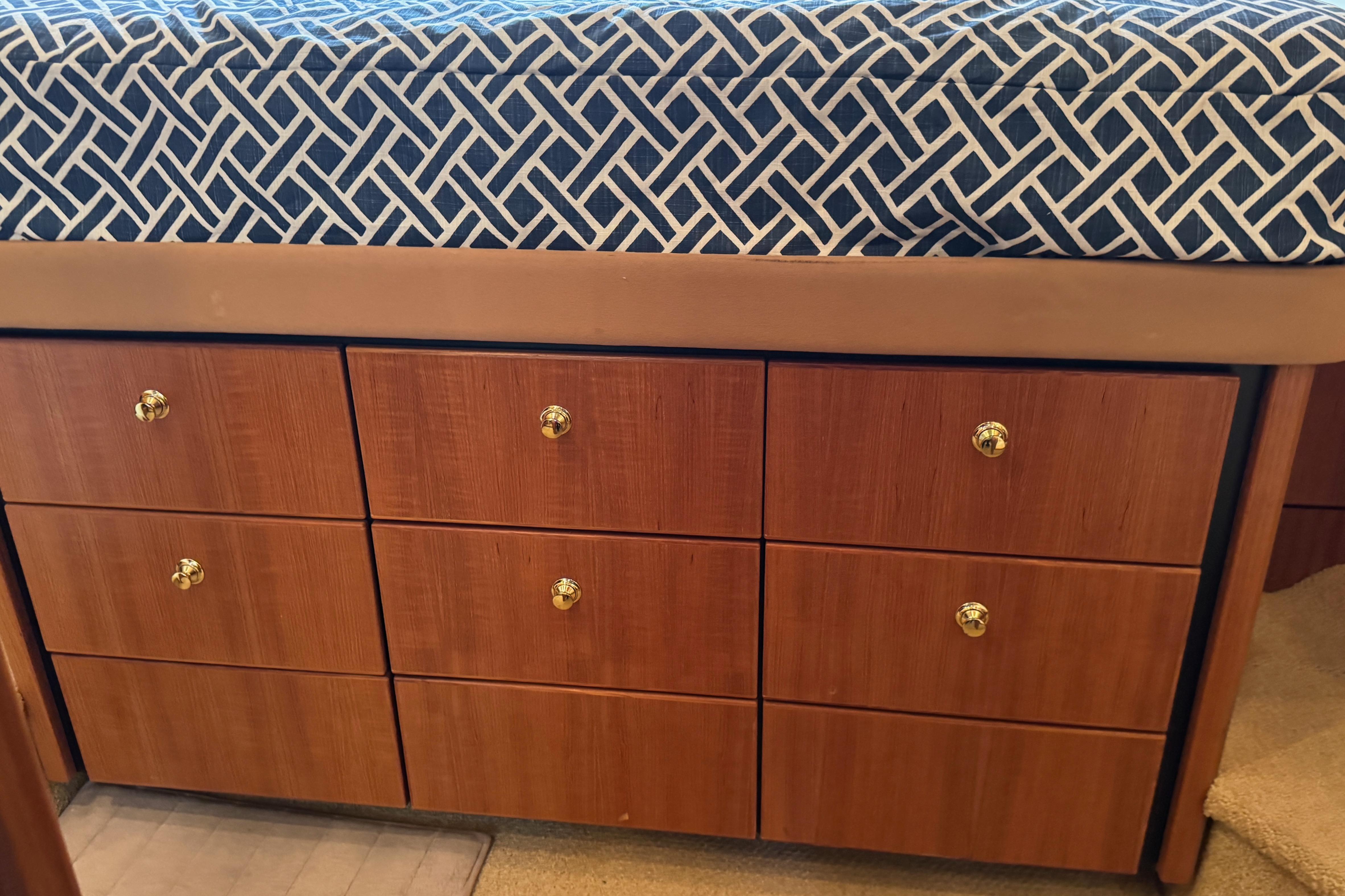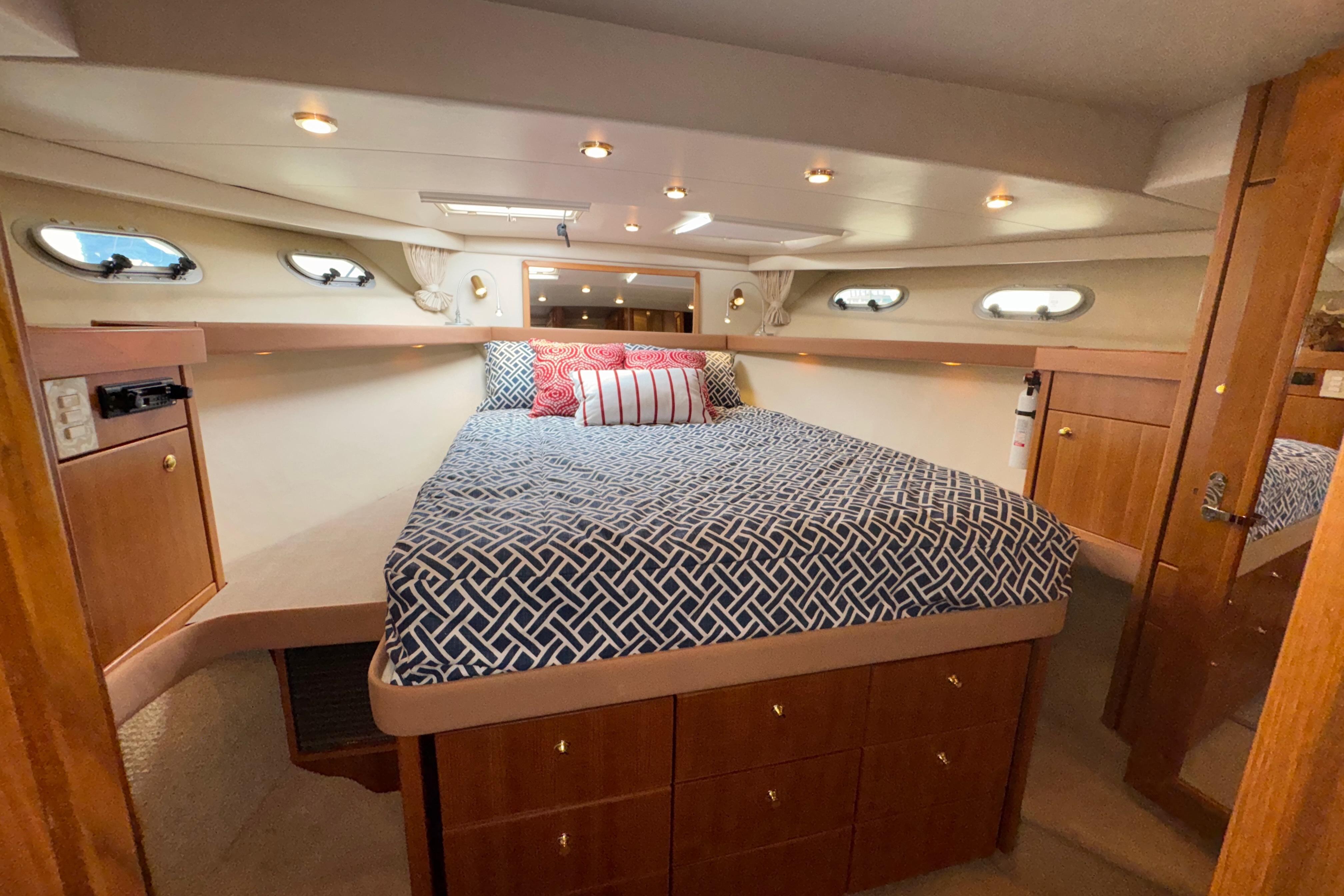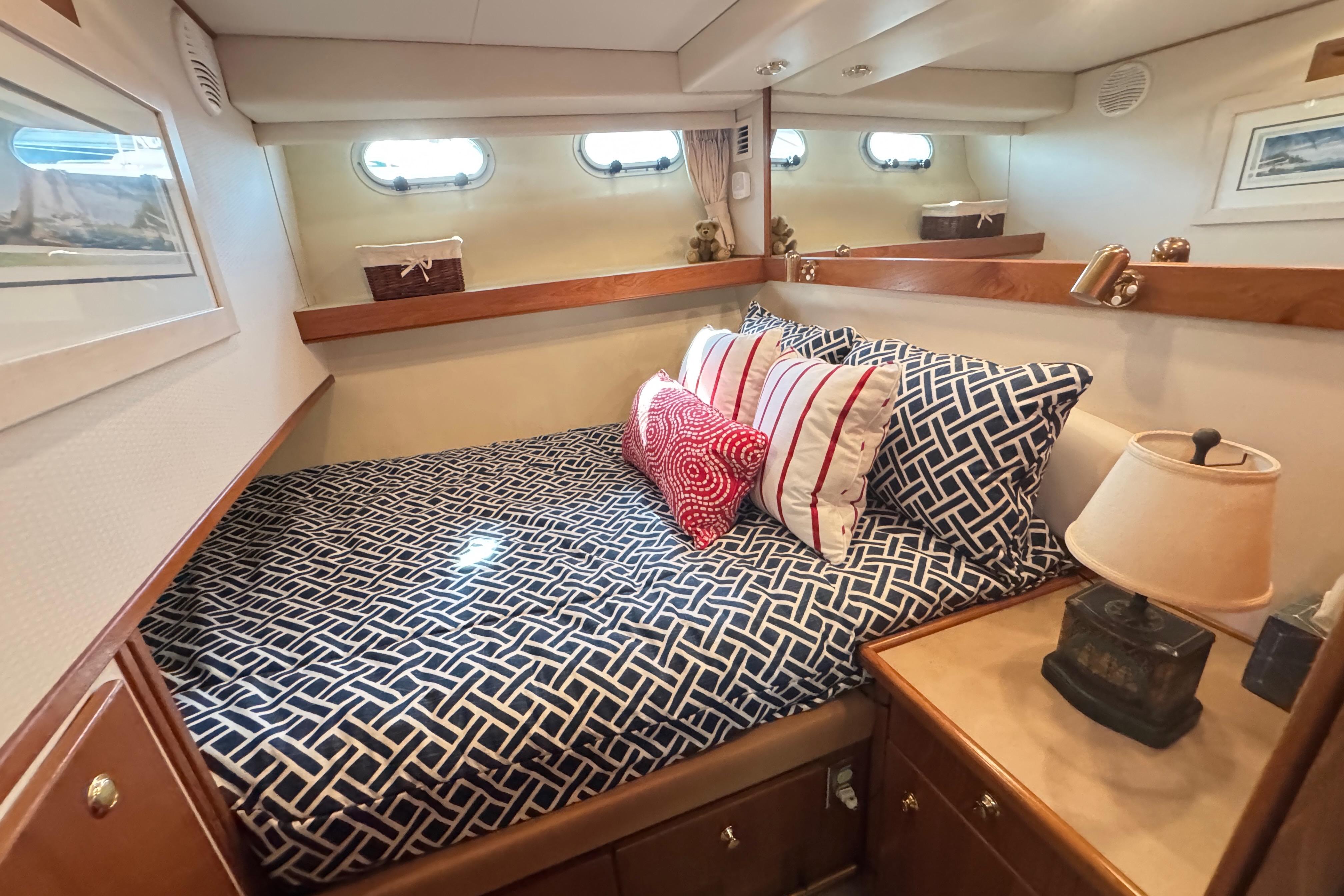 Inside, the L-shaped lounge was moved to starboard in the salon, and the increased hull length of the 4788 can be seen in the enlarged galley and salon dimensions. Two of the three staterooms have double berths, and the third cabin—which opens to the master stateroom—has a settee with hinged upper and lower berths.
