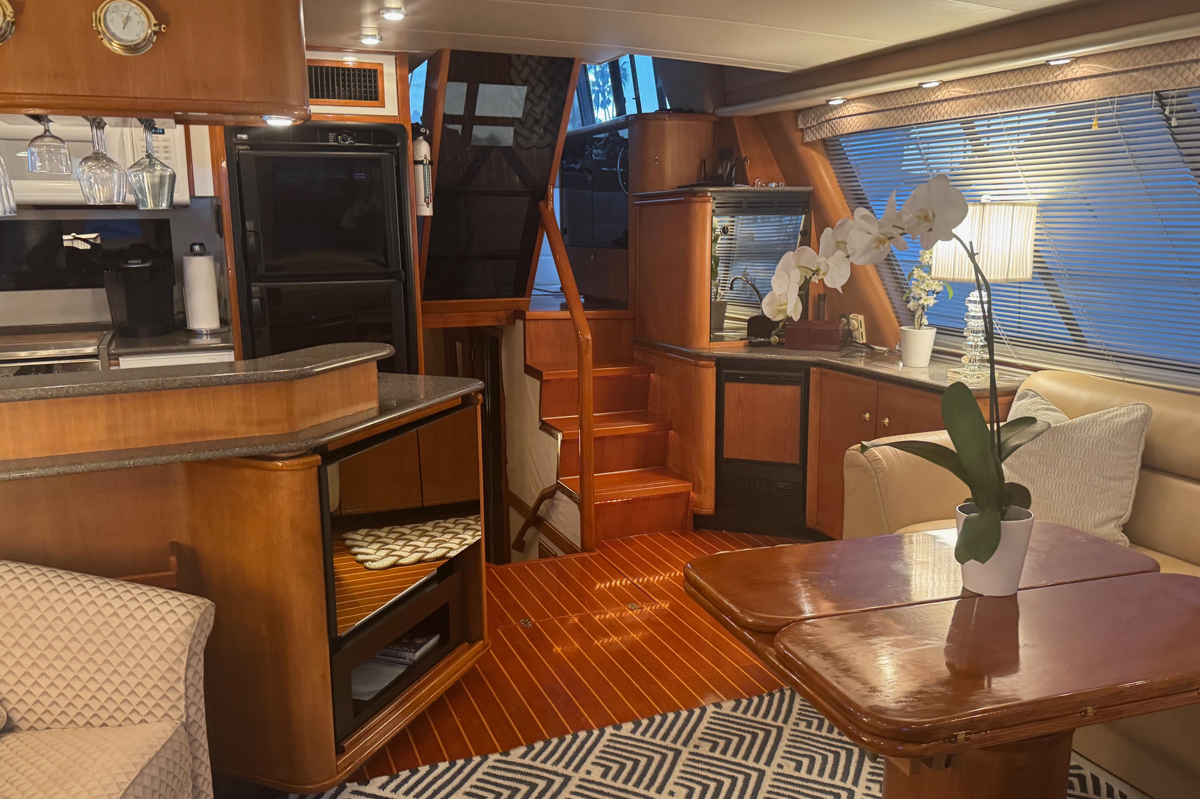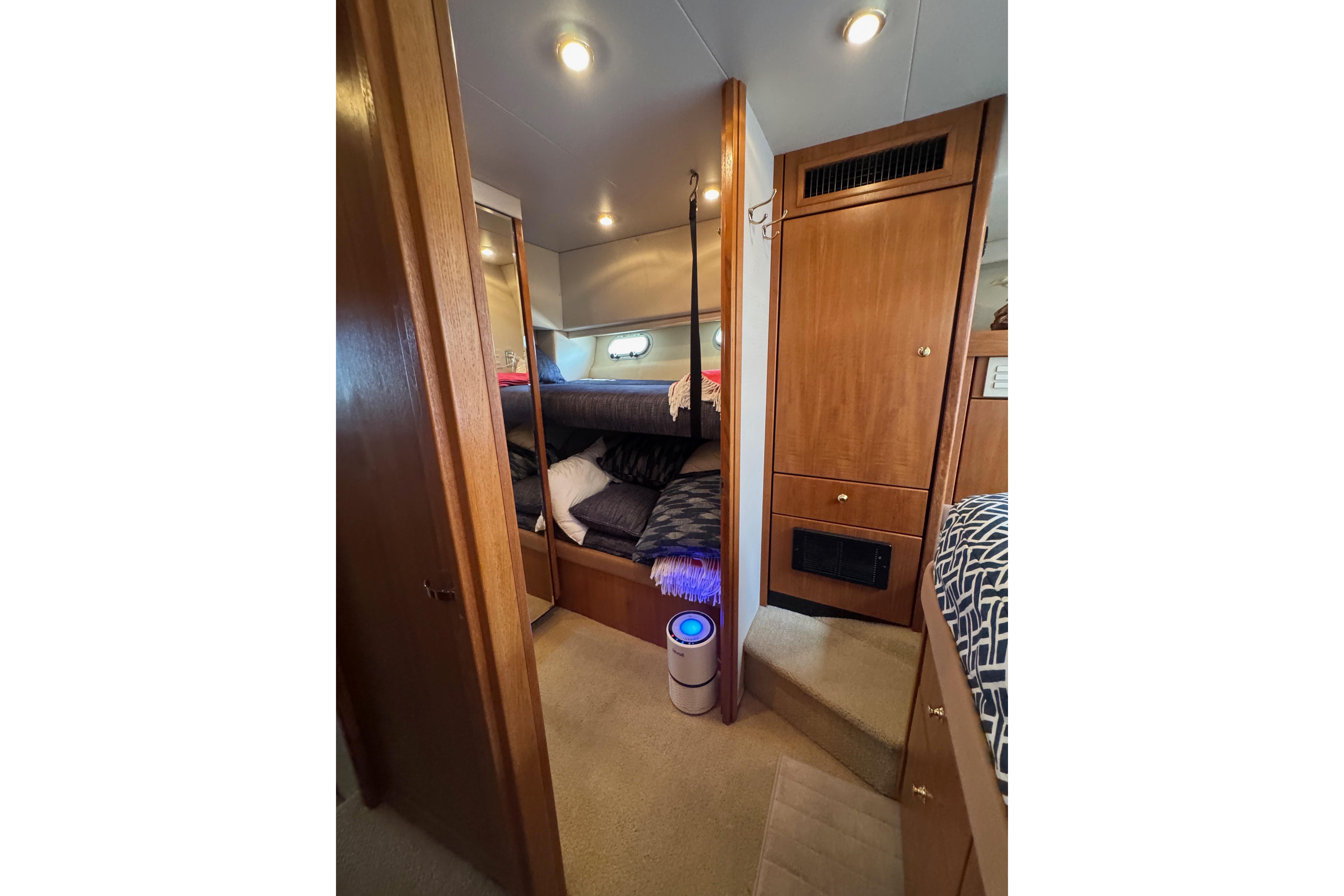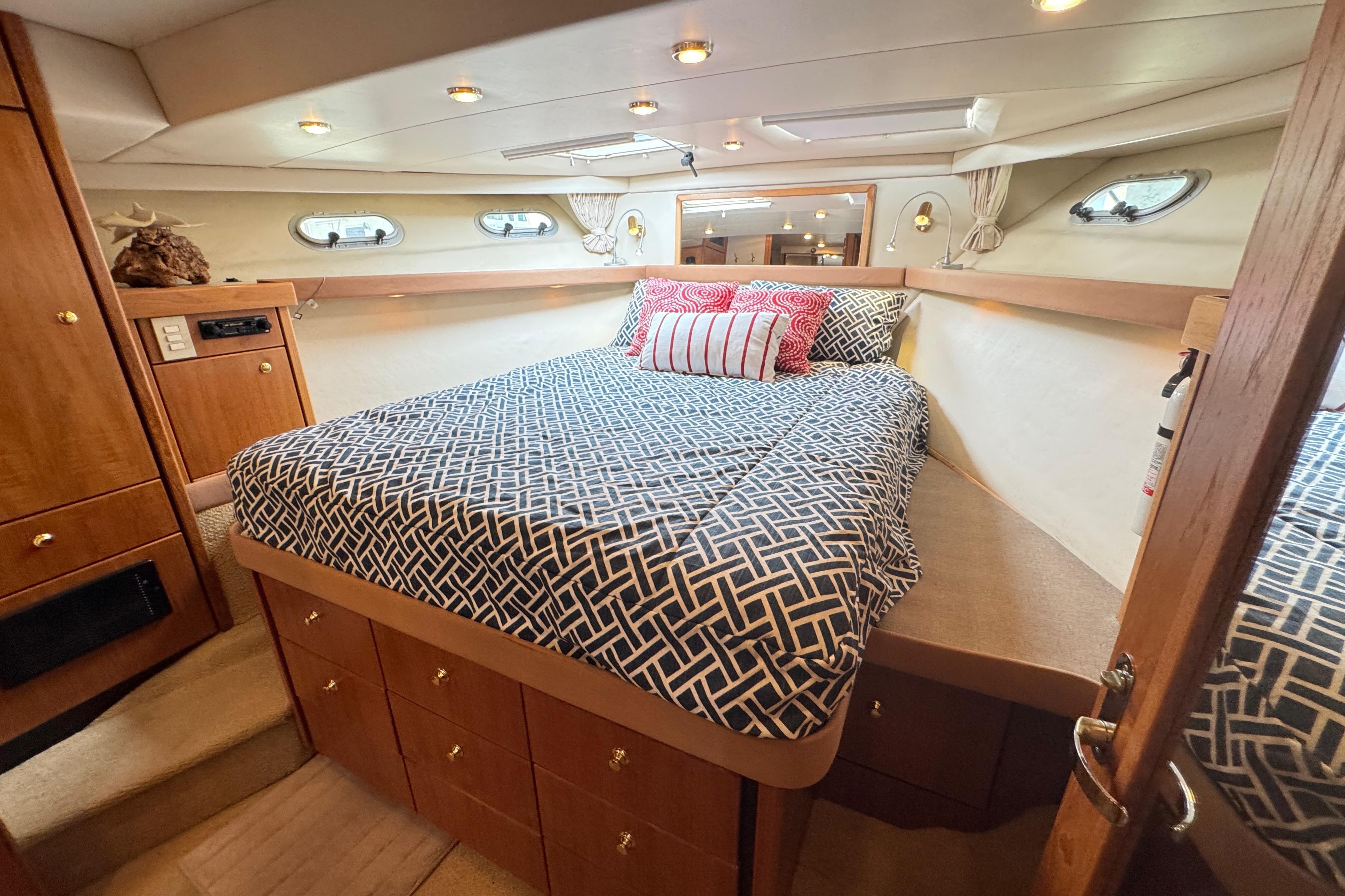 Inside, the L-shaped lounge was moved to starboard in the salon, and the increased hull length of the 4788 can be seen in the enlarged galley and salon dimensions. Two of the three staterooms have double berths, and the third cabin—which opens to the master stateroom—has a settee with hinged upper and lower berths.