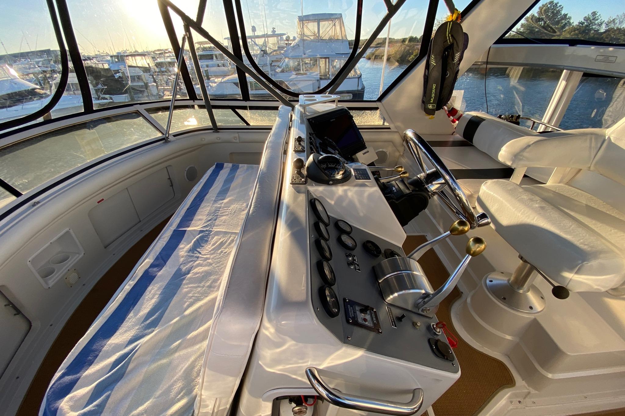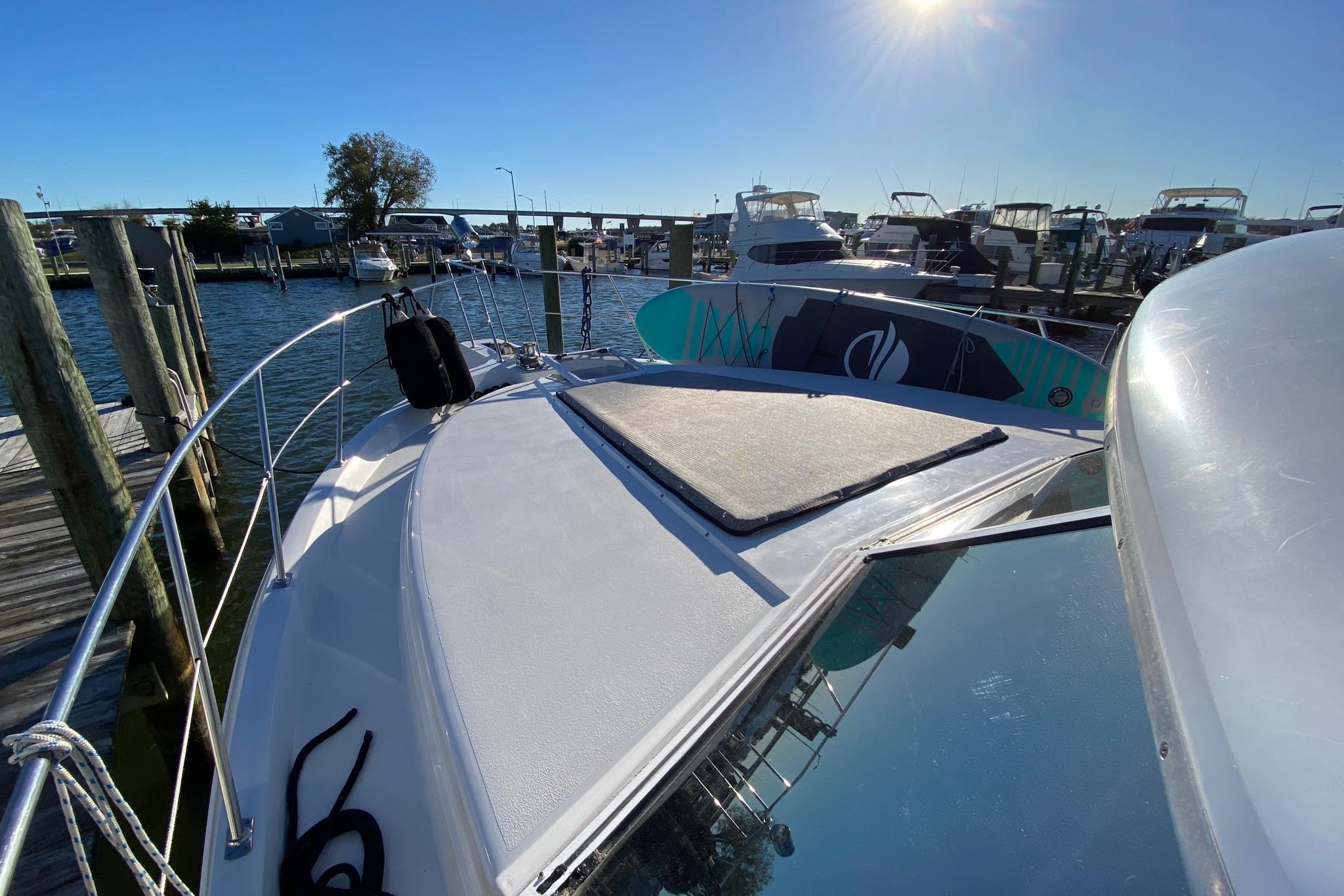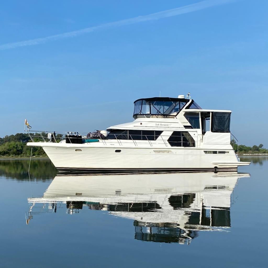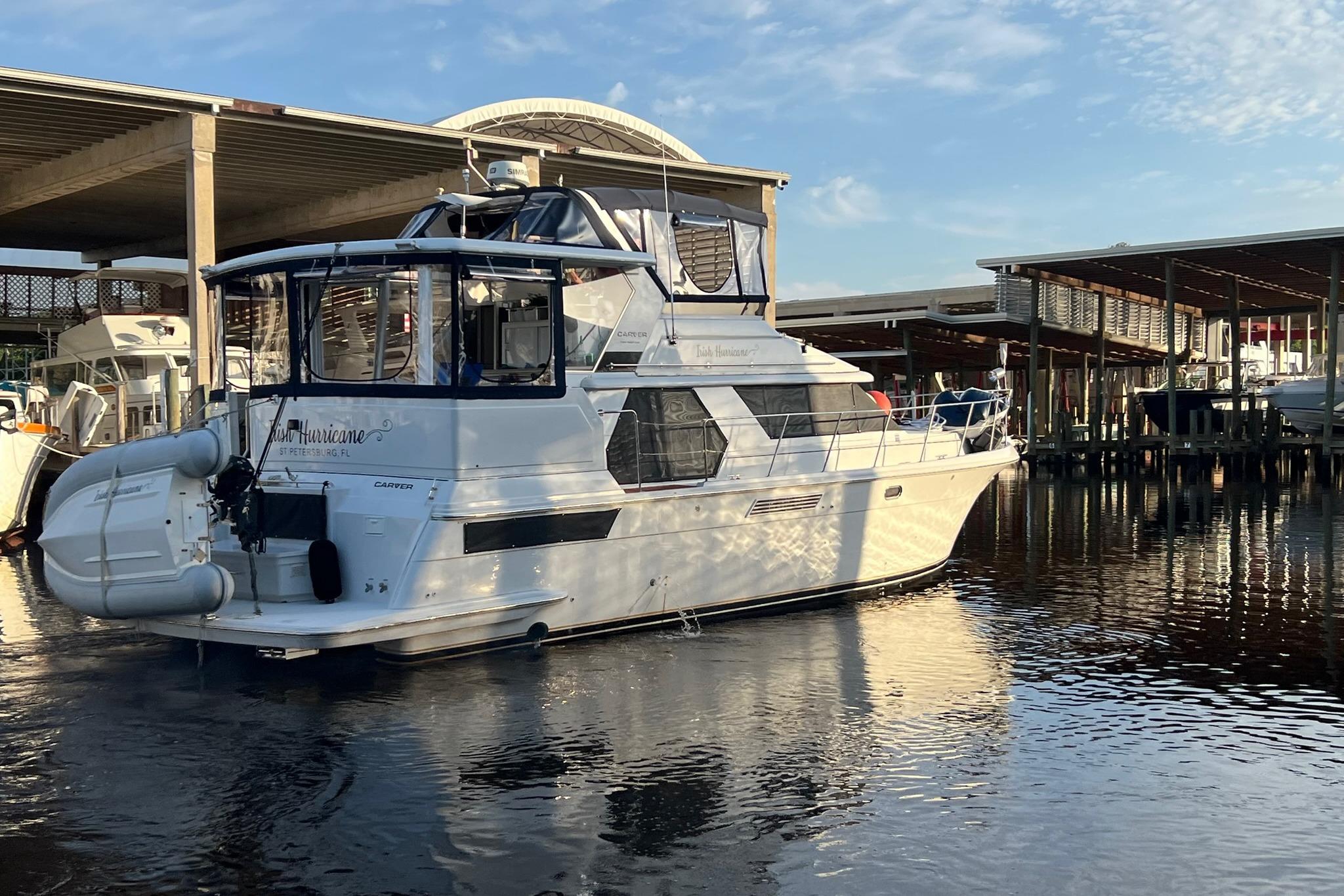 The Carver 445 Aft Cabin Motor Yacht blends quality materials, structural integrity, and superior craftsmanship into this popular yacht. “Irish Hurricane” has completed two Great Loops plus cruised from Lake Superior to Montreal and throughout New England. Her current owners have traveled aboard for up to 11 months at a time. Since November 2023 she has been in a covered slip or moored north of Virginia. Vessel, machinery, and running gear have been carefully maintained to ensure longevity. The 445’s modified vee hull provides stability on the water or dockside and allows the vessel to operate off or on plane. Walkaround main deck offers secure movement; swim platform affords easy boarding. The vessel is great for weekend cruising, dockside living, and entertaining. A hard-top, Isinglass enclosed sun deck has ample room for patio furniture; sundeck isinglass includes zip-in mosquito screening and separate drapes that offer full or partial privacy when drawn. Swim platform has hot/cold freshwater shower and sturdy 4-rung swim ladder. Weaver davit system with additional block and tackle offers ease of launch/ recovery. Foredeck has sunning pad. Purchase includes 2 new beanbag chairs. Flybridge has bench seating forward and a second bench adjacent to the swivel helm chair. Hard top aft of flybridge is features non-skid deck for safety. Main salon includes Stressless recliner, rocker recliner, makeshift couch that folds into twin bed, and a computer workstation; Starlink provides connectivity 24/7. Salon HDTV can be mounted above or below countertop. Vessel (excluding bridge) is wired for Bose surround sound. Galley down has full-sized appliances and is within easy reach of dinette and apartment-sized washer/dryer. Open concept salon facilitates galley/salon conversation. Forward berth sleeps three (double berth with upper bunk), has full-length closet and full head with stall shower. Dinette seats six and sleeps two (with table down). Aft cabin has walk-around queen bed, lighted vanity, large closets and built-in drawers; and full head with stall shower. Salon windows have UV-block tint. Windows throughout are equipped with external snap-on UV-block Pfifertex screening. Forward salon windows have snap-on blackout cover. Vessel comes with Carver and after-market equipment manuals, spare parts, and PM and service records.