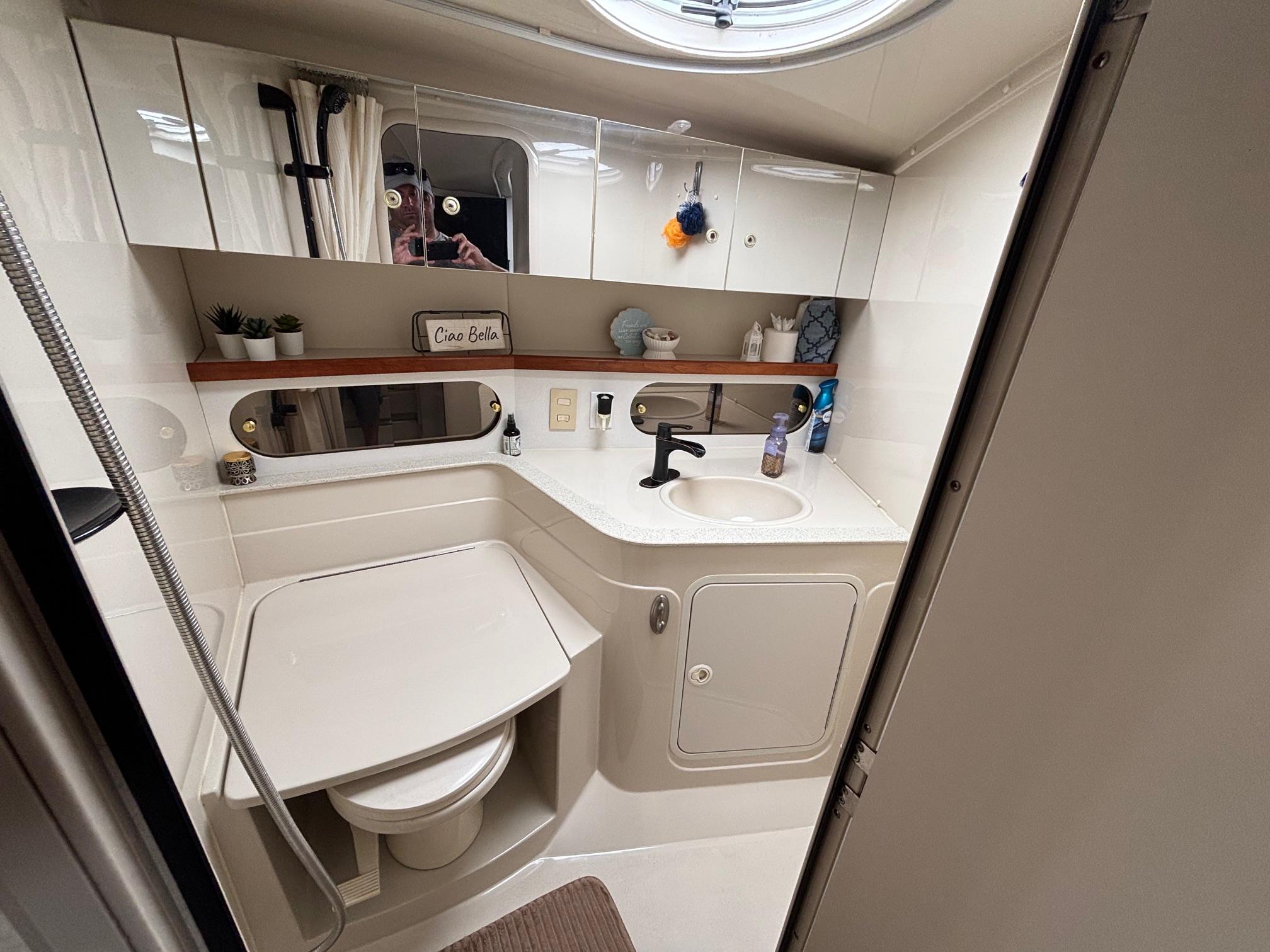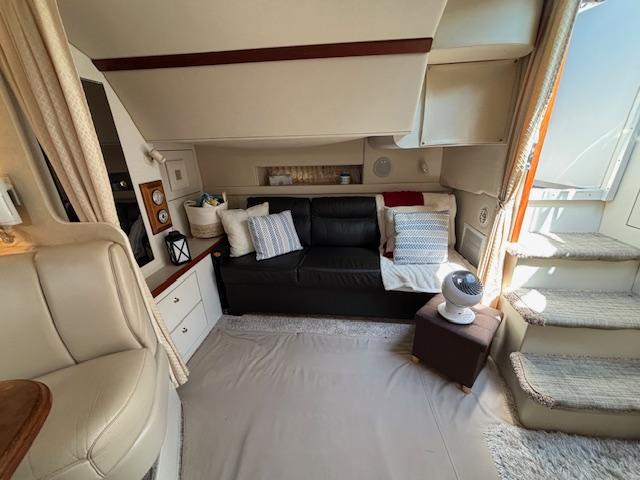 This yacht has benefited from numerous updates, including new salon carpet (2021), new waste tank (2021), and a new salon sofa/sleeper (2021). The enclosure features Isinglass in good condition with screens installed in most windows (2022), along with stainless steel fender holders (2022). Additional upgrades include a new NOCO 5-amp, 3-bank battery charger, new sunpad carpet runner (2023), and five new batteries installed between 2023–2024. Entertainment and comfort are enhanced by a new Fusion stereo (2024), while recent aft deck and swim platform carpeting (2025) and a new ice maker (2025) further elevate usability. The yacht also features updated bottom paint (2025), a black powder-coated plow anchor (2025), and updated LED lighting throughout.