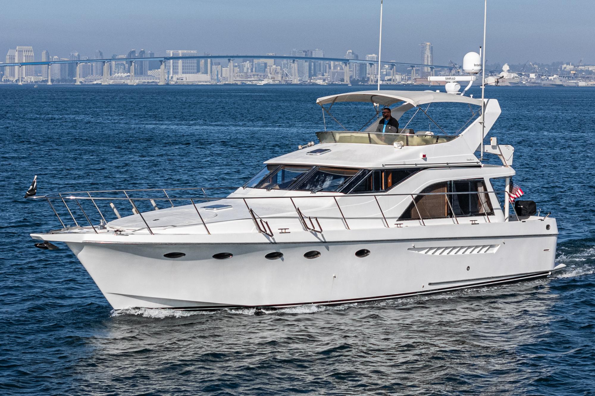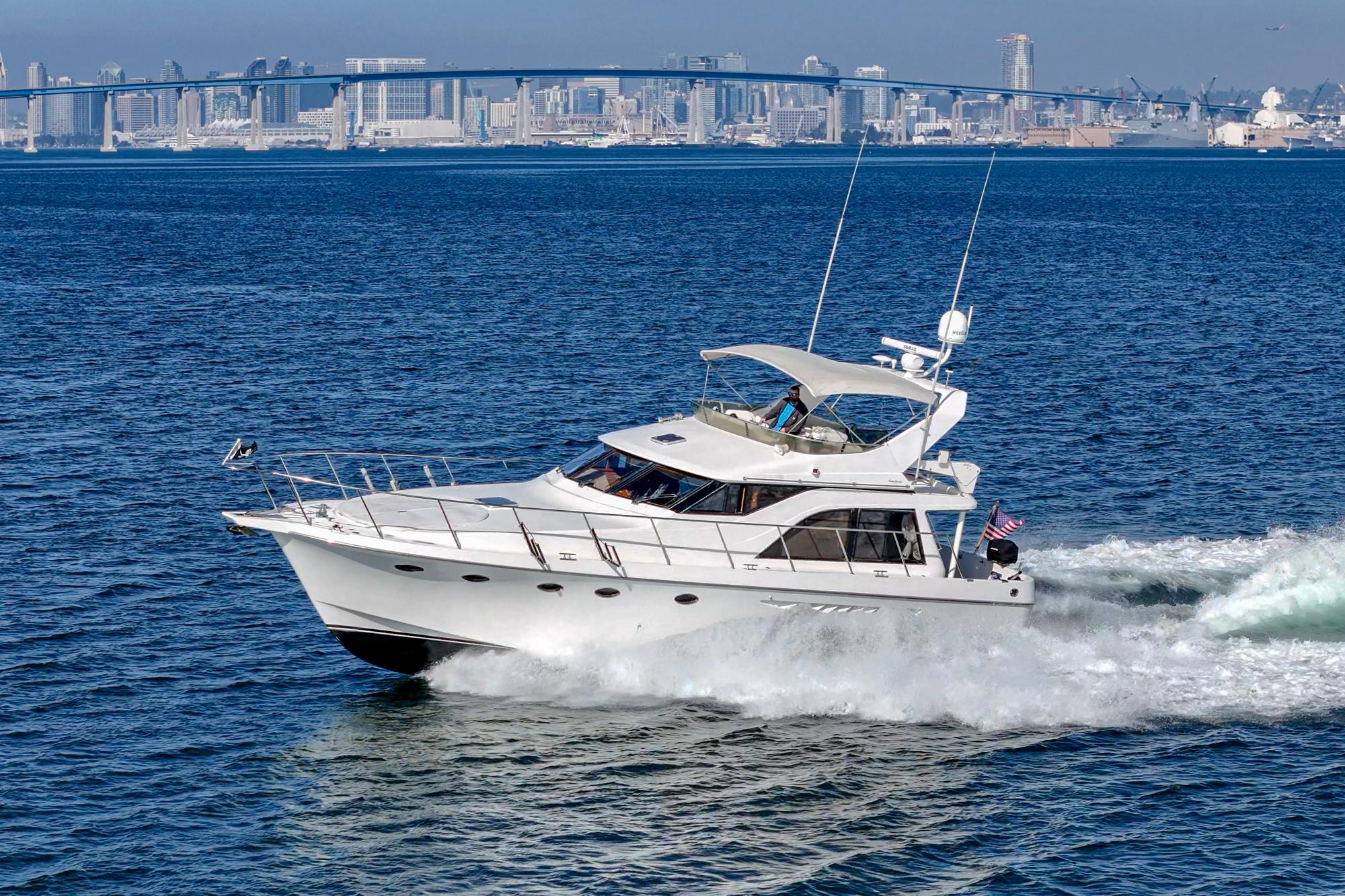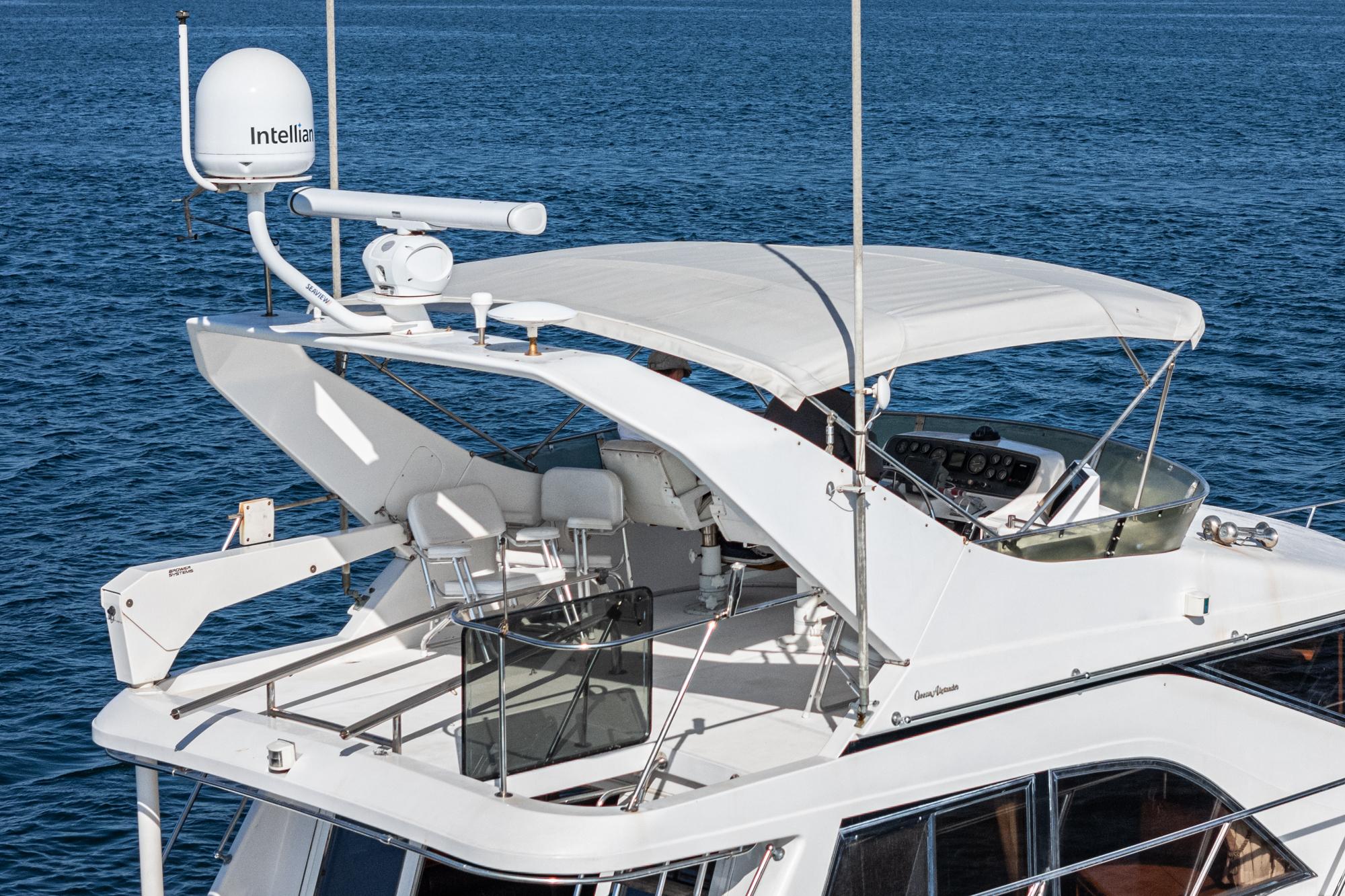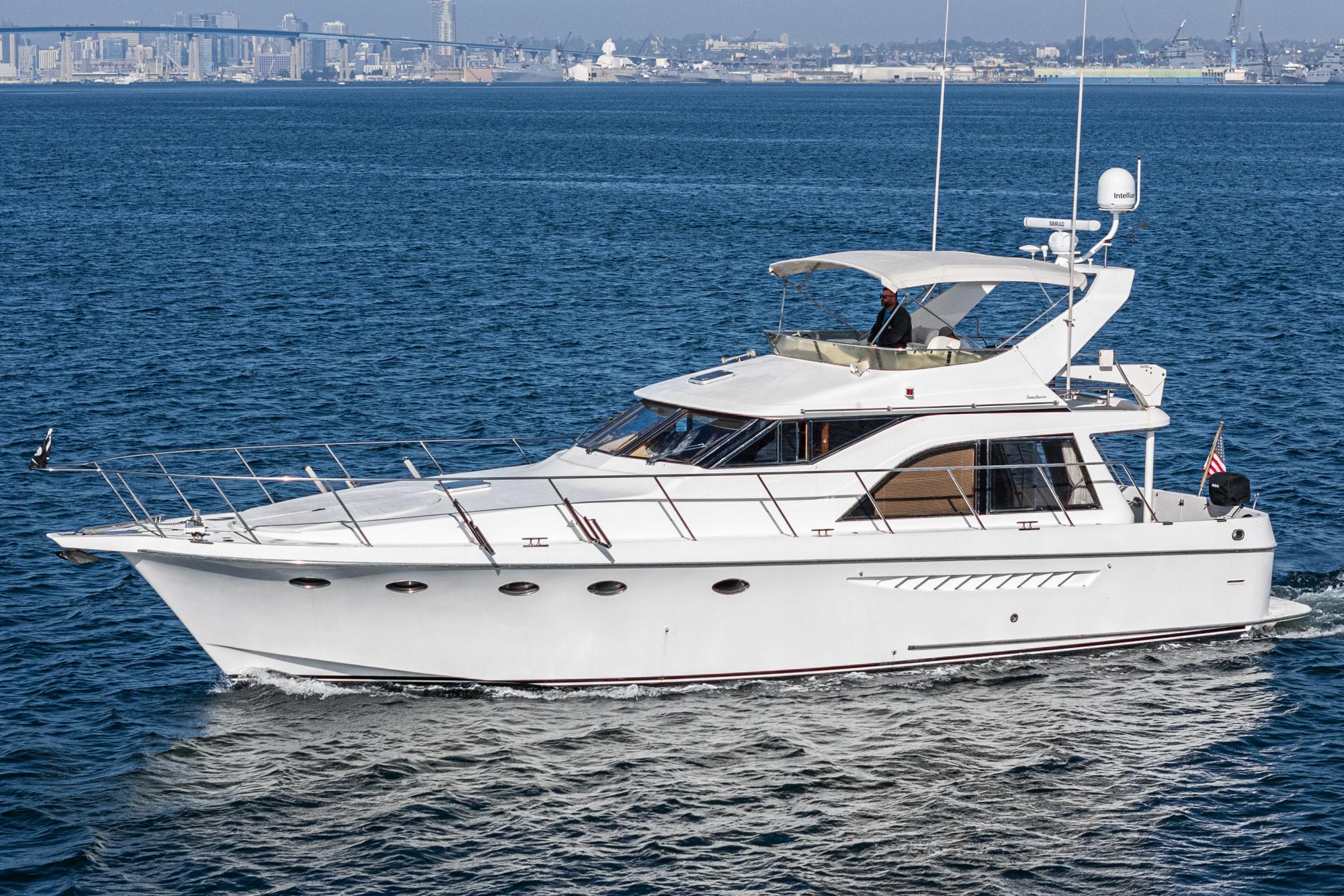 Bottom painted in 2021. Teak cockpit sole. Four S/S/ cleats, port and starboard. S/S hawse holes (cockpit). Added S/S handrails on transom, above side windows, and steps to walkaround. Aluminum frame glass angle doors (salon to cockpit — 2 sliding, 2 fixed). Pop-up swim step cleats. Hand-laid, gelcoated FRP hull. Balsa core on hull sides. Solid fiberglass hull bottom. Louvered engine vent hull sides.