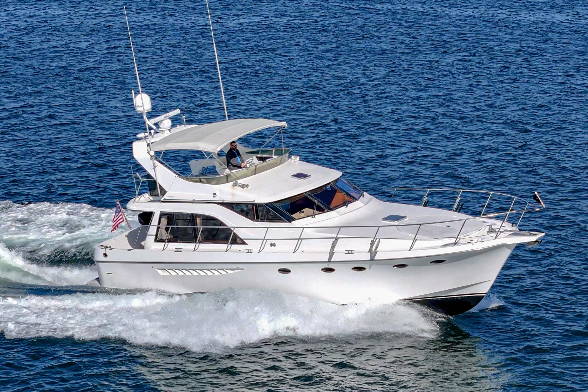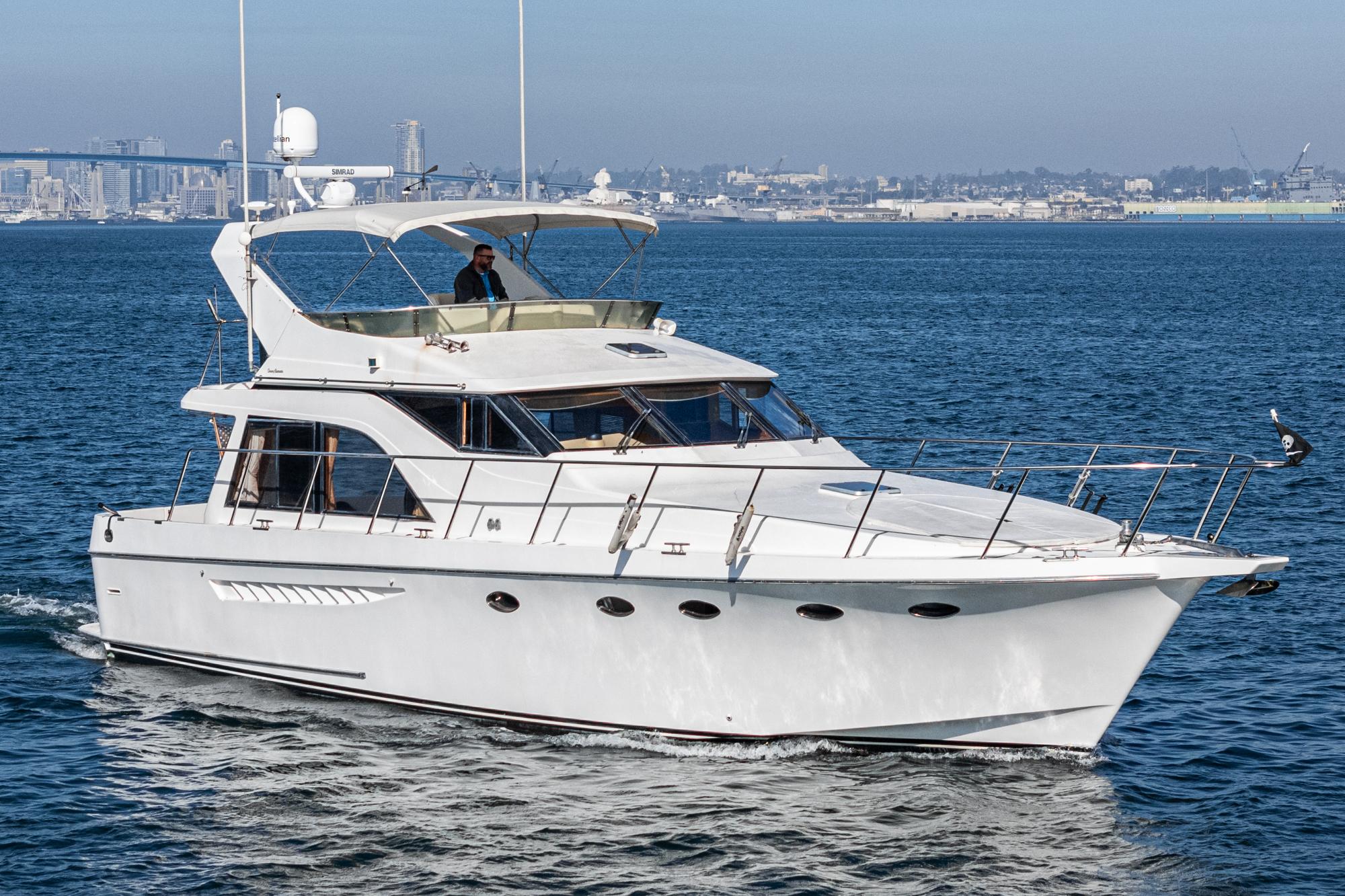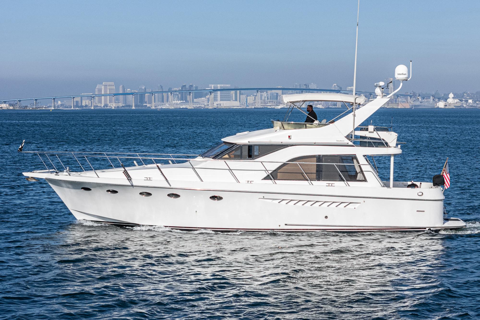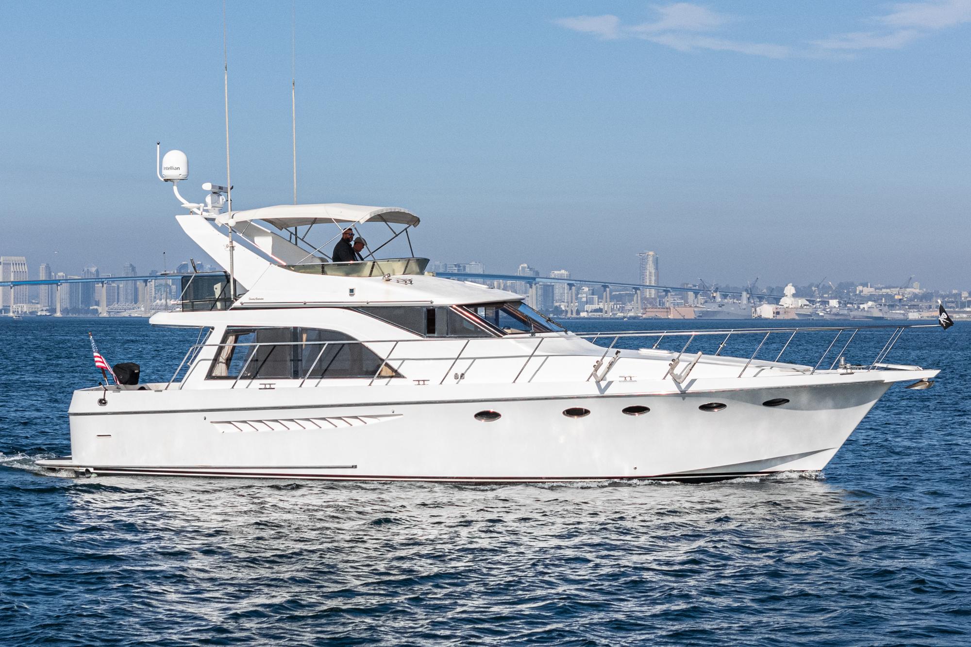 Bottom painted in 2021. Teak cockpit sole. Four S/S/ cleats, port and starboard. S/S hawse holes (cockpit). Added S/S handrails on transom, above side windows, and steps to walkaround. Aluminum frame glass angle doors (salon to cockpit — 2 sliding, 2 fixed). Pop-up swim step cleats. Hand-laid, gelcoated FRP hull. Balsa core on hull sides. Solid fiberglass hull bottom. Louvered engine vent hull sides.