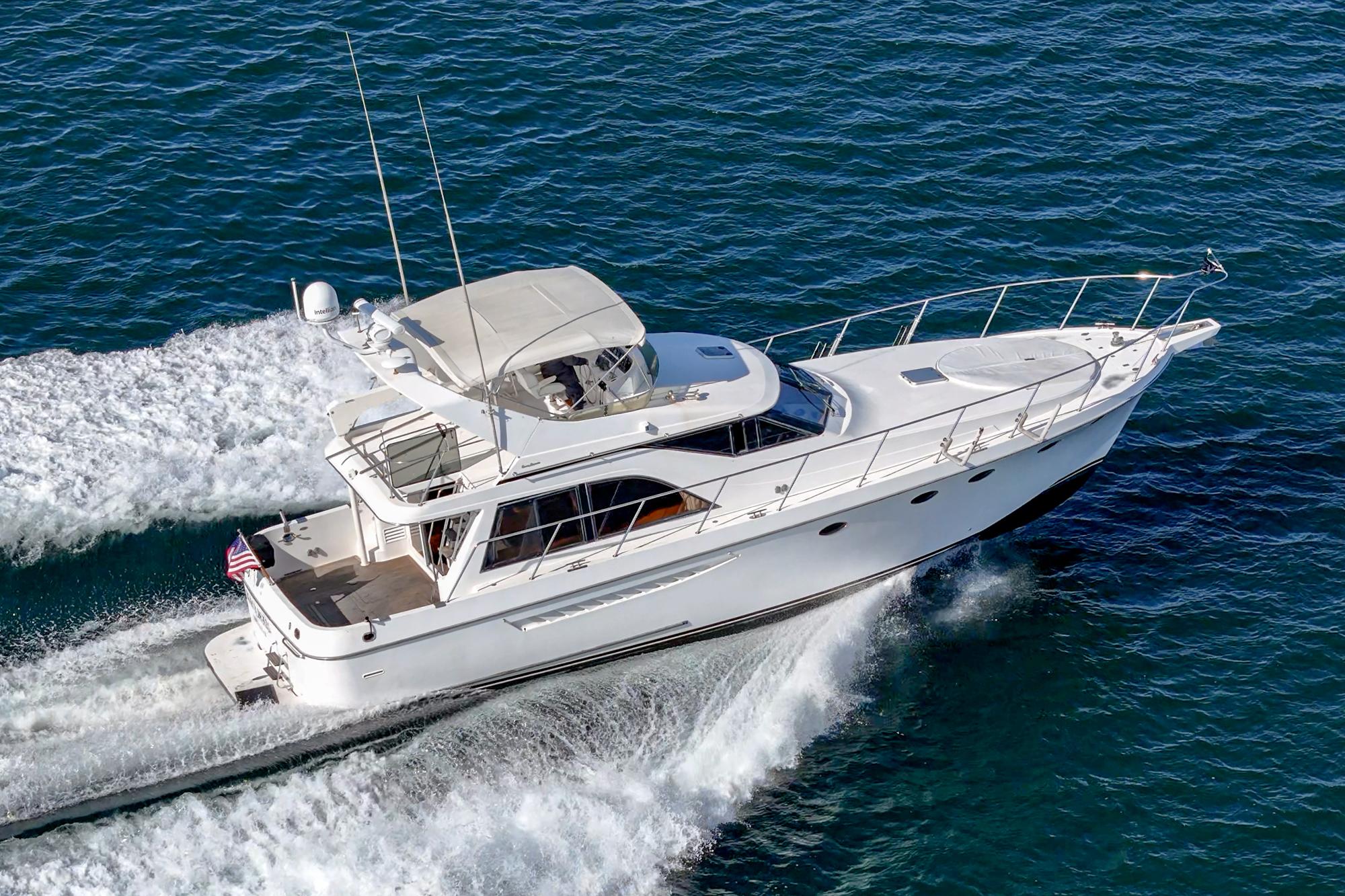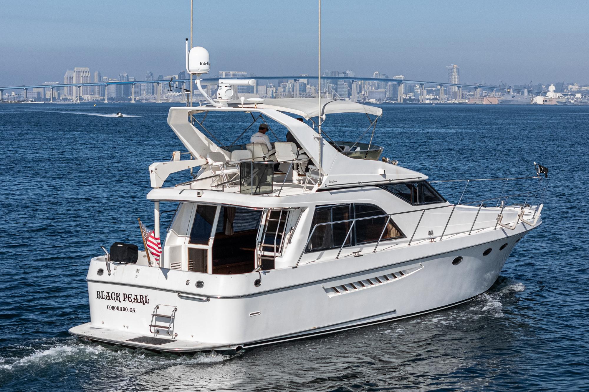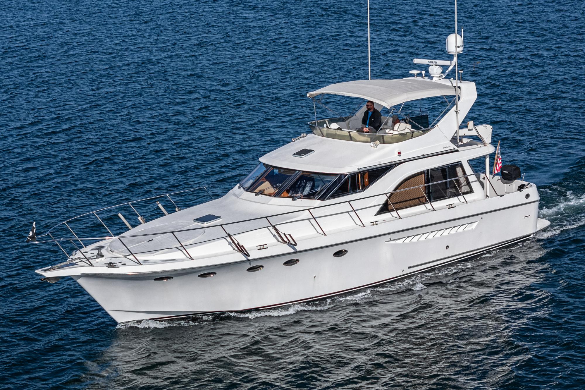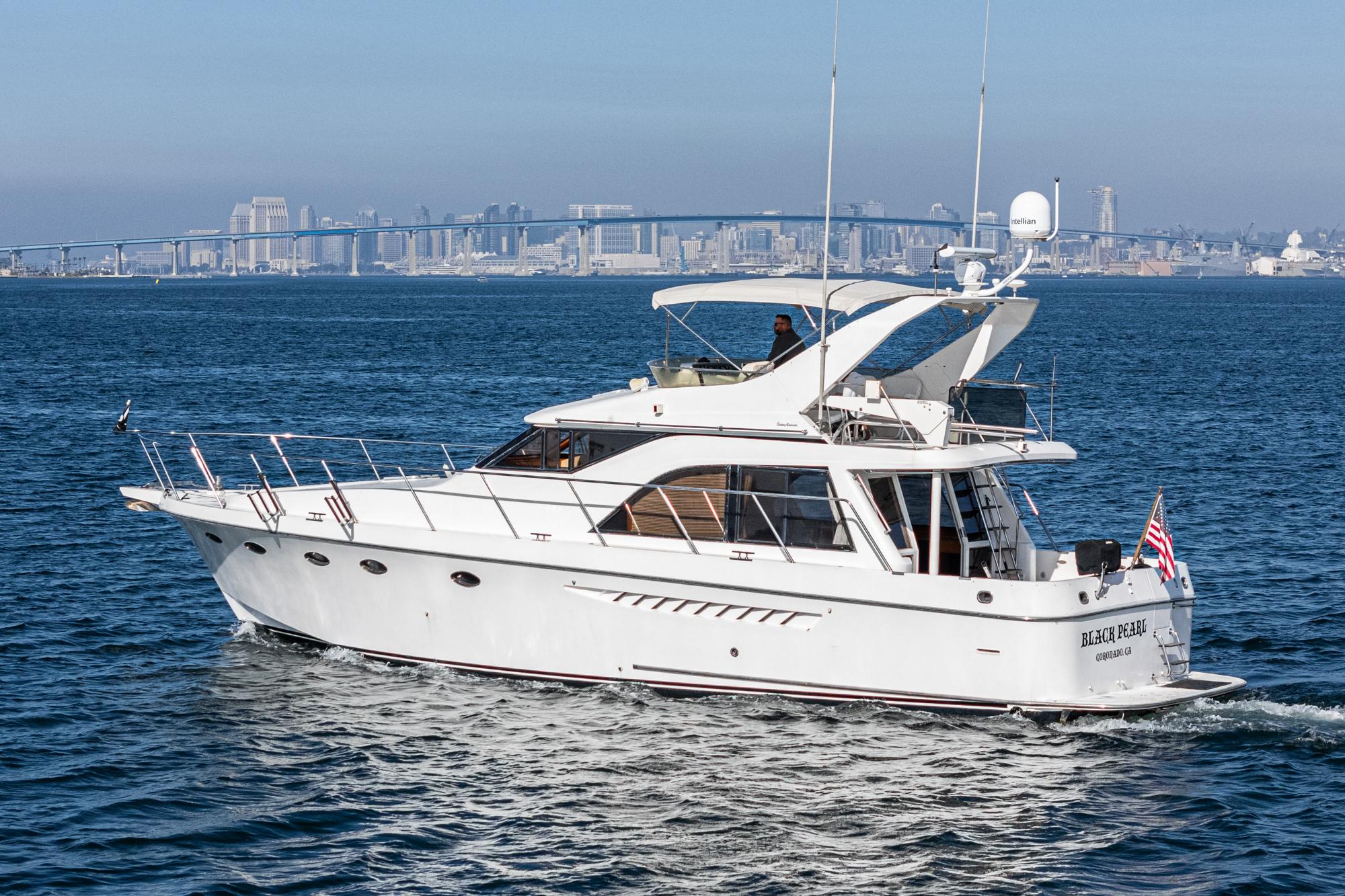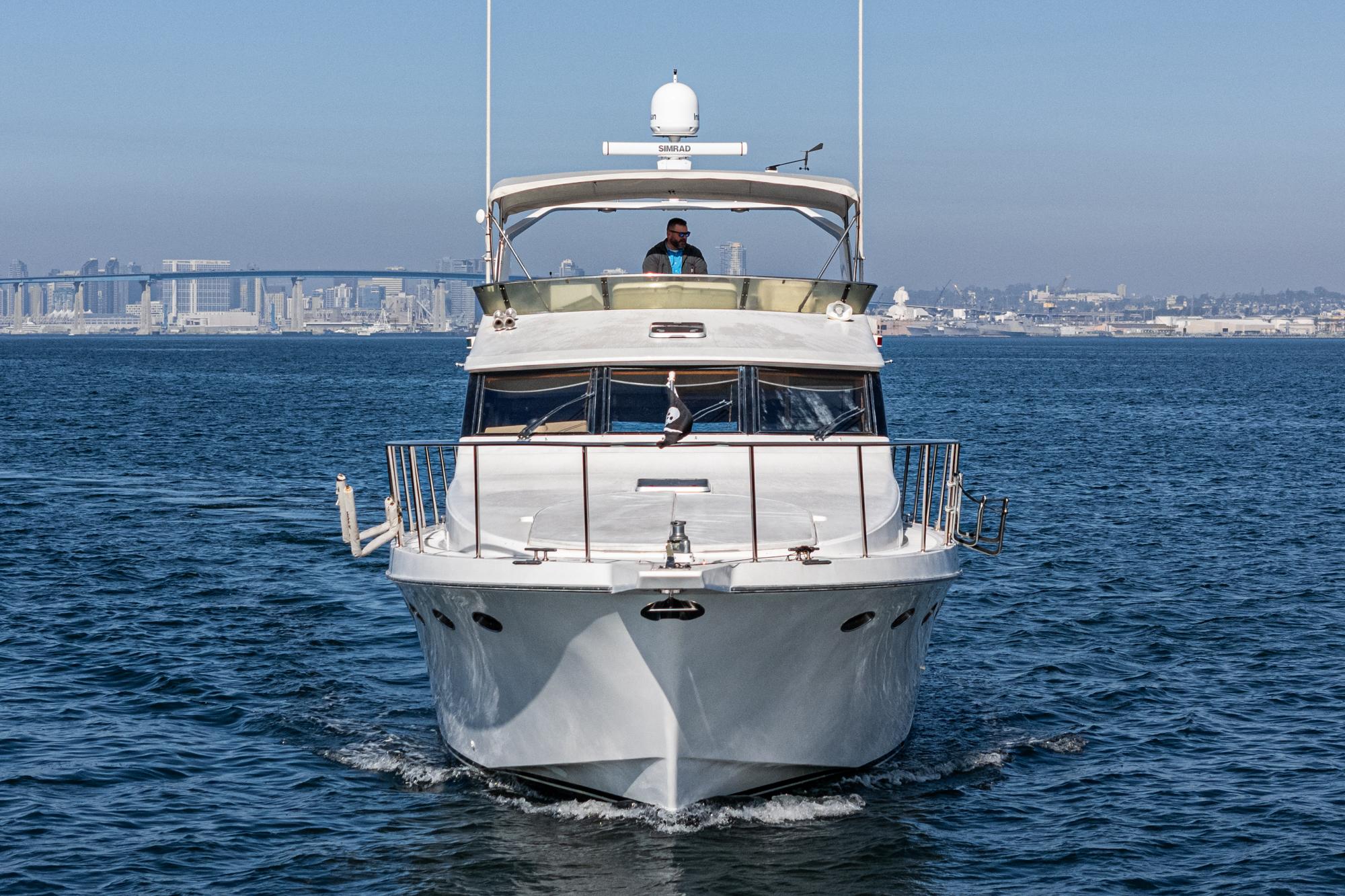 Bottom painted in 2021. Teak cockpit sole. Four S/S/ cleats, port and starboard. S/S hawse holes (cockpit). Added S/S handrails on transom, above side windows, and steps to walkaround. Aluminum frame glass angle doors (salon to cockpit — 2 sliding, 2 fixed). Pop-up swim step cleats. Hand-laid, gelcoated FRP hull. Balsa core on hull sides. Solid fiberglass hull bottom. Louvered engine vent hull sides.