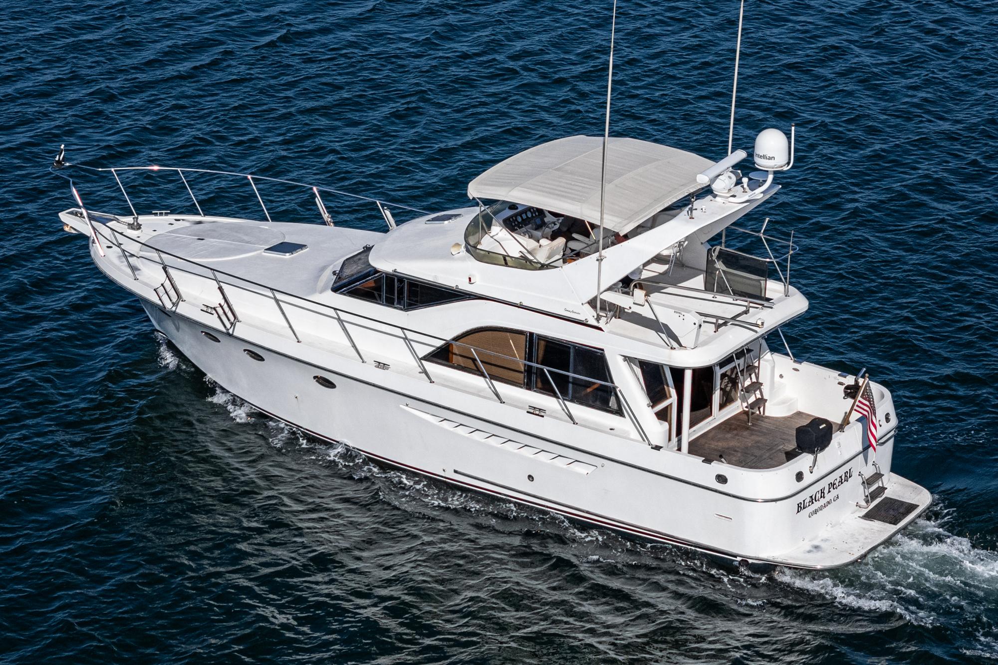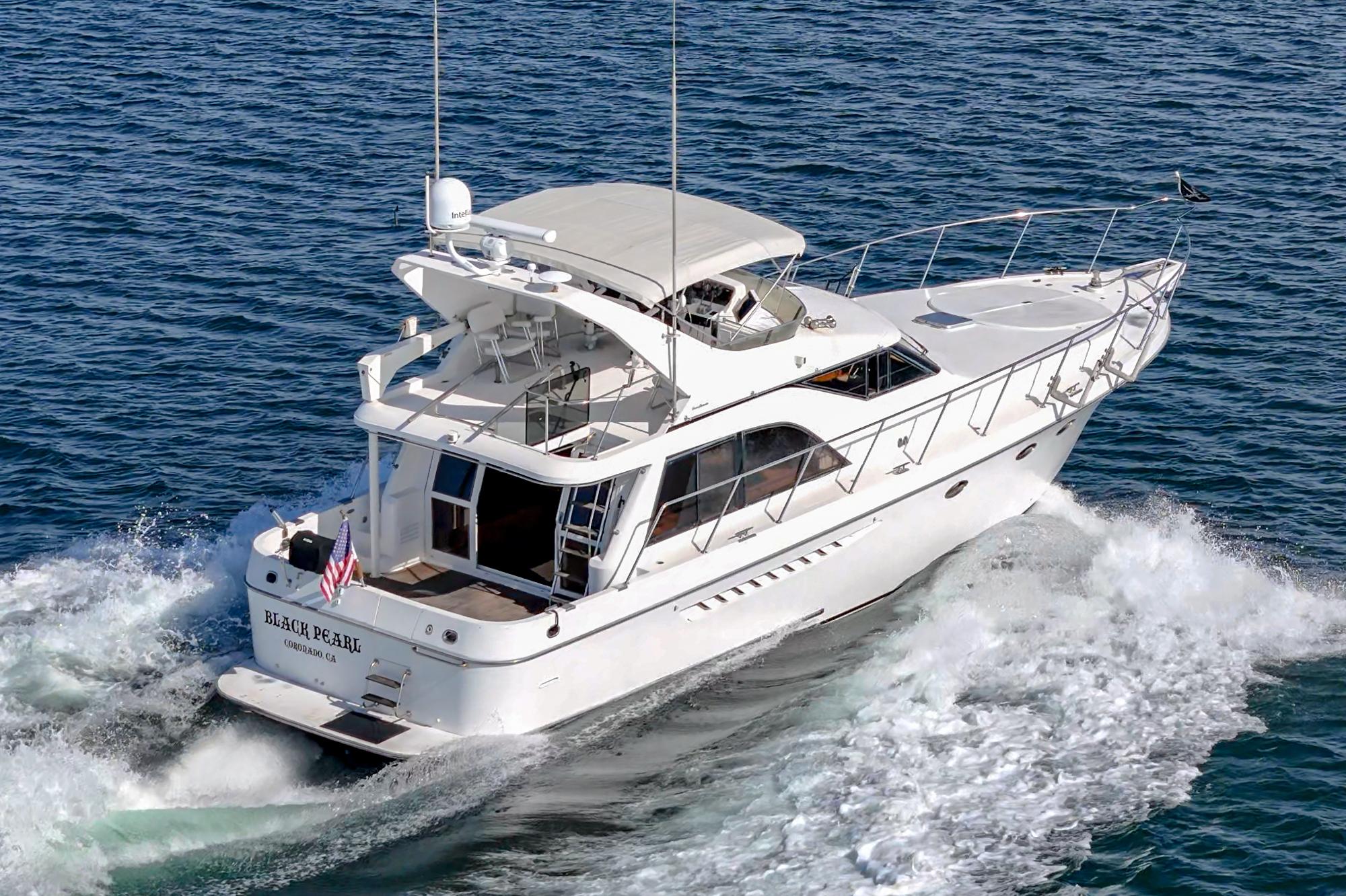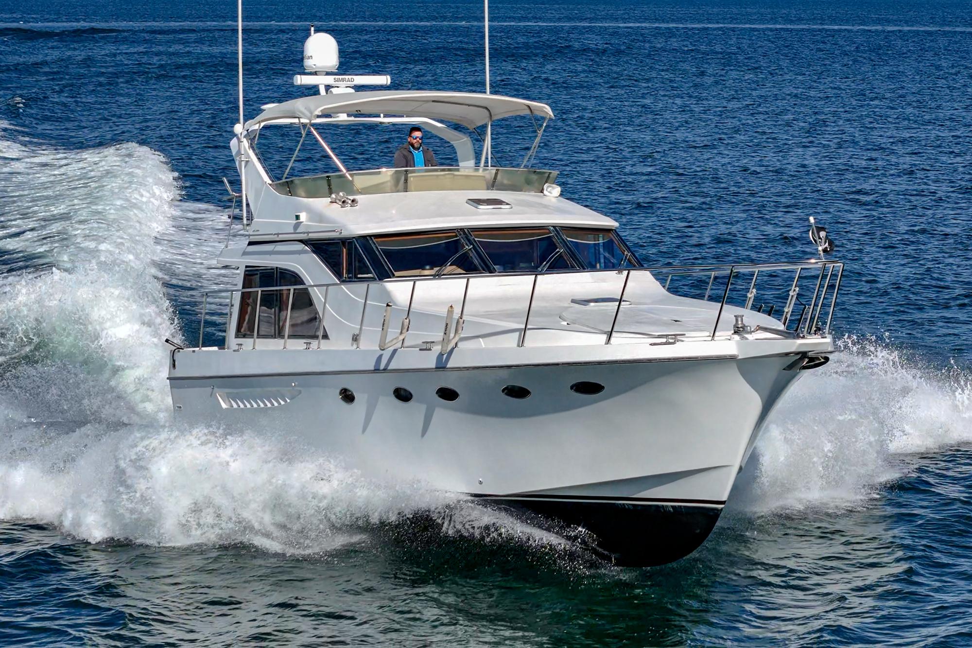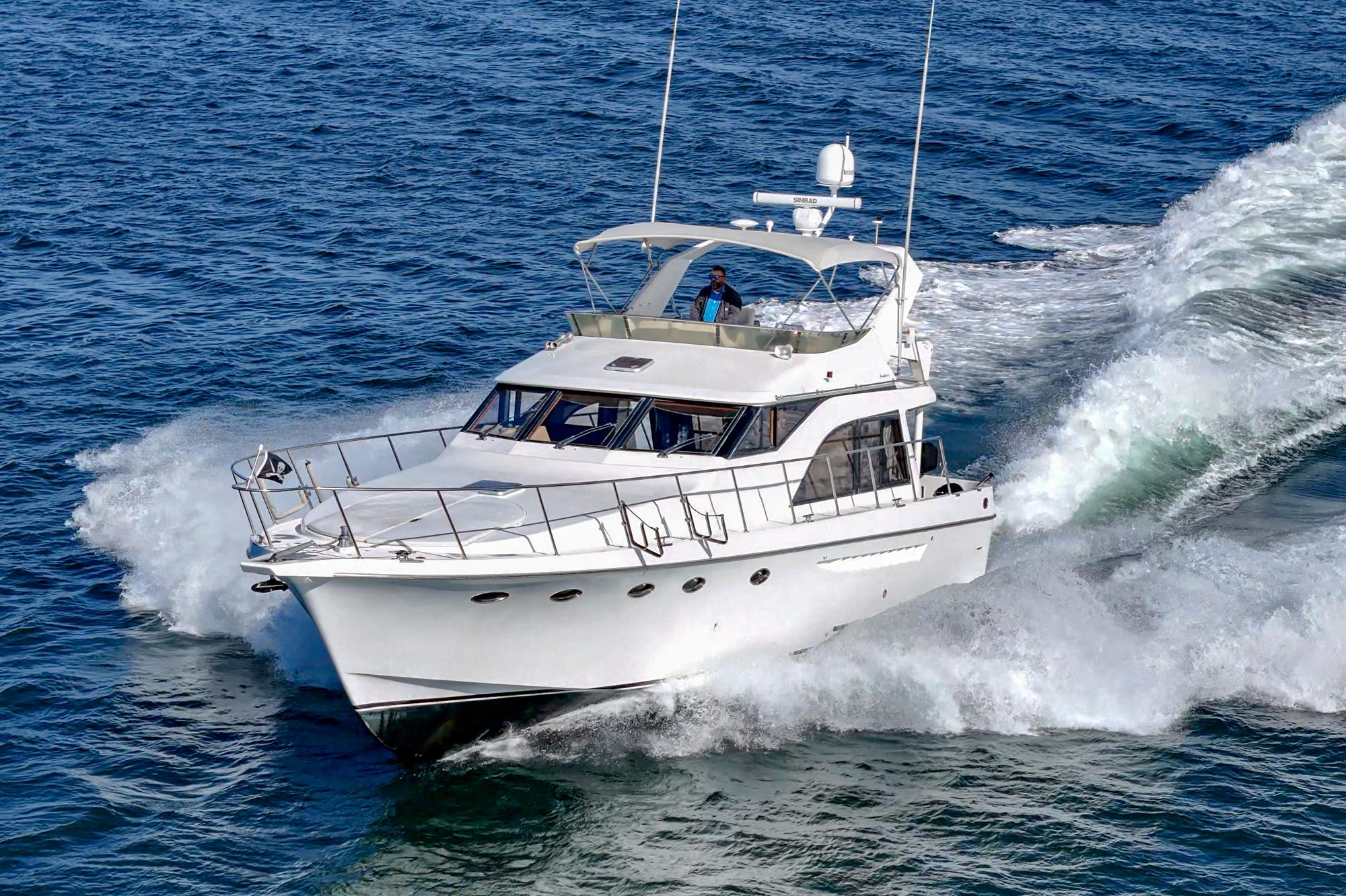 Bottom painted in 2021. Teak cockpit sole. Four S/S/ cleats, port and starboard. S/S hawse holes (cockpit). Added S/S handrails on transom, above side windows, and steps to walkaround. Aluminum frame glass angle doors (salon to cockpit — 2 sliding, 2 fixed). Pop-up swim step cleats. Hand-laid, gelcoated FRP hull. Balsa core on hull sides. Solid fiberglass hull bottom. Louvered engine vent hull sides.